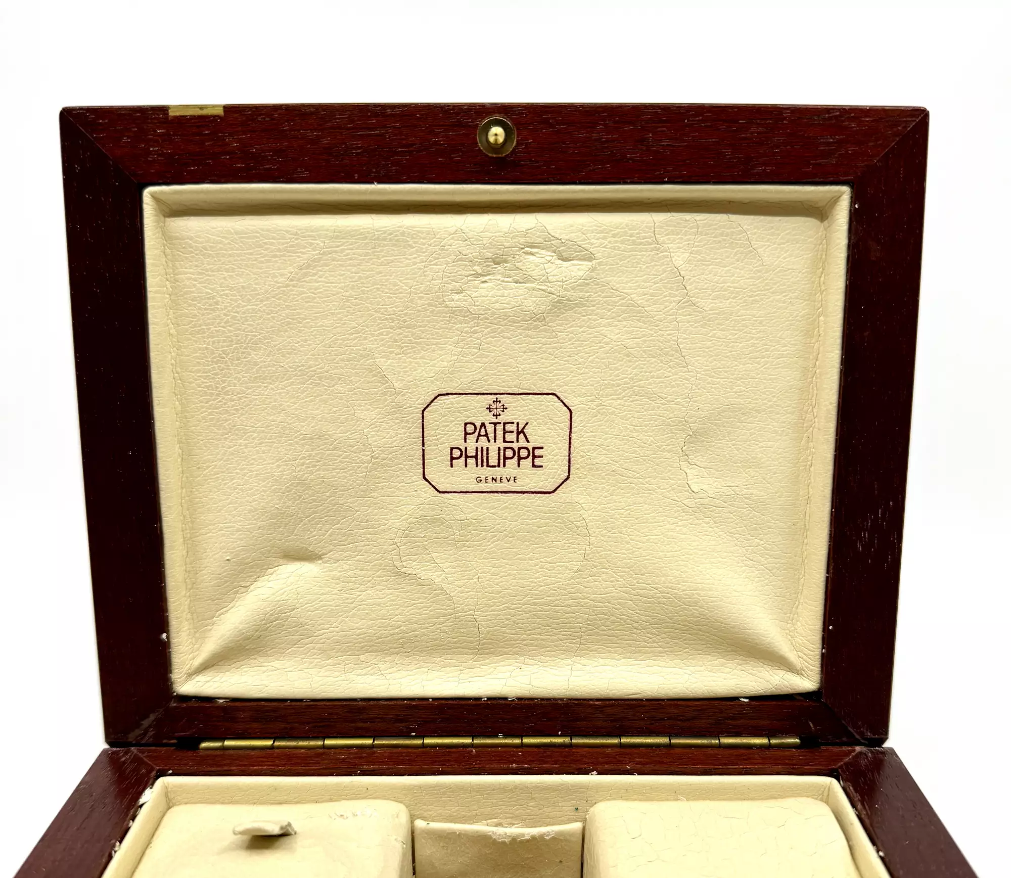 Patek Philippe early Mahagoni precious Wood Box for Calendar / Complication Models among others for the References 3450 / 3970 / 3940 | with removable Watch Holder | Correction Pen insert and second case back Holder | from the 80s | good Condition. Price includes 19% VAT! This item is directly available.