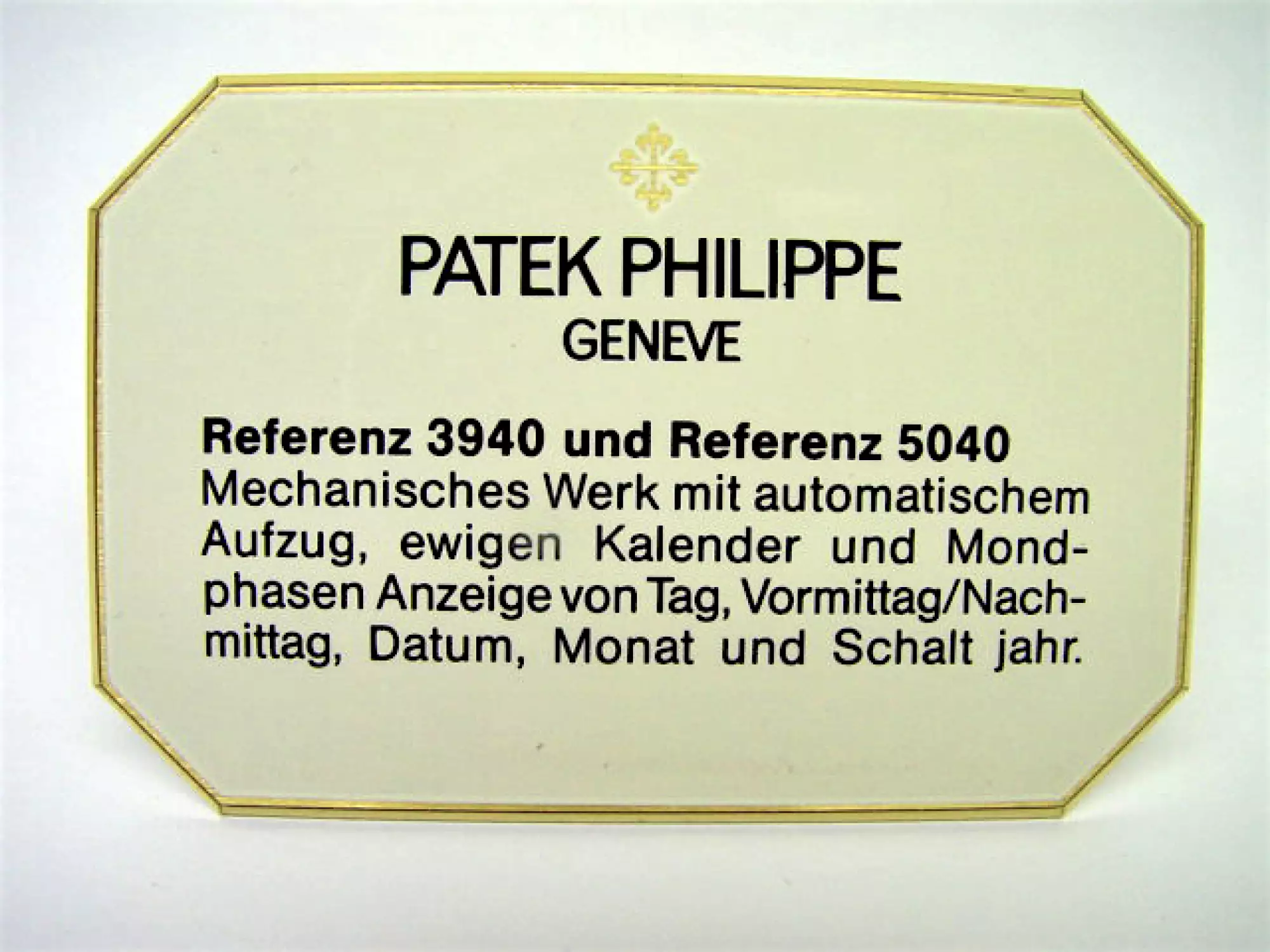Patek Philippe Konzessionär Dekorationsständer Referenzen 3940 & 5040 Ewiger Kalender | ca. 7,3 cm x 4,8 cm | sehr guter Zustand. Preis ist inkl. 19% MwSt! Dieser Artikel ist sofort lieferbar.