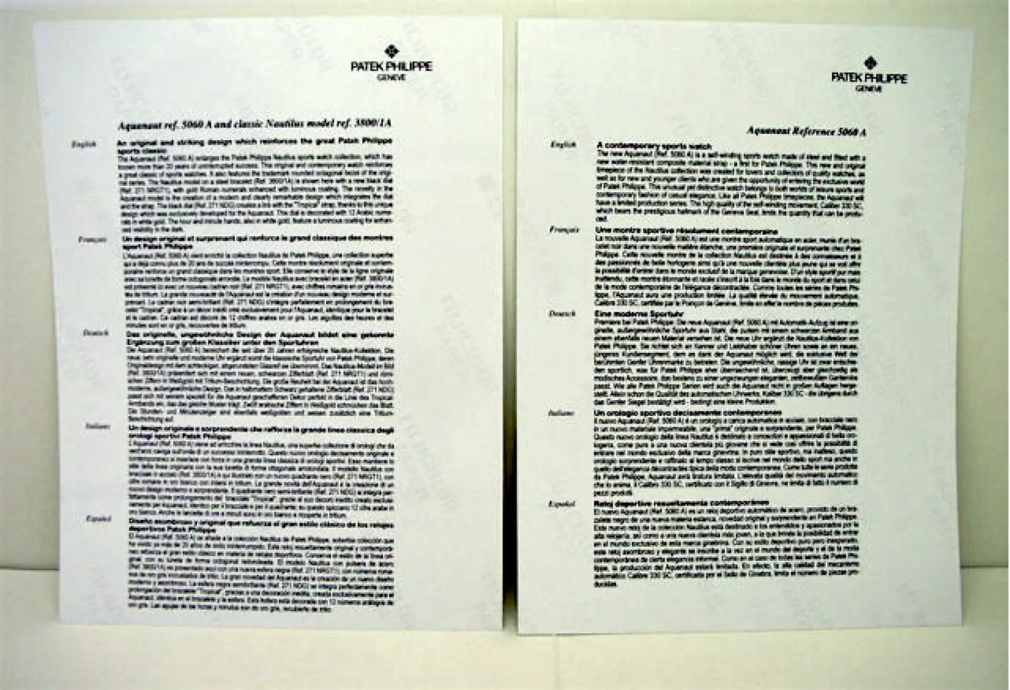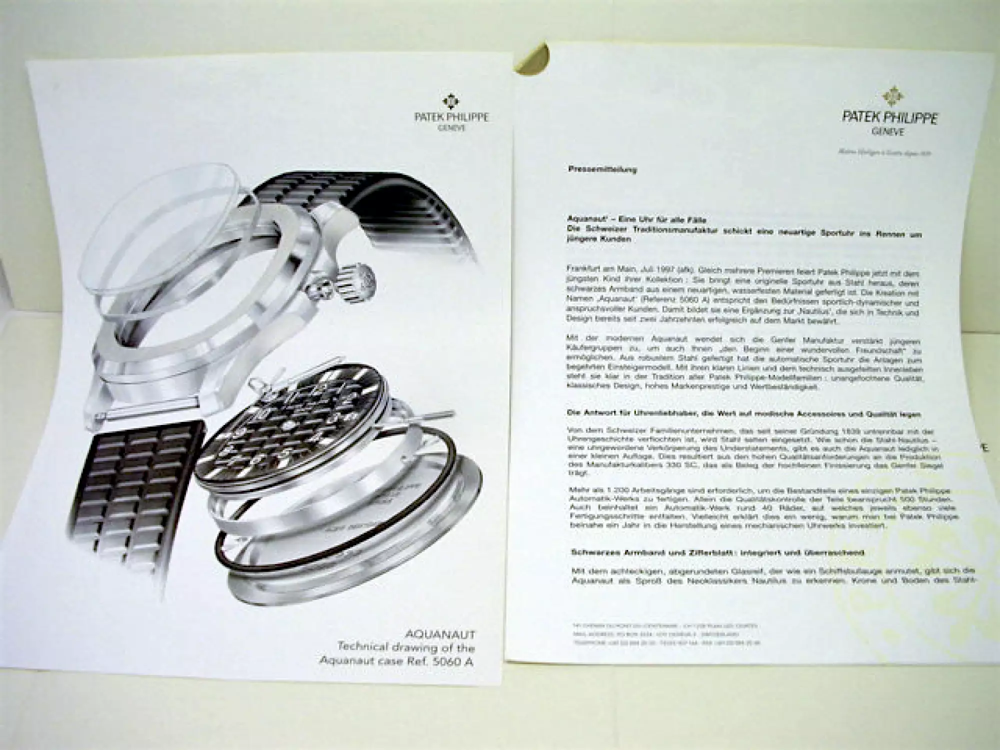 Patek Philippe Presseinformationen zur Aquanaut Referenz 5060 A inkl. orig. Pressefotos mit Daten - technischer Zeichnung - Juli 1997. Preis ist inkl. 19% MwSt! Dieser Artikel ist sofort lieferbar.