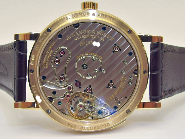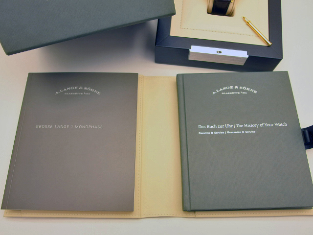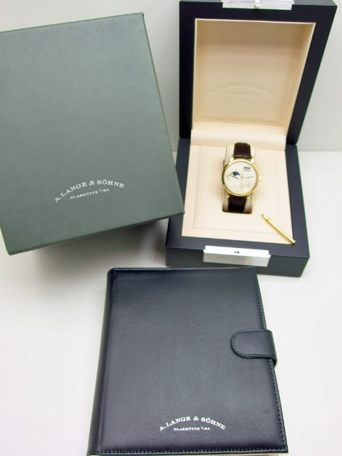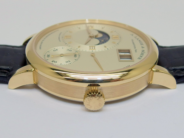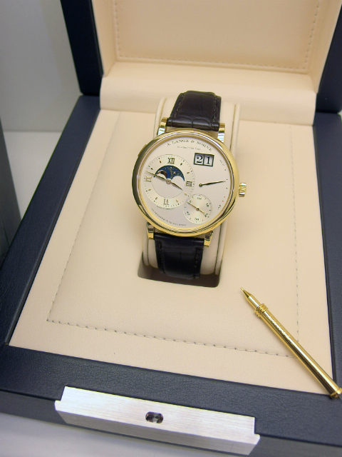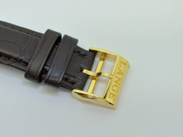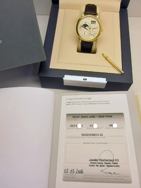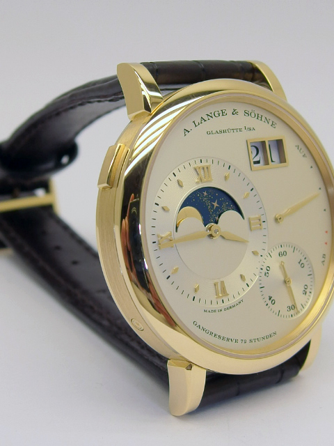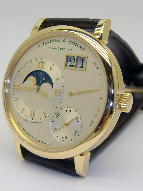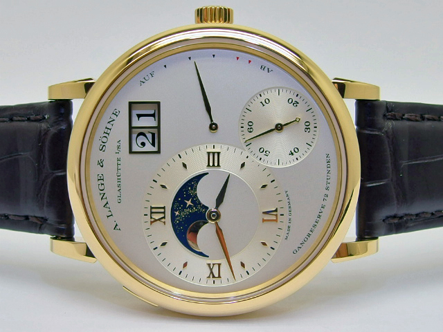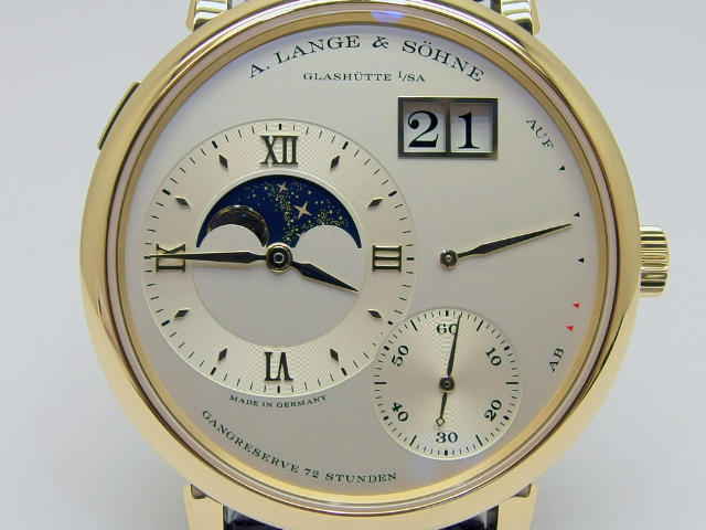 A. LANGE & SÖHNE Grosse Lange 1 Mondphase in 18k Gelbgold mit Krokoarmband & 18k Gelbgold Dornschließe, Referenz 139.021, Lange Caliber L095.3 Handaufzug, Funktionen: Stunden - Minuten - dezentrale Sekunde - Großdatum - Mondphasenanzeige - Gangreserveanzeige AUF/AB, Durchmesser 41 mm - Höhe 9,5 mm, sehr guter Zustand, verkauft am 2. März 2016 durch einen deutschen Konzessionär, anbei Box - Papiere - Beschreibung - Korrekturstift, unser Preis: 31.950- € inkl. 19% MwSt! Dieser Artikel ist sofort lieferbar.