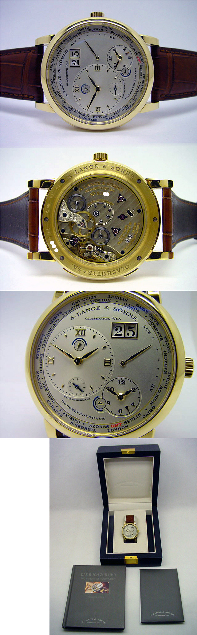A. LANGE & SÖHNE TIMEZONE, Referenznr.: 116.021, Werk: Lange Caliber L031.1 Handaufzug - Doppelfederhaus, Funktionen: Stunden - Minuten - dezentrale Sekunde - Großdatum - Zonenzeit (Stunde - Minute) - Tag / Nacht Anzeige für beide Zeitzonen - Gangreserveanzeige, in 18kt Gelbgold mit Lange Dornschließe in Gelbgold, anbei orig. Box und Zertifikat ( verkauft im November 2006 ), sehr guter Zustand.