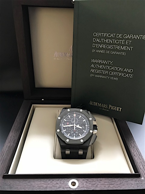 AUDEMARS PIGUET Royal Oak Offshore Carbon 44mm, Referenz 26400AU.OO.A002CA.01, Gehäuse aus Carbon, Gehäusedurchmesser 44mm, Gehäusehöhe 14,11mm, Armband Kautschuk schwarz mit Dornschließe, schwarzes Zifferblatt, Automatikwerk A.P. Manufakturkaliber 3126, Datumsanzeige, entspiegeltes Saphirglas, Gehäuseboden Saphirglas, ungetragene Uhr / Dekorationsware (verkauft im November 2017 durch einen deutschen AUDEMARS PIGUET Konzessionär), anbei Box - Booklets - Garantiezertifikat, unser Preis: 29.450- € inkl. 19% MwSt. Dieser Artikel ist sofort lieferbar.