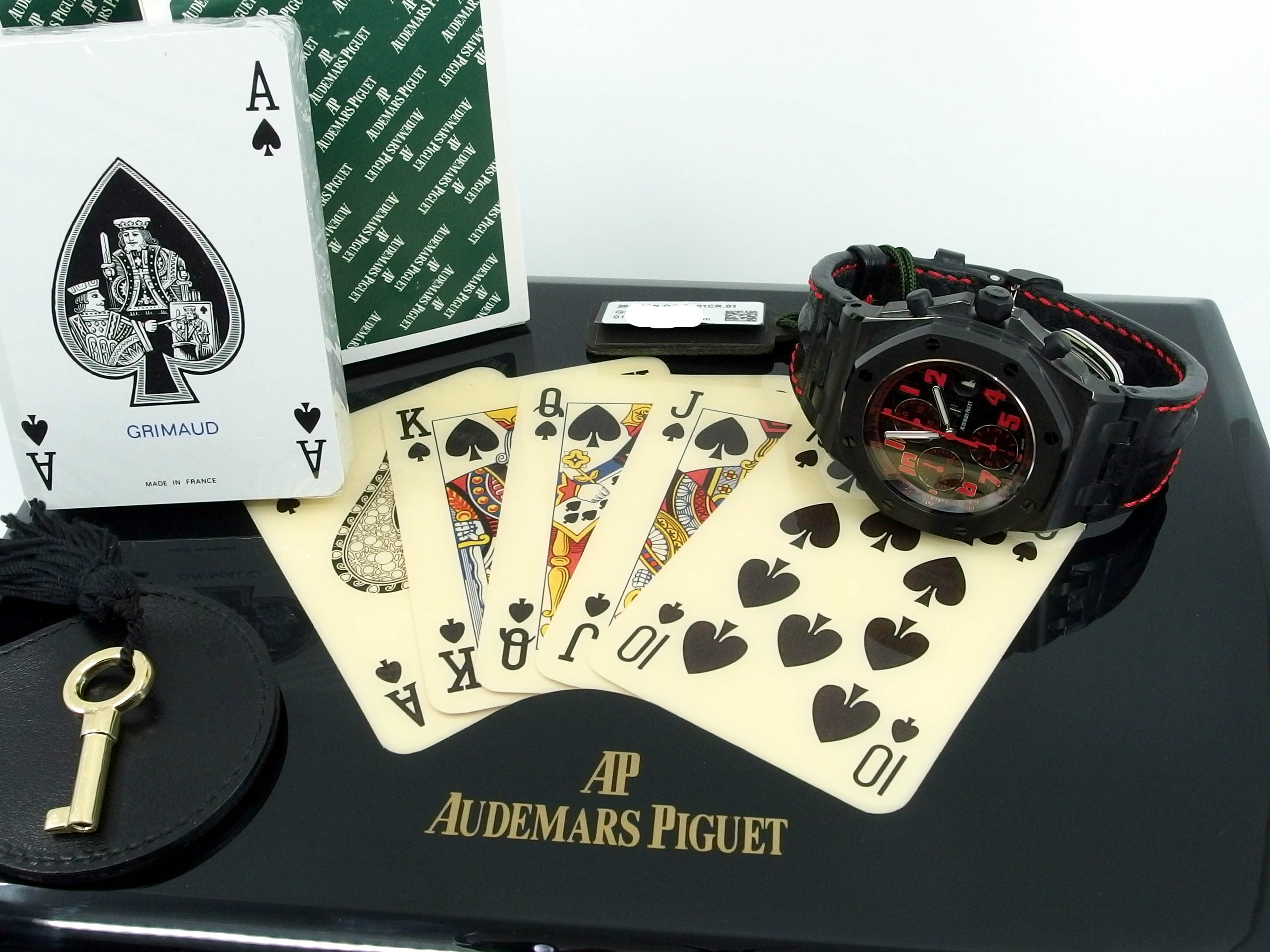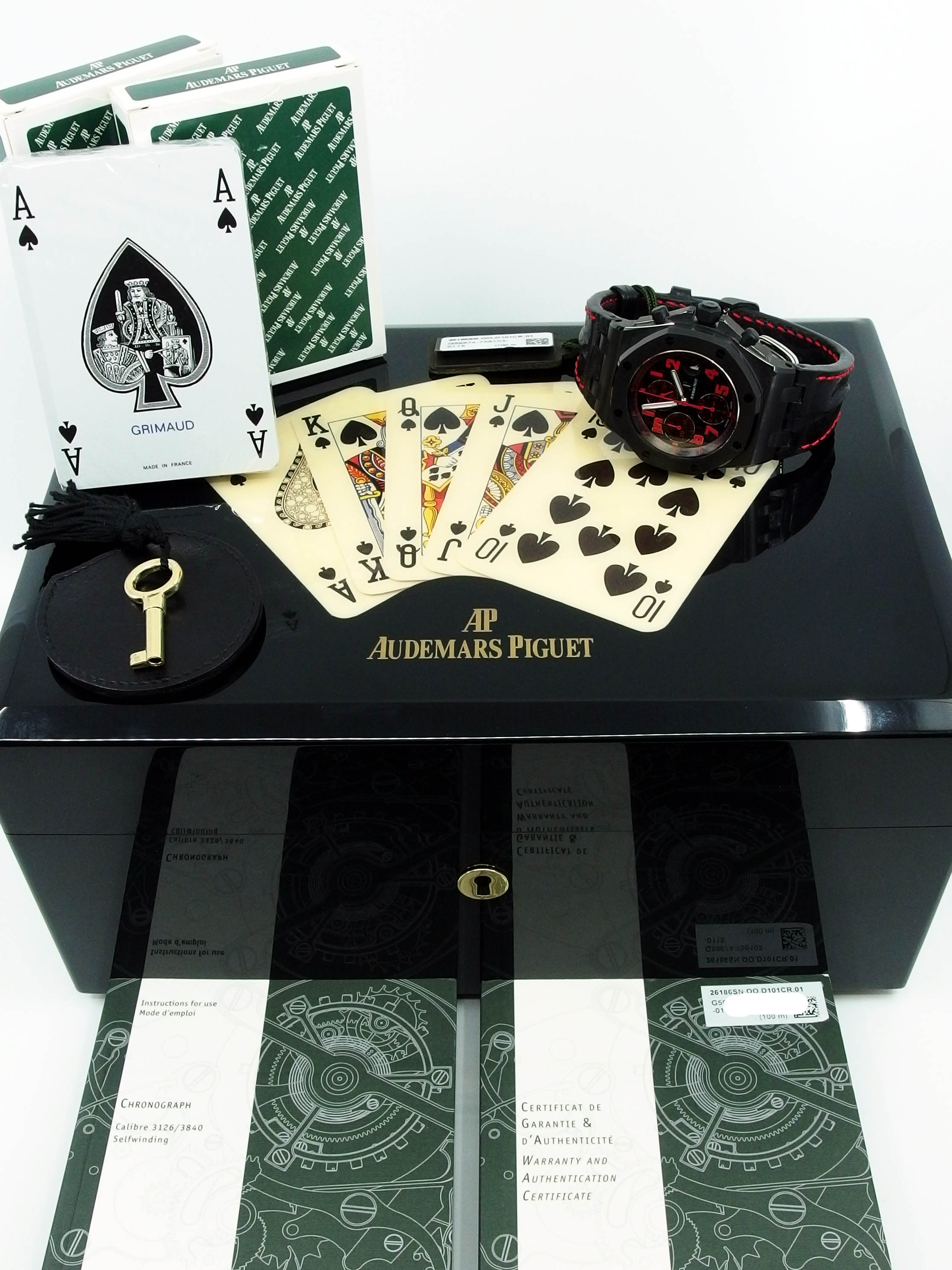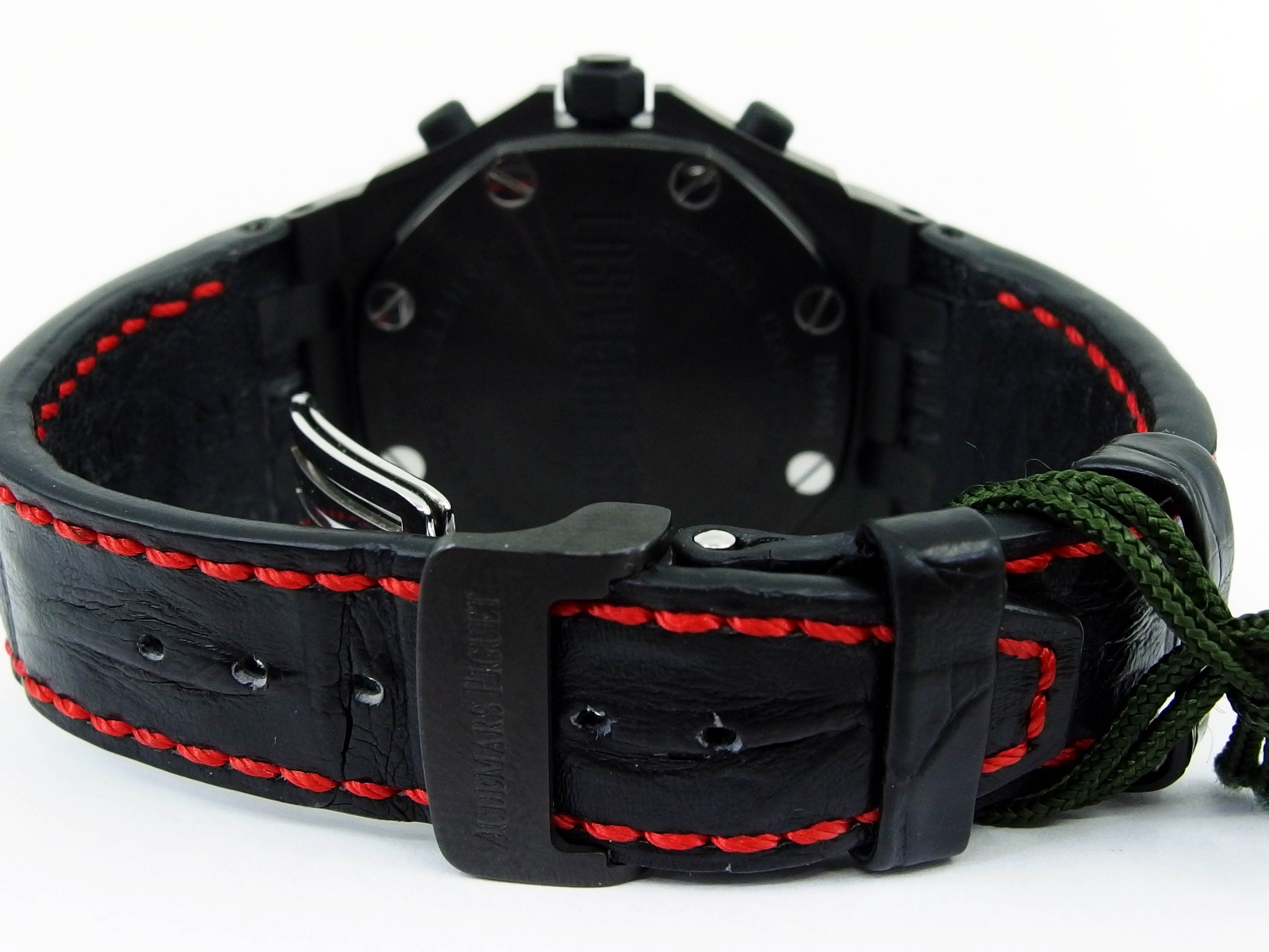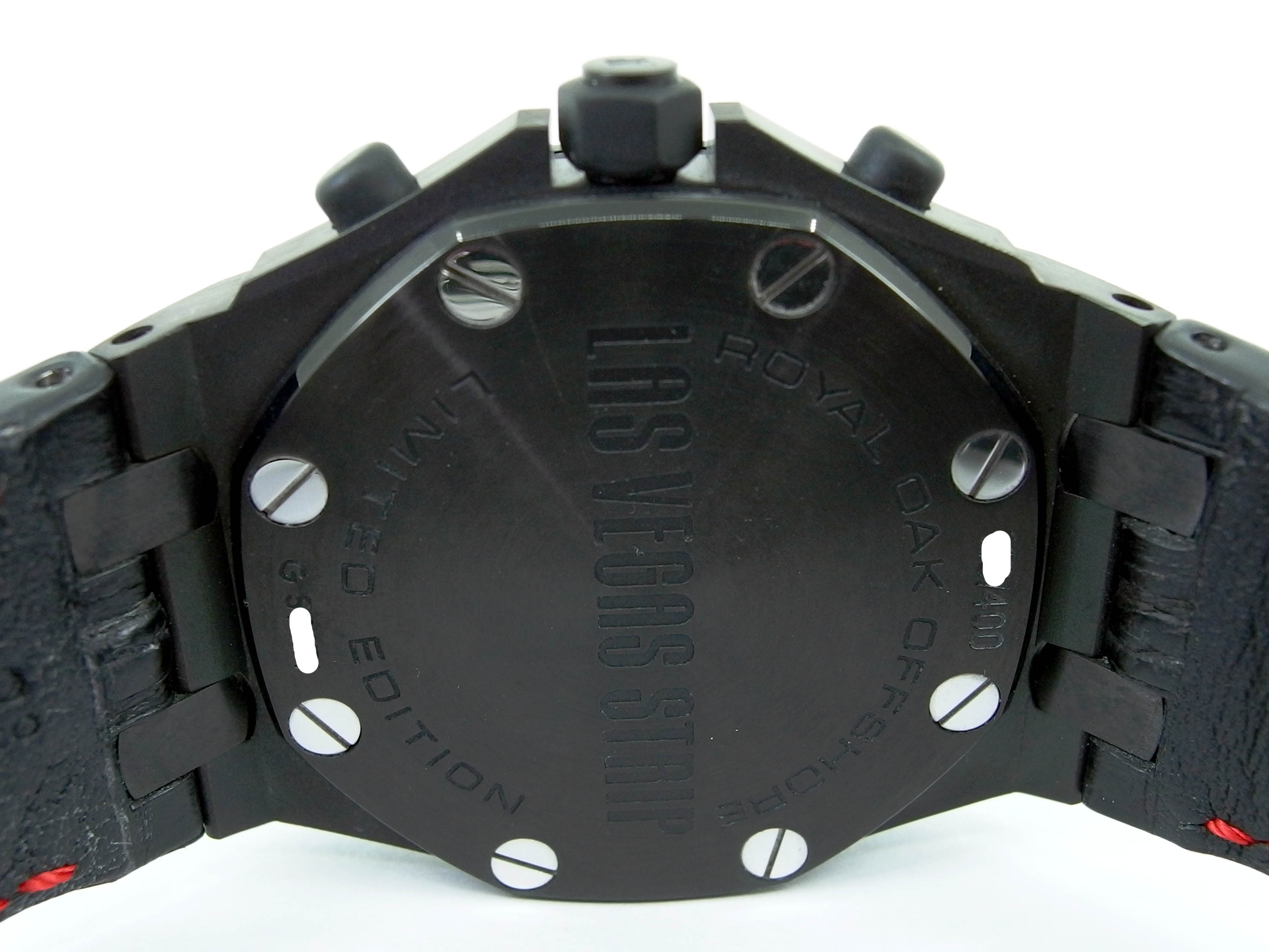 Limited AUDEMARS PIGUET Royal Oak Offshore Chronograph LAS VEGAS STRIP, Referenz 26186SN.OO.D101CR.01, in Edelstahl / PVD, limitierte Auflage von 400 Uhren, Armband "Hornback" Alligator mit roten Nähten & Faltschließe, nahezu ungetragener Zustand, anbei Box mit Umkarton - Zertifikat - Beschreibung - Schlüßel - Kartenspiele - Verkaufsanhänger. Dieser Artikel ist differenzbesteuert nach §25A UStG. Dieser Artikel ist sofort lieferbar.
