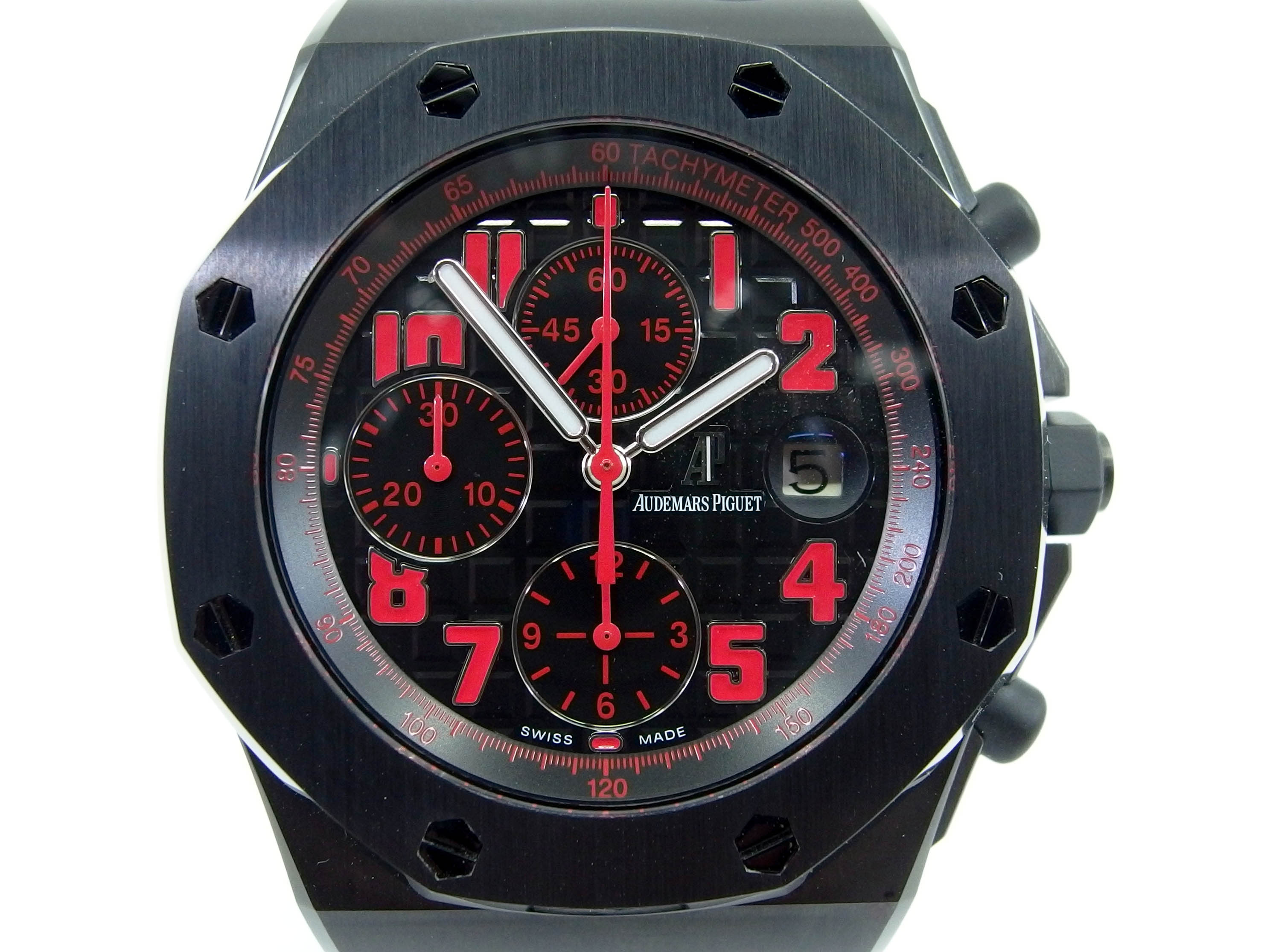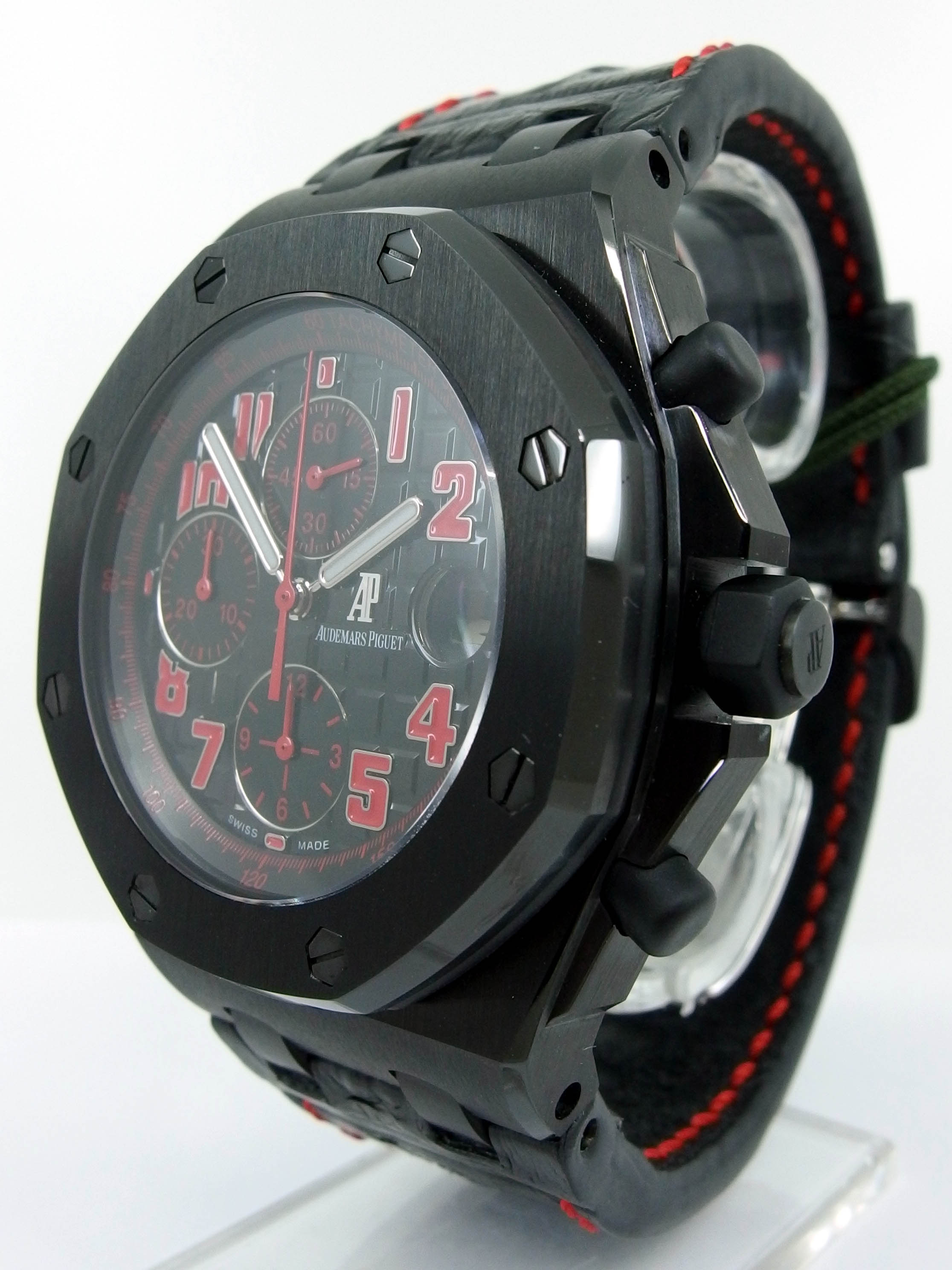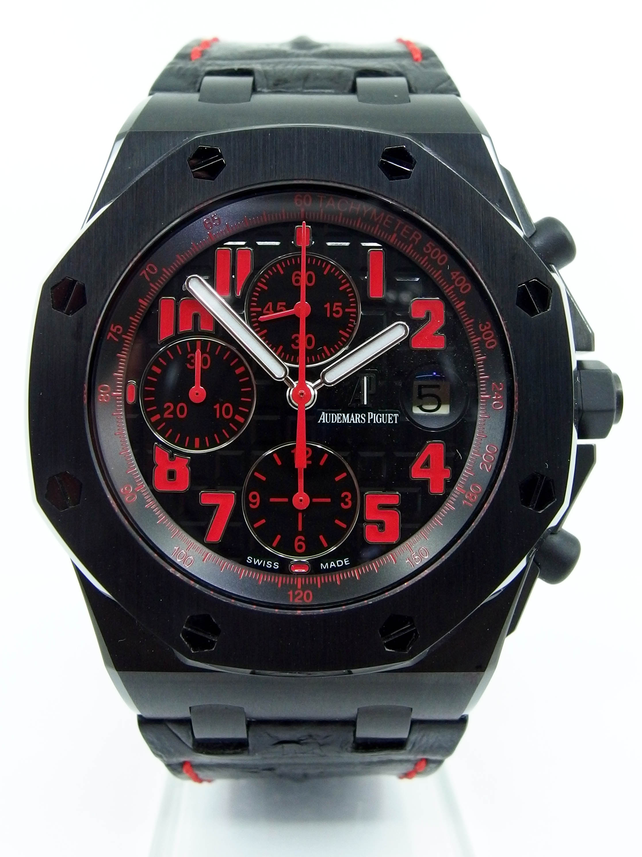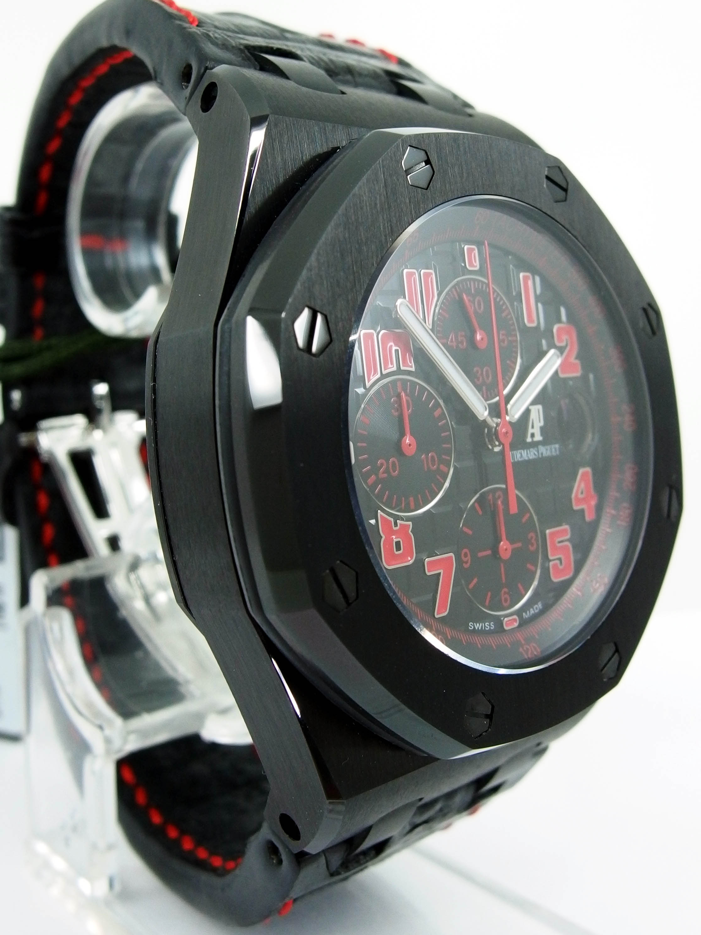 Limited AUDEMARS PIGUET Royal Oak Offshore Chronograph LAS VEGAS STRIP, Referenz 26186SN.OO.D101CR.01, in Edelstahl / PVD, limitierte Auflage von 400 Uhren, Armband "Hornback" Alligator mit roten Nähten & Faltschließe, nahezu ungetragener Zustand, anbei Box mit Umkarton - Zertifikat - Beschreibung - Schlüßel - Kartenspiele - Verkaufsanhänger. Dieser Artikel ist differenzbesteuert nach §25A UStG. Dieser Artikel ist sofort lieferbar.