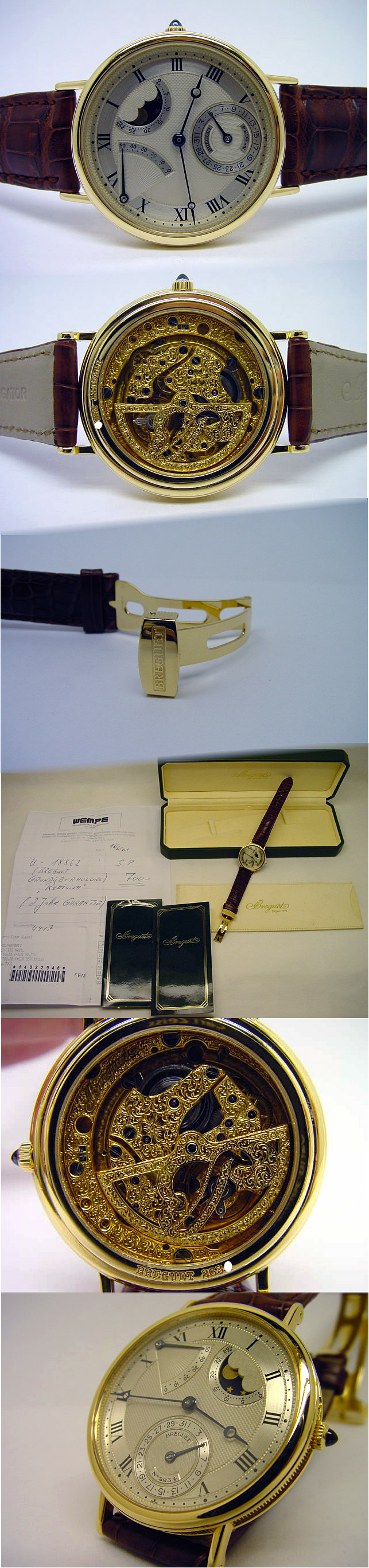 Breguet Classique Mondphase - Gangreserve - Zeigerdatum, Glasboden & handgraviertes Uhrwerk, Faltschließe, Referenz: 3130(3137) in Gelbgold, Funktionen: Stunden - Minuten - Zeigerdatum - Gangreserveanzeige - Mondalter - Mondphase, anbei original Breguet Box - Zertifikat - Beschreibung - Revisionsrechnung der Firma Wempe aus 2001, der aktuelle Wiederbeschaffungspreis liegt bei ca. 31500.- €.
