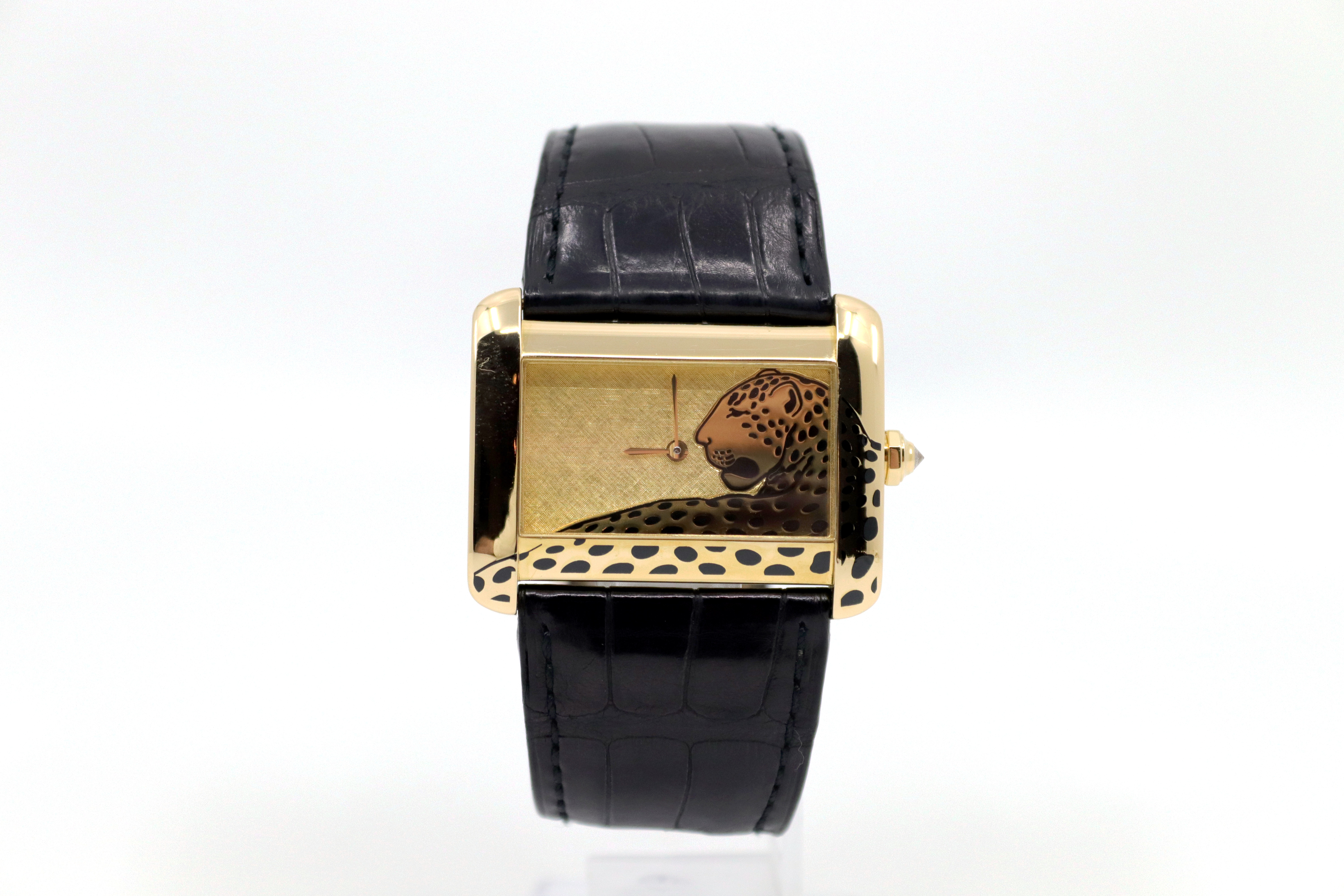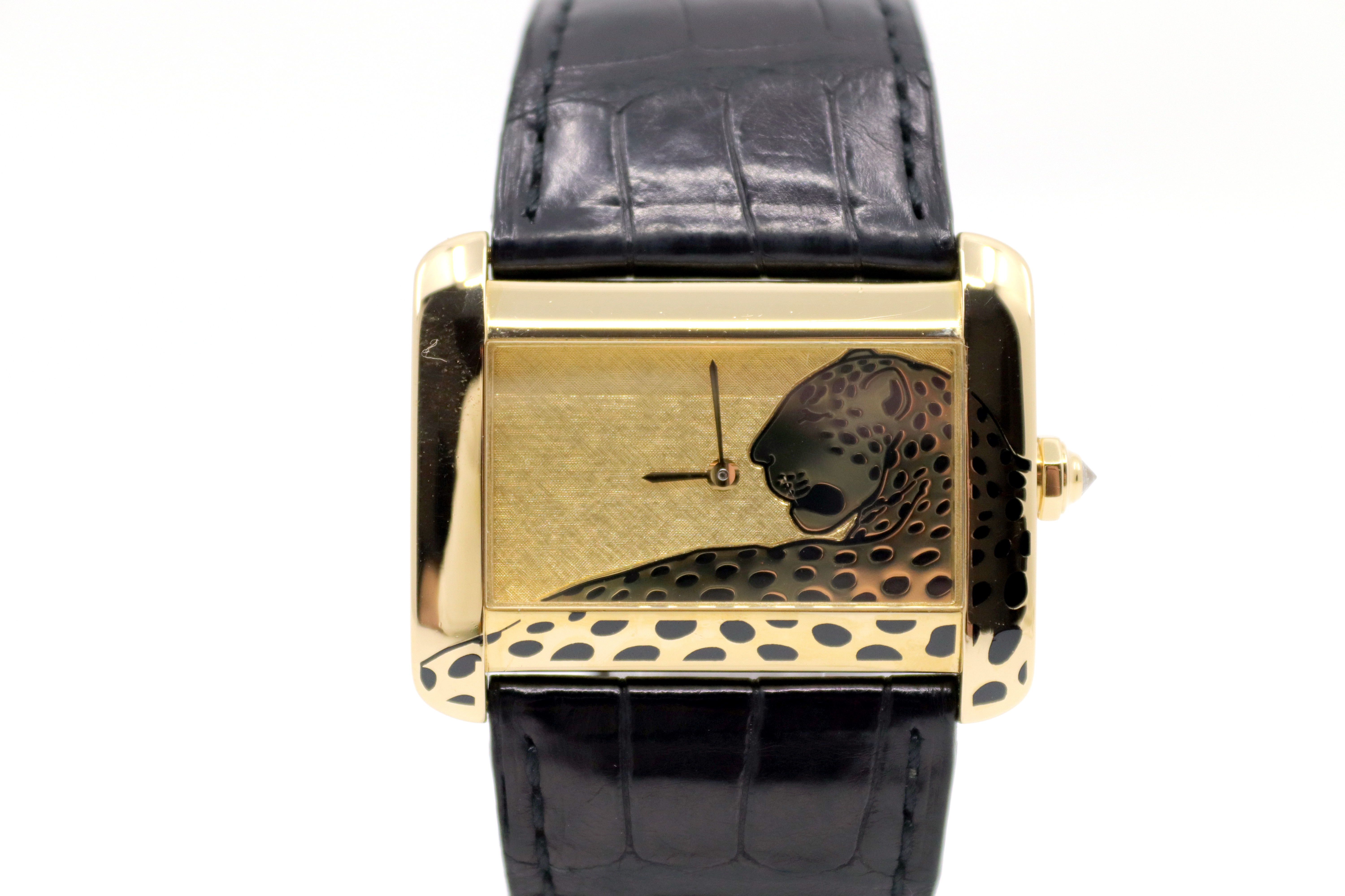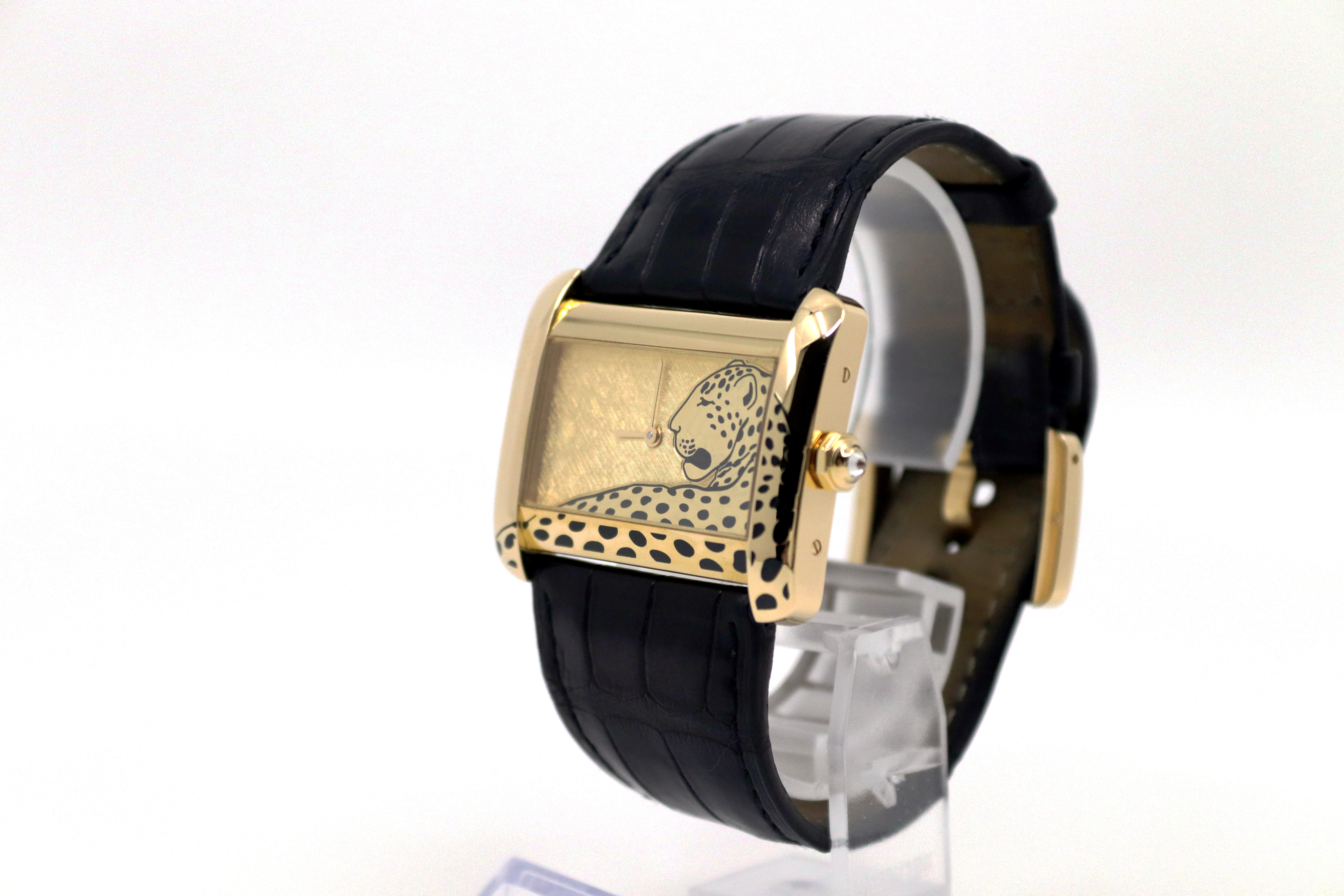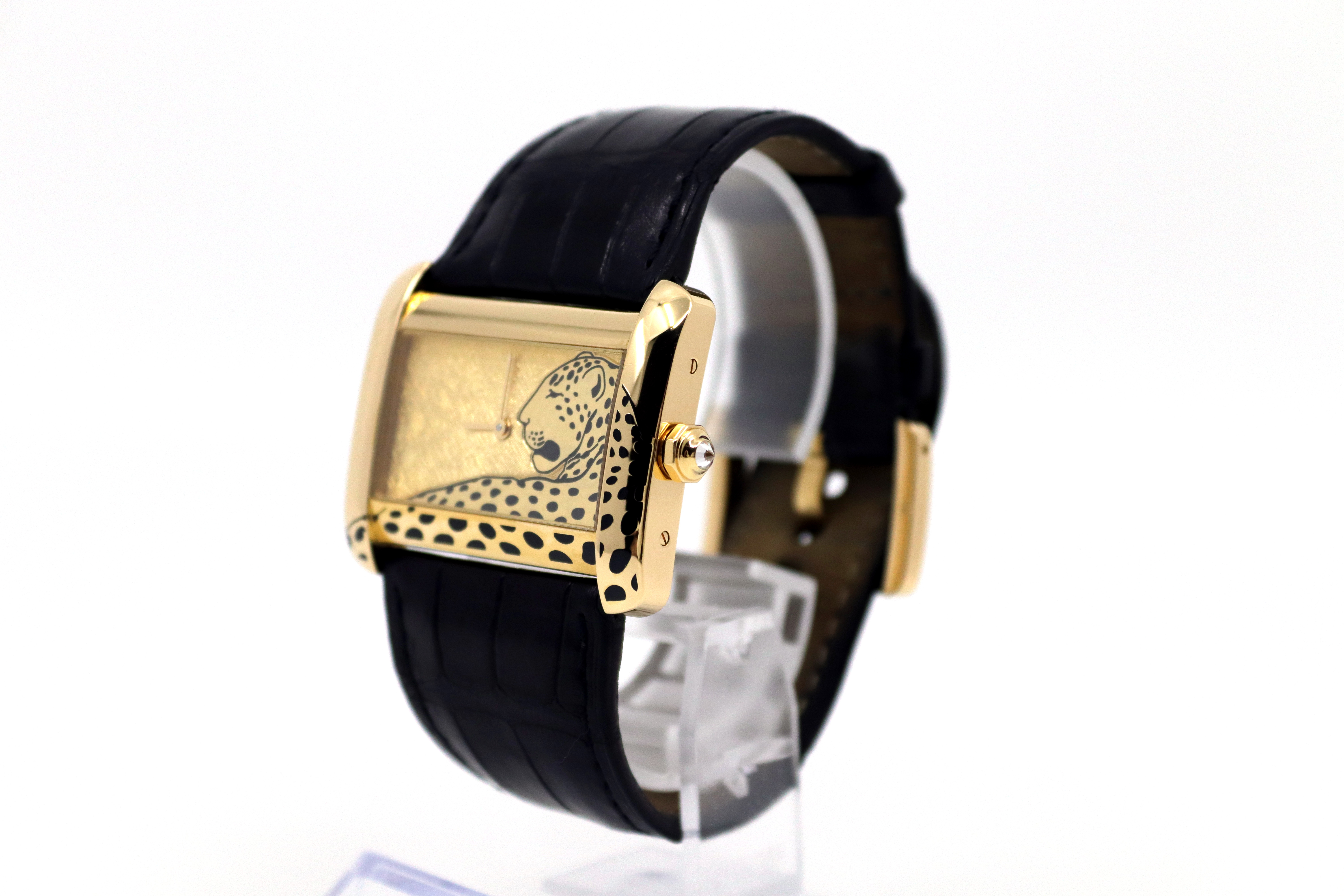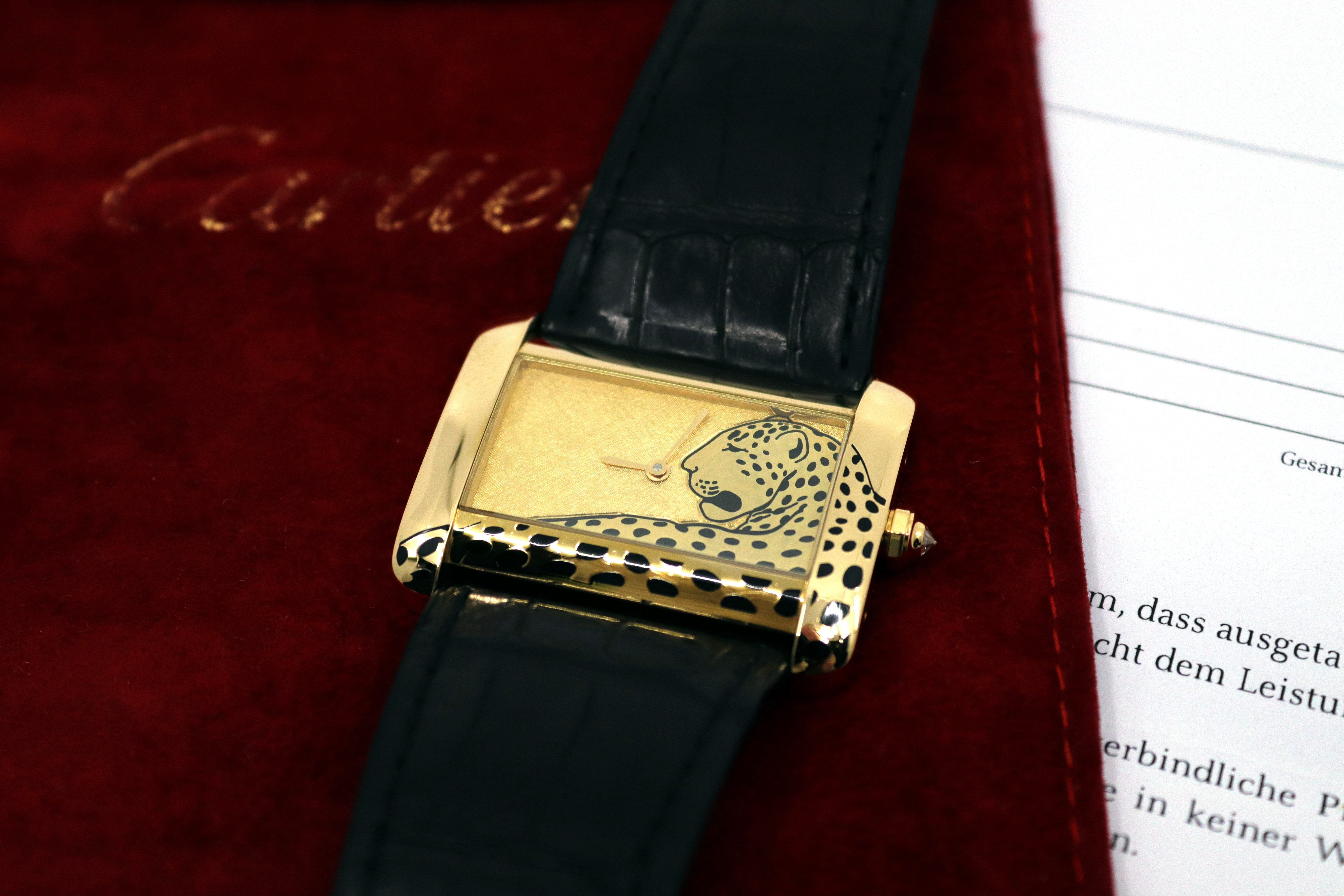Limitierte CARTIER Jumbo DIVAN Leopard in 18k Gelbgold | Referenz WA302556 2602 | goldenes strukturiertes Zifferblatt mit Emaille aus Champlevé, dass einen Leopard zeigt, der sich bis zur Lünette und den Anstößen erstreckt | Krone mit Diamant | limitierte Auflage von 20 Uhren. Bei der limitierten Divan wurde im März 2019 ein Service bei Cartier durchgeführt. Die Uhr befindet sich in einem sehr guten Zustand. Anbei Cartier / Richemont Service Rechnung - Cartier Reiseetui - Cartier Bestätigung. Dieser Artikel ist differenzbesteuert nach §25A UStG. Dieser Artikel ist sofort verfügbar.