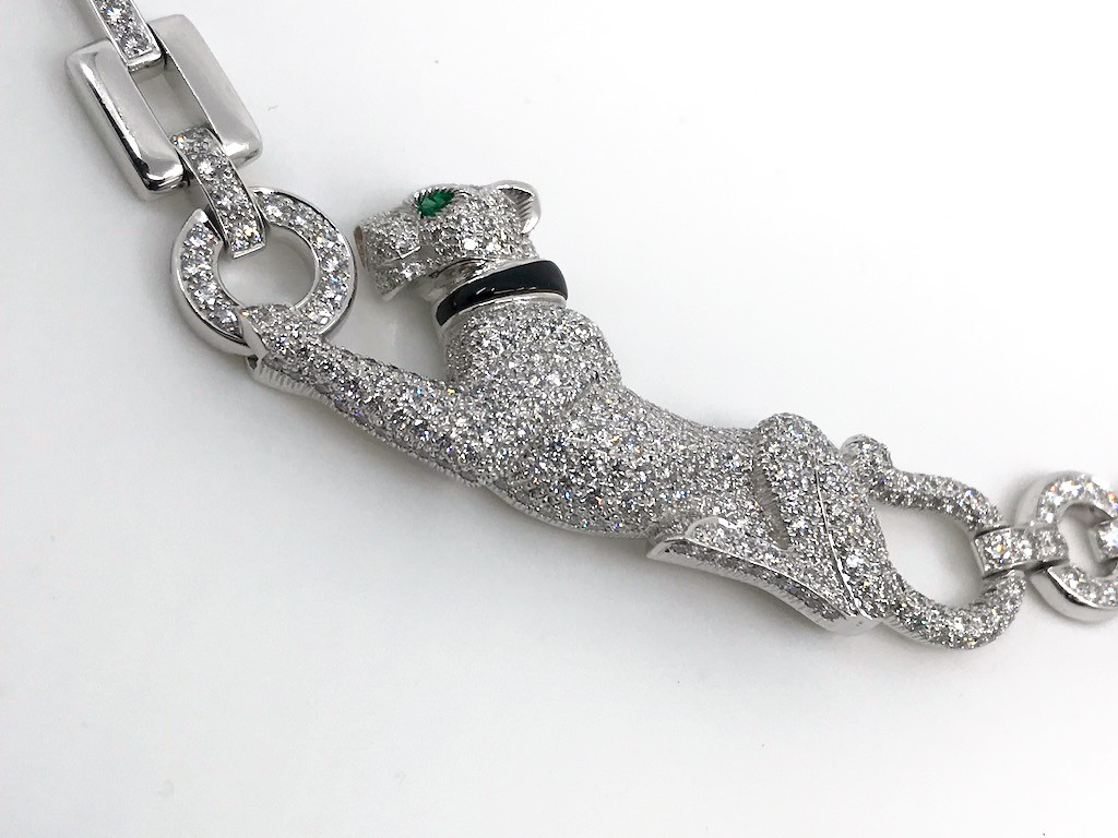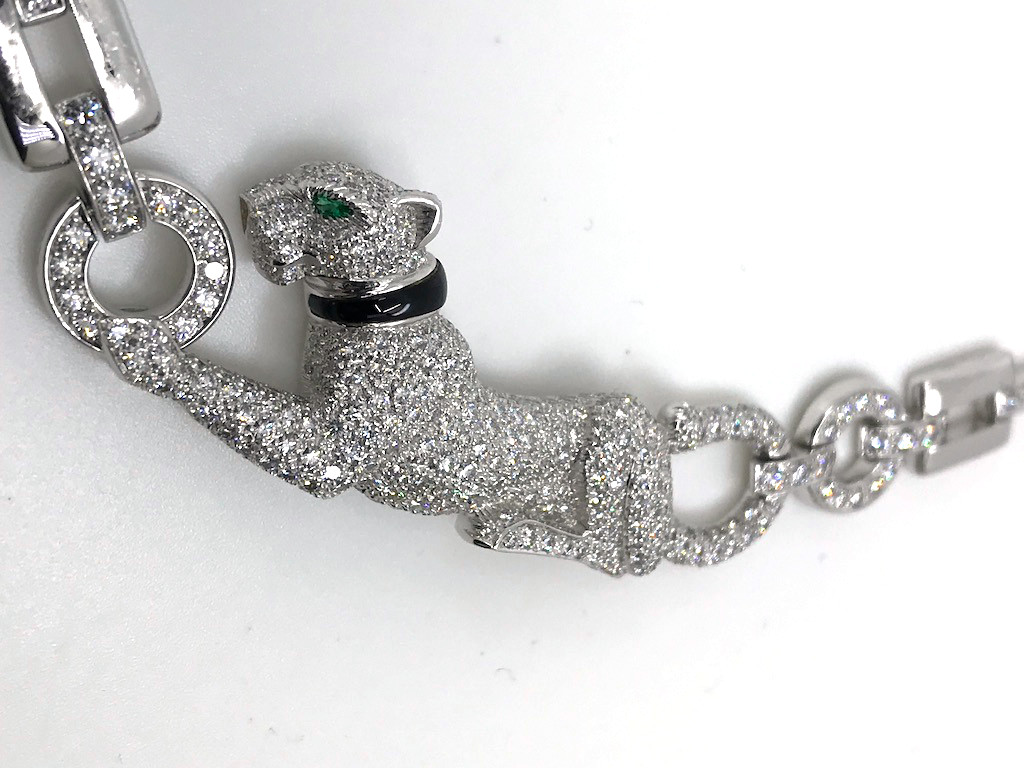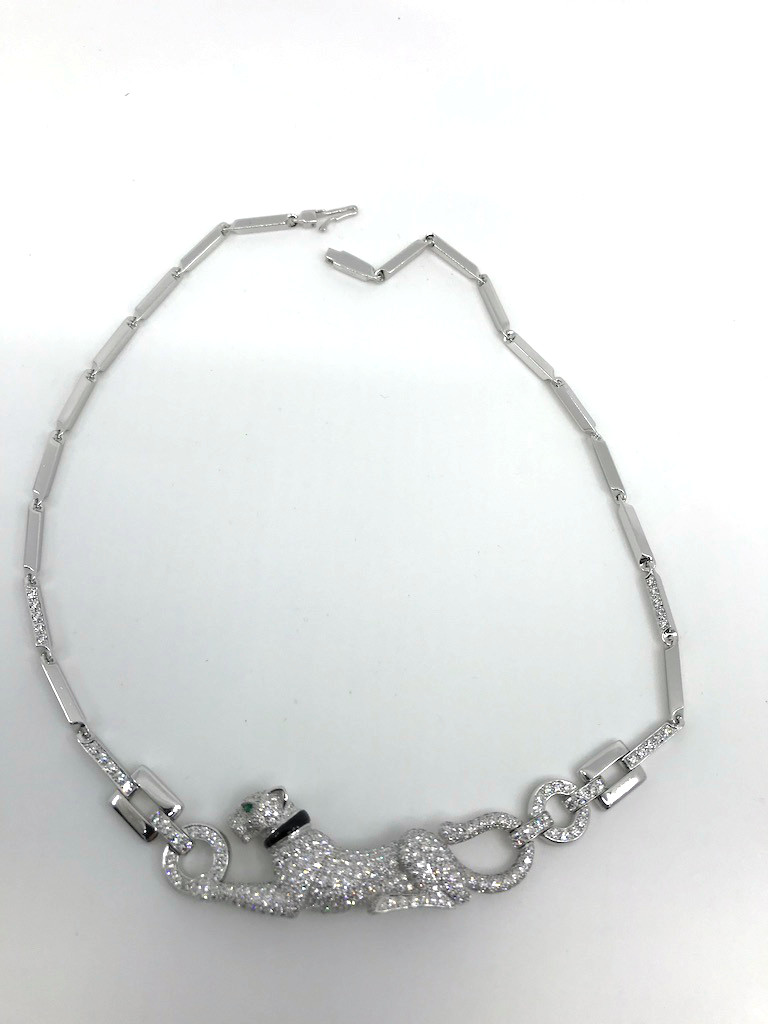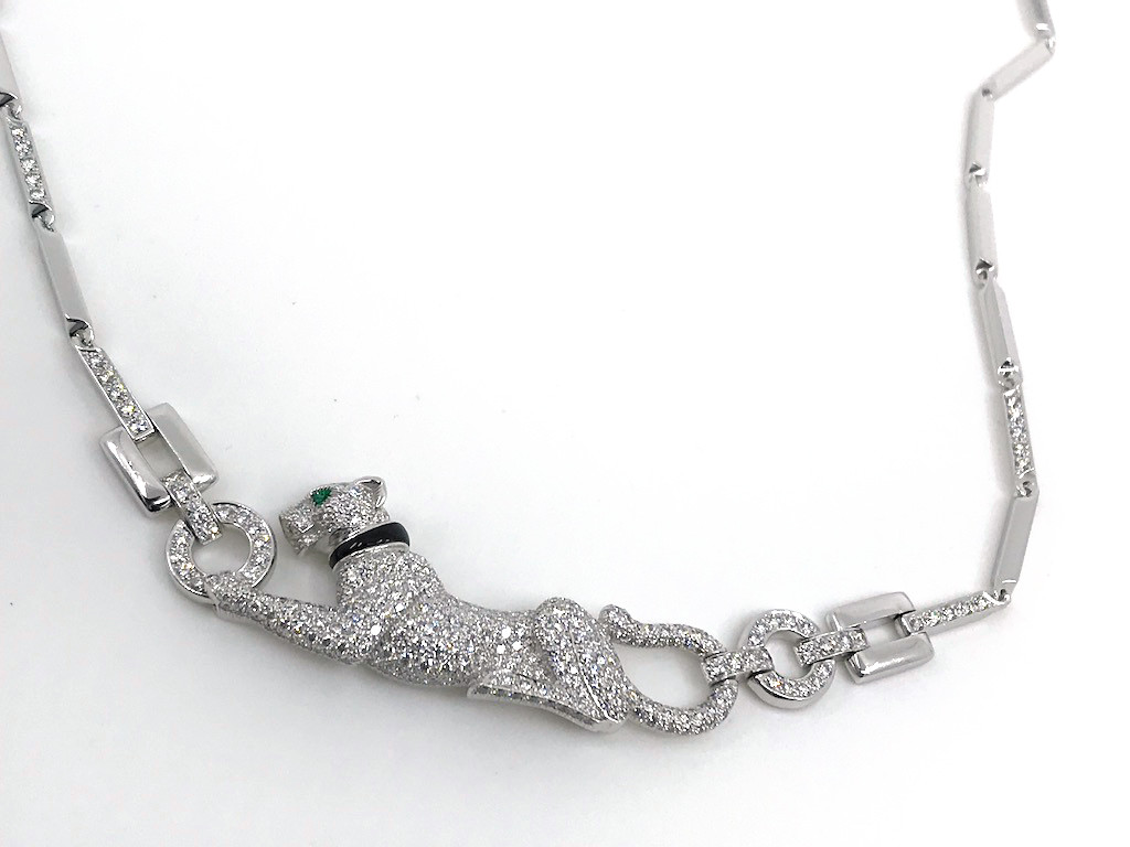 CARTIER Panthère de Cartier Collier in 18k Weißgold | mit ca. 3.71 Carat Brillanten Pavé gefasst - Smaragde als Augen - Onyx als Halsband | Cartier signiert und nummeriert | sehr guter Zustand | verkauft durch die Cartier Boutique Düsseldorf / Königsallee. Dieser Artikel ist differenzbesteuert nach §25A UStG. Dieser Artikel ist sofort lieferbar.