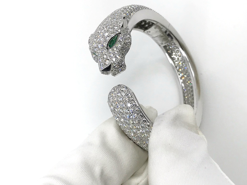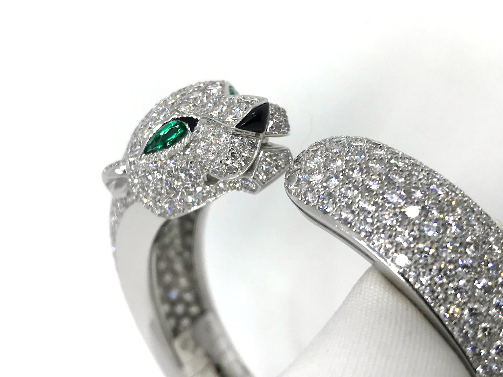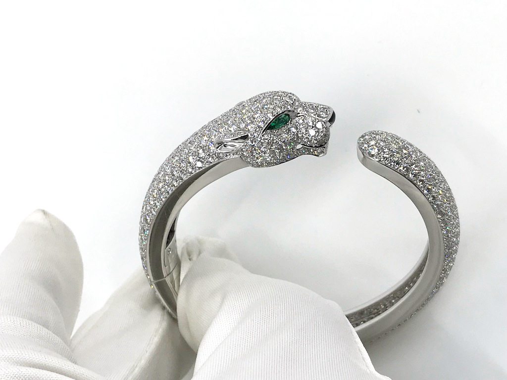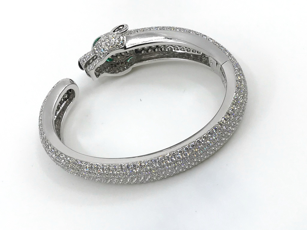CARTIER Panthère de Cartier Armreif in 18k Weißgold | mit ca. 15.74 Carat - ca. 706 Brillanten Pavé gefasst besetzt - Smaragde als Augen - Onyx als Nase | Cartier signiert und nummeriert | Referenznummer H6007417 | sehr guter Zustand | verkauft durch die Cartier Boutique Düsseldorf / Königsallee. Dieser Artikel ist differenzbesteuert nach §25A UStG. Dieser Artikel ist sofort lieferbar.