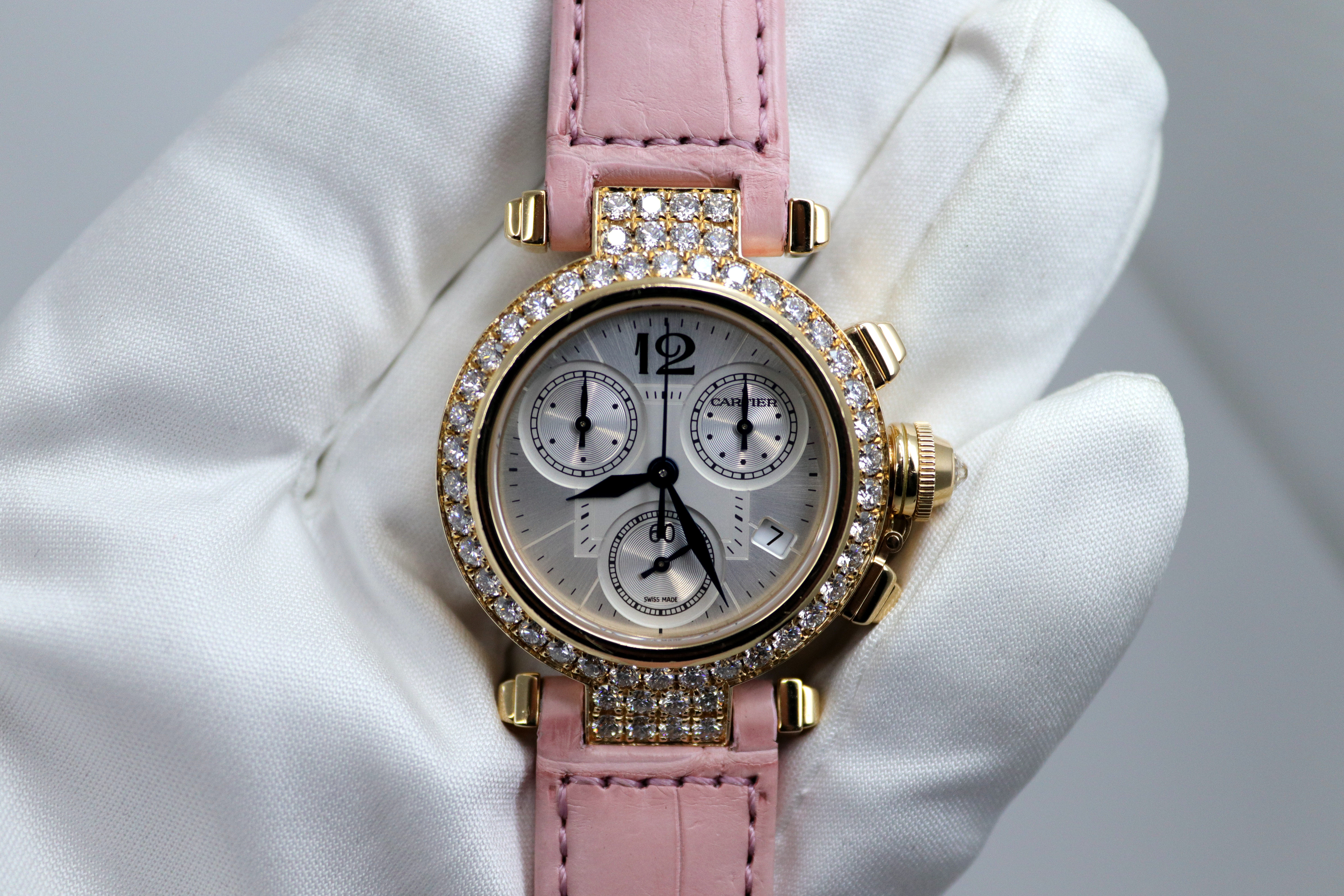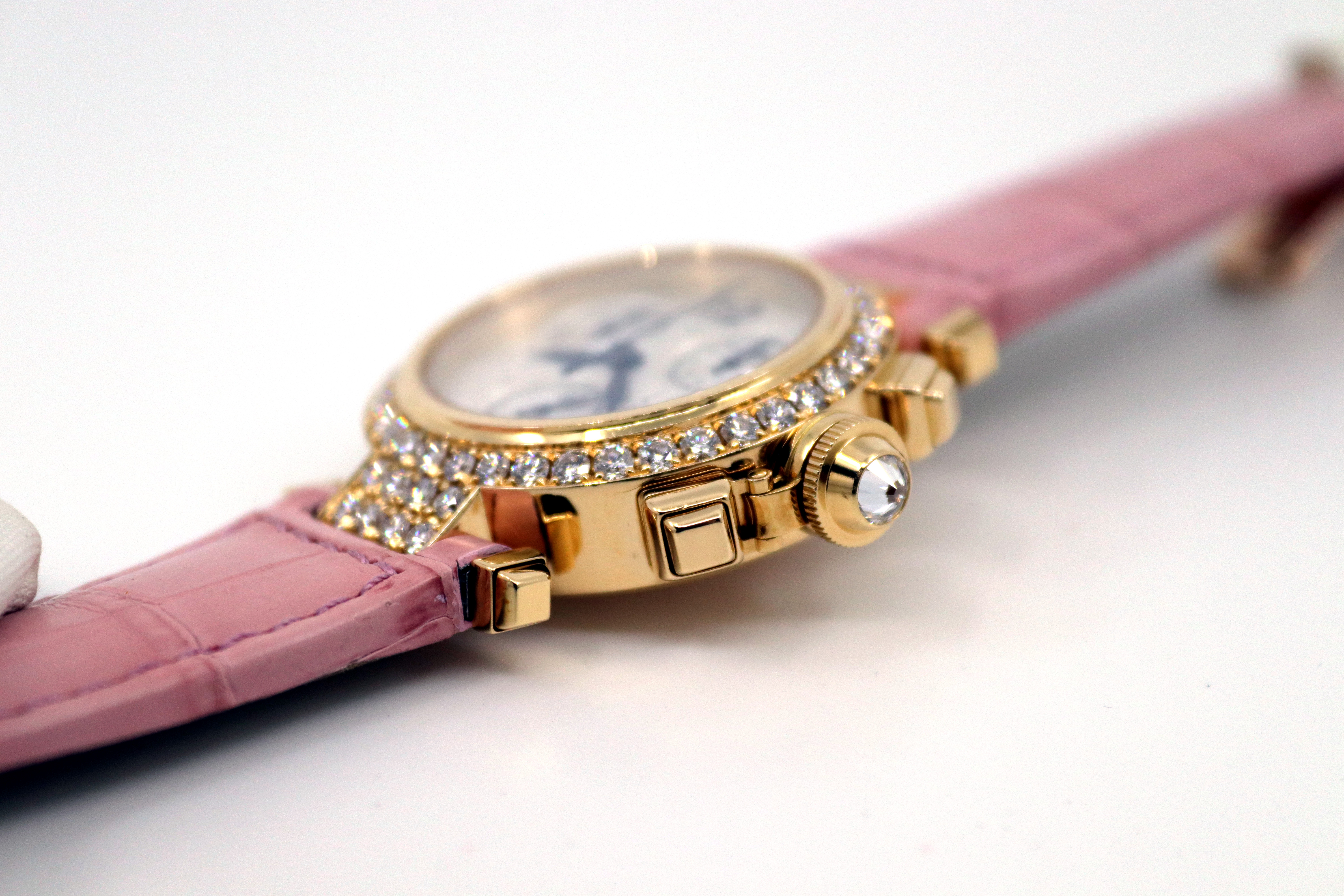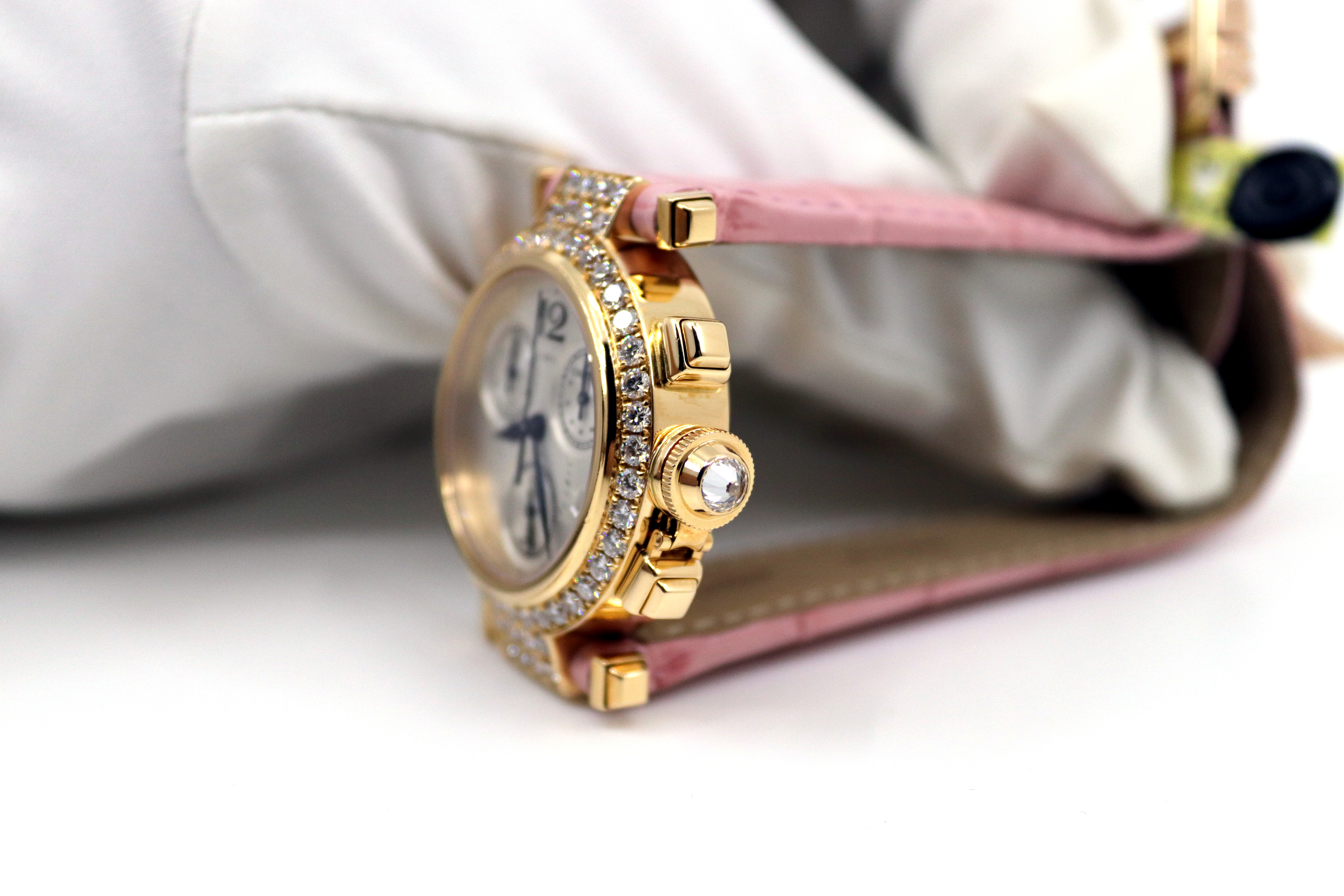 CARTIER Pasha de Cartier Joaillerie Chronograph in 18k Gelbgold | Referenz WJ12061G 2882 | mit neuem Kroko-Armband und Faltschließe in 18k Gelbgold | Durchmesser 32 mm | Chronoflex Uhrwerk mit Chronograph und Datum | Gehäuse - Lünette - Krone mit 55 Diamanten im Brillantschliff besetzt - original Cartier Diamant-Besatz | Saphirglas. Bei der Pasha wurde im August 2019 ein Service bei Cartier durchgeführt, die Uhr befindet sich hiernach in einem ungetragenen Zustand. Anbei Cartier / Richemont Service Rechnung - Cartier Reiseetui. Dieser Artikel ist differenzbesteuert nach §25A UStG. Dieser Artikel ist sofort verfügbar.