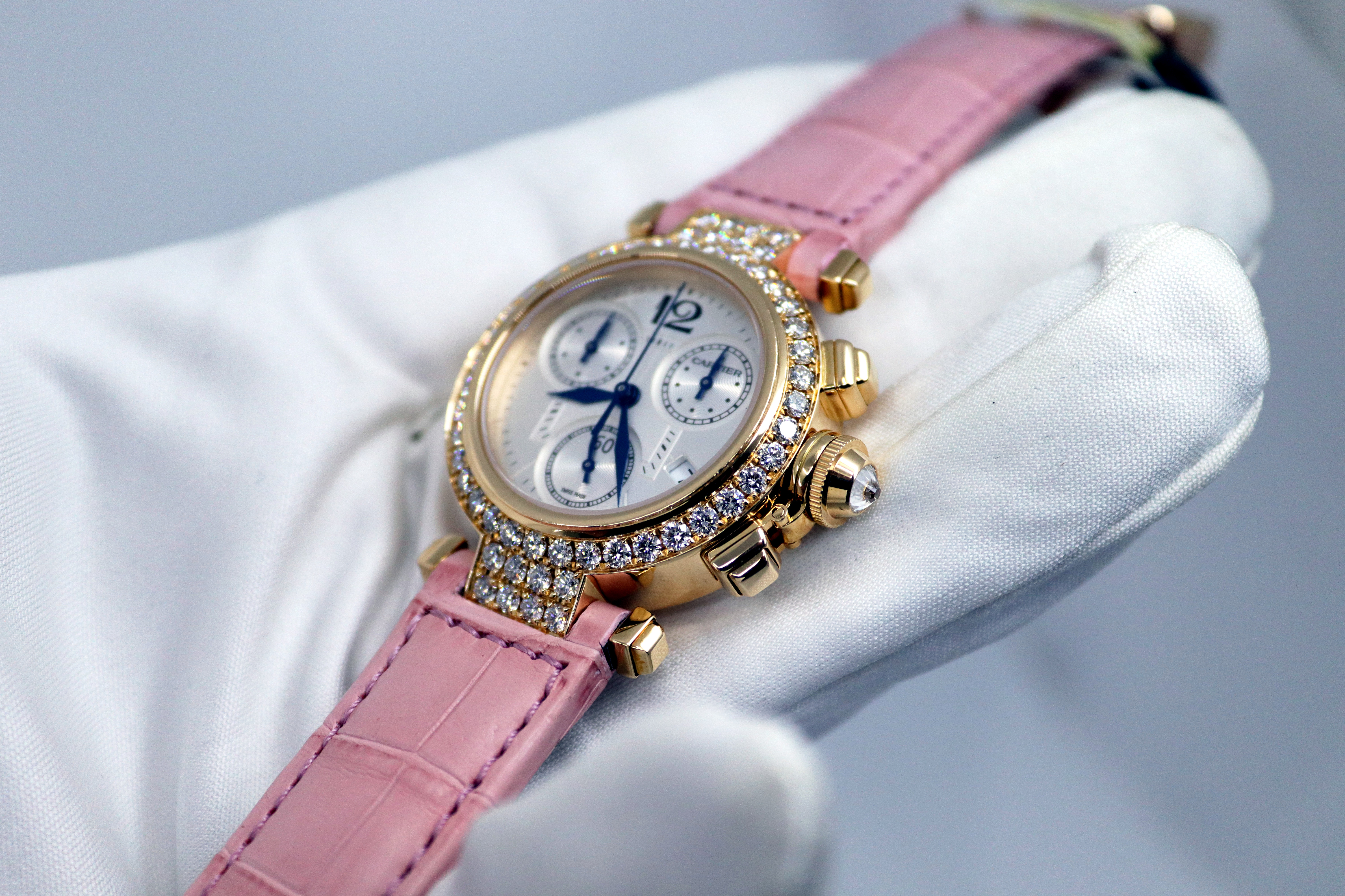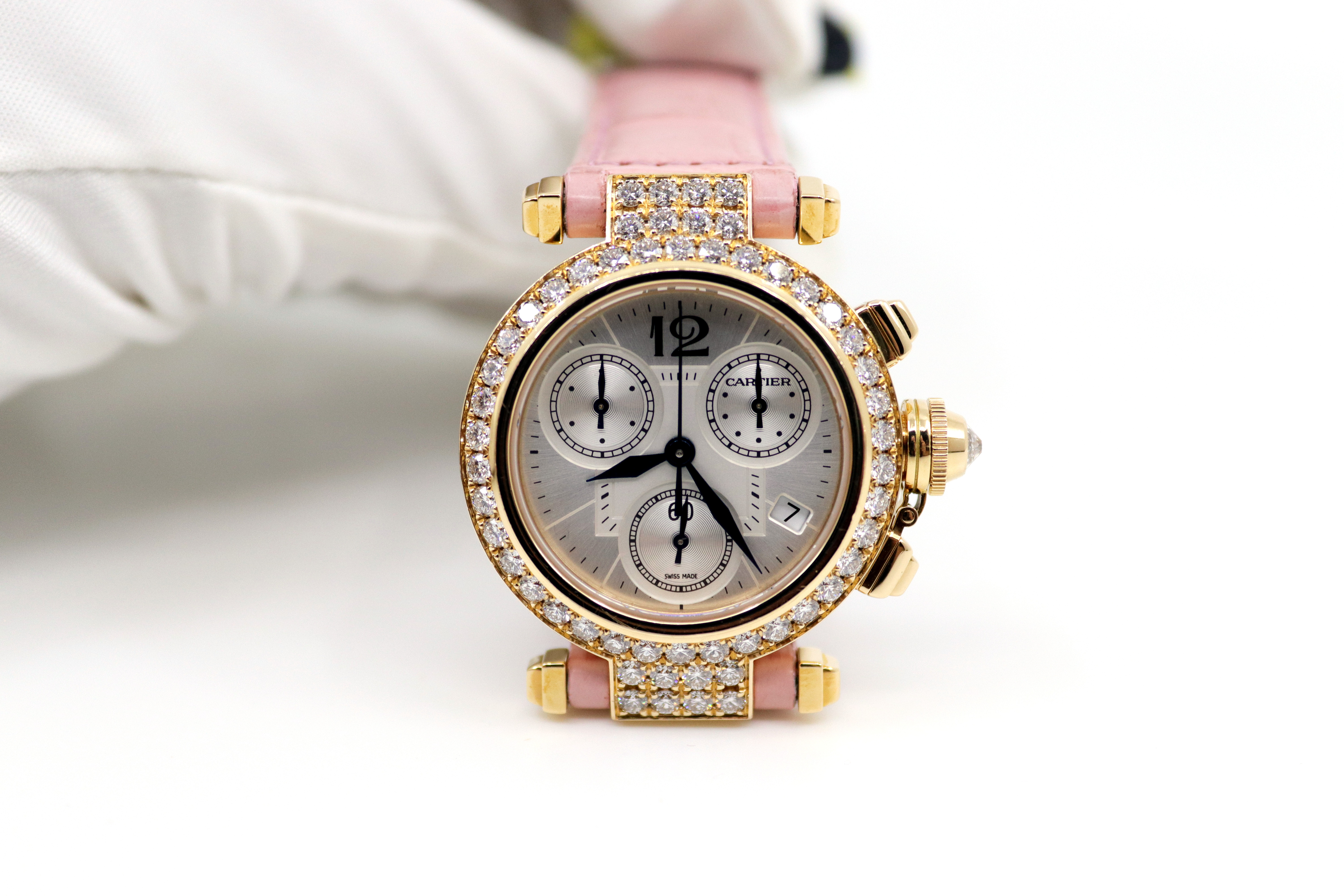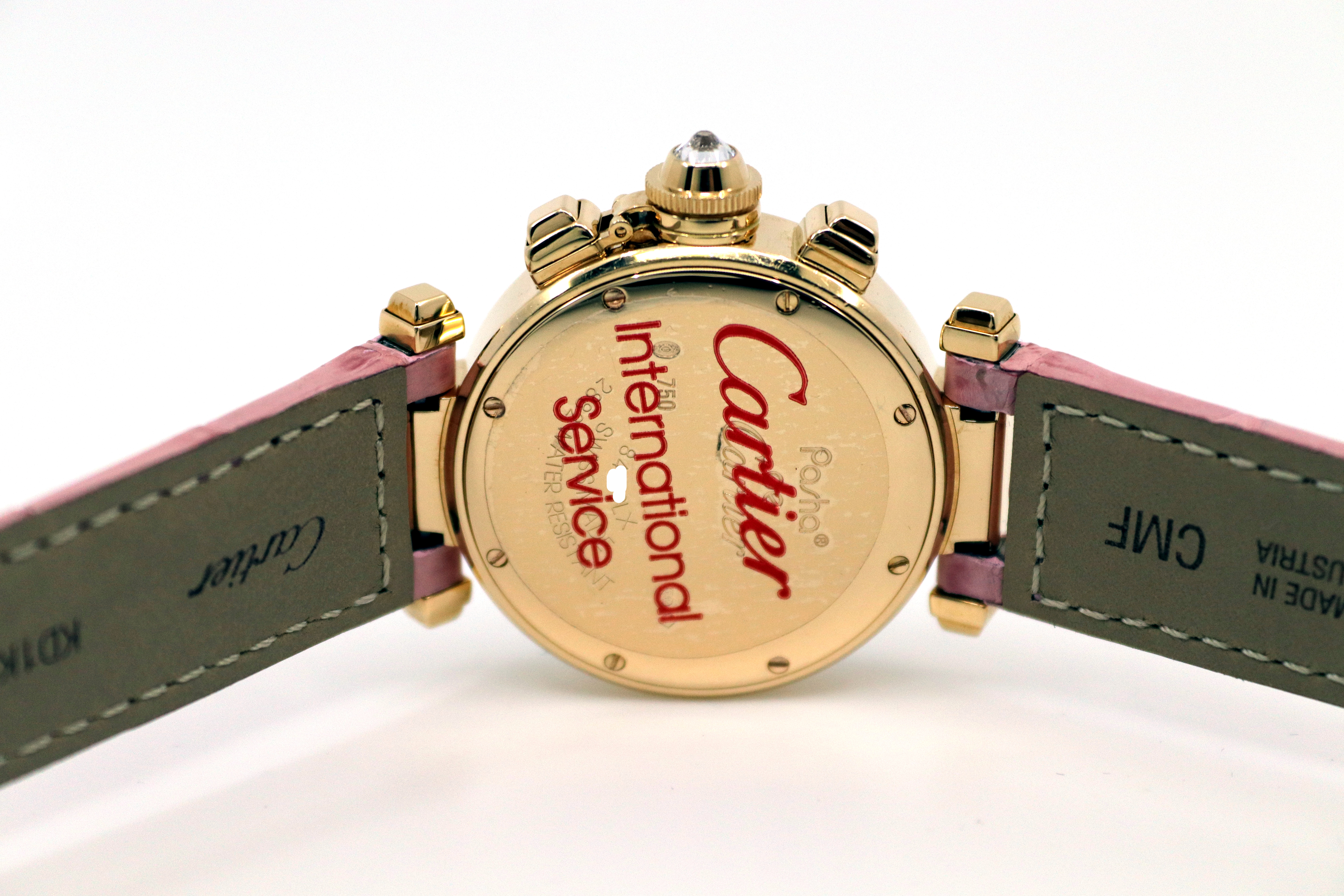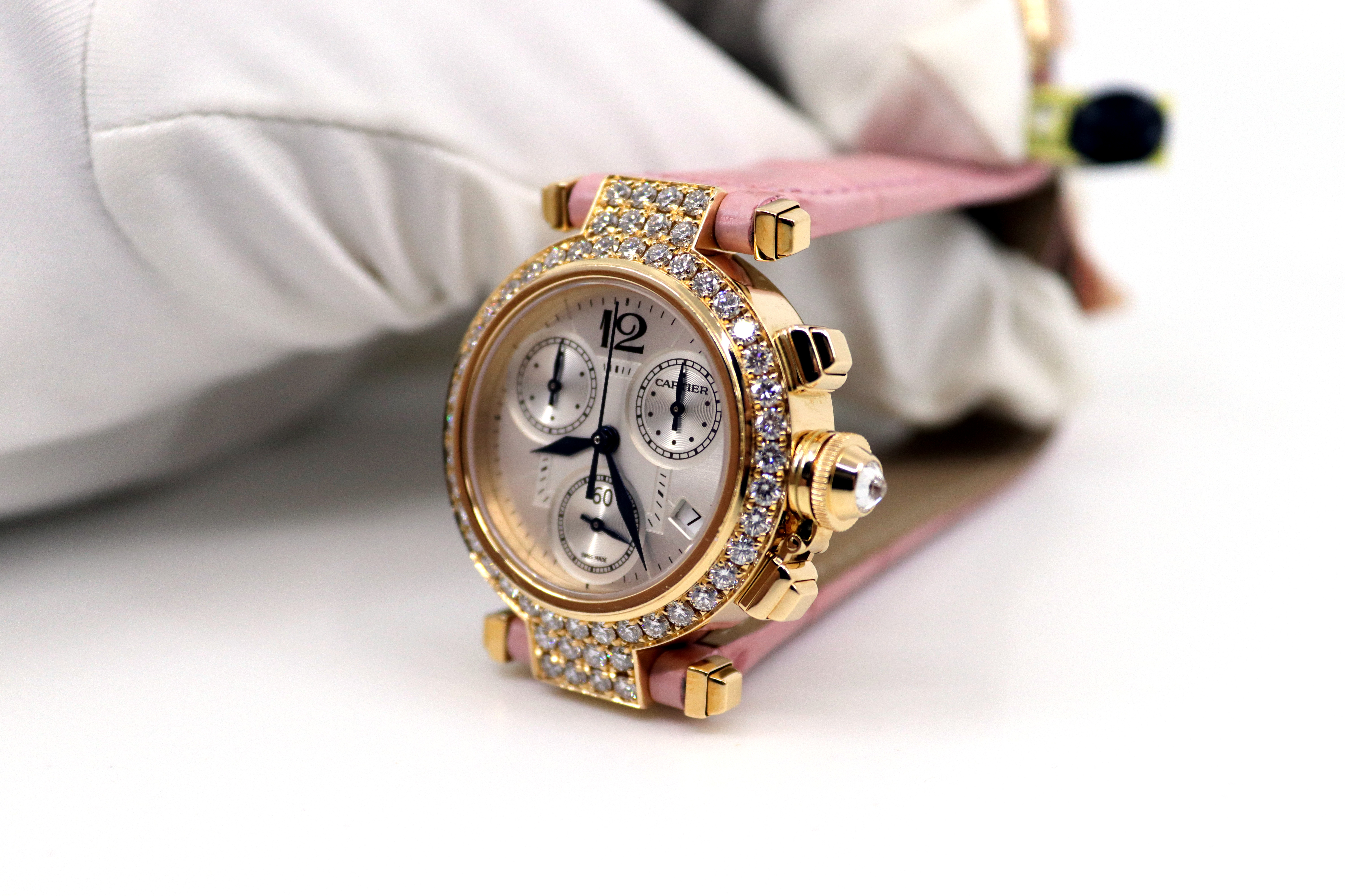 CARTIER Pasha de Cartier Joaillerie Chronograph in 18k Gelbgold | Referenz WJ12061G 2882 | mit neuem Kroko-Armband und Faltschließe in 18k Gelbgold | Durchmesser 32 mm | Chronoflex Uhrwerk mit Chronograph und Datum | Gehäuse - Lünette - Krone mit 55 Diamanten im Brillantschliff besetzt - original Cartier Diamant-Besatz | Saphirglas. Bei der Pasha wurde im August 2019 ein Service bei Cartier durchgeführt, die Uhr befindet sich hiernach in einem ungetragenen Zustand. Anbei Cartier / Richemont Service Rechnung - Cartier Reiseetui. Dieser Artikel ist differenzbesteuert nach §25A UStG. Dieser Artikel ist sofort verfügbar.