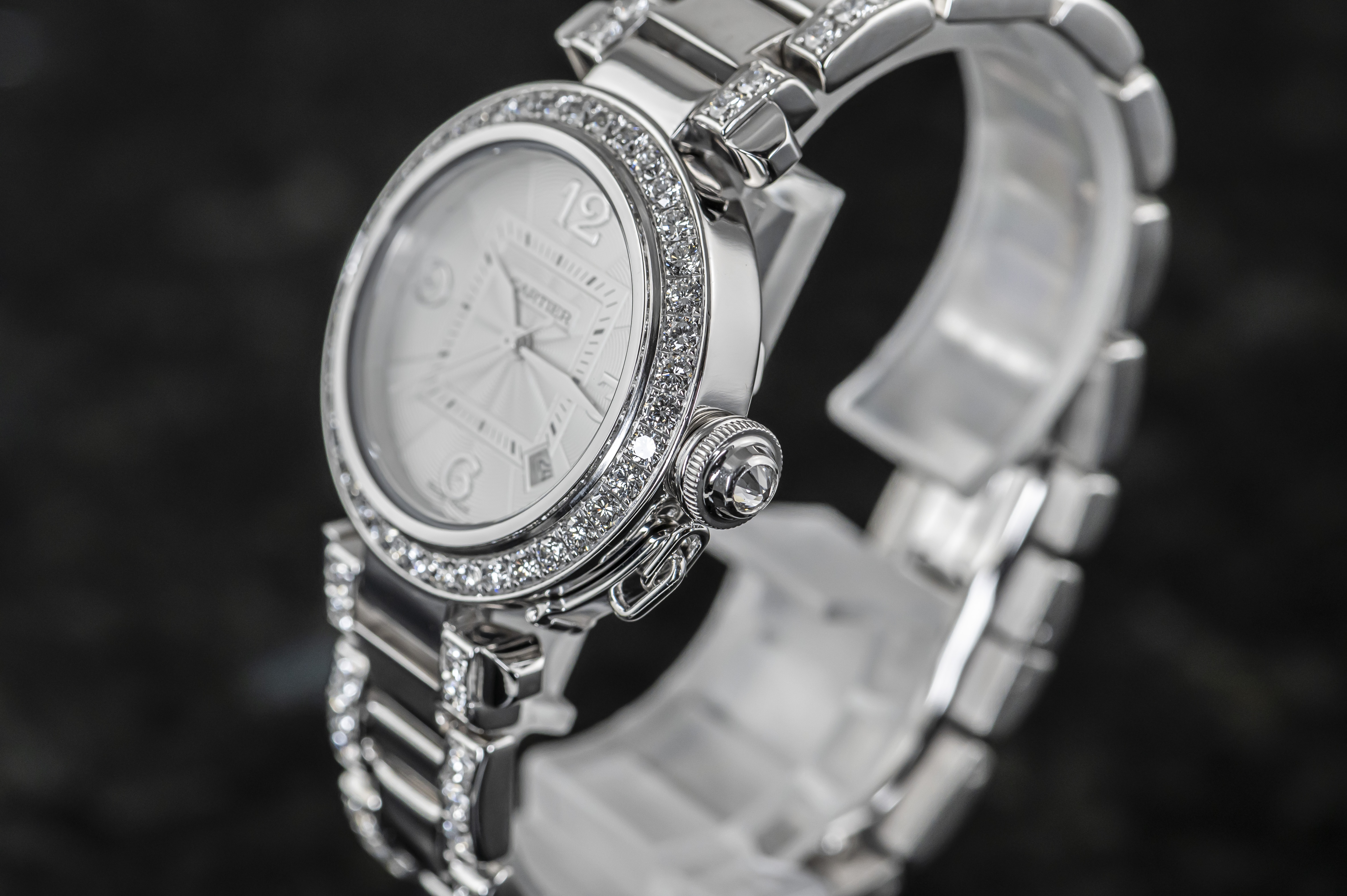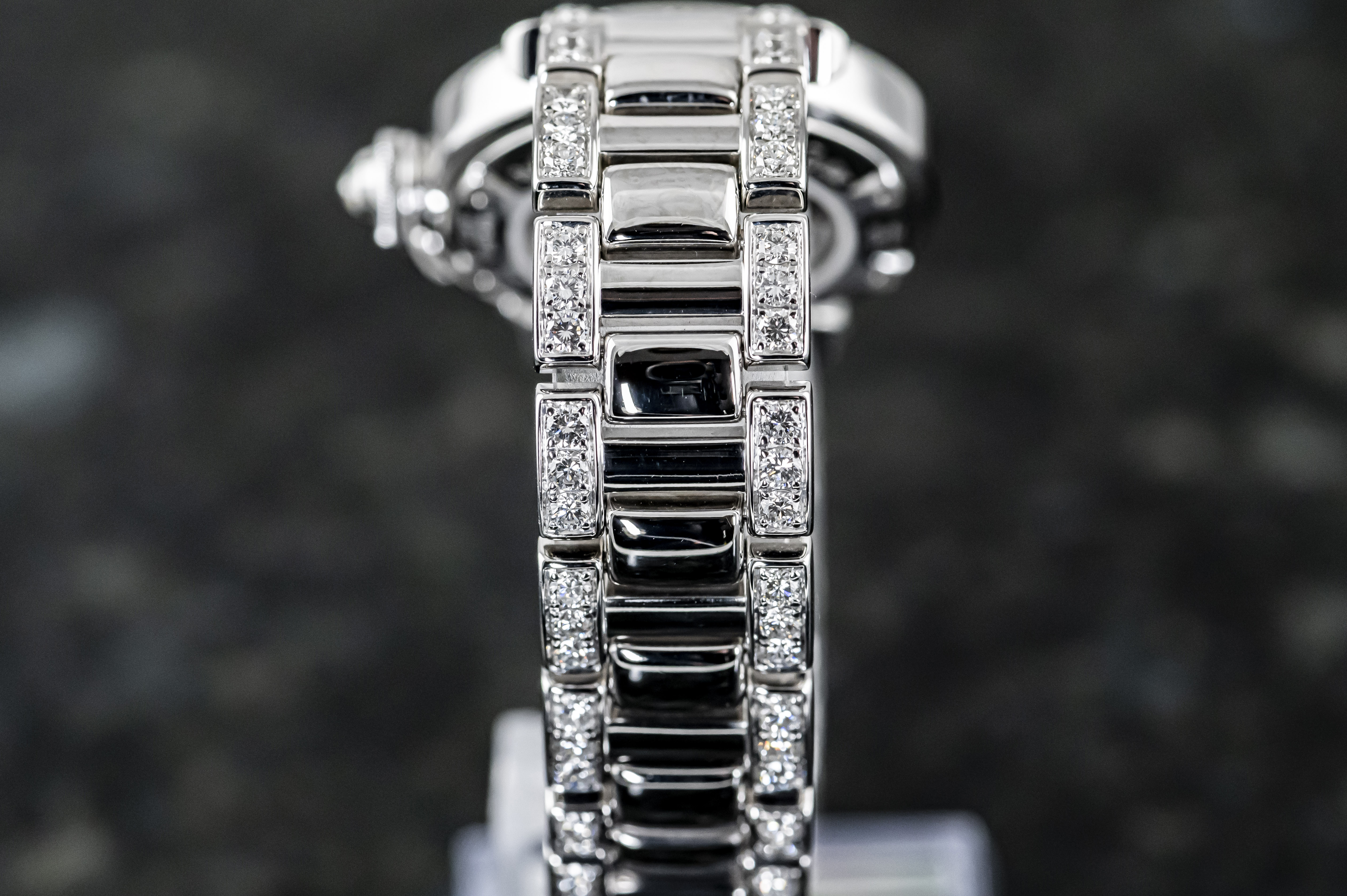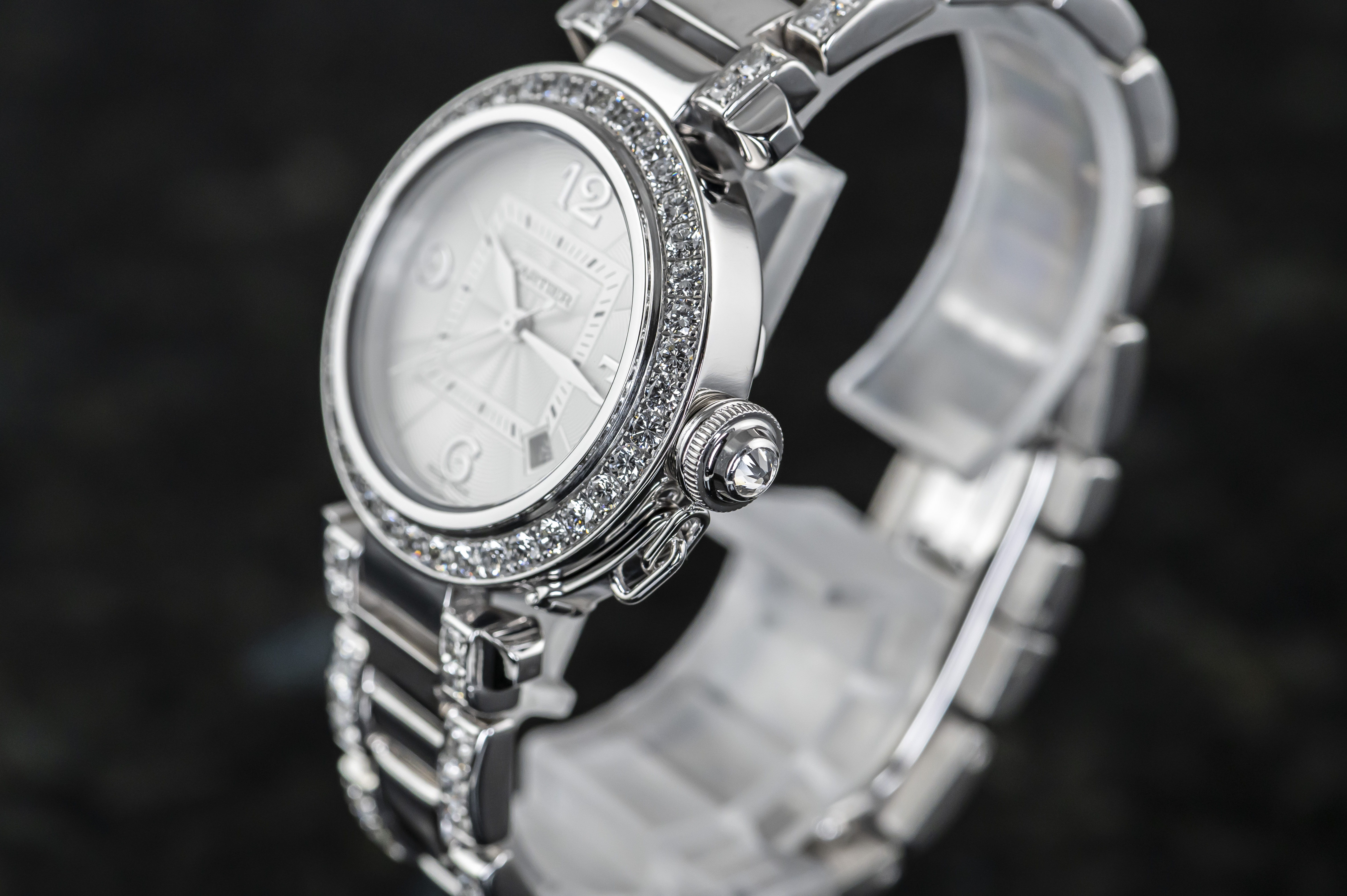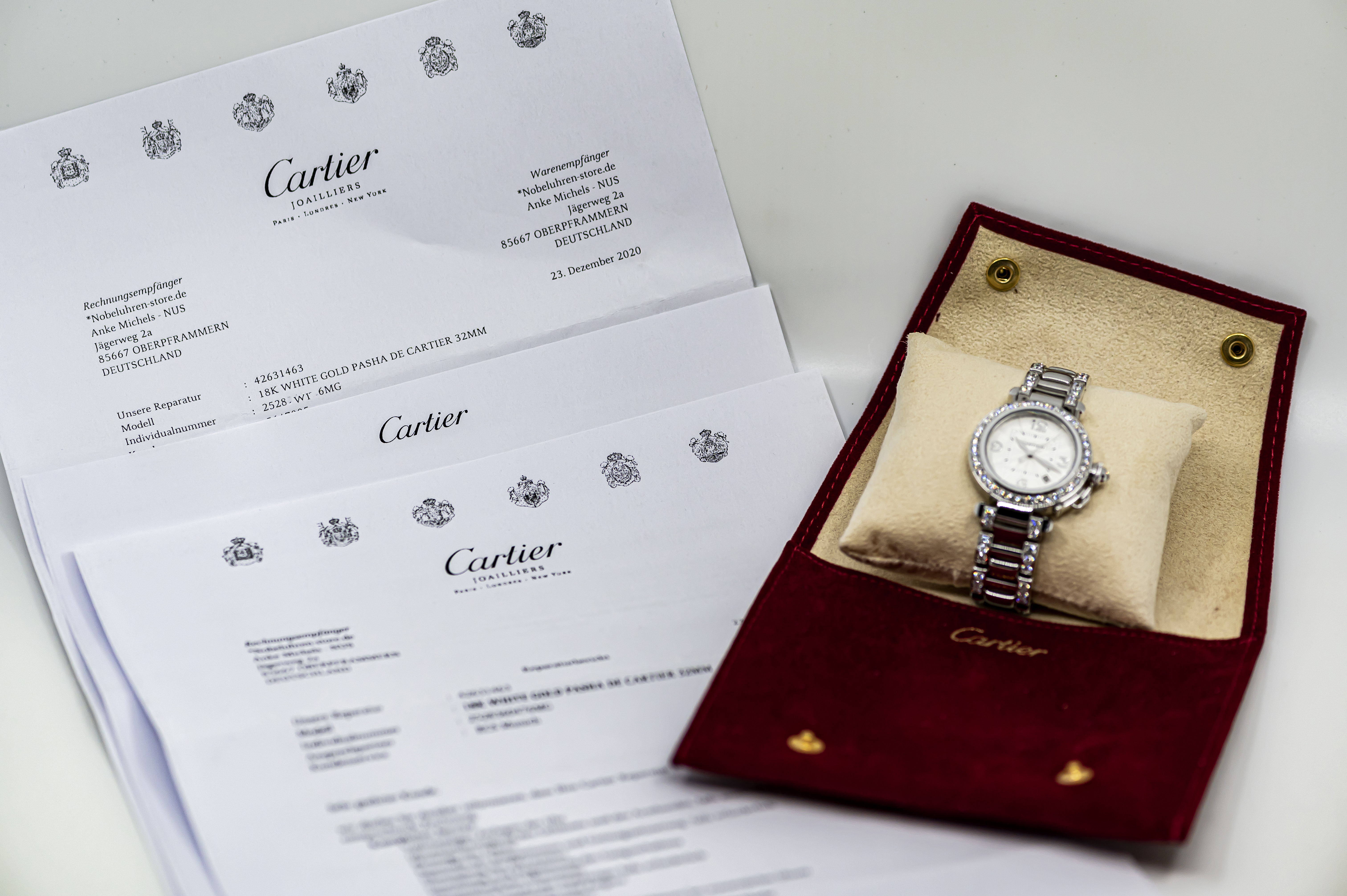 CARTIER Pasha de Cartier 32 Joaillerie in 18k Weißgold | Referenz 2528 - WJ111651 - WJ1116LK | Lünette mit 39 Diamanten besetzt - Krone unter verschraubtem Deckel mit Diamant Cabochon (alles original Cartier Diamant Besatz) zusammen ca. 1.81 Carat | silbernes Zifferblatt mit arabischen Indexen | Automatik Werk Cartier Caliber 500MC mit Zentralsekunde und Datum - Saphirglasboden | Durchmesser 32 mm - Gesamtgewicht 151.7 Gramm - Innenumfang ca. 17 cm | Cartier Pasha Weißgoldband mit insgesamt 92 Diamanten besetzt (alles original Cartier Diamant Besatz) zusammen ca. 4.80 Carat - Doppelfaltschließe | bei der Pasha de Cartier Joaillerie wurde im Dezember 2020 ein Service bei Cartier durchgeführt | die Uhr befindet sich in einem sehr guten Zustand (nach Service ungetragen) | anbei Cartier / Richemont Service Rechnung - Cartier Reiseetui. Dieser Artikel ist differenzbesteuert nach §25A UStG. Dieser Artikel ist sofort verfügbar.