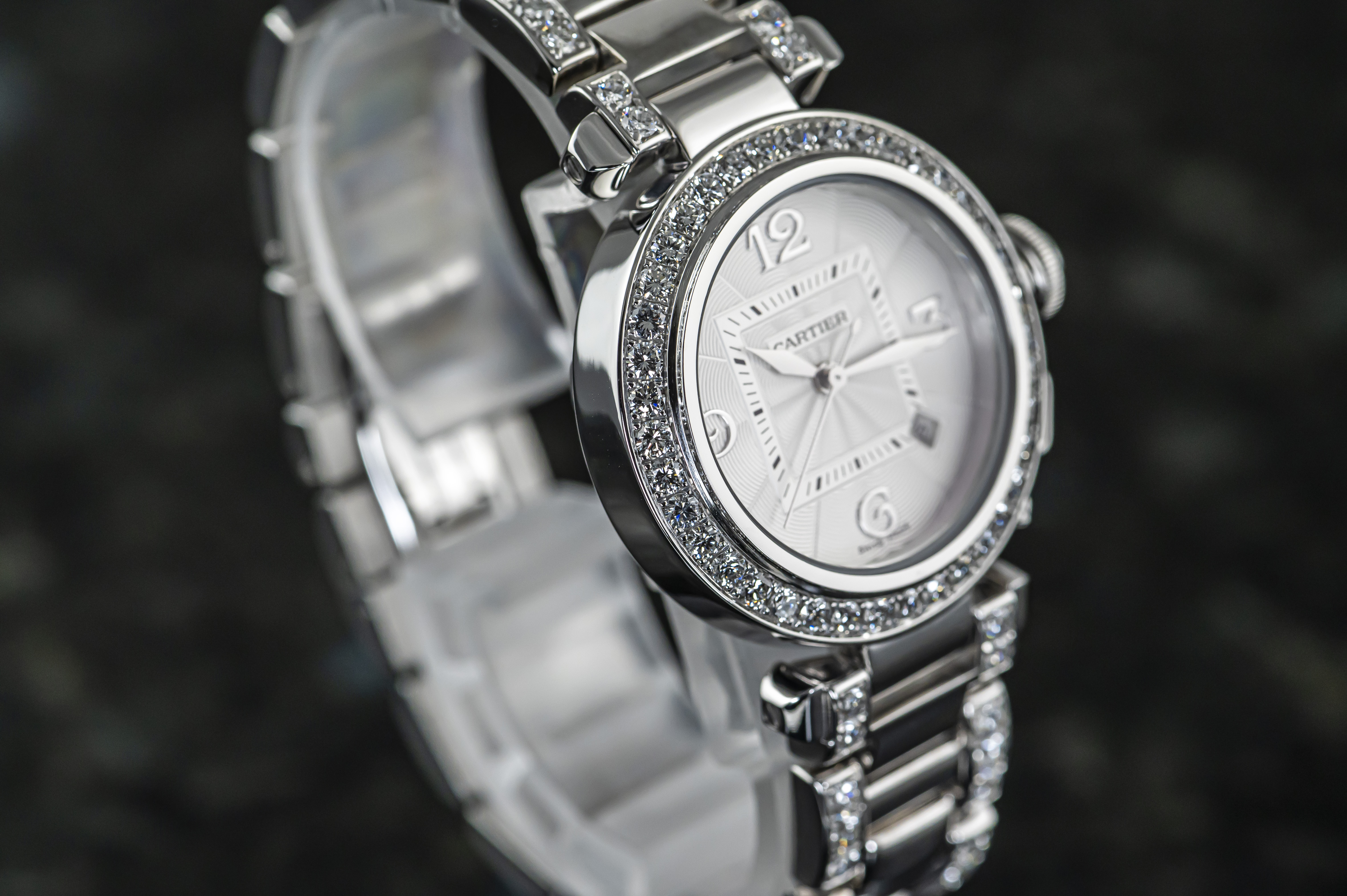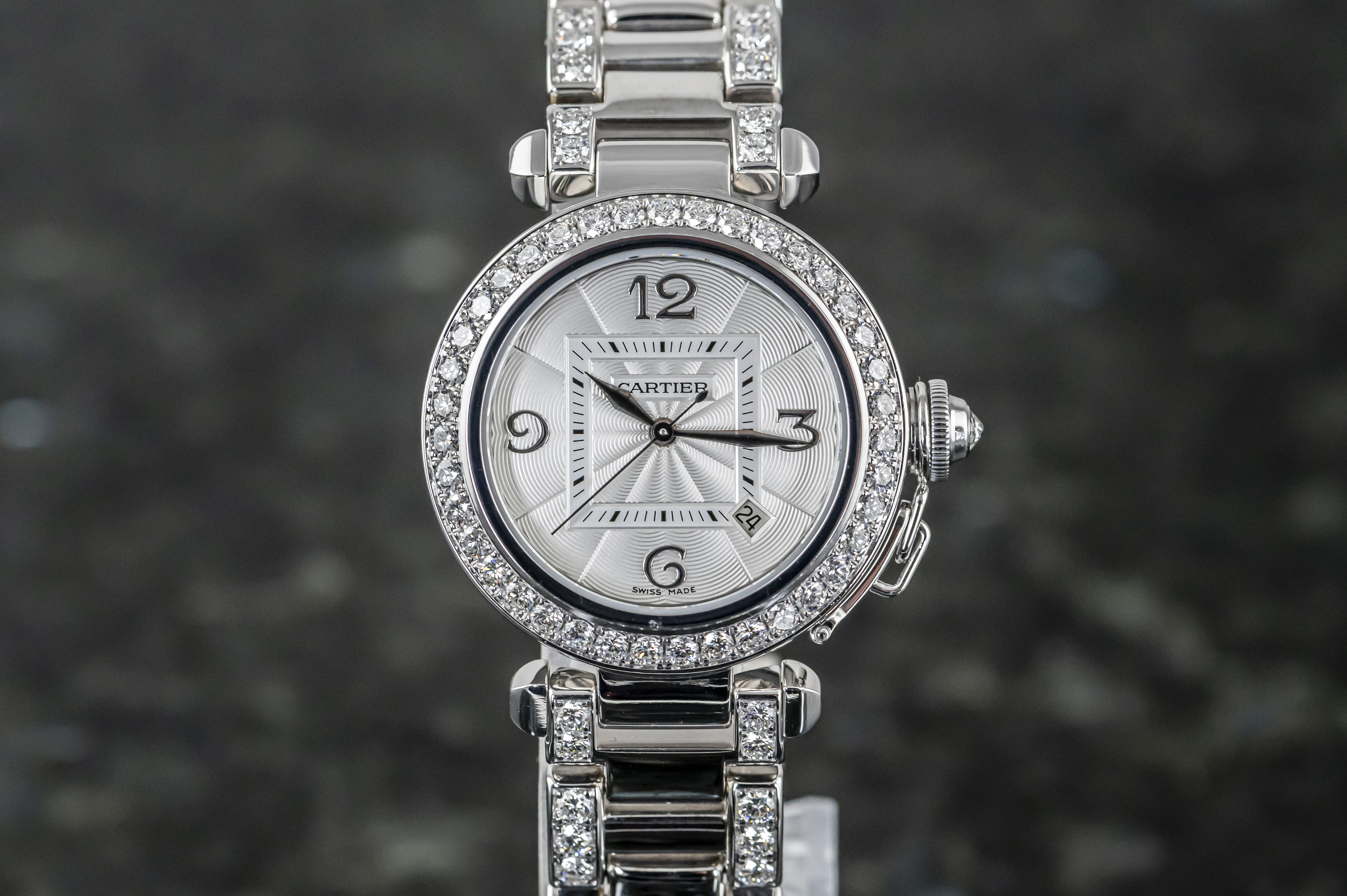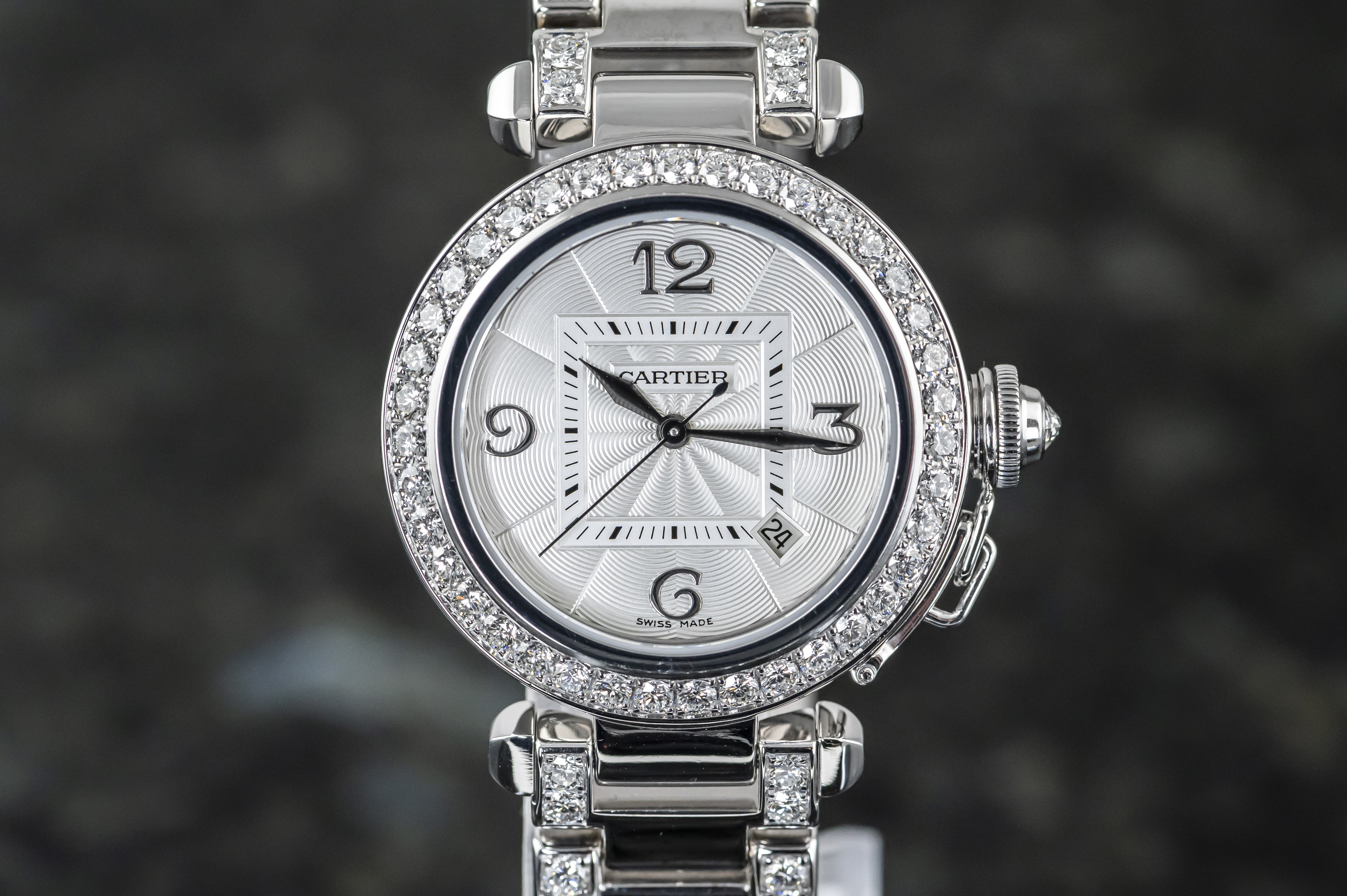 CARTIER Pasha de Cartier 32 Joaillerie in 18k Weißgold | Referenz 2528 - WJ111651 - WJ1116LK | Lünette mit 39 Diamanten besetzt - Krone unter verschraubtem Deckel mit Diamant Cabochon (alles original Cartier Diamant Besatz) zusammen ca. 1.81 Carat | silbernes Zifferblatt mit arabischen Indexen | Automatik Werk Cartier Caliber 500MC mit Zentralsekunde und Datum - Saphirglasboden | Durchmesser 32 mm - Gesamtgewicht 151.7 Gramm - Innenumfang ca. 17 cm | Cartier Pasha Weißgoldband mit insgesamt 92 Diamanten besetzt (alles original Cartier Diamant Besatz) zusammen ca. 4.80 Carat - Doppelfaltschließe | bei der Pasha de Cartier Joaillerie wurde im Dezember 2020 ein Service bei Cartier durchgeführt | die Uhr befindet sich in einem sehr guten Zustand (nach Service ungetragen) | anbei Cartier / Richemont Service Rechnung - Cartier Reiseetui. Dieser Artikel ist differenzbesteuert nach §25A UStG. Dieser Artikel ist sofort verfügbar.