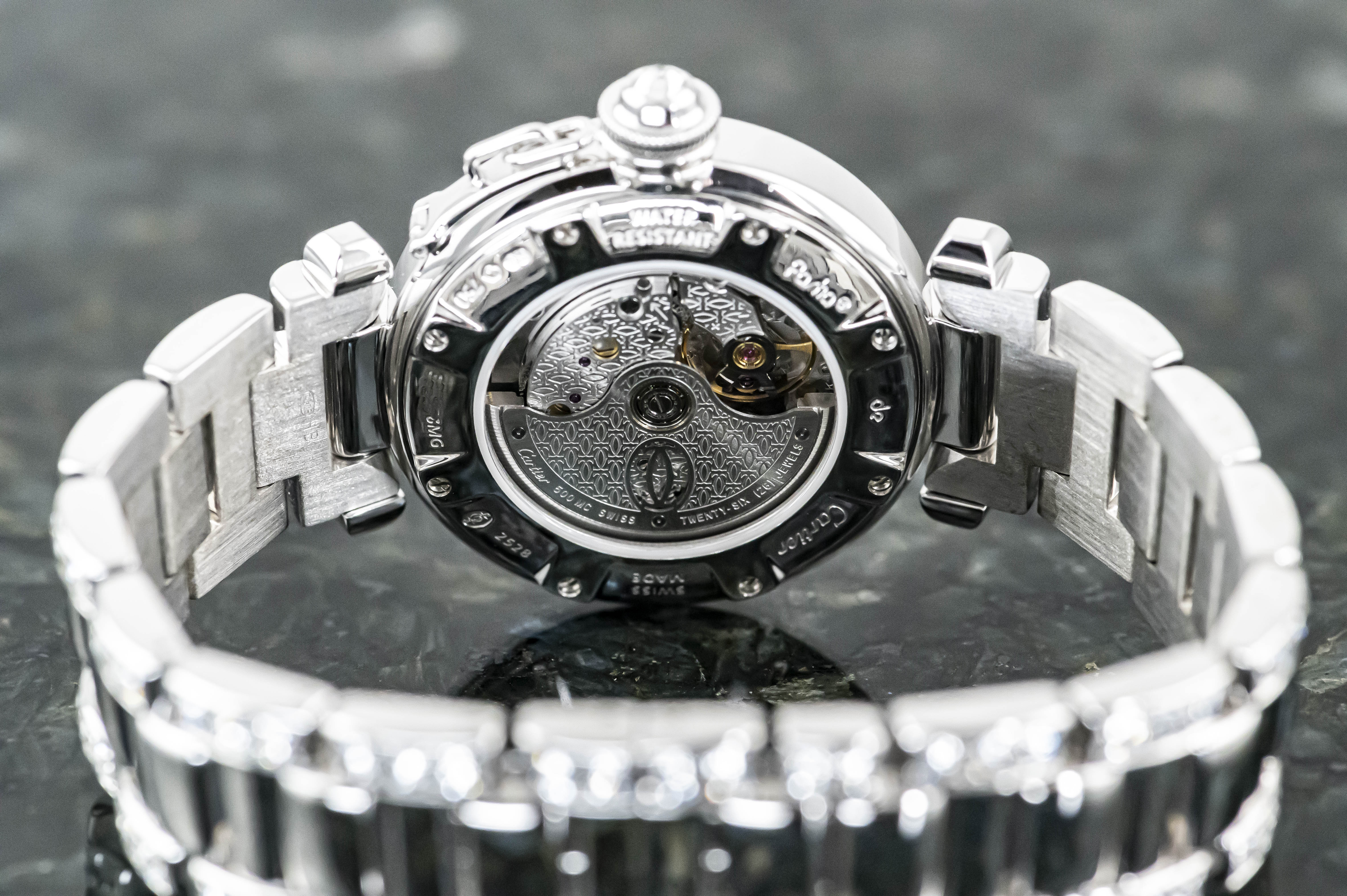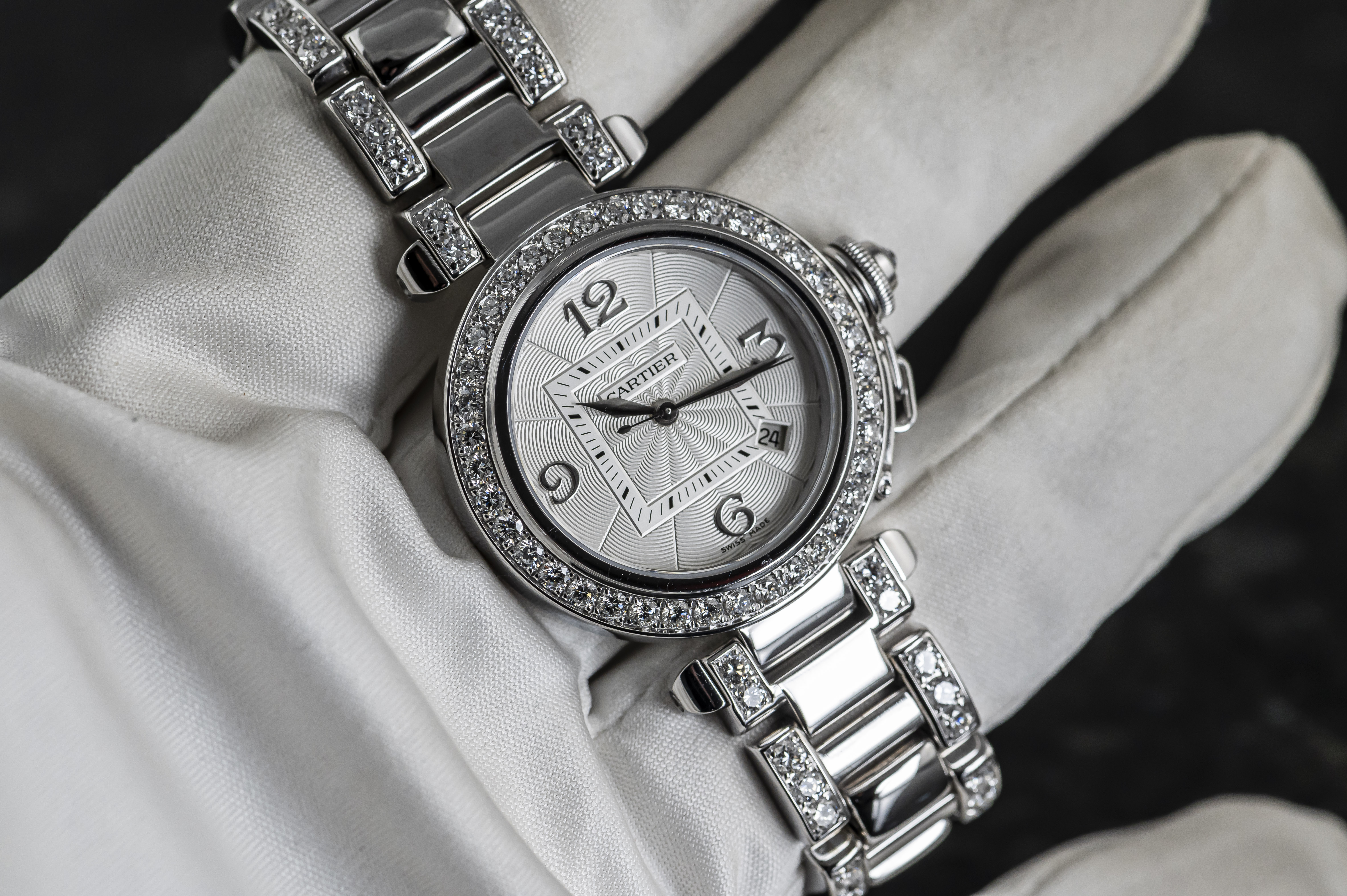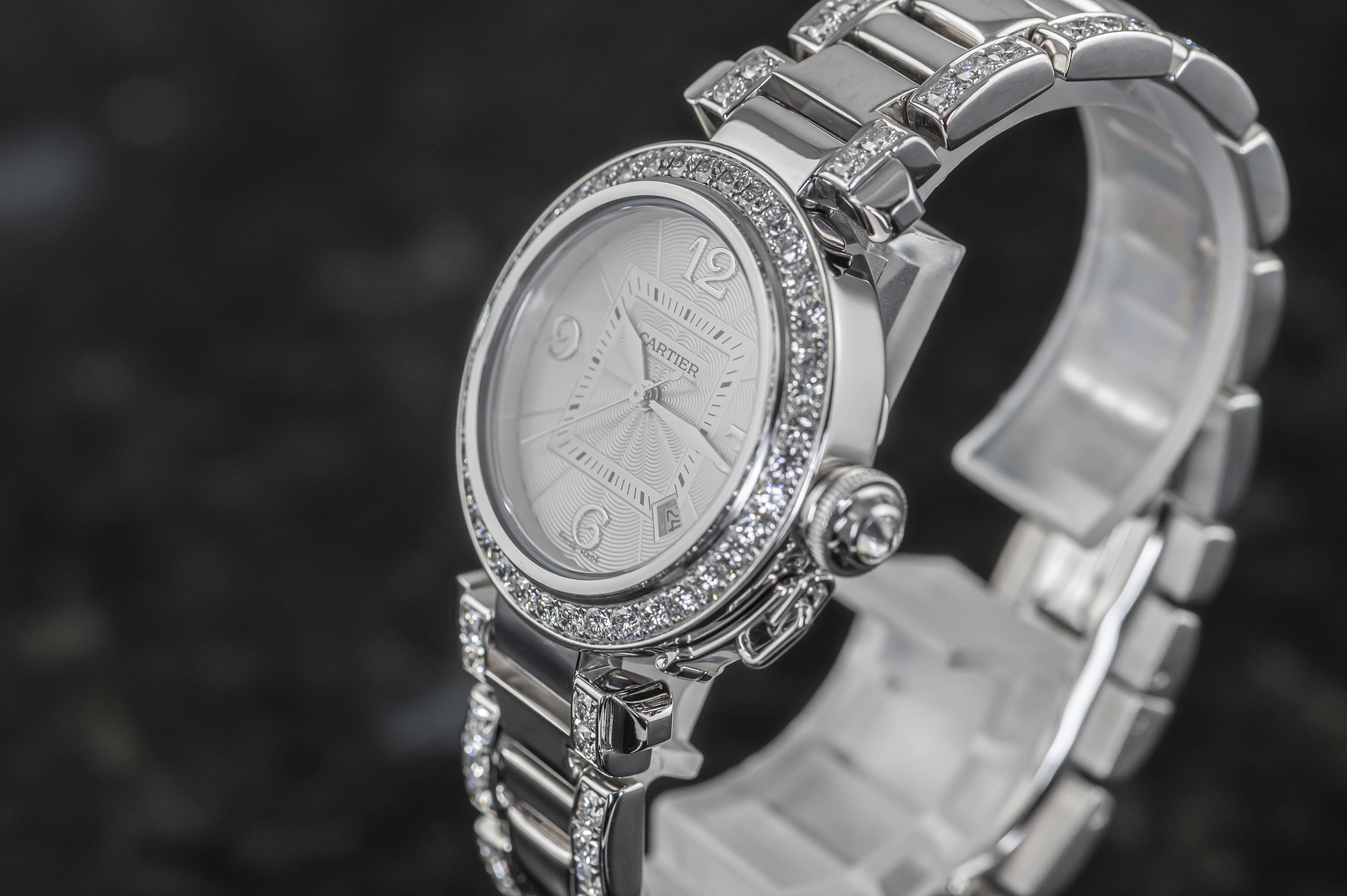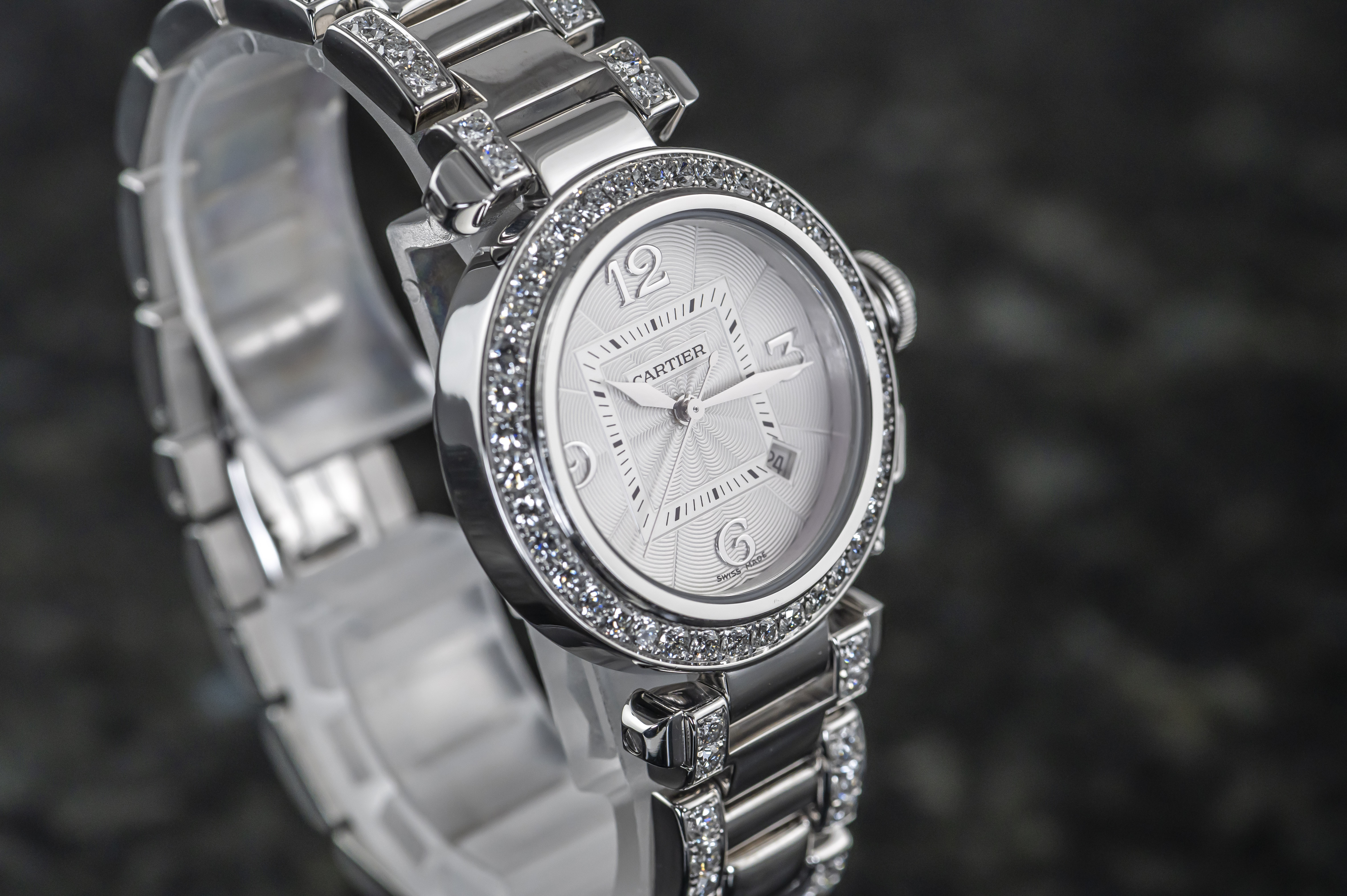 CARTIER Pasha de Cartier 32 Joaillerie in 18k Weißgold | Referenz 2528 - WJ111651 - WJ1116LK | Lünette mit 39 Diamanten besetzt - Krone unter verschraubtem Deckel mit Diamant Cabochon (alles original Cartier Diamant Besatz) zusammen ca. 1.81 Carat | silbernes Zifferblatt mit arabischen Indexen | Automatik Werk Cartier Caliber 500MC mit Zentralsekunde und Datum - Saphirglasboden | Durchmesser 32 mm - Gesamtgewicht 151.7 Gramm - Innenumfang ca. 17 cm | Cartier Pasha Weißgoldband mit insgesamt 92 Diamanten besetzt (alles original Cartier Diamant Besatz) zusammen ca. 4.80 Carat - Doppelfaltschließe | bei der Pasha de Cartier Joaillerie wurde im Dezember 2020 ein Service bei Cartier durchgeführt | die Uhr befindet sich in einem sehr guten Zustand (nach Service ungetragen) | anbei Cartier / Richemont Service Rechnung - Cartier Reiseetui. Dieser Artikel ist differenzbesteuert nach §25A UStG. Dieser Artikel ist sofort verfügbar.
