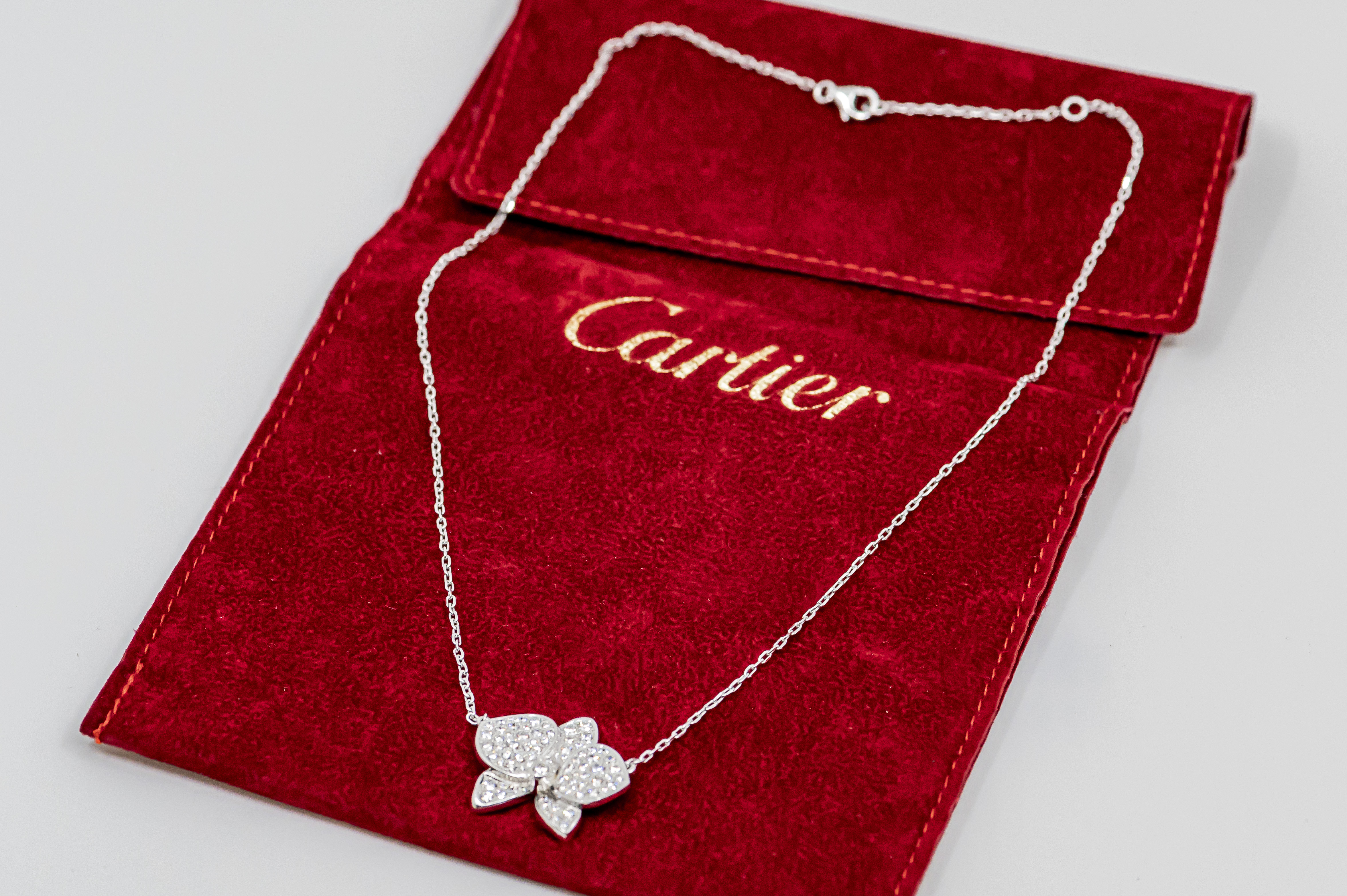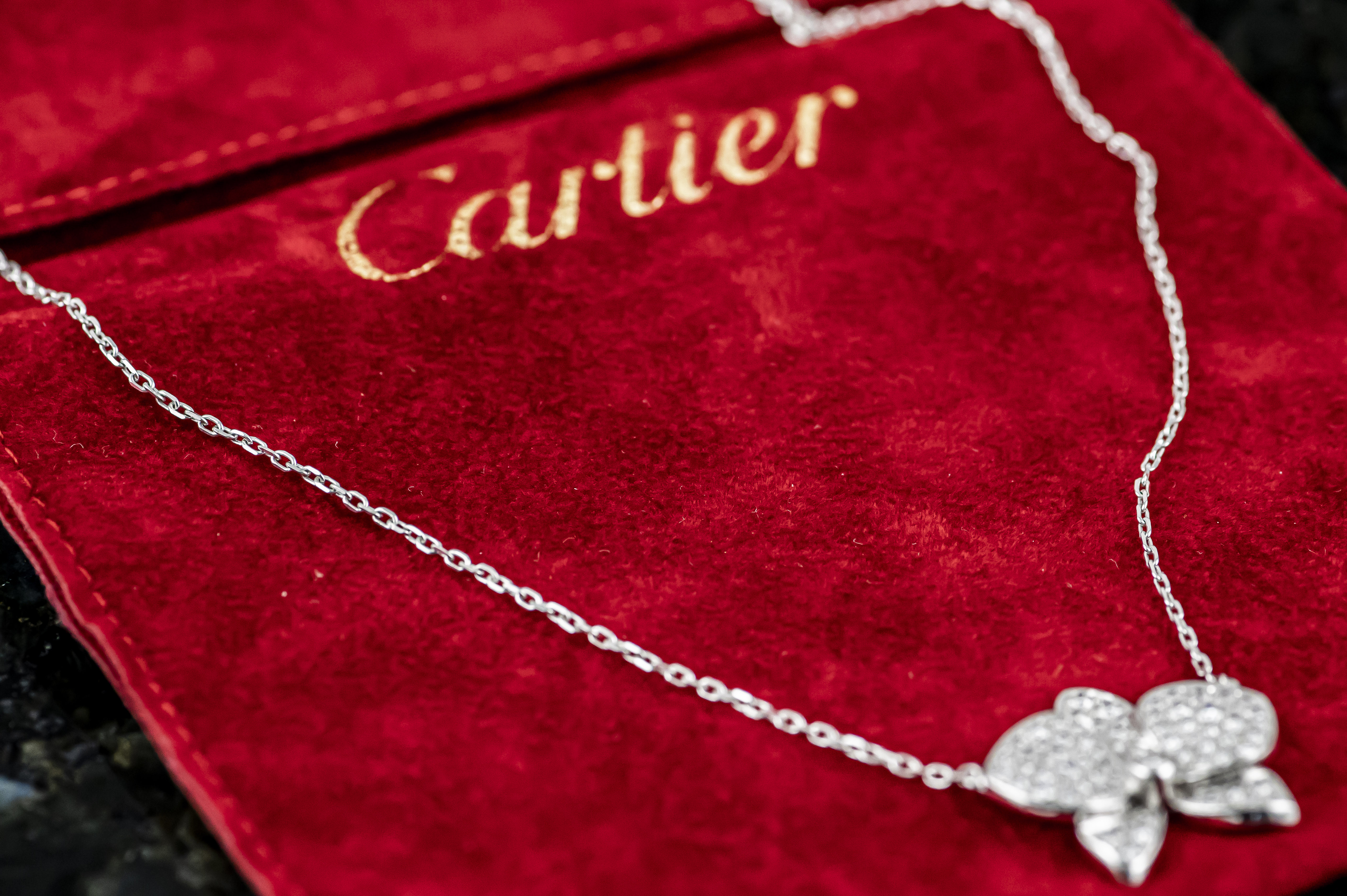 CARTIER CARESSE D'ORCHIDÉES par Cartier Collier in 18k Weißgold | mit Brillanten Pavé gefasst - naturalistischer Orchideenblüten Entwurf | Cartier signiert und nummeriert | Gesamtlänge 40 cm - Gesamtgewicht ca. 10.1 Gramm | sehr guter Zustand | verkauft durch die Cartier Boutique Düsseldorf / Königsallee | die Orchidee wird von Cartier als eine ihrer am meisten geschätzten Blumenkreationen und als Quelle kontinuierlicher Inspiration beschrieben - sie verwendeten das Motiv erstmals 1925 und haben es seitdem zu wirklich außergewöhnlichen Juwelen umgestaltet - 2005 lancierte das Maison die Kollektion "Caresse d'Orchidées par Cartier", zu der dieser ansprechende Ring gehört. Dieser Artikel ist differenzbesteuert nach §25A UStG. Dieser Artikel ist sofort lieferbar.