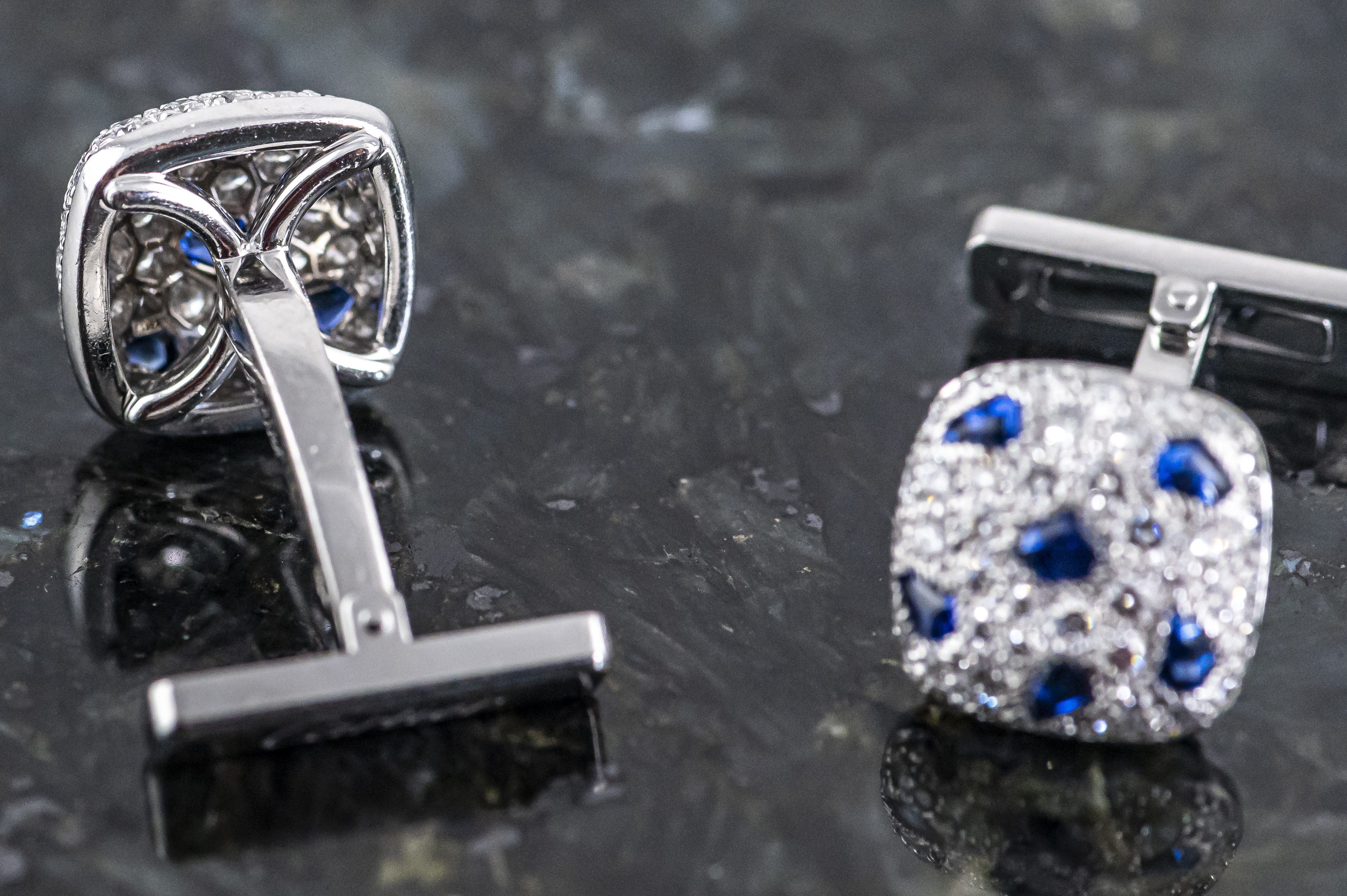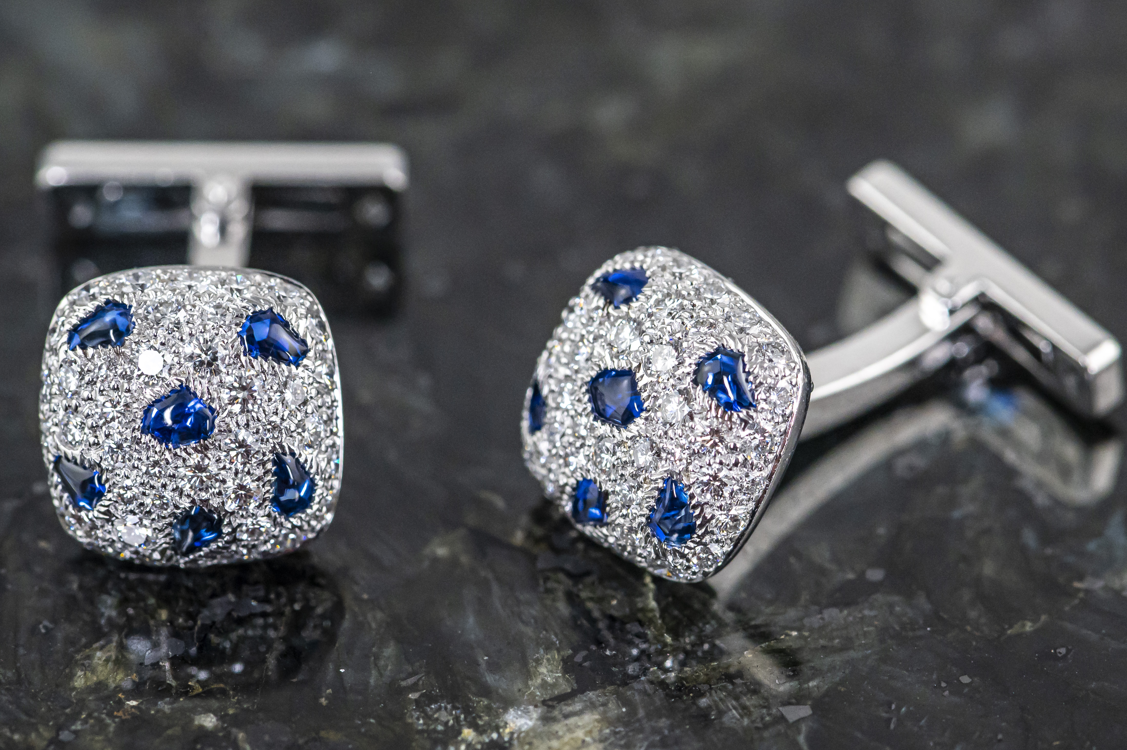 CARTIER Panthère de Cartier Manschettenknöpfe in 18k Weißgold | mit Brillanten Pavé gefasst - jeweils mit sechs Saphiren besetzt | Cartier signiert und nummeriert | Gesamtgewicht ca. 11.2 Gramm | sehr guter Zustand | verkauft durch die Cartier Boutique Düsseldorf / Königsallee. Dieser Artikel ist differenzbesteuert nach §25A UStG. Dieser Artikel ist sofort lieferbar.