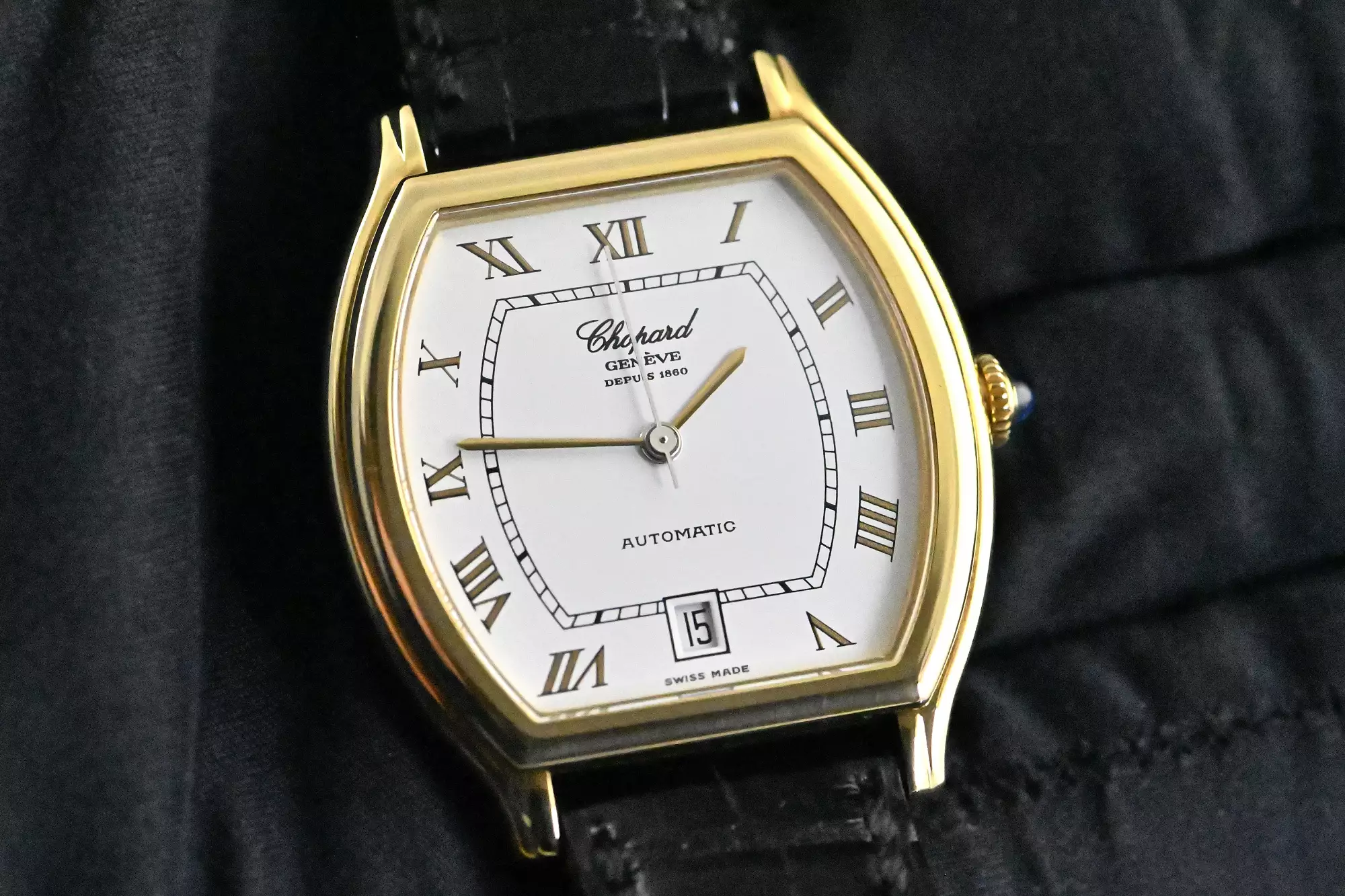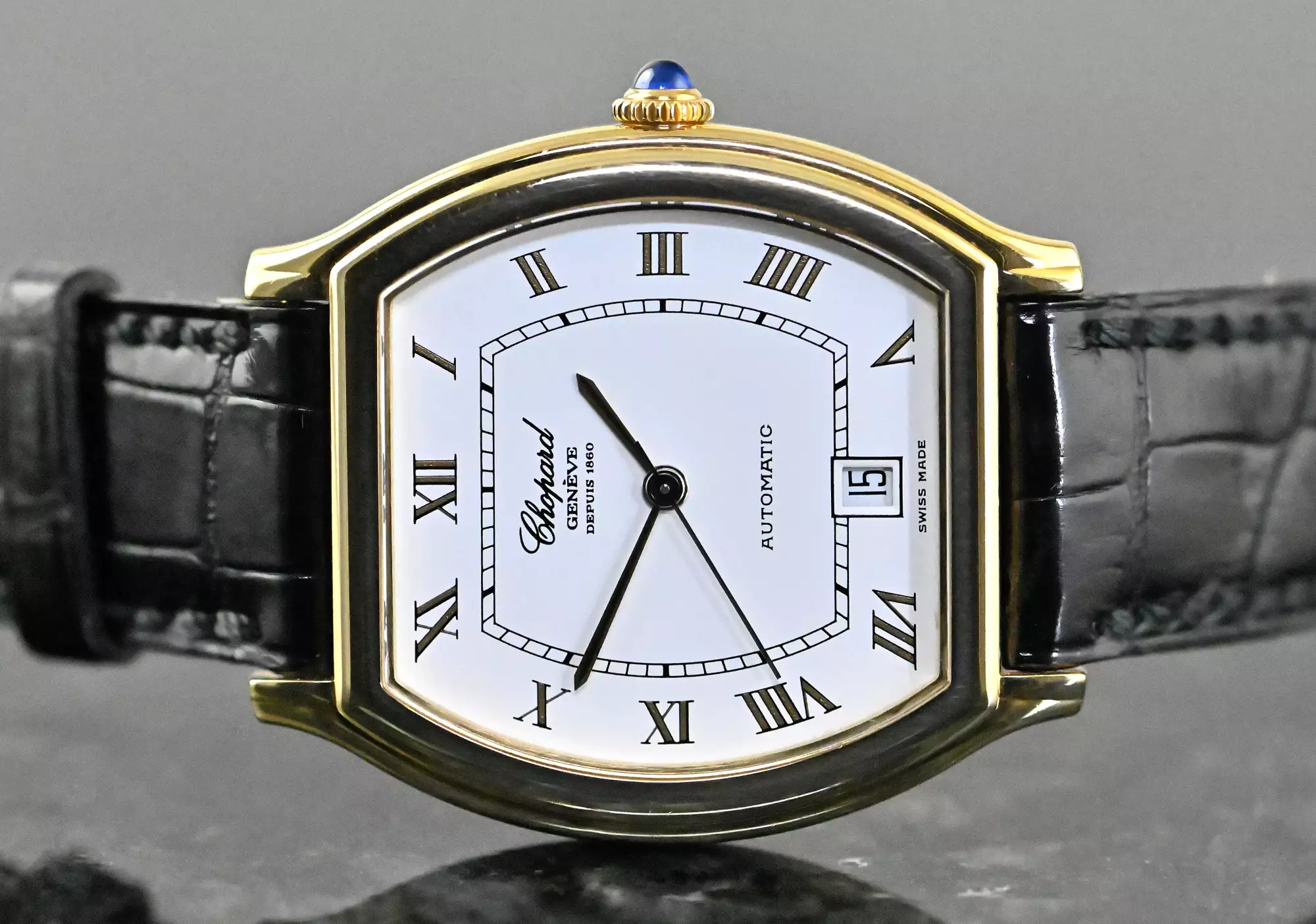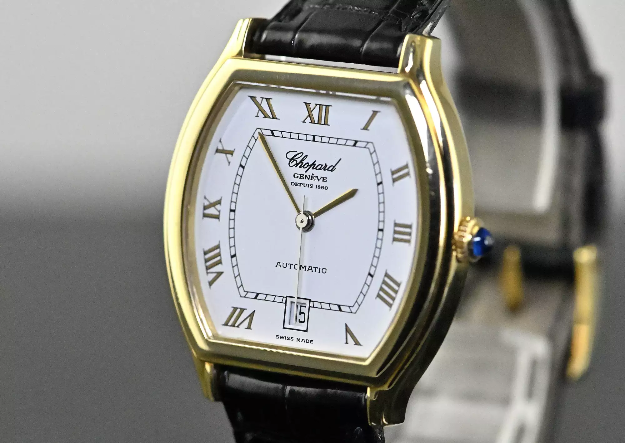 Klassische und seltene Chopard Tonneau Date mit der Referenz 16/2247 in 18k Gelbgold. Die Uhr wird durch das Chopard Automatik Kaliber 9511 angetrieben. Die Abmessungen der Uhr betragen 38 x 33 mm ohne Krone, die Uhr befindet sich am original Chopard Lederarmband mit der originalen Chopard Dornschließe in Gelbgold. Das klassische und zeitlose Design machen diese Uhr zu einem modernen Klassiker, welcher eine Eleganz und Exklusivität beim Tragen ausstrahlt. Das Gesamtgewicht dieser Chopard liegt bei ca. 52,6 Gramm, insgesamt befindet sich die Uhr in einem guten Zustand. Diese Chopard kommt in einem tollen Full Set mit dem folgendem Zubehör: original Chopard Box mit Umkarton - original Garantie Zertifikat (verkauft am 21.09.2002 in Deutschland) - Chopard Konzessionärliste. Dieser Artikel ist differenzbesteuert nach §25A UStG. Dieser Artikel ist sofort verfügbar.