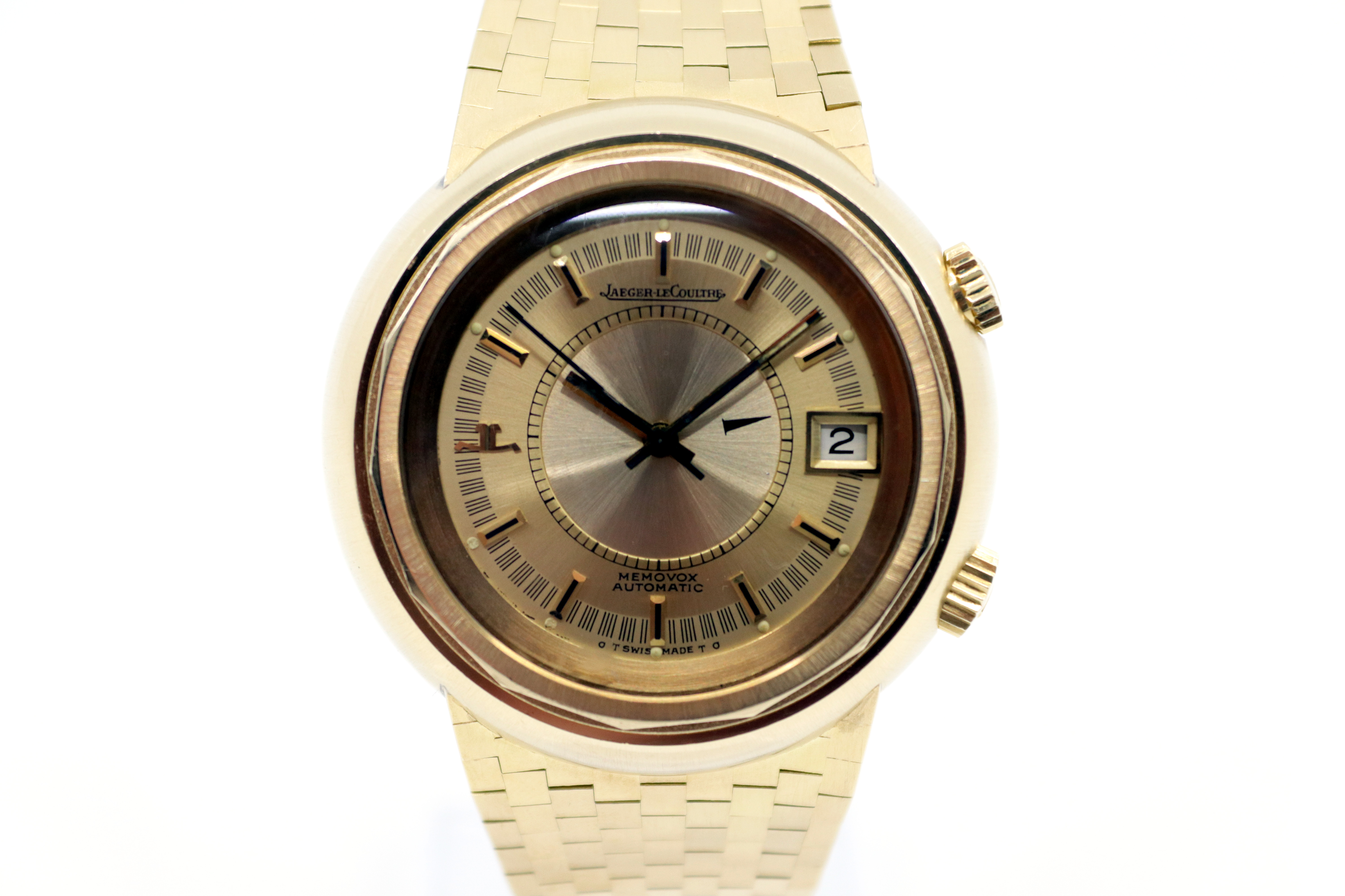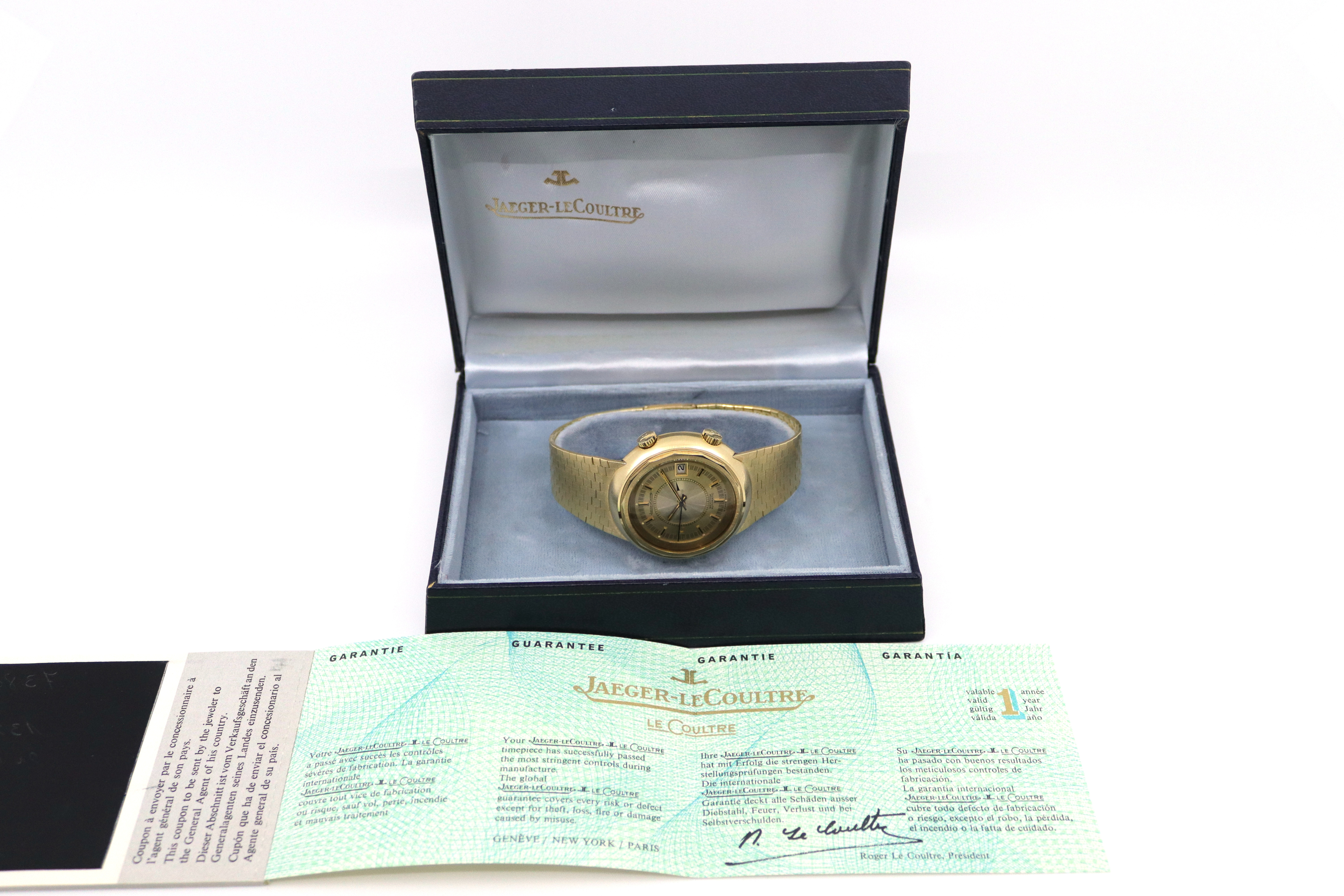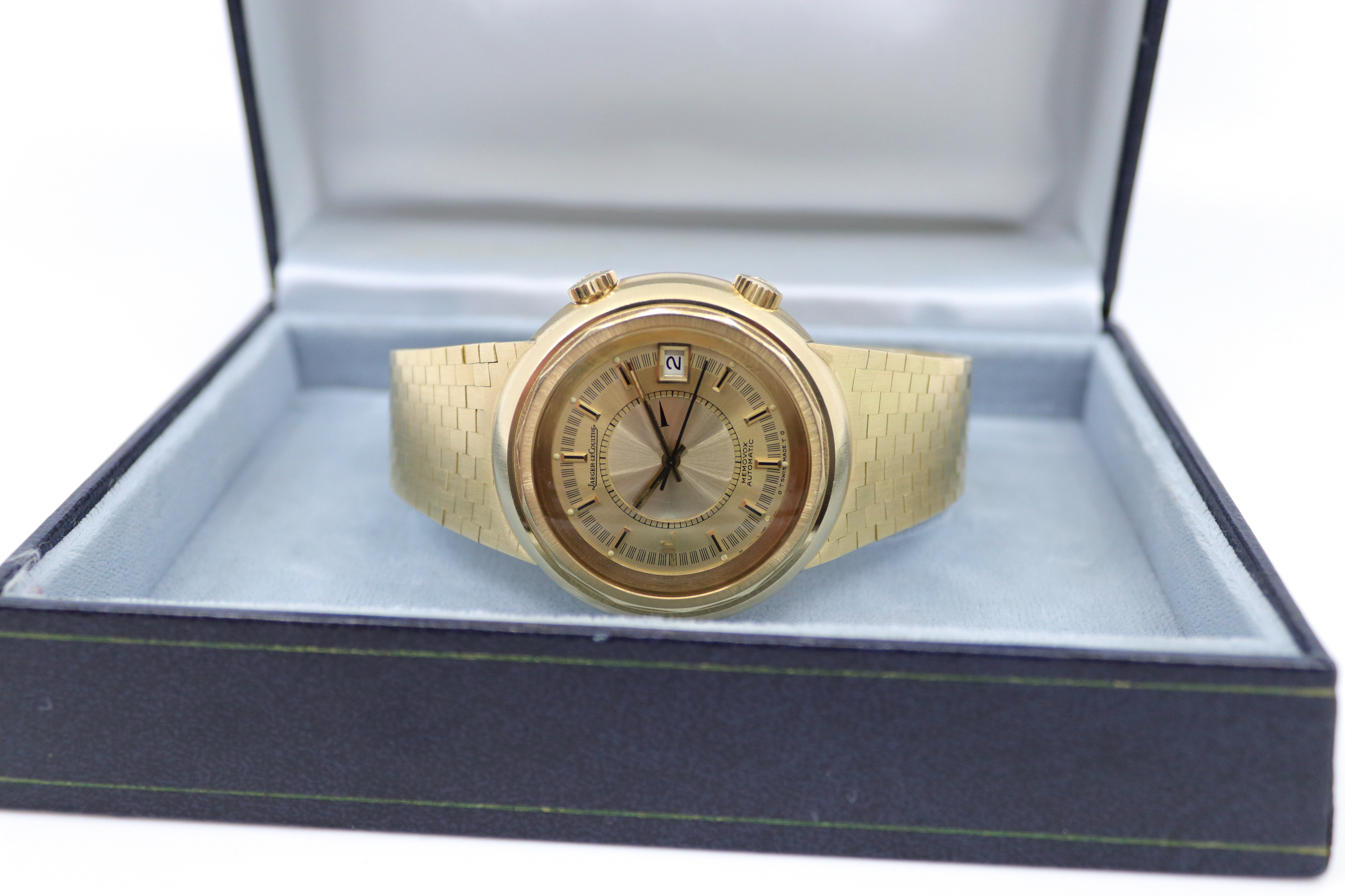 Jaeger LeCoultre MEMOVOX Snowdrop | Referenz 73800-21 in 18k Gelbgold | JLC Caliber 916 Automatik | Funktionen: Stunden - Minuten - Zentralsekunde - Datum - Alarm / Wecker | Monocoque-Gehäuse aus 18k Gold mit zwei Kronen und einer verschraubten Goldlünette | JLC-Gliederarmband aus 18k Gelbgold | von dieser Referenz wurden weniger als 100 Uhren in Gold produziert | Durchmesser 43mm - Höhe 13.8mm | sehr guter Zustand (unpoliert & ungeschliffen)| anbei Box - original Garantie Zertifikat (verkauft am 21. Dezember 1973 durch die Manufaktur LeCoultre & Co, le Sentier. Dieser Artikel ist differenzbesteuert nach §25A UStG. Dieser Artikel ist sofort lieferbar.