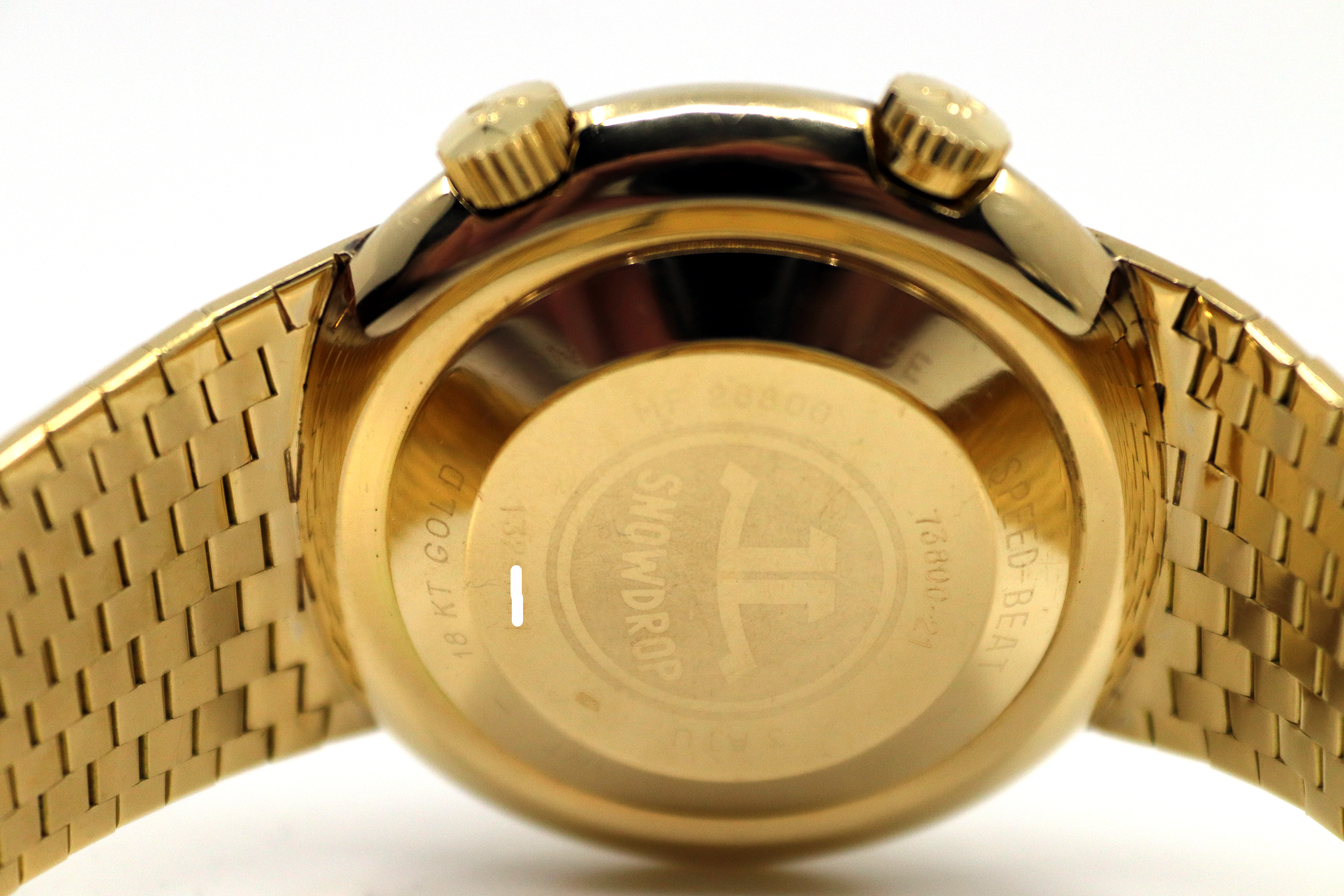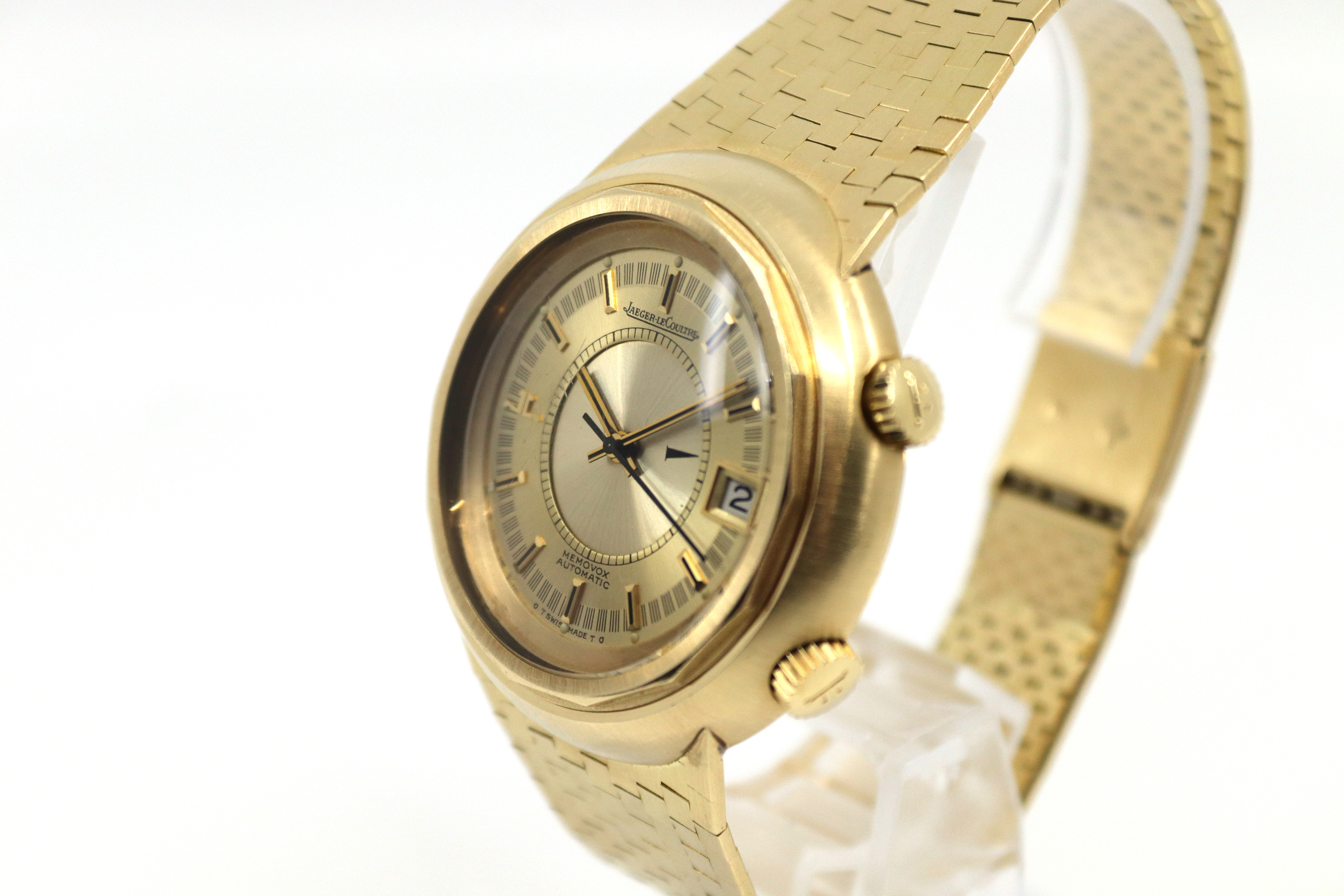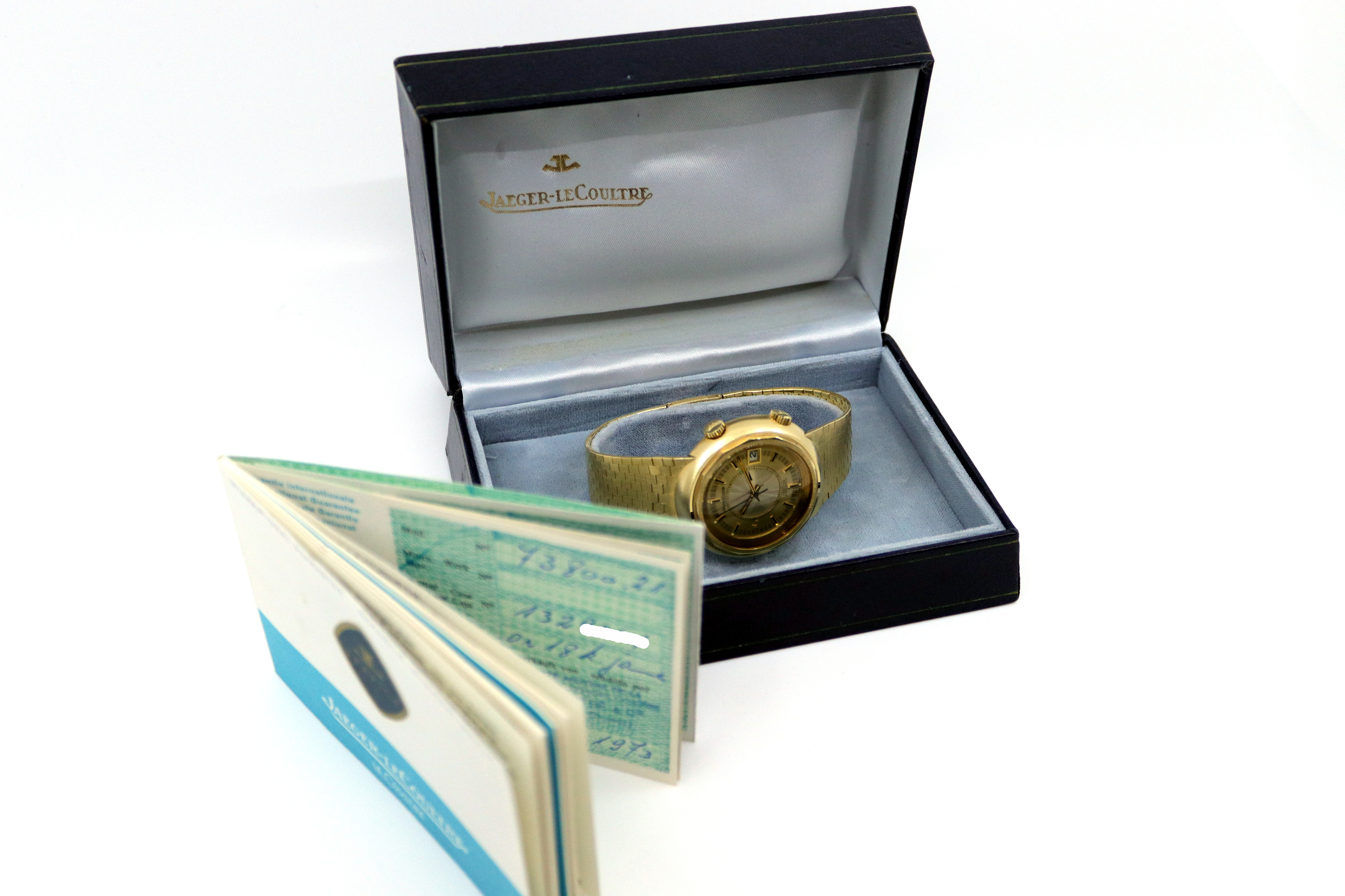 Jaeger LeCoultre MEMOVOX Snowdrop | Referenz 73800-21 in 18k Gelbgold | JLC Caliber 916 Automatik | Funktionen: Stunden - Minuten - Zentralsekunde - Datum - Alarm / Wecker | Monocoque-Gehäuse aus 18k Gold mit zwei Kronen und einer verschraubten Goldlünette | JLC-Gliederarmband aus 18k Gelbgold | von dieser Referenz wurden weniger als 100 Uhren in Gold produziert | Durchmesser 43mm - Höhe 13.8mm | sehr guter Zustand (unpoliert & ungeschliffen)| anbei Box - original Garantie Zertifikat (verkauft am 21. Dezember 1973 durch die Manufaktur LeCoultre & Co, le Sentier. Dieser Artikel ist differenzbesteuert nach §25A UStG. Dieser Artikel ist sofort lieferbar.