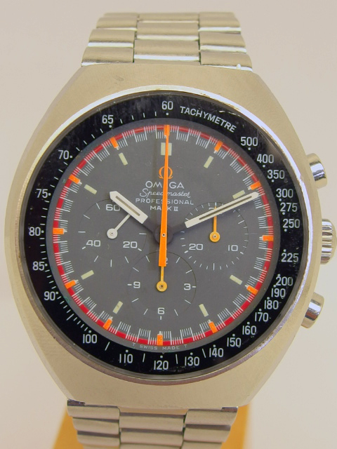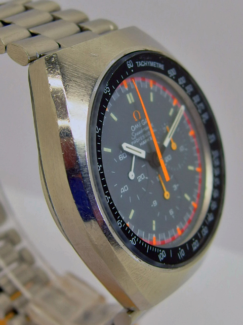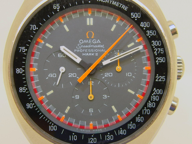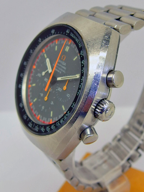 Seltene OMEGA SPEEDMASTER MARK II RACING, Referenz 145.014, in Stahl mit Omega Stahlband, Omega Caliber 861, Durchmesser 42 x 48mm - Höhe 13mm, seltene Ausführung mit Omega Zeichen in orange, guter getragener Zustand. Dieser Artikel ist differenzbesteuert nach §25A UStG. Dieser Artikel ist sofort lieferbar.