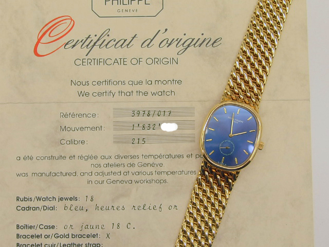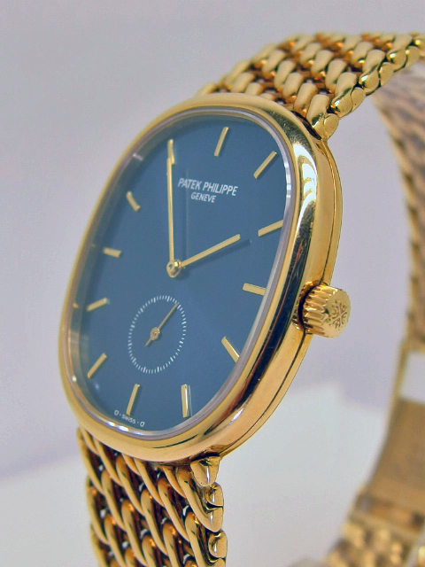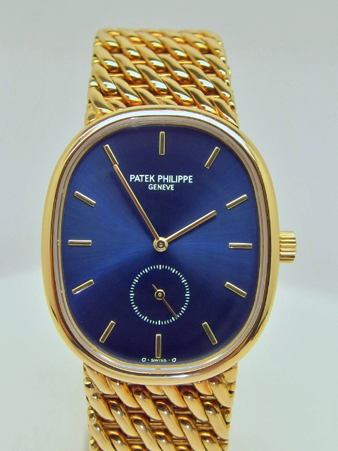 PATEK PHILIPPE ELLIPSE Referenz 3978/017J in 18k Gelbgold, Handaufzug Cal. 215PS, Blaugold Zifferblatt, schweres 18k Gelbgold PP Ellipse Armband, Gesamtgewicht 96gr., Abmessungen 34 x 28mm, Gesamtlänge 18,5cm, sehr guter Zustand, anbei Patek Servicebox - orig. Zertifikat (verkauft im Dezember 1993 durch Becker Hamburg) - Booklet. Dieser Artikel ist differenzbesteuert nach §25A UStG. Dieser Artikel ist sofort verfügbar.