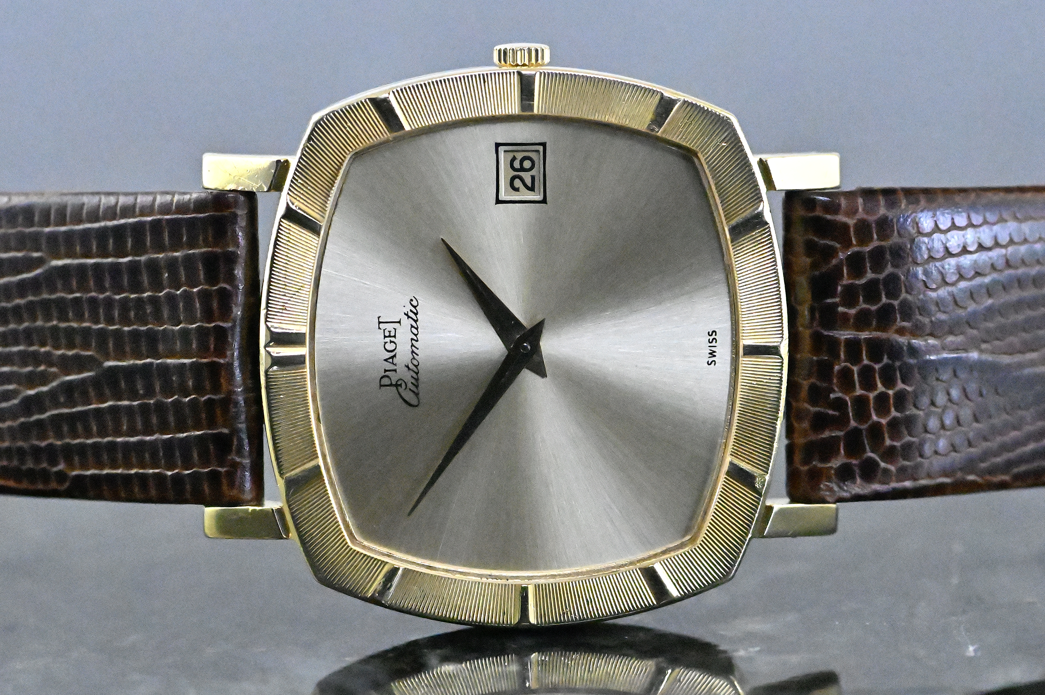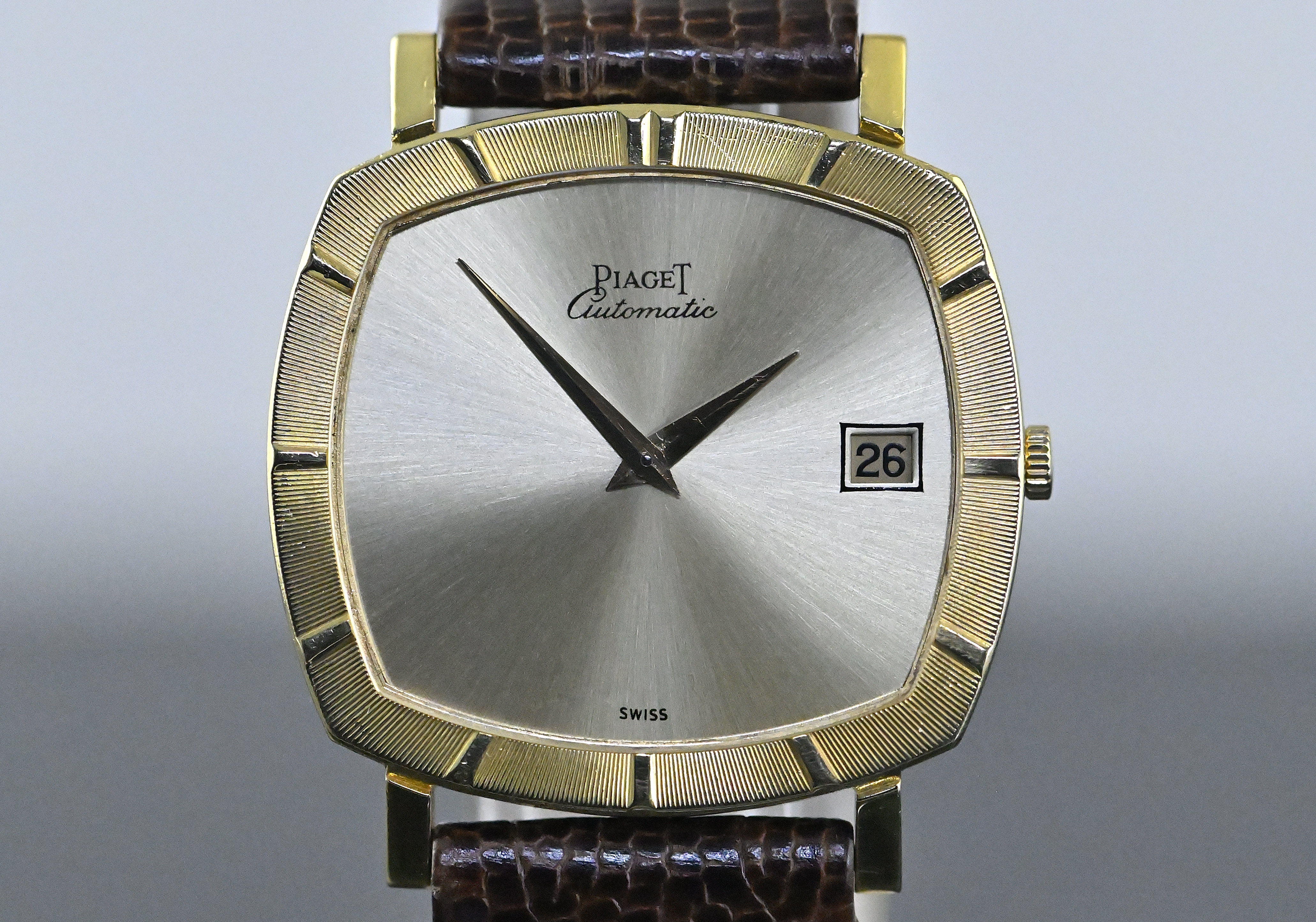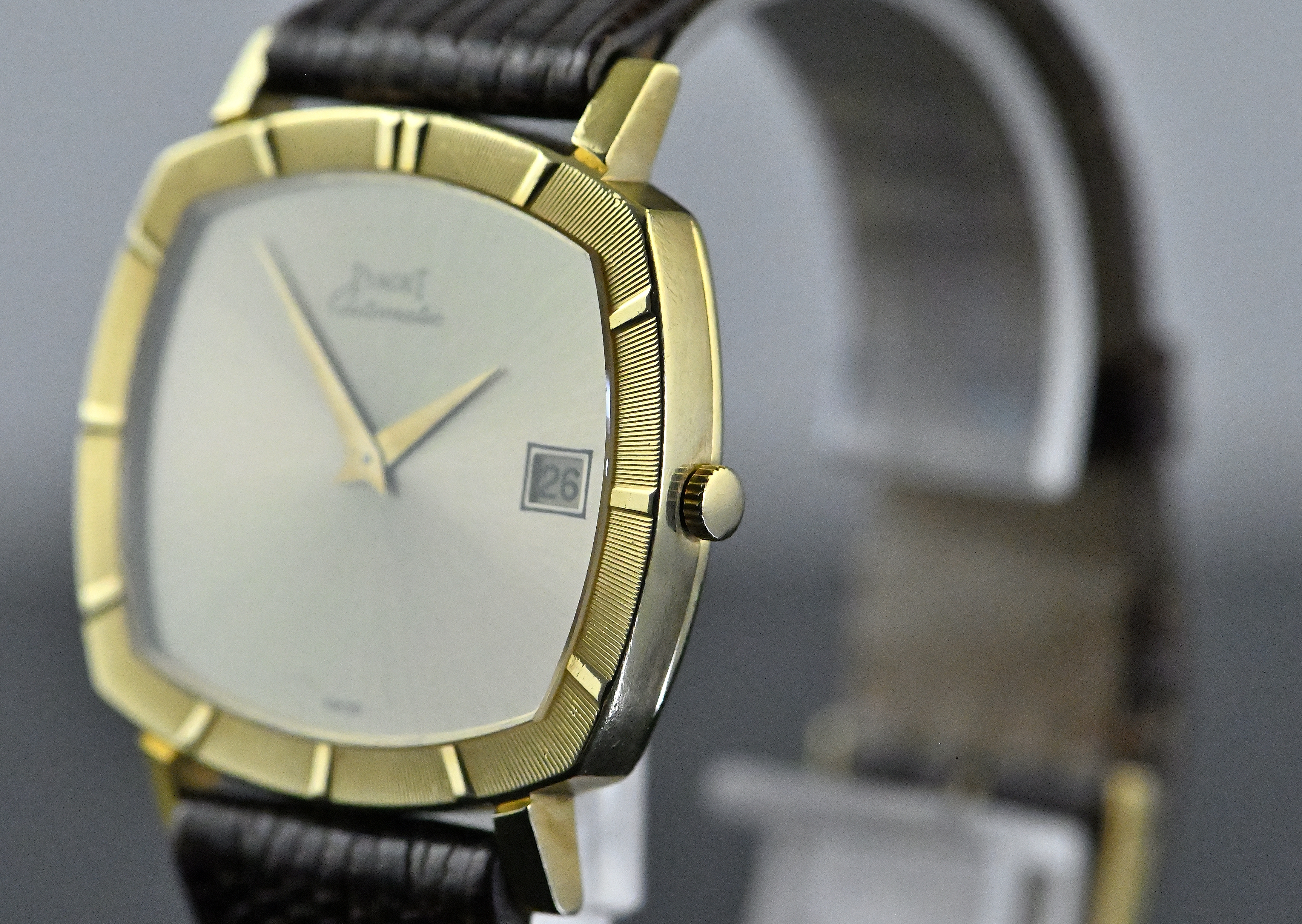 Vintage Piaget Dress Watch TV Screen Date mit der Referenz 13423 in 18k Gelbgold. Im Inneren verrichtet das Piaget Automatik Kaliber 12PC1 seine Arbeit. Die Uhr befindet sich momentan an einem braunen Lederarmband mit der original Piaget Dornschließe in Gelbgold. Diese Piaget besitzt ein champagnerfarbenes Sonnenschliff / Sunray Zifferblatt, vor allem in der Sonne hat dieses eine wunderschöne Ausstrahlung! Auf dem Gehäuseboden findet man eine erhabene Goldpunze, an welcher man erkennt, dass die Uhr nur sehr selten poliert wurde. Der aktuelle Zustand dieser Uhr ist gut bis sehr gut, mit altersüblichen Tragespuren. Die Abmessungen der Uhr betragen 32 × 30 mm (ohne Krone). Dieser Artikel ist differenzbesteuert nach §25A UStG. Dieser Artikel ist sofort lieferbar.