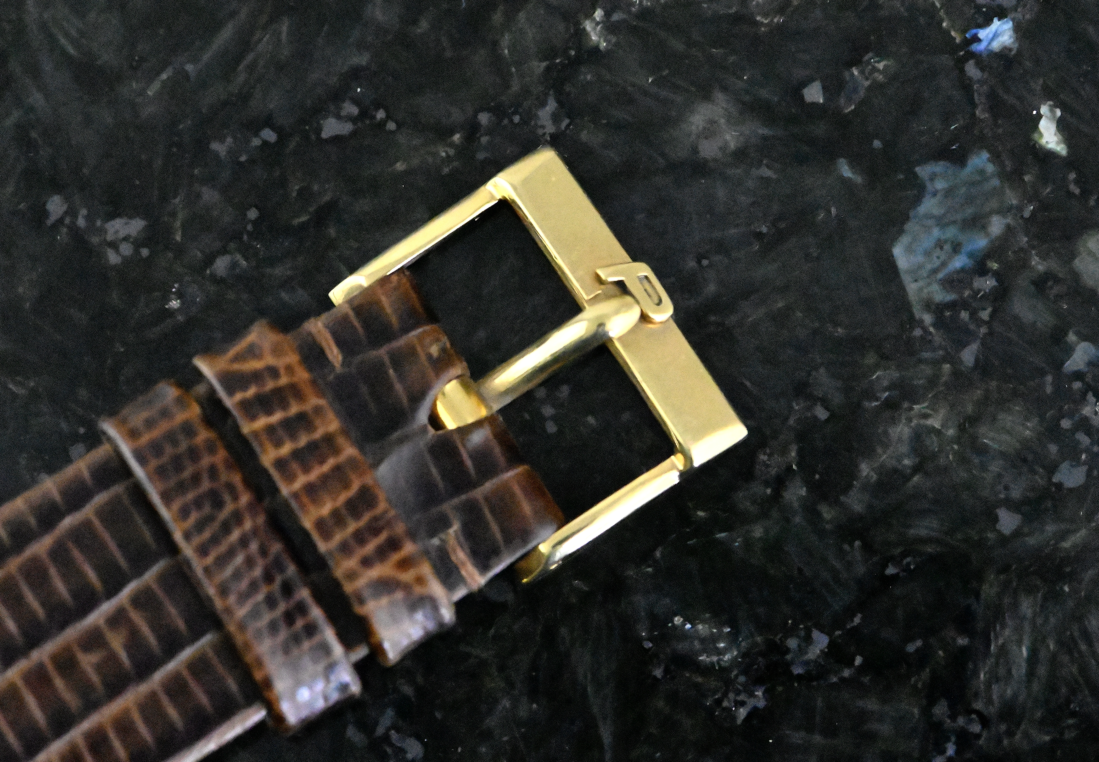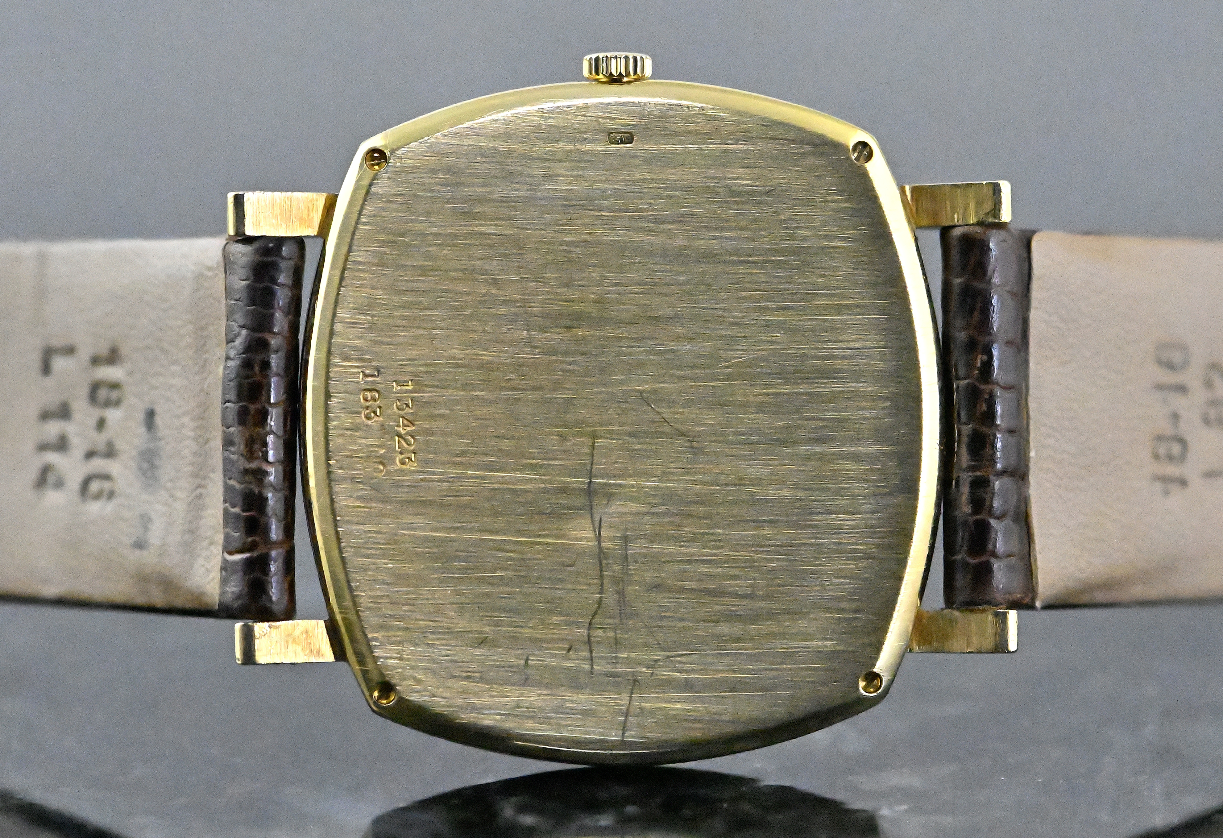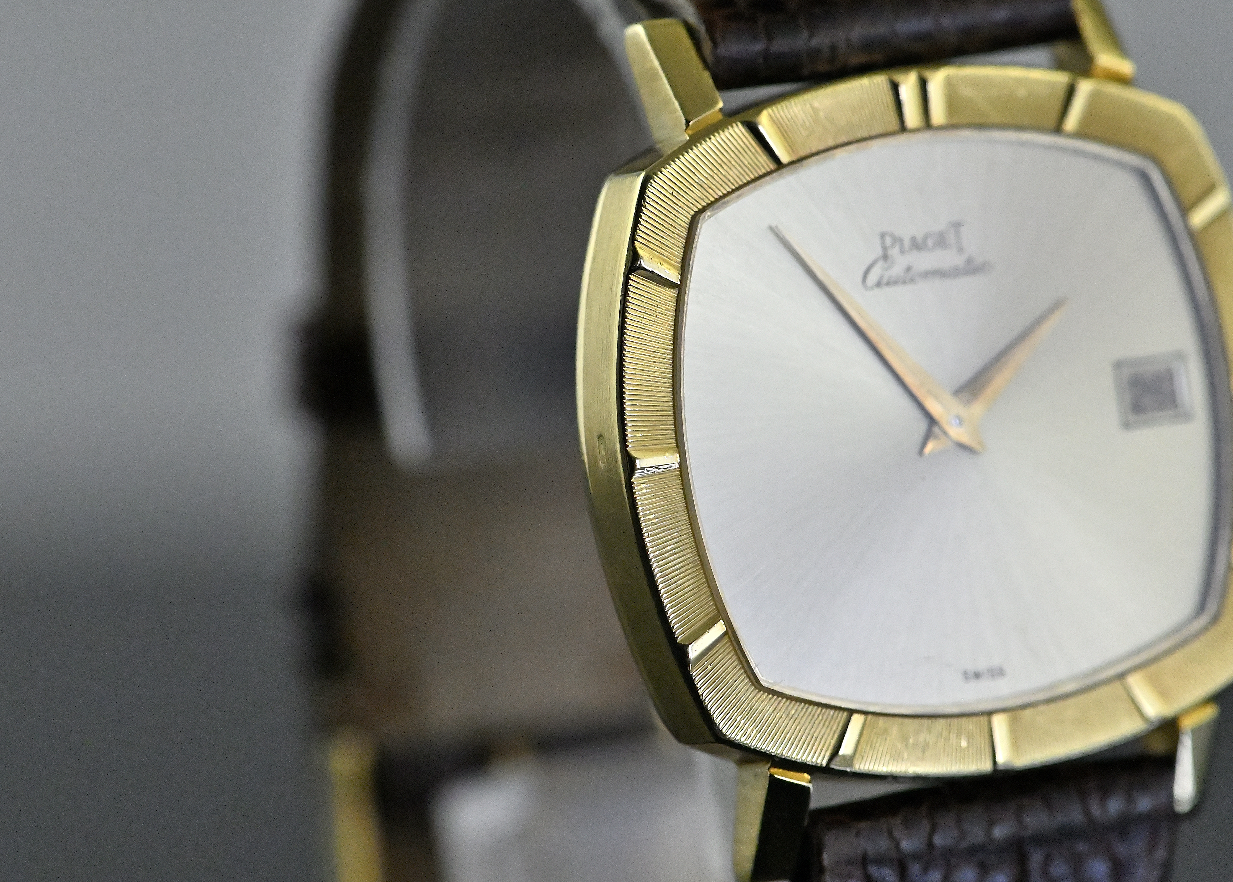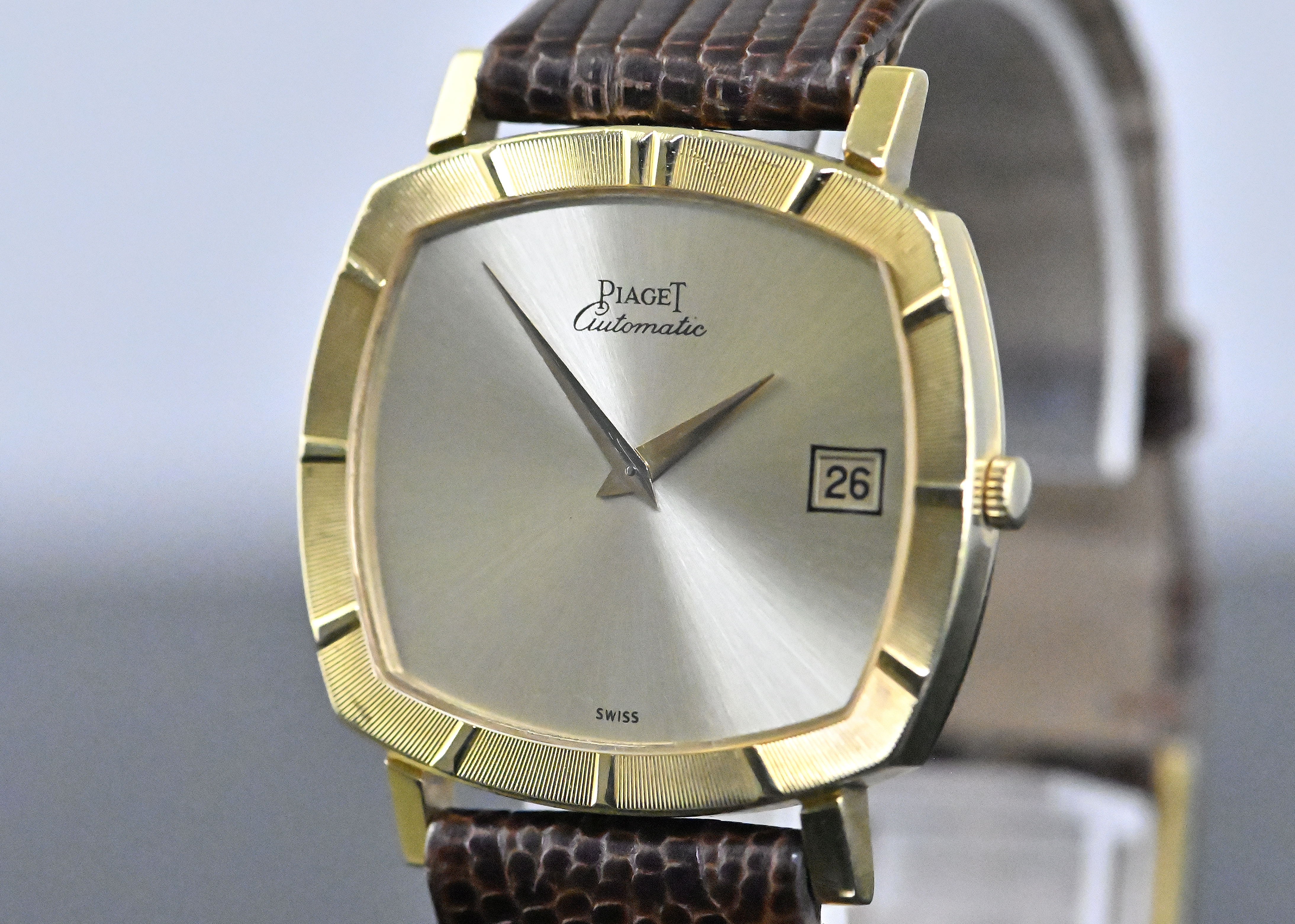 Vintage Piaget Dress Watch TV Screen Date mit der Referenz 13423 in 18k Gelbgold. Im Inneren verrichtet das Piaget Automatik Kaliber 12PC1 seine Arbeit. Die Uhr befindet sich momentan an einem braunen Lederarmband mit der original Piaget Dornschließe in Gelbgold. Diese Piaget besitzt ein champagnerfarbenes Sonnenschliff / Sunray Zifferblatt, vor allem in der Sonne hat dieses eine wunderschöne Ausstrahlung! Auf dem Gehäuseboden findet man eine erhabene Goldpunze, an welcher man erkennt, dass die Uhr nur sehr selten poliert wurde. Der aktuelle Zustand dieser Uhr ist gut bis sehr gut, mit altersüblichen Tragespuren. Die Abmessungen der Uhr betragen 32 × 30 mm (ohne Krone). Dieser Artikel ist differenzbesteuert nach §25A UStG. Dieser Artikel ist sofort lieferbar.