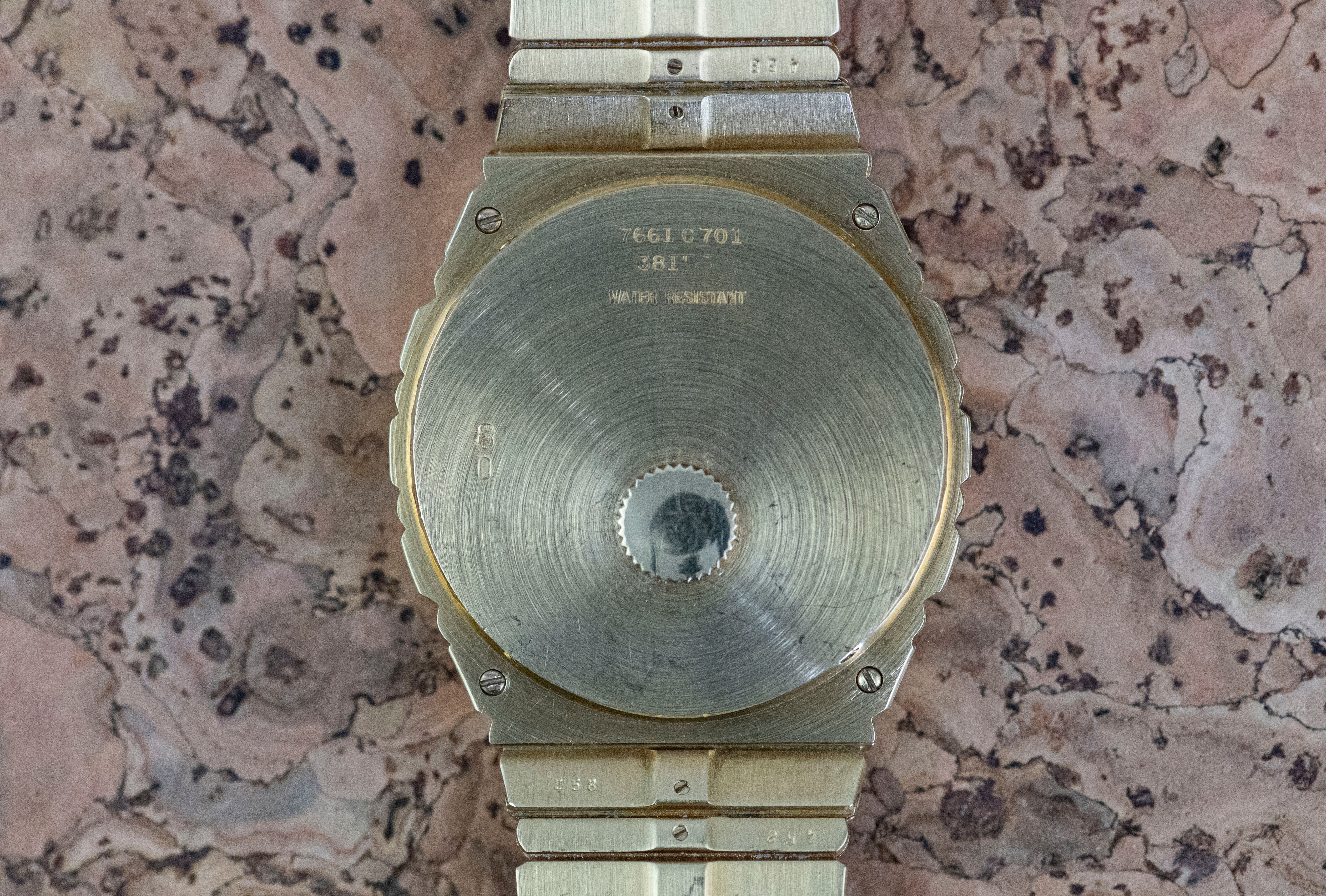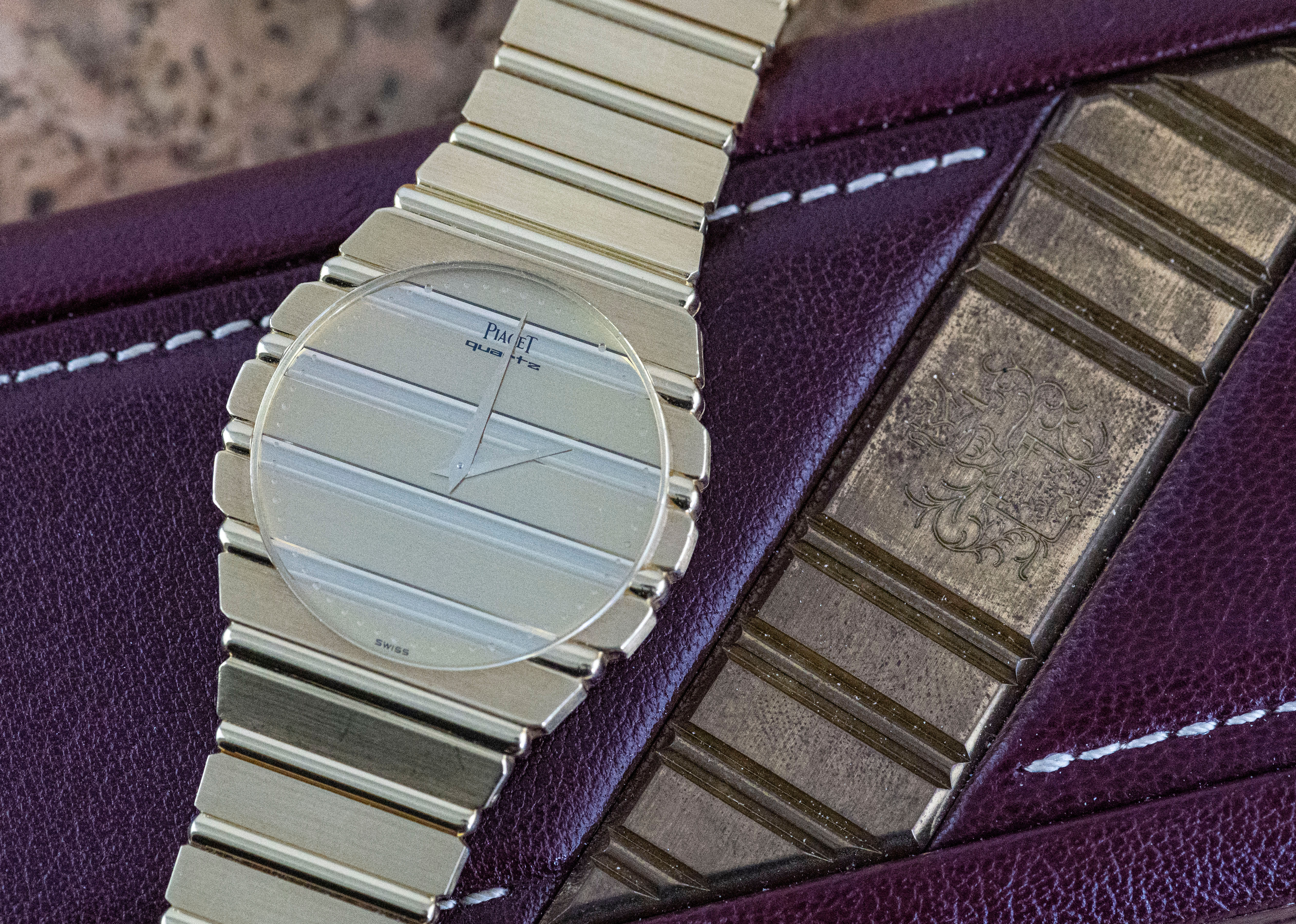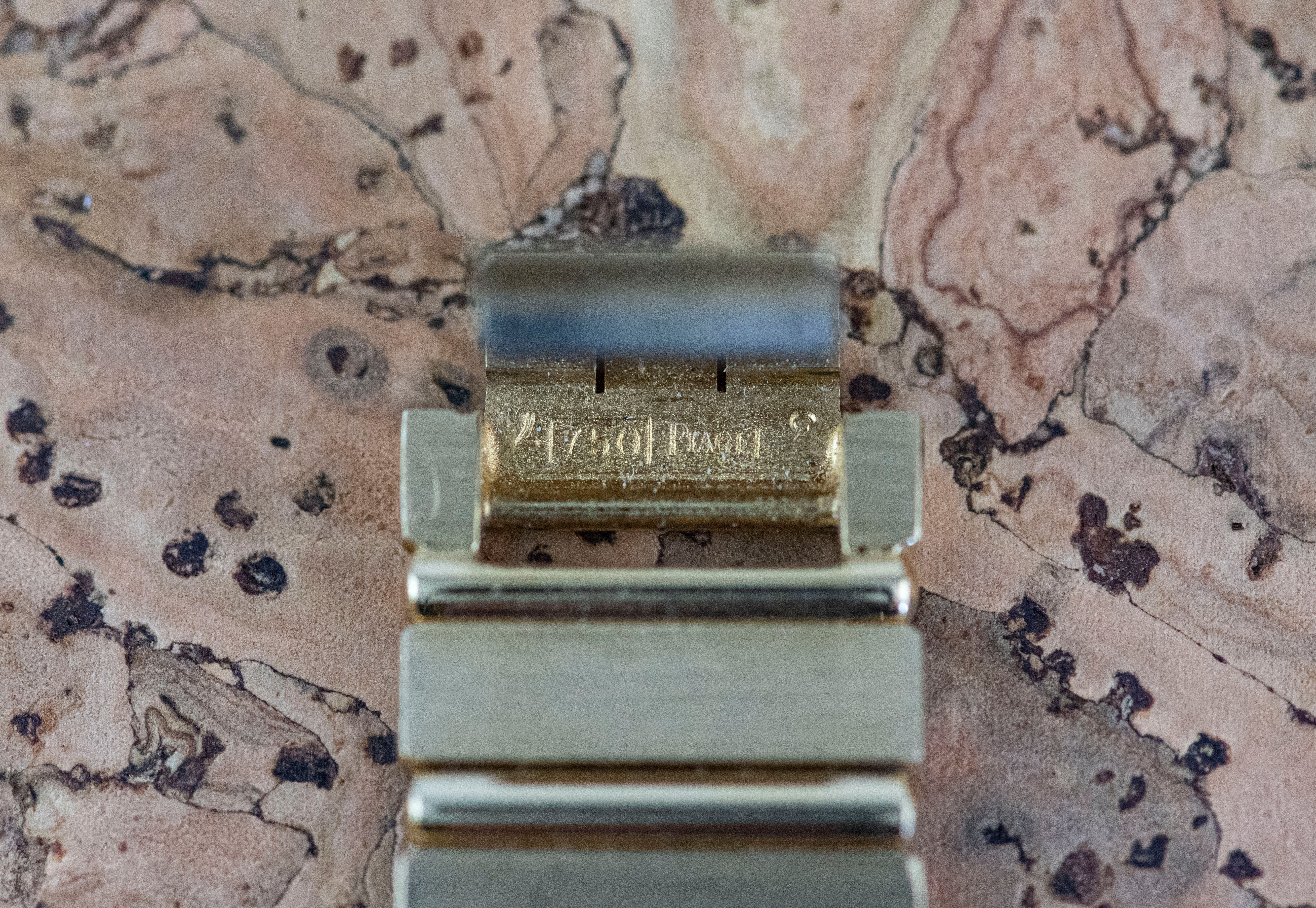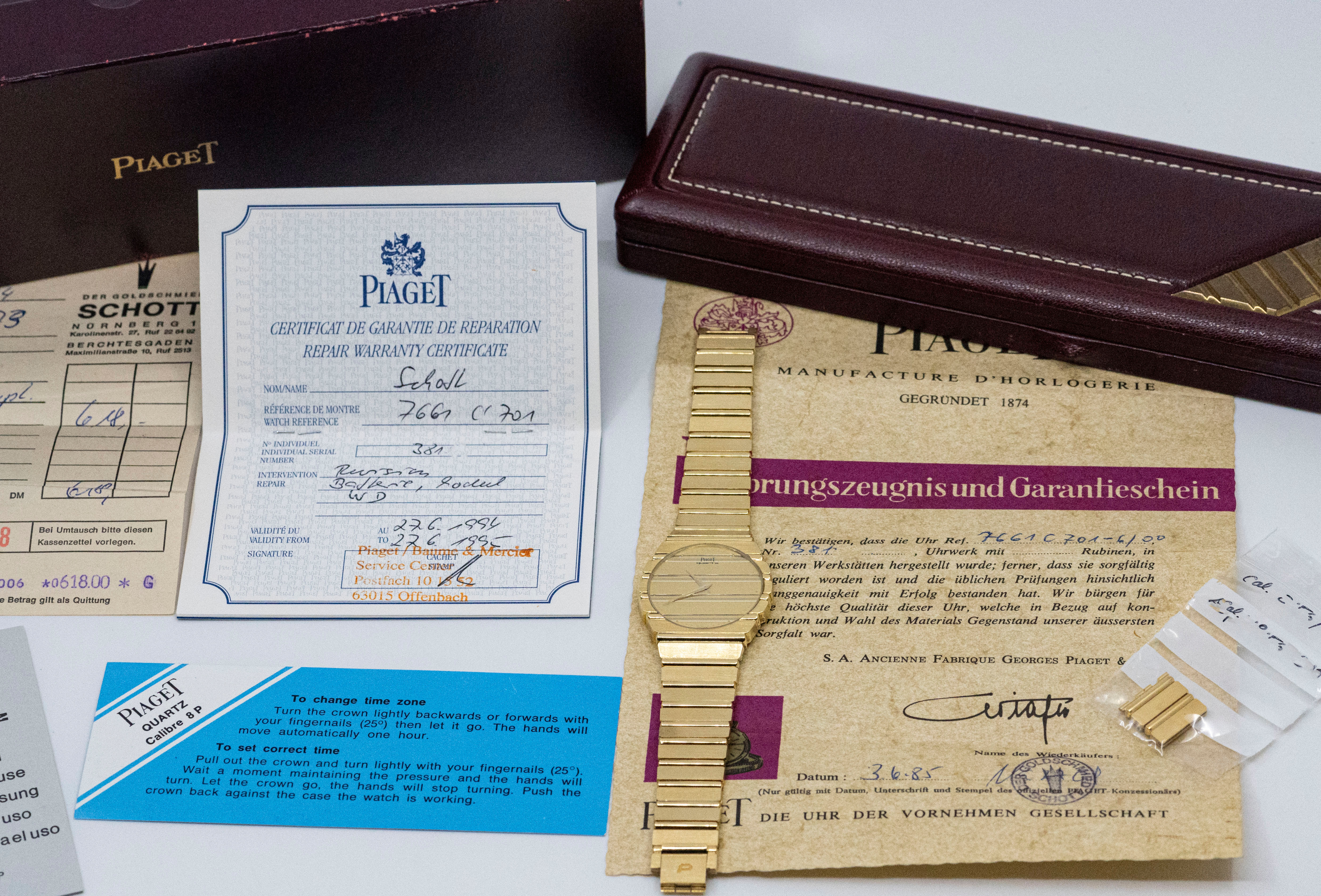 Sehr seltene Vintage Piaget Jumbo Polo mit der Referenz 7661 C 701 in 18k Gelbgold. Diese Referenz ist eine der fünf ersten Referenzen der Piaget Polo Reihe, die Referenz 7661 stellt hierbei die größte Polo mit einem runden Gehäuse da. Sie ist außerdem die seltenste Referenz, man findet selten eine 7661 in einem guten Zustand! Angetrieben wird diese Polo durch das Piaget Quartz Kaliber 7P, welches zur damaligen Zeit den Weltrekord als flachstes Quarzkaliber der Welt besaß. Mit einem Durchmesser von 34 mm hat diese Polo außerdem die perfekte Unisex Größe und kann sowohl von einem Mann, als auch Frau perfekt getragen werden. Das Gewicht ist ebenfalls äußerst imposant mit 142.1 gr. und mit einer Gesamtlänge von 18.5 cm (ohne zwei demontierte Elemente + gadroons). Es befindet sich neben der Goldpunze auf der Rückseite der Uhr, ebenfalls eine Goldpunze auf der Gehäuseflanke bei 9 Uhr. Hier kann man auch den perfekten Zustand dieser Piaget Polo erkennen und dass diese Uhr noch nie einer Politur unterzogen wurde. Von den etwa 4.000 bis 6.000 Exemplare der runden und quadratischen Polo sind heutzutage leider nicht mehr ansatzweise so viele auf der Welt zu finden, lange Zeit galt die Piaget Polo als eine Uhr die nur Materialwert besaß und es war einfacher sie einfach einzuschmelzen aufgrund des hohen Materialwerts. In den letzten Jahren findet die Polo aber wieder eine große Beliebtheit in der Welt der Uhren und besitzt langsam wieder ihr altes Image aus den 1980er Jahren. Am Markt eine Polo 7661 zu finden ist nicht gerade leicht, vor allem wenn man noch ein Auge auf den Zustand wirft, umso schöner ist eine Uhr wie die Vorliegende. Diese Piaget befindet sich einem nahezu perfekten, unpolierten Originalzustand vom Erstbesitzer und wurde nur selten getragen. Neben dem hervorragenden Zustand besitzt diese Polo außerdem das original Zertifikat (verkauft im Jahre 1985 durch Schott Deutschland) - Piaget Service Rechnung aus 1994 - original Piaget Box mit Umkarton - Booklets - Bedienungsanleitung - zwei demontierte Elemente inklusive gadroons. Dieser Artikel ist differenzbesteuert nach §25A UStG. Dieser Artikel ist sofort lieferbar.