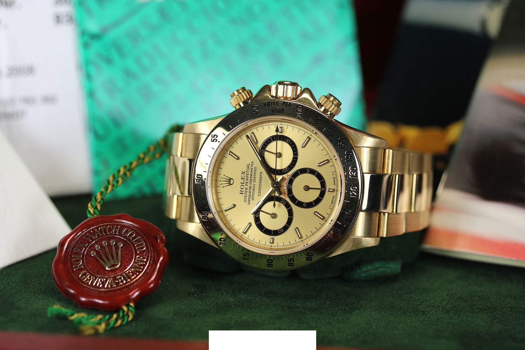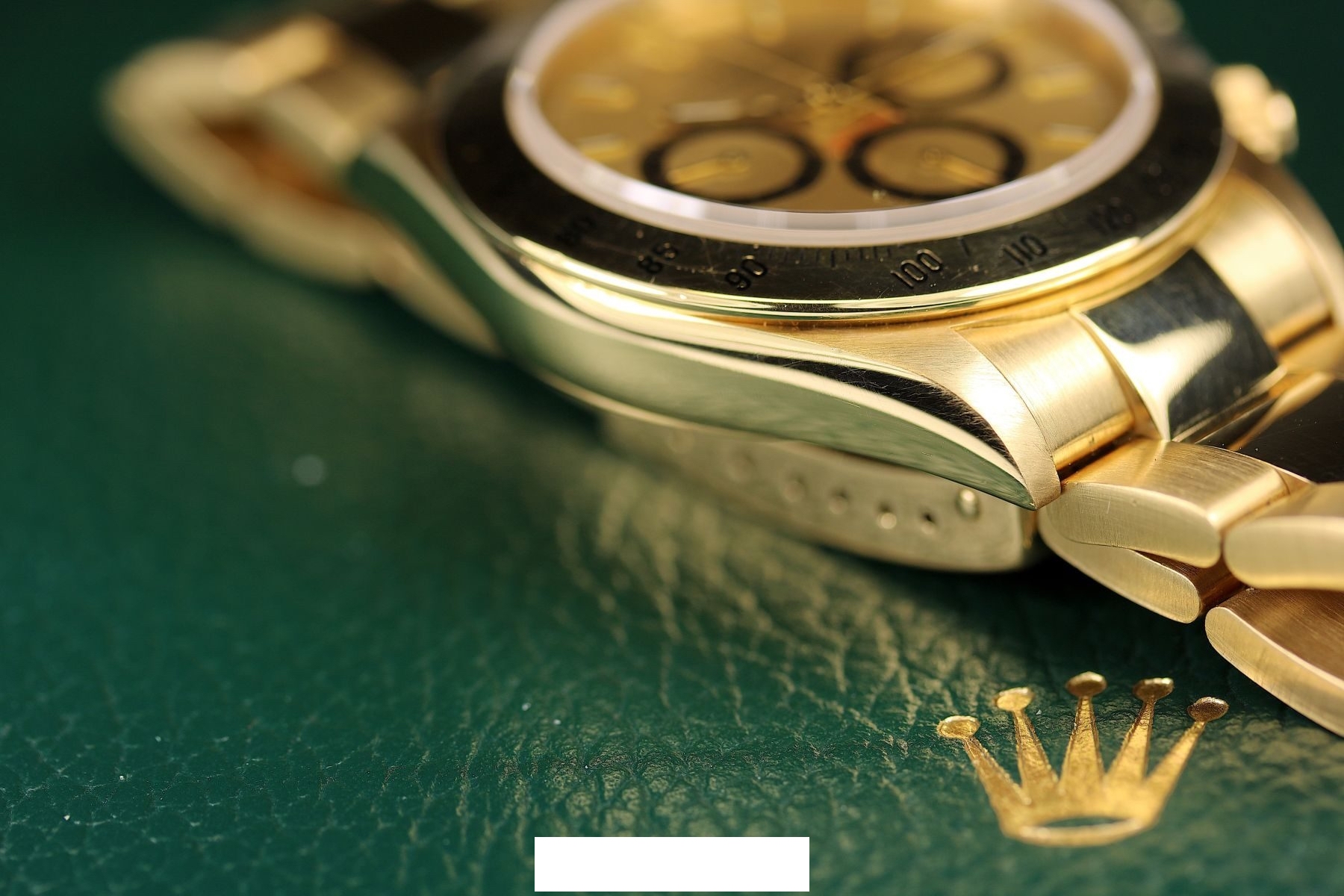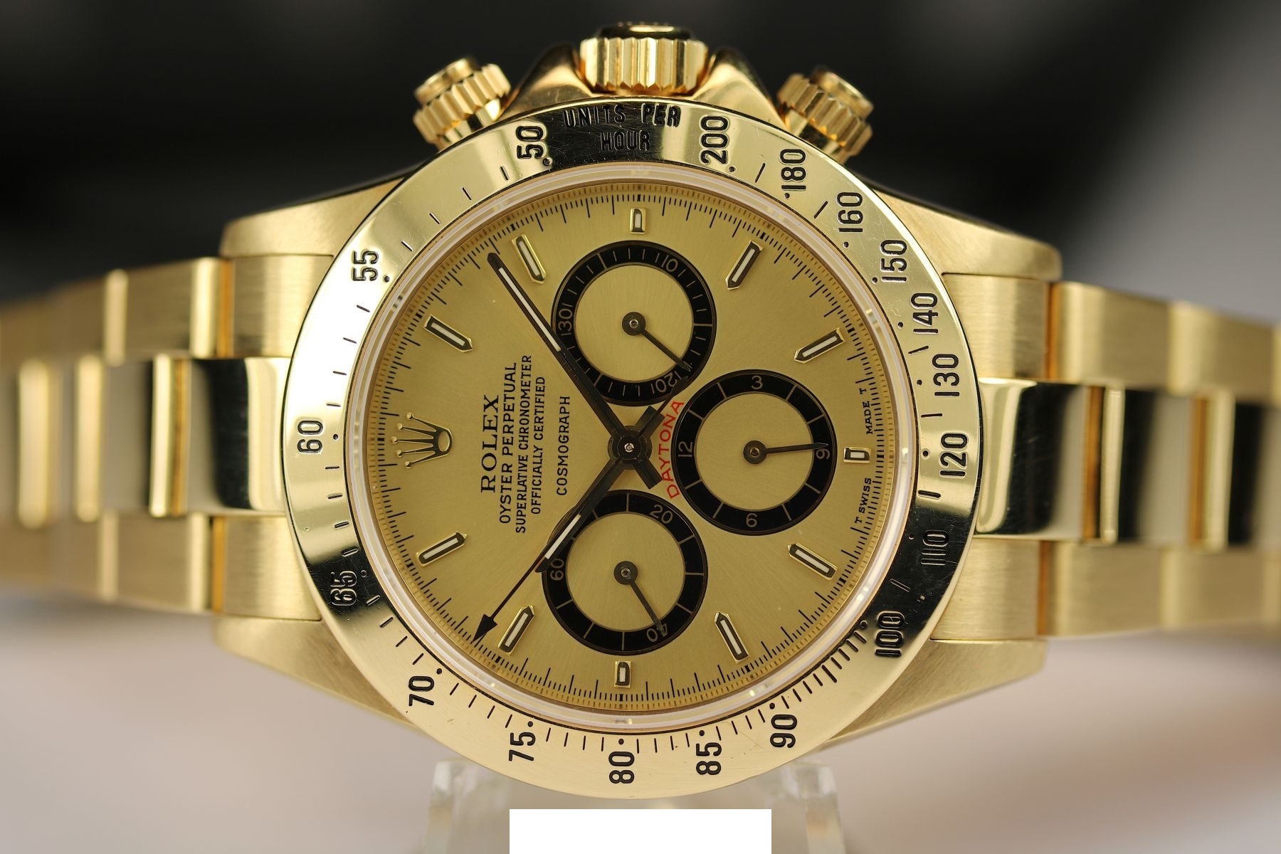 Rolex Daytona 16528 R-Serie in sensationellem Zustand, eine wunderbare Uhr aus der ersten Serie der Daytona mit Zenithwerk. Alles was die Schlichtheit und Schönheit der ersten Serie ausmacht ist vorhanden: Floating dial mit Inverted 6 - 200er Lünette in sehr gutem Zustand. Die Uhr war schon mal im Service, hat dabei aber weder den originalen Schliff noch die Kanten verloren, noch wurde am Gehäuse viel poliert. Das Band ist wie neu, hat alle (12) Glieder und natürlich die alte Schließe, zum Baujahr passend ohne Überwurfsicherung. Gangverhalten ist excellent, kein Anzeichen für eine baldige Revision. Wer ein Porzellan Zifferblatt hat für diese Uhr, ist ein König. Die Uhr war einmal bei Rolex zum Service, die Rechnung wird mitgeliefert. Selbstverständlich ist auch die Seriennummer des Werkes passend zur Serial der Uhr. Die Uhr ist ab dem 10. September 2017 lieferbar.