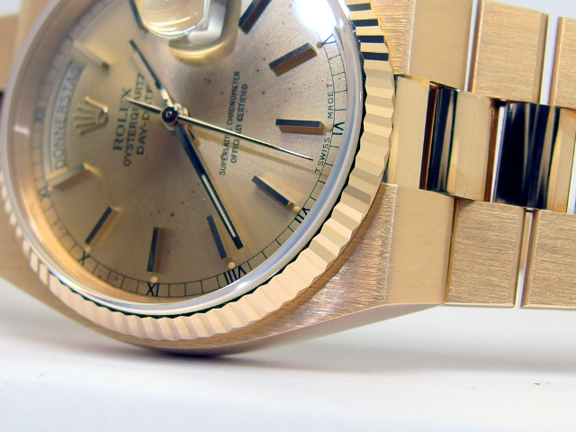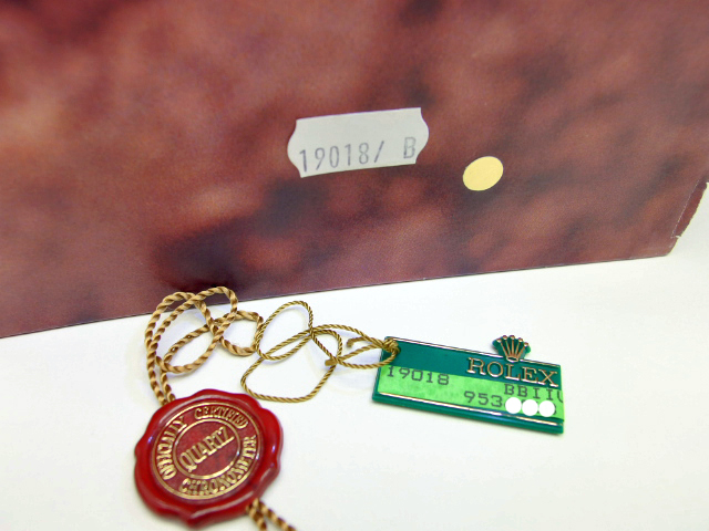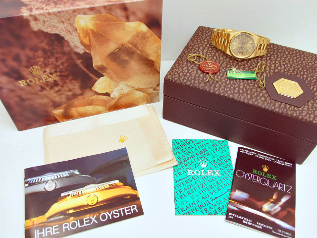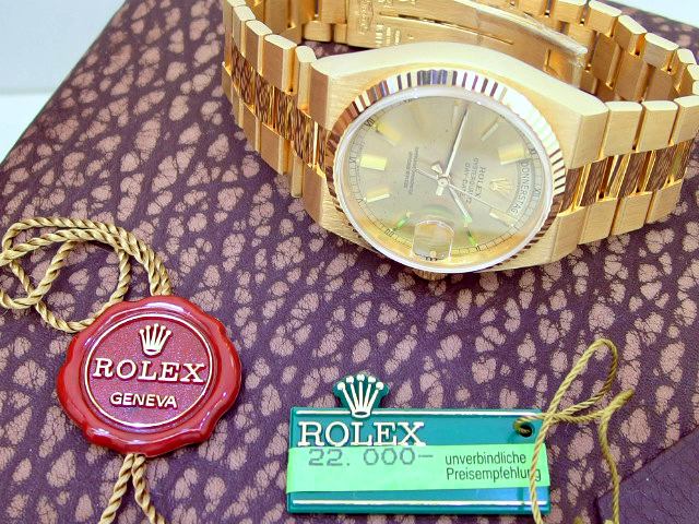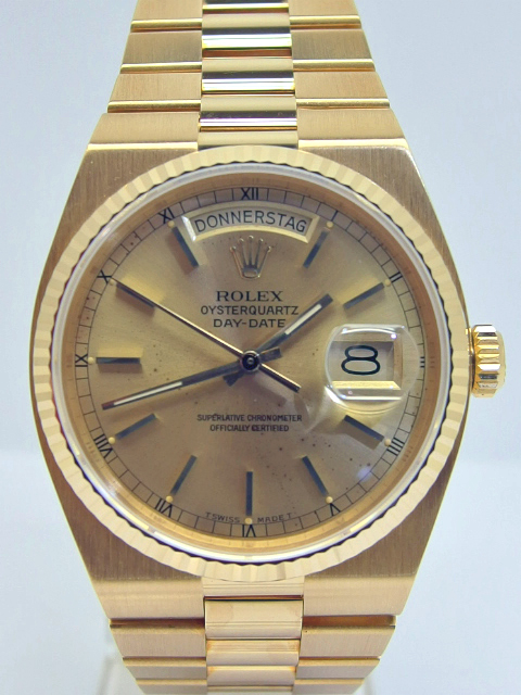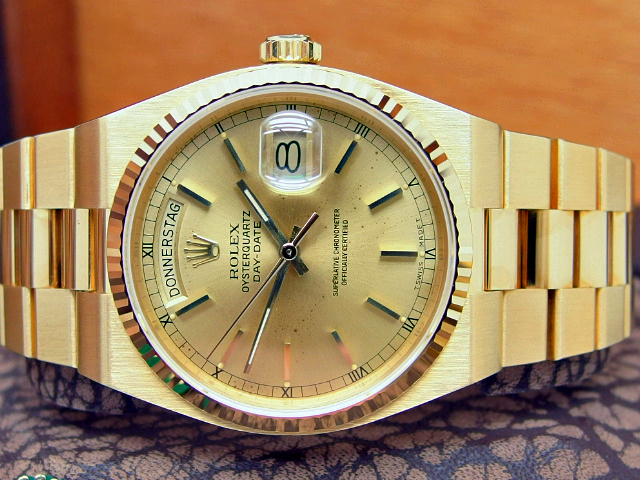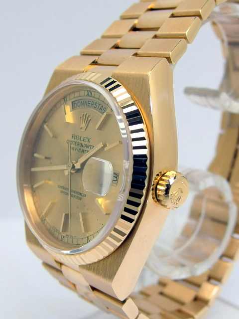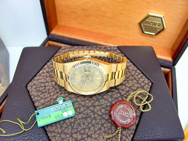 ROLEX DAY-DATE OYSTERQUARTZ Referenz 19018N in 18kt Gelbgold, Seriennr. 953XXXX ca. 1986, die Uhr befindet sich in einem ungetragenen NOS - New old Stock Zustand, mit Referenz-Sticker auf dem Gehäuseboden! Anbei die original OYSTERQUARTZ Box mit Umkarton (Referenz und Zifferblatt Aufkleber auf dem Umkarton) - Referenz/Seriennummer- und Preisanhänger - OYSTERQUARTZ Chronometer Anhänger - Booklets - OYSTERQUARTZ Garantie Booklet. Im vorliegenden Zustand eine echte Rarität. Dieser Artikel ist differenzbesteuert nach §25A UStG. Dieser Artikel ist sofort lieferbar.