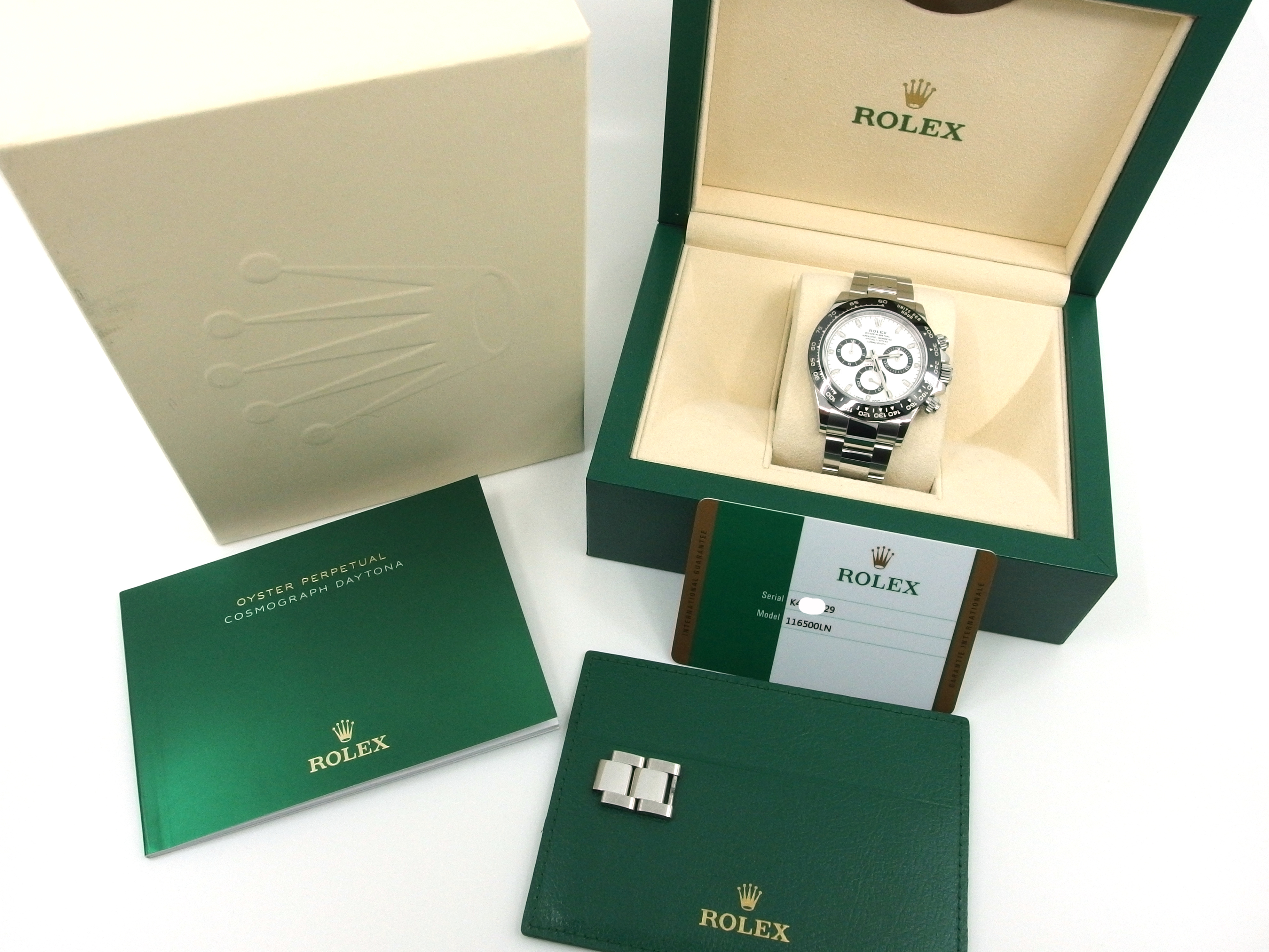 ROLEX Cosmograph Daytona Referenz 116500LN WD in Edelstahl, Cerachrom-Lünette, Seriennummer K426xxxx / LC134, anbei Box - Garantiekarte (verkauft am 3. Oktober 2017) - Booklet - Ledermappe, sehr guter Zustand. Dieser Artikel ist differenzbesteuert nach §25A UStG. Dieser Artikel ist sofort lieferbar.