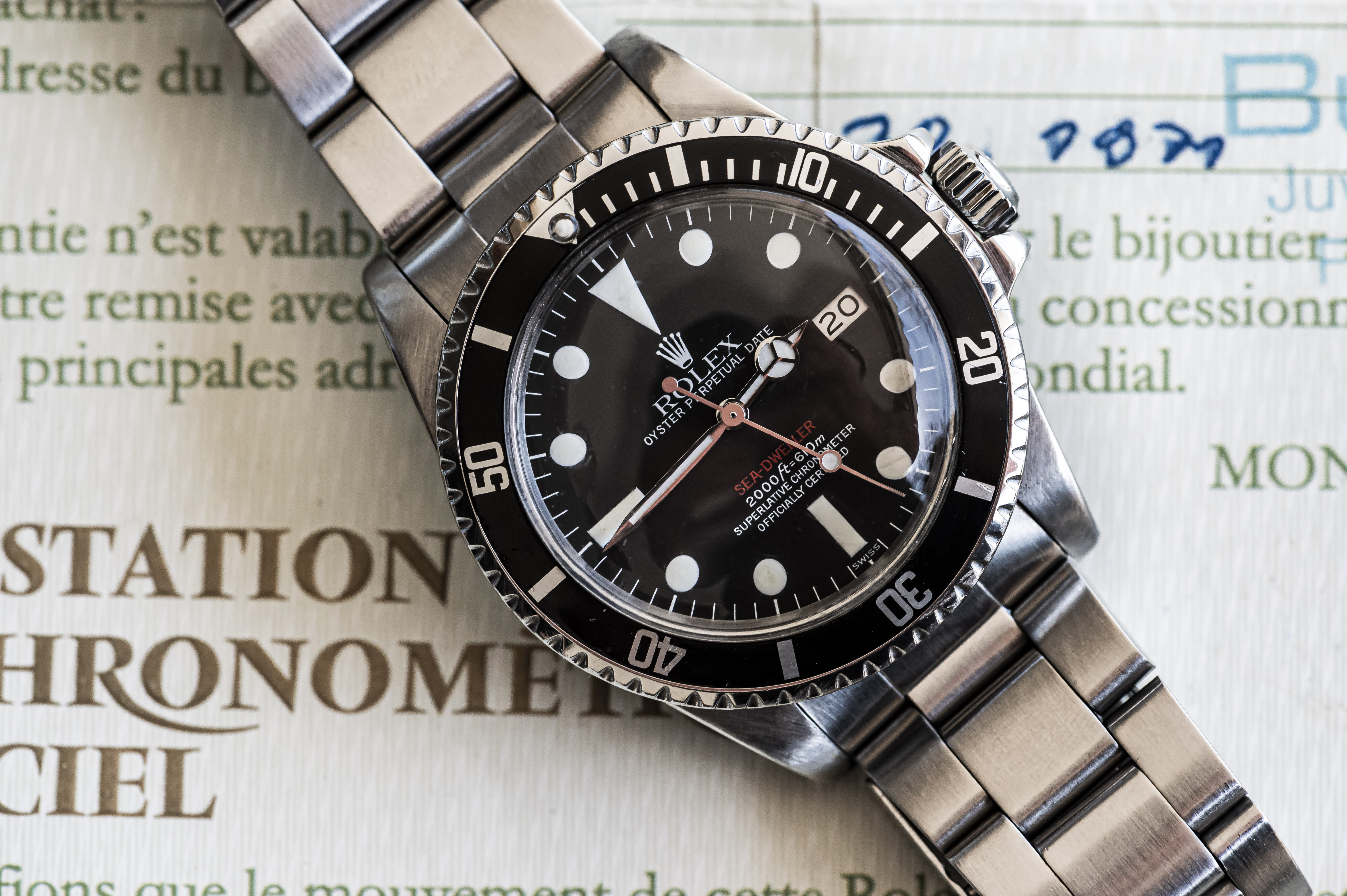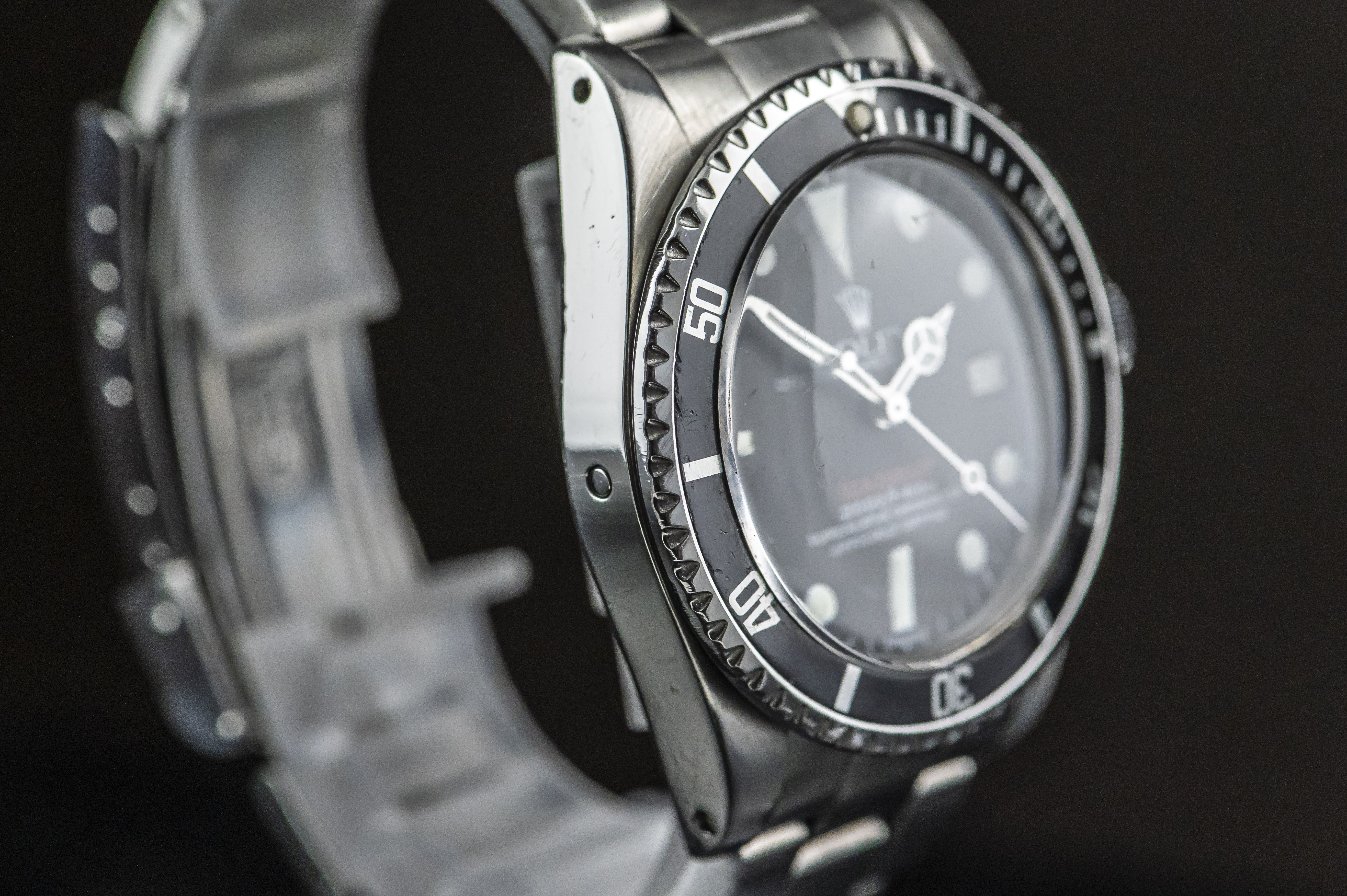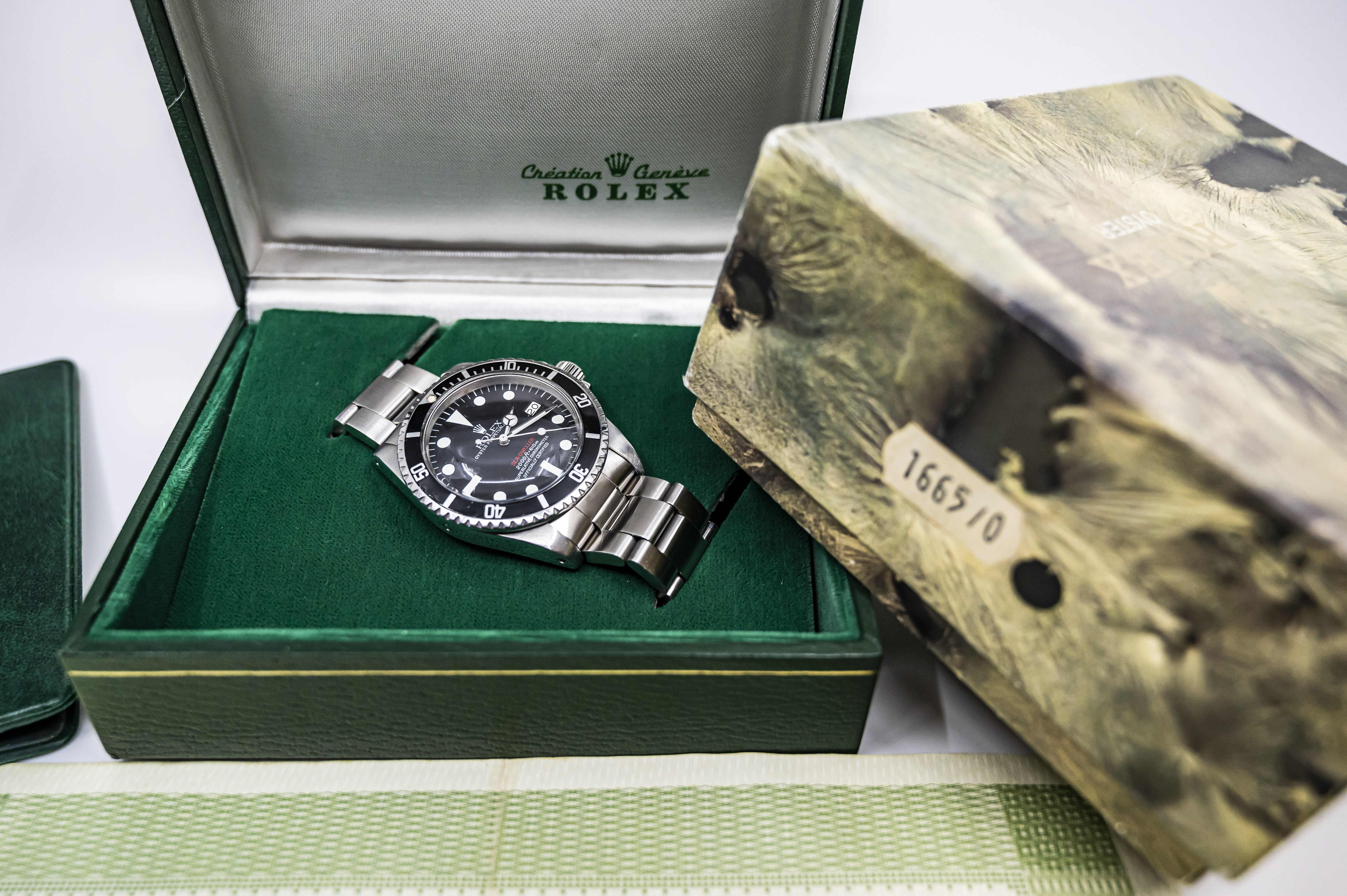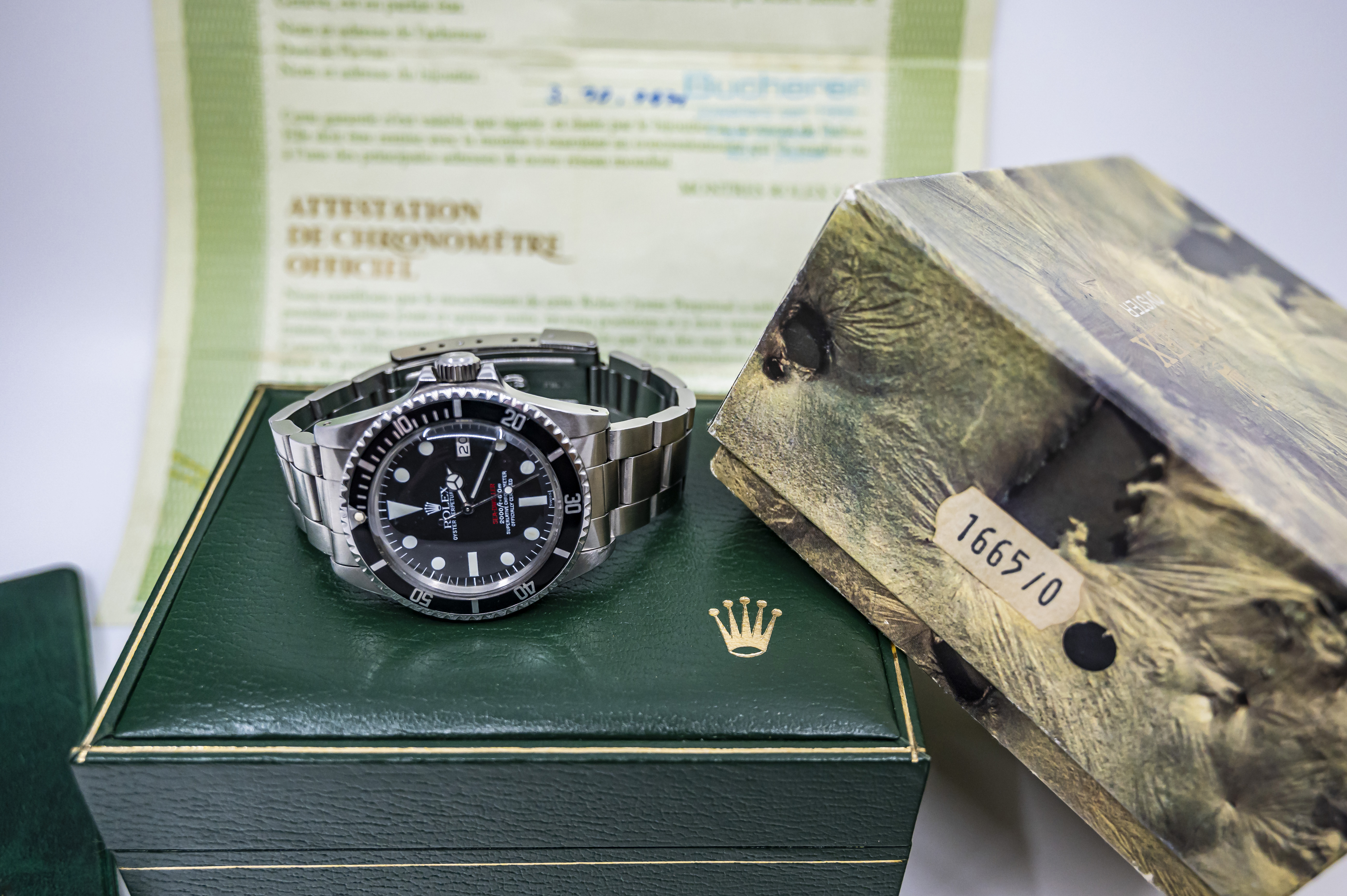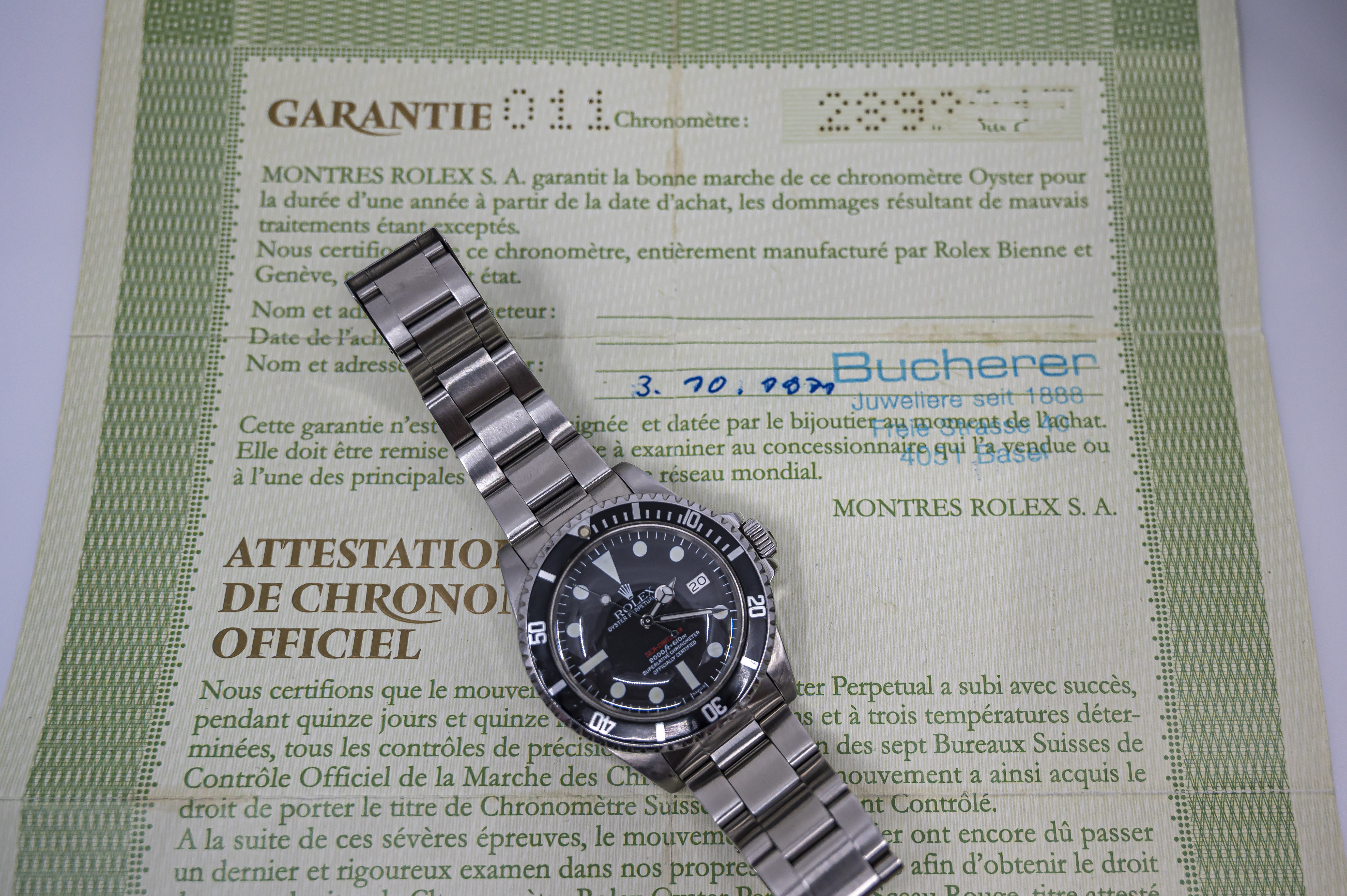 Extrem seltene Single Red MKIII - ROLEX Sea Dweller Chronometer in Stahl | Referenz 1665 - Serial 2.89 Mio | Oysterband Referenz 93150 mit 580er Endlinks - Schließe S AD2 - die Bandverlängerung des Armbands ist mit "Patented" graviert | Lünette mit Long 5 Inlay und Tritium Perle | insgesamt ein sehr schöner Zustand | anbei 1665 Umkarton mit Brettchenbox - grüne Plastikmappe - gelochtes Chronometer & Garantie Zertifikat (verkauft am 3. Oktober 1971 in der Schweiz / Bucherer Basel). Es war eine doppelrote Sea Dweller 1665 (MKIII), die irgendwann den bekannten Weg des Rolex Service gegangen ist, als Rail Dial und mit einem ausgetauschten Gehäuseboden zurückkam, was den Besitzer nicht gefreut hat... Dieser hat sich deswegen auf die Suche nach einem Tauschblatt gemacht hat - et voila: Er hat es gefunden! Auch noch das extrem seltene “Single Red” Luminova Tauschblatt für die “doppelrote” Sea Dweller. Nur eine Handvoll davon sind bekannt, was es zum seltensten verfügbaren Zifferblatt für die Plexi Sea Dweller 1665 macht. Diese Zifferblätter stammen von einem Service-Zifferblatt der „Great White“, mit einem sehr hellen und leuchtend roten Aufdruck auf der Sea Dweller Schrift, Lume ist Luminova. Auch 100percentpassion.net und andere erwähnen dies in ihren 1665 Berichten. Dieser Artikel ist differenzbesteuert nach §25A UStG. Dieser Artikel ist sofort verfügbar.