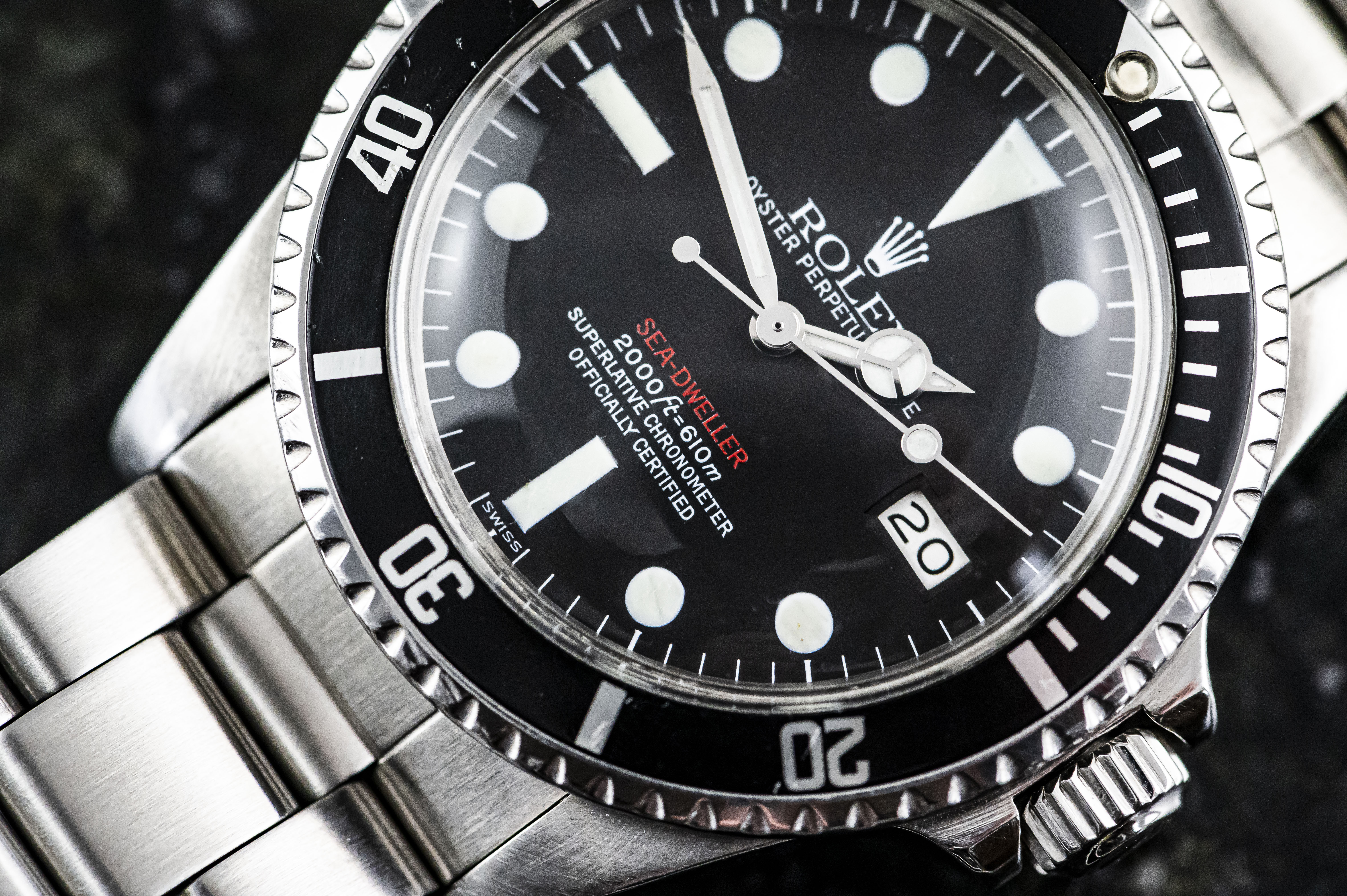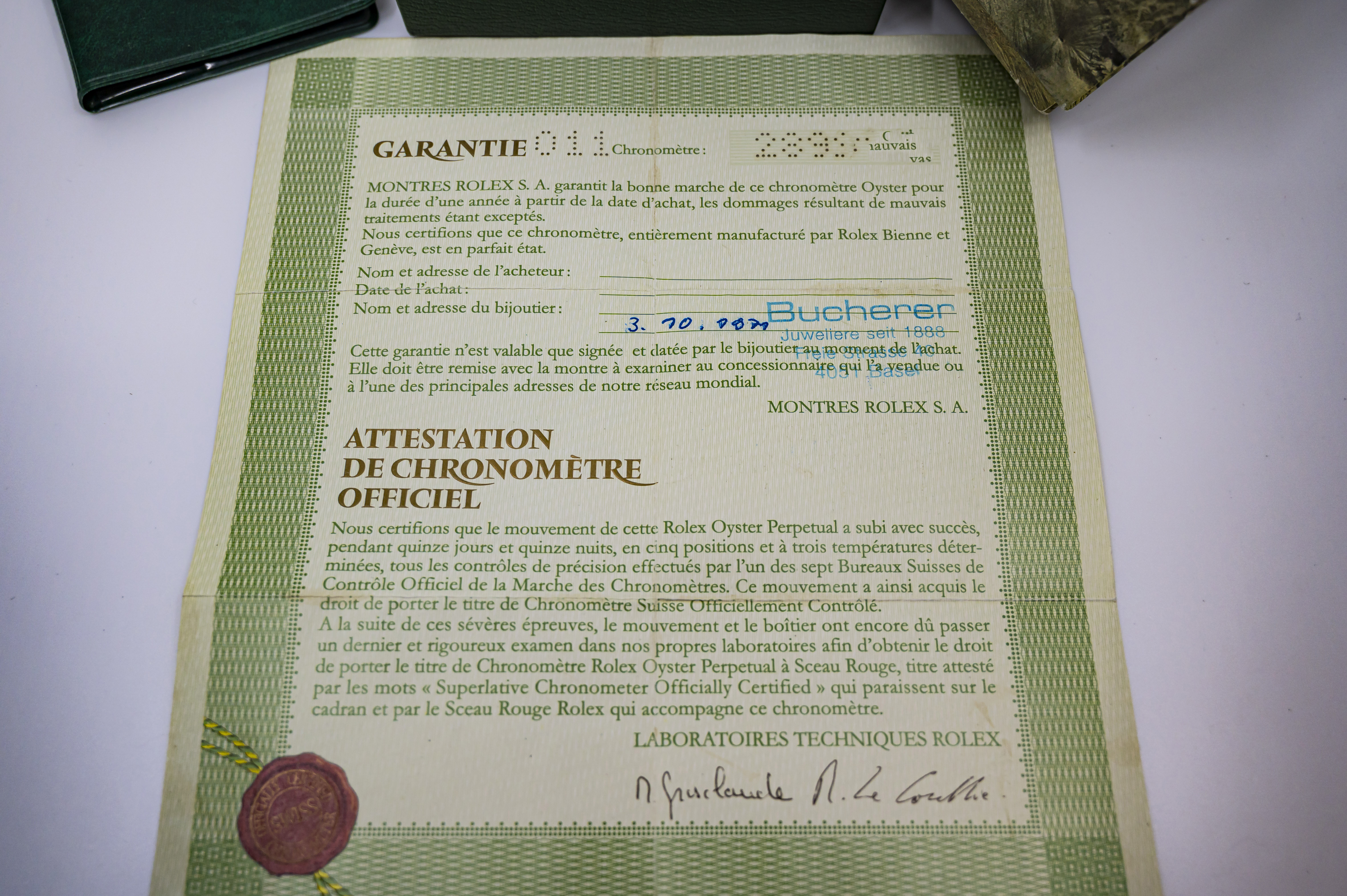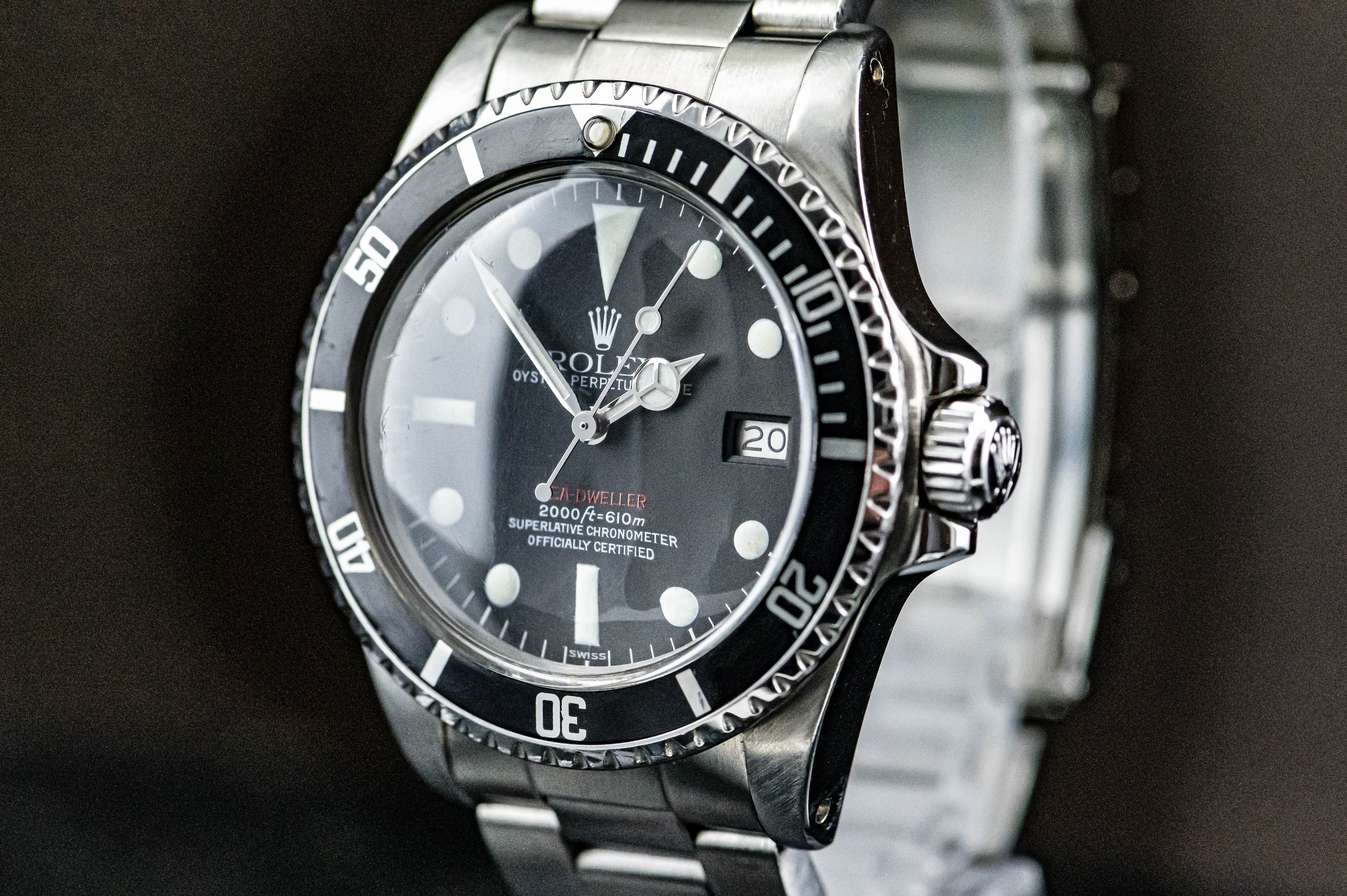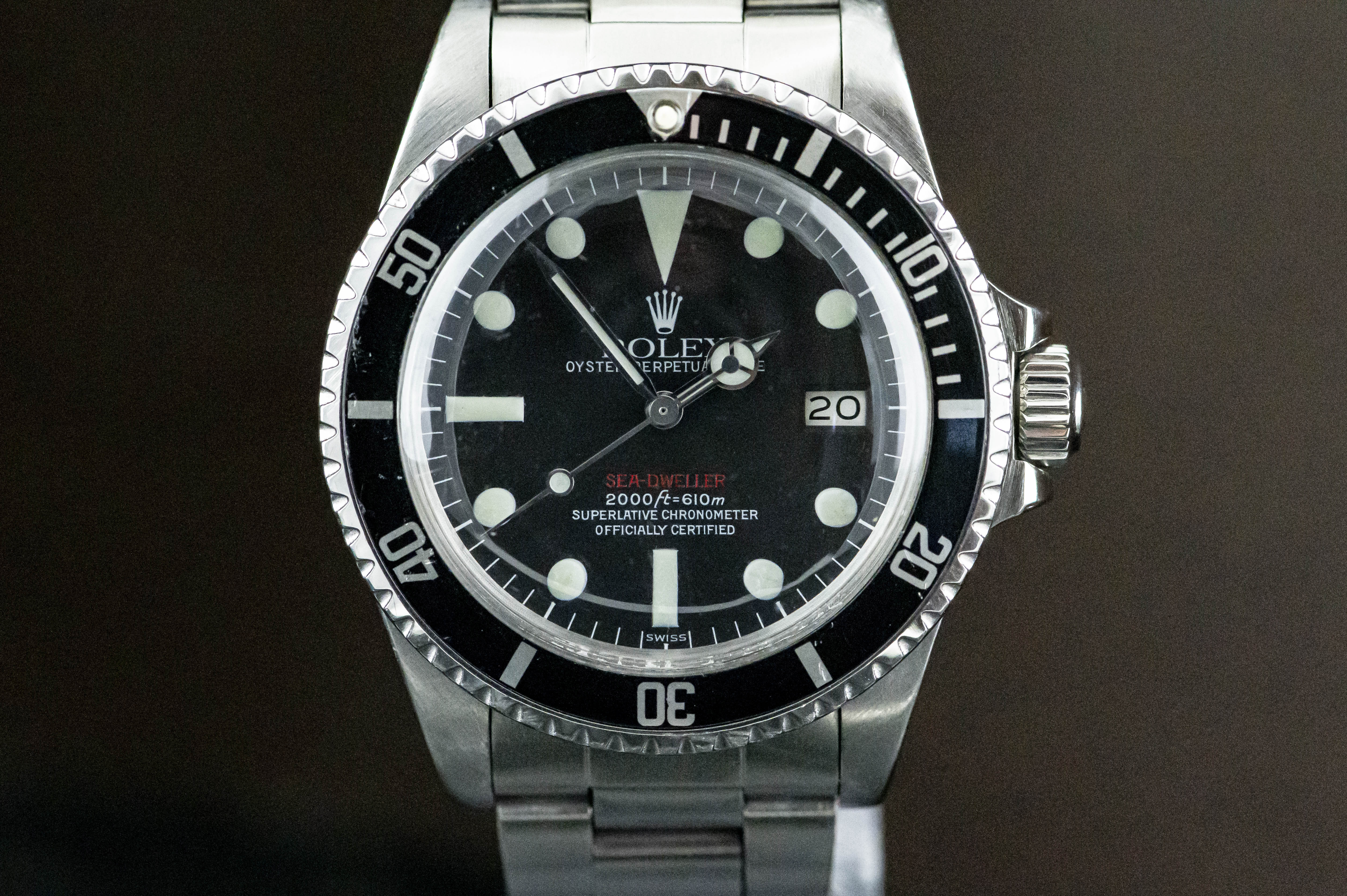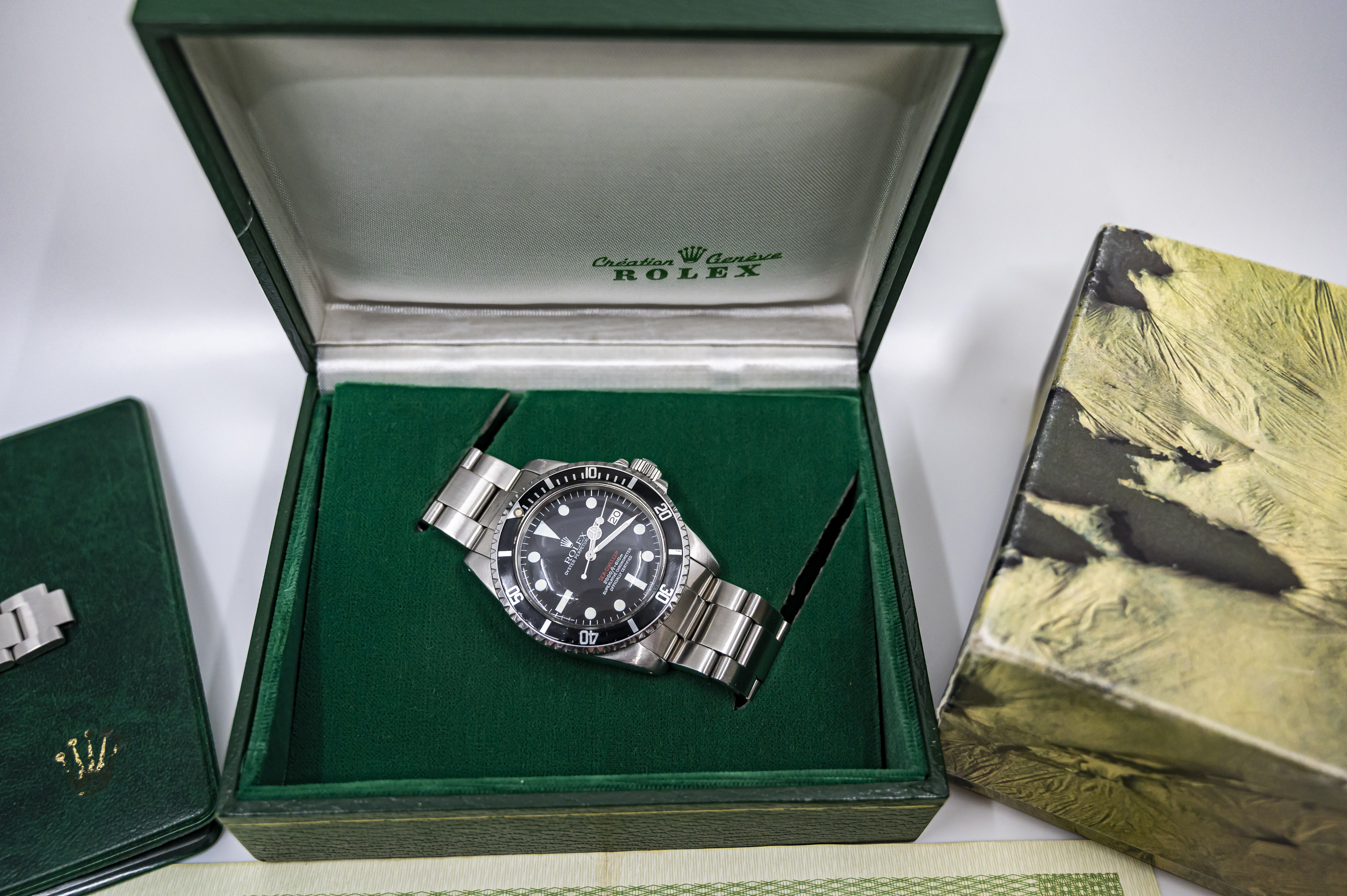 Extrem seltene Single Red MKIII - ROLEX Sea Dweller Chronometer in Stahl | Referenz 1665 - Serial 2.89 Mio | Oysterband Referenz 93150 mit 580er Endlinks - Schließe S AD2 - die Bandverlängerung des Armbands ist mit "Patented" graviert | Lünette mit Long 5 Inlay und Tritium Perle | insgesamt ein sehr schöner Zustand | anbei 1665 Umkarton mit Brettchenbox - grüne Plastikmappe - gelochtes Chronometer & Garantie Zertifikat (verkauft am 3. Oktober 1971 in der Schweiz / Bucherer Basel). Es war eine doppelrote Sea Dweller 1665 (MKIII), die irgendwann den bekannten Weg des Rolex Service gegangen ist, als Rail Dial und mit einem ausgetauschten Gehäuseboden zurückkam, was den Besitzer nicht gefreut hat... Dieser hat sich deswegen auf die Suche nach einem Tauschblatt gemacht hat - et voila: Er hat es gefunden! Auch noch das extrem seltene “Single Red” Luminova Tauschblatt für die “doppelrote” Sea Dweller. Nur eine Handvoll davon sind bekannt, was es zum seltensten verfügbaren Zifferblatt für die Plexi Sea Dweller 1665 macht. Diese Zifferblätter stammen von einem Service-Zifferblatt der „Great White“, mit einem sehr hellen und leuchtend roten Aufdruck auf der Sea Dweller Schrift, Lume ist Luminova. Auch 100percentpassion.net und andere erwähnen dies in ihren 1665 Berichten. Dieser Artikel ist differenzbesteuert nach §25A UStG. Dieser Artikel ist sofort verfügbar.