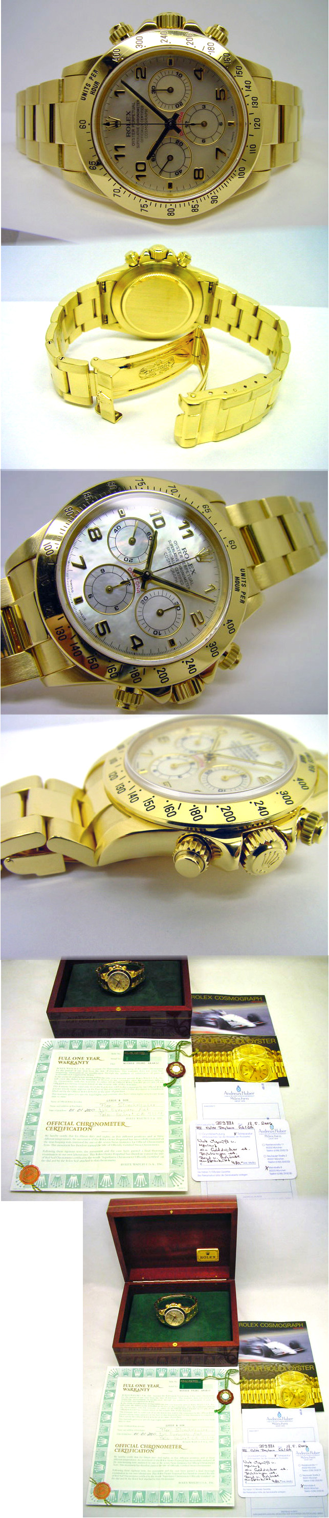 Weihnachtsofferte! ROLEX Cosmograph Daytona "MOP" Zenith, Referenz 16528 in 18kt Gelbgold mit Oysterarmband in Gelbgold, Seriennr.: U486XXX, original Perlmuttzifferblatt, die Uhr befindet sich in einem sehr guten Zustand, anbei folgendes Zubehör: original Chronometer / Garantie Zertifkat - große Mahagoni Holzbox mit Umkarton - Beschreibungen - Chronometersiegel - Verkaufsanhänger - Servicekarte und Rechnung von Huber München aus 2006.