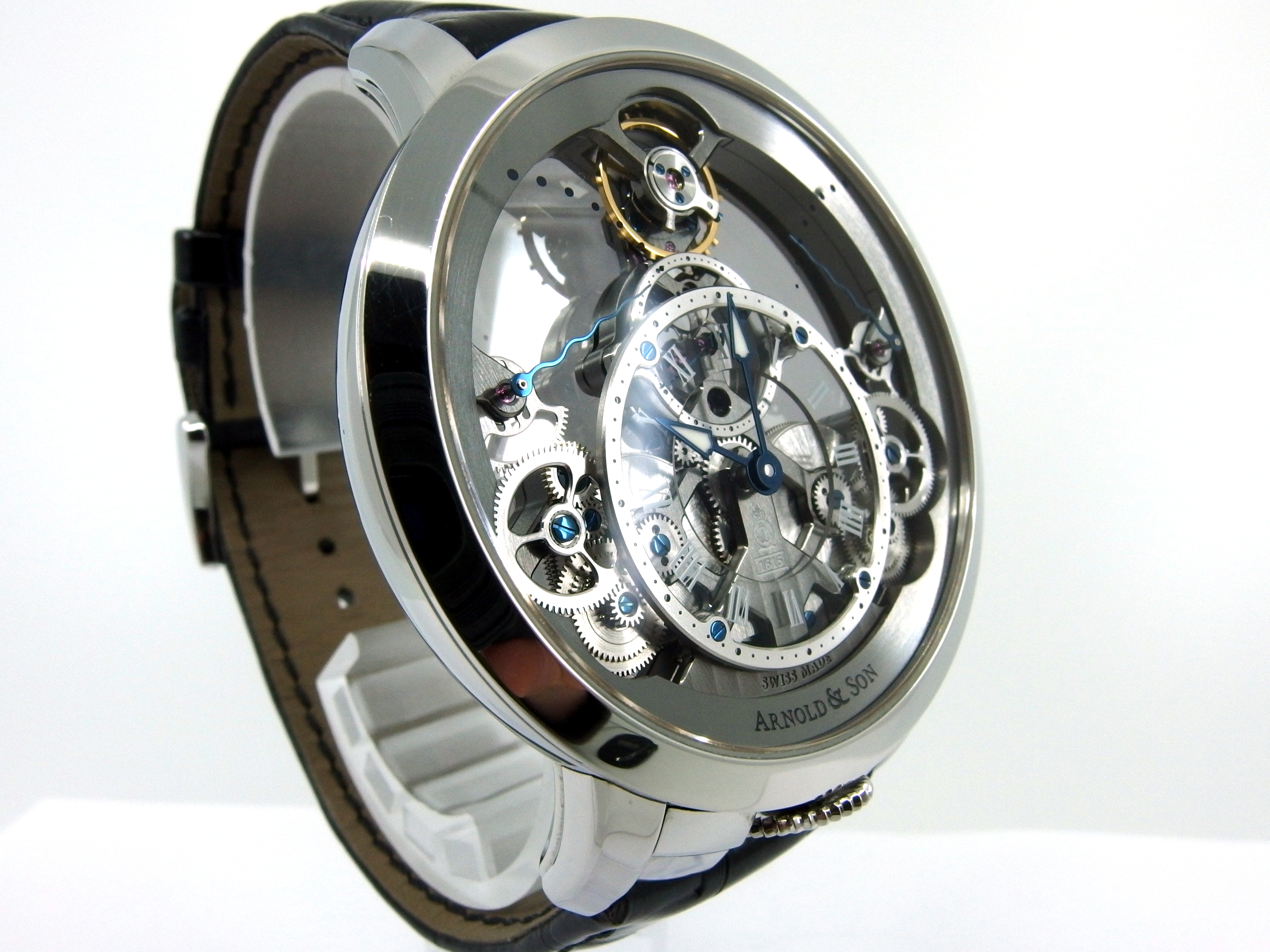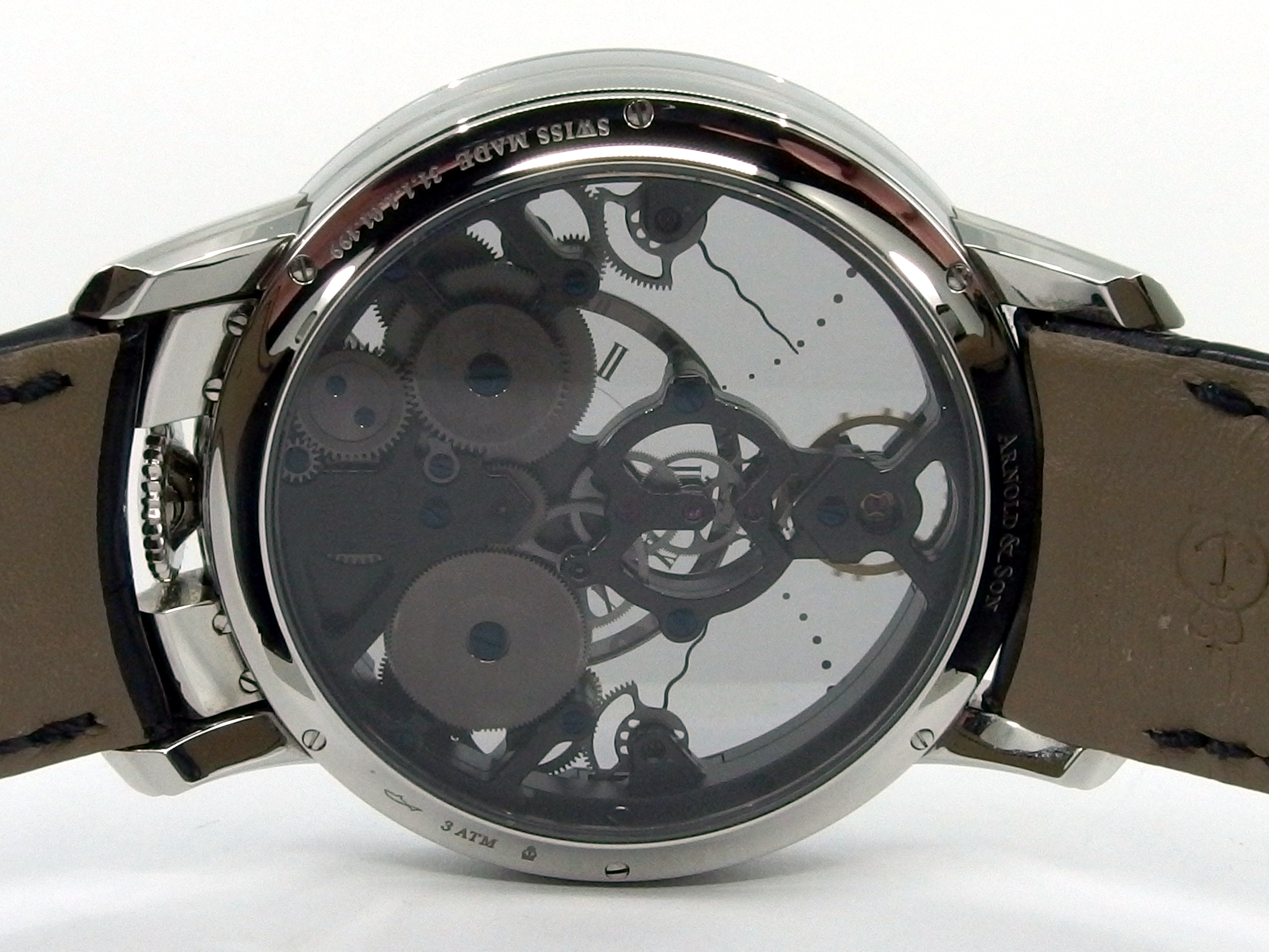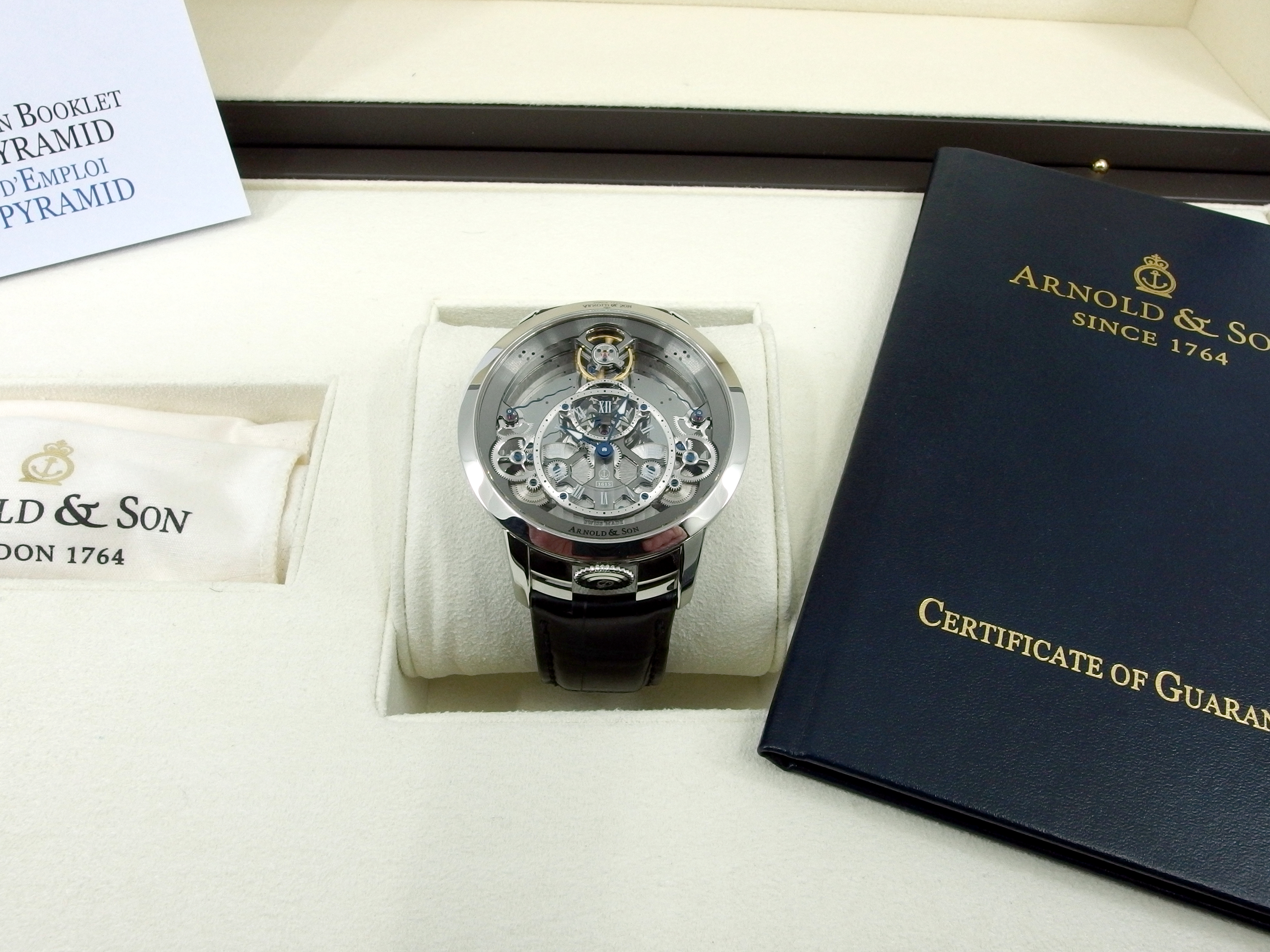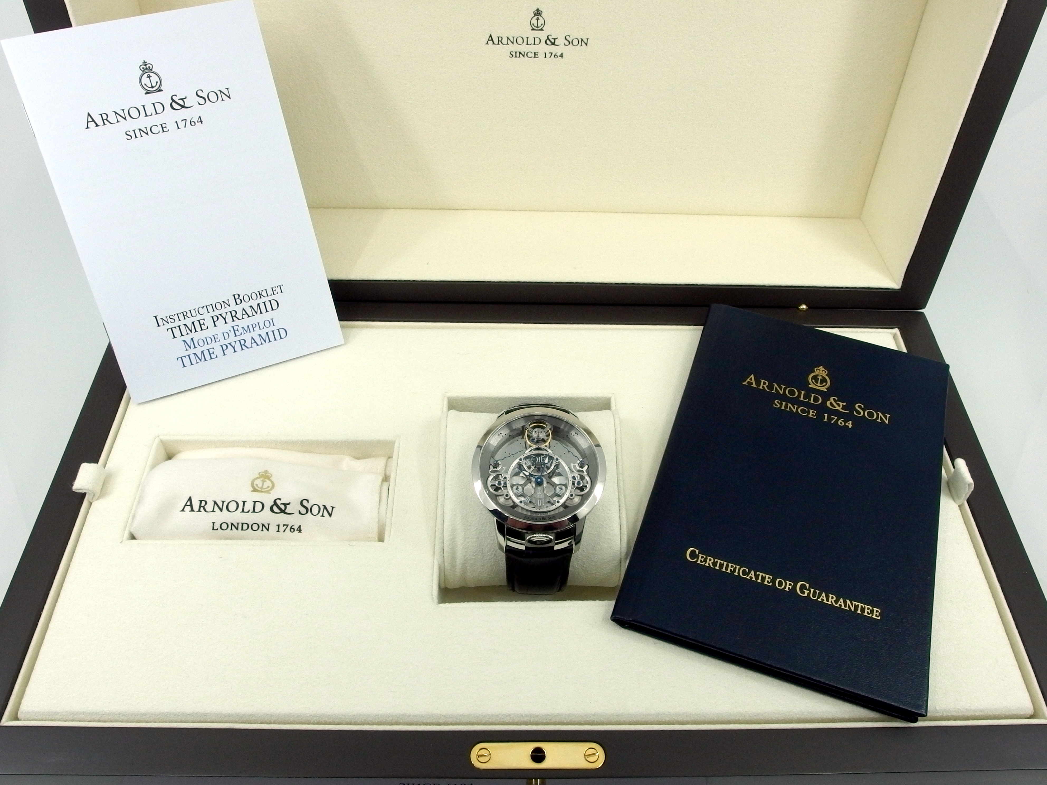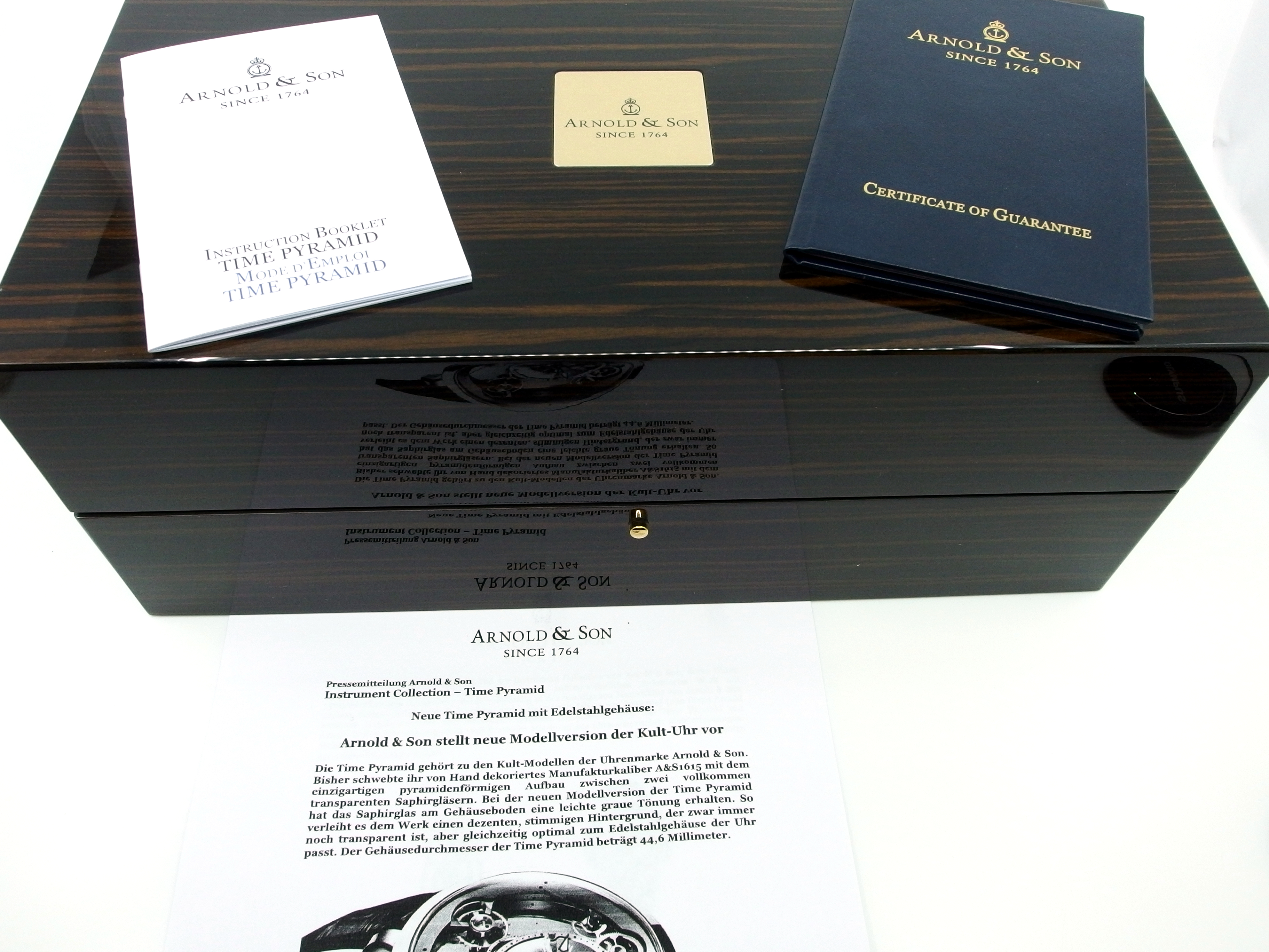 Arnold & Son Instrument Collection TIME PYRAMID in Edelstahl, Referenz 1TPAS.S01A.C124S, skelettiertes Manufakturkaliber A&S 1615 - mechanisches Uhrwerk - Handaufaufzug - doppeltes Federhaus - skelettiertes Werk aus Neusilber - NAC Beschichtung mit Haute Horlogerie-Finissierung - von Hand angelierte Brücken mit polierten Kanten - satinierte Hauptplatine - Genfer Streifenschliff - gebläute Schrauben, Funktionen: Stunden - Minuten - Sekunden - zwei Gangreserveanzeigen, Durchmesser 44,6mm, gewölbtes Saphirglas mit beidseitiger Antireflex-Beschichtung - transparenter Saphirglasgehäuseboden mit grauer Tönung, sehr guter Zustand aus Sammlung, anbei Box - Zertifikat - Booklet. Dieser Artikel ist differenzbesteuert nach §25A UStG. Dieser Artikel ist sofort lieferbar.