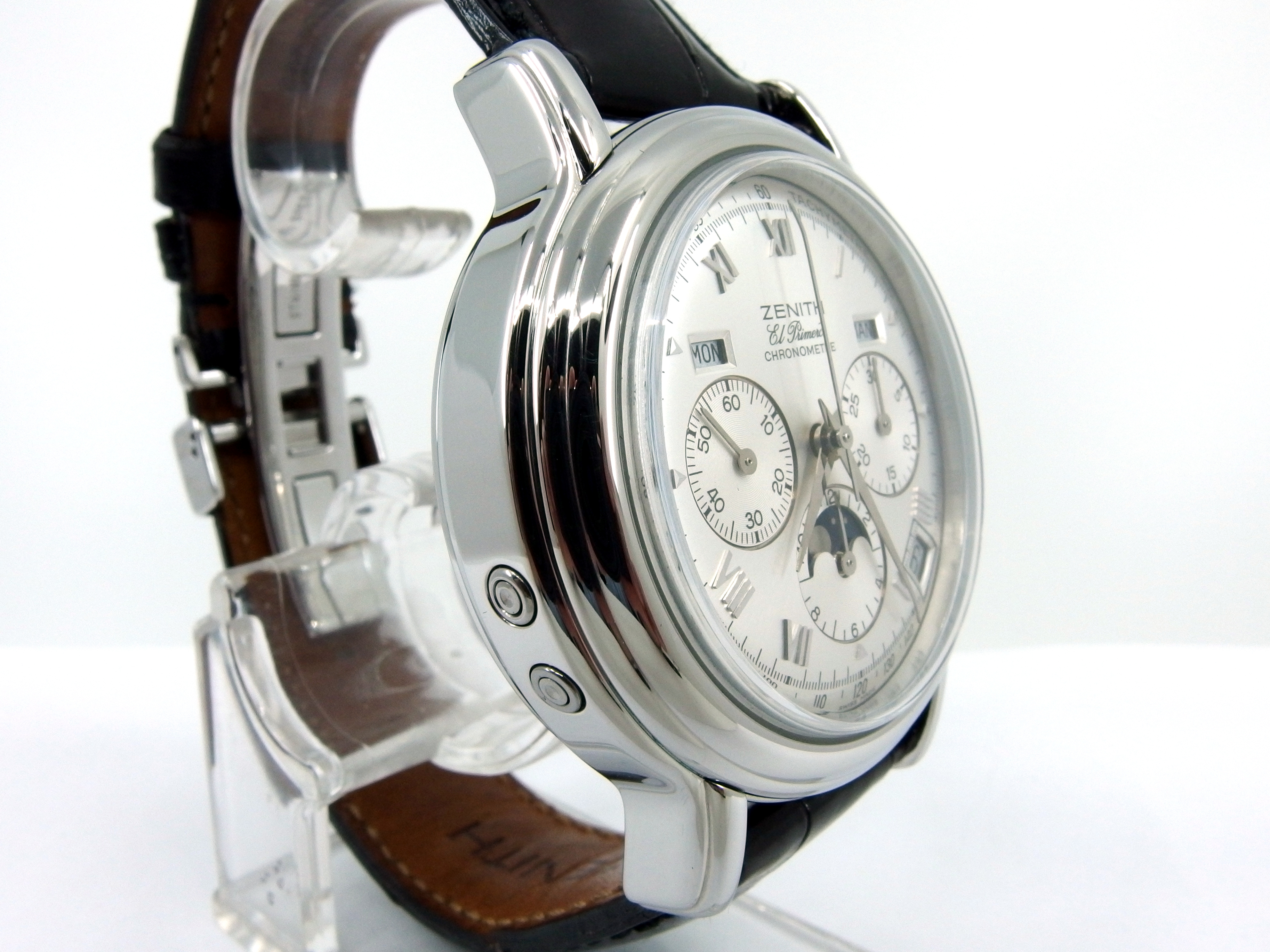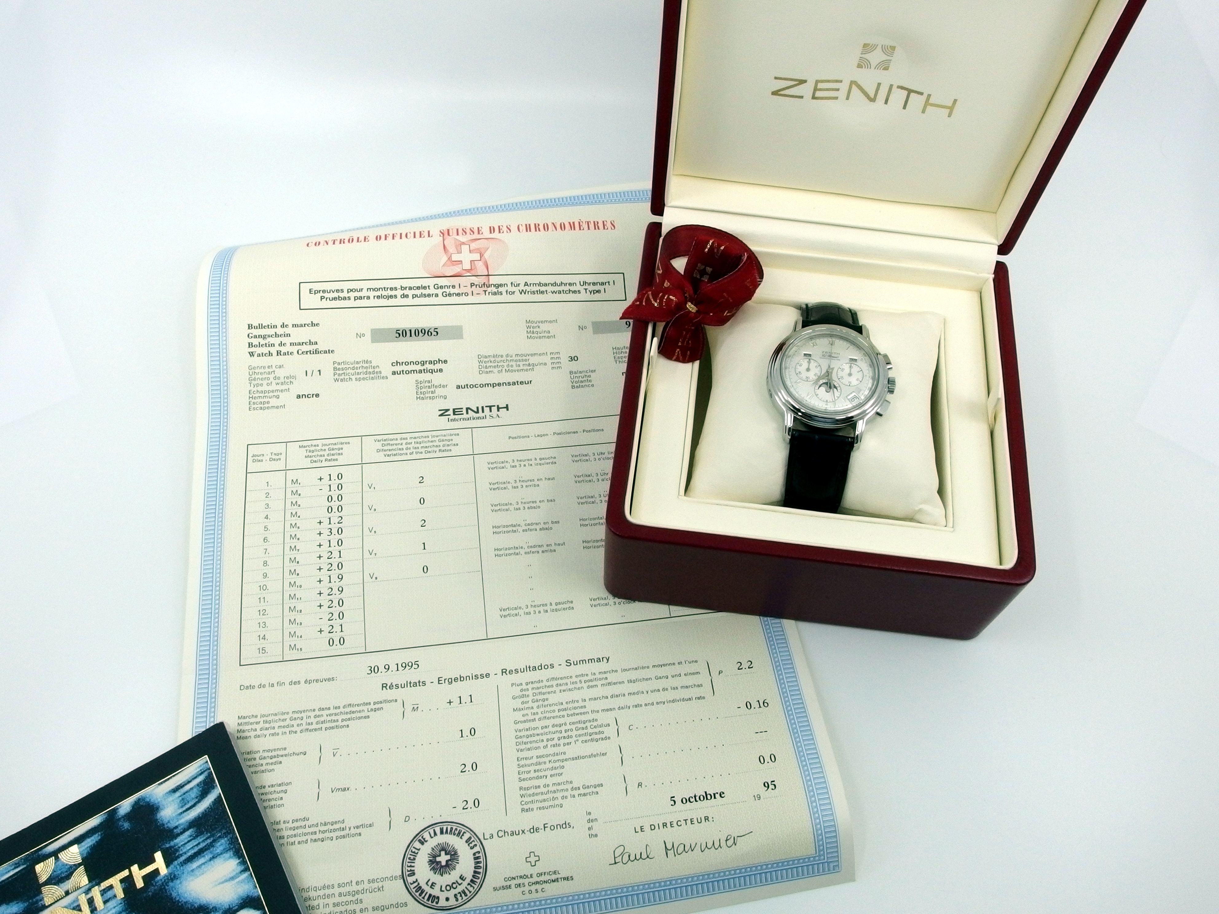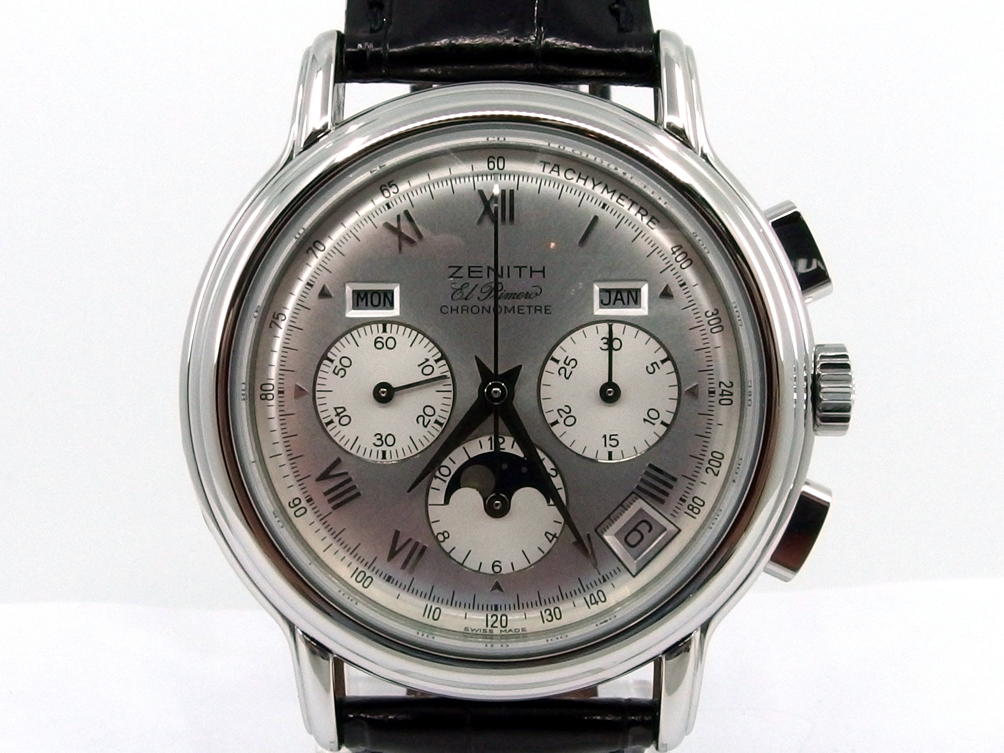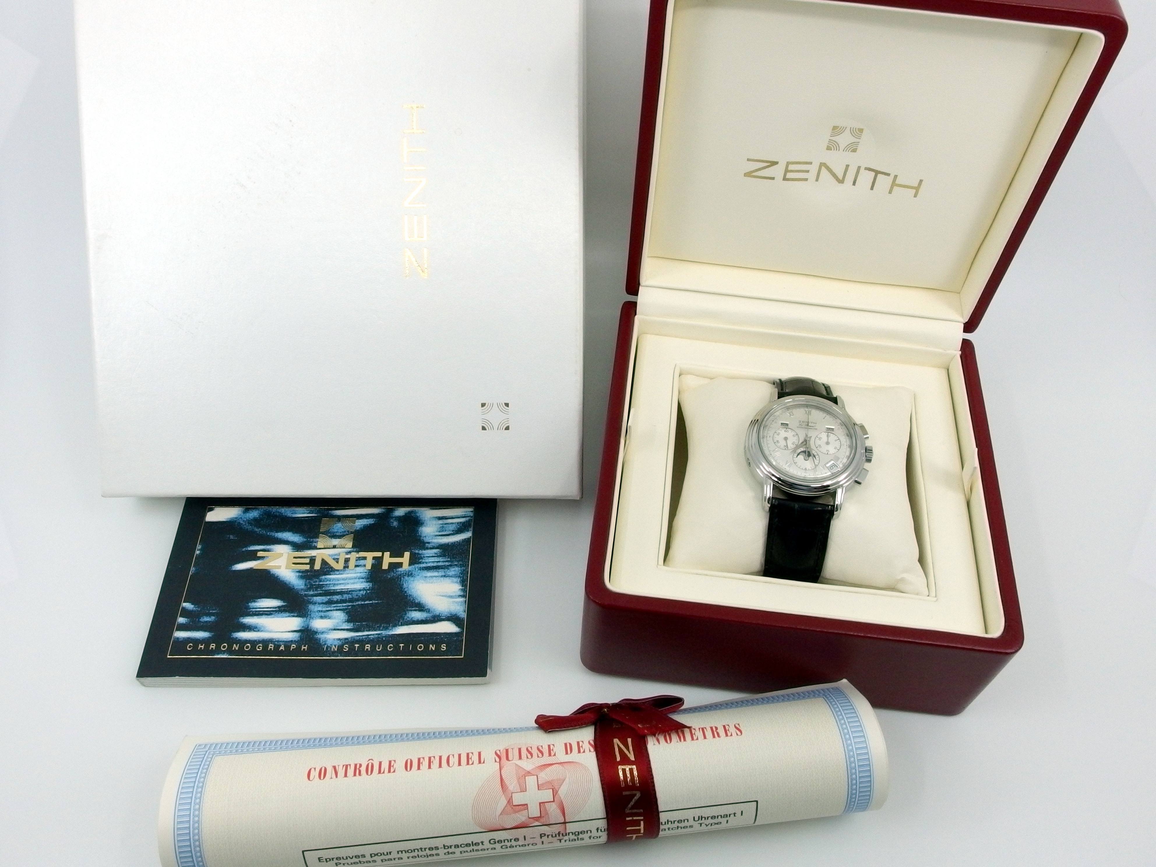 ZENITH El Primero Chronomaster Chronometer Chronograph mit Vollkalender & Mondphase in Edelstahl, Referenz 01.0240.410, El Primero Automatik Kaliber 410, Lederband mit neutraler Doppelfaltschließe in Stahl, sehr guter Zustand, anbei orig. Box - Bedienungsanleitung - Chronometer Zertifikat vom 5. Oktober 1995. Dieser Artikel ist differenzbesteuert nach §25A UStG. Dieser Artikel ist sofort lieferbar.