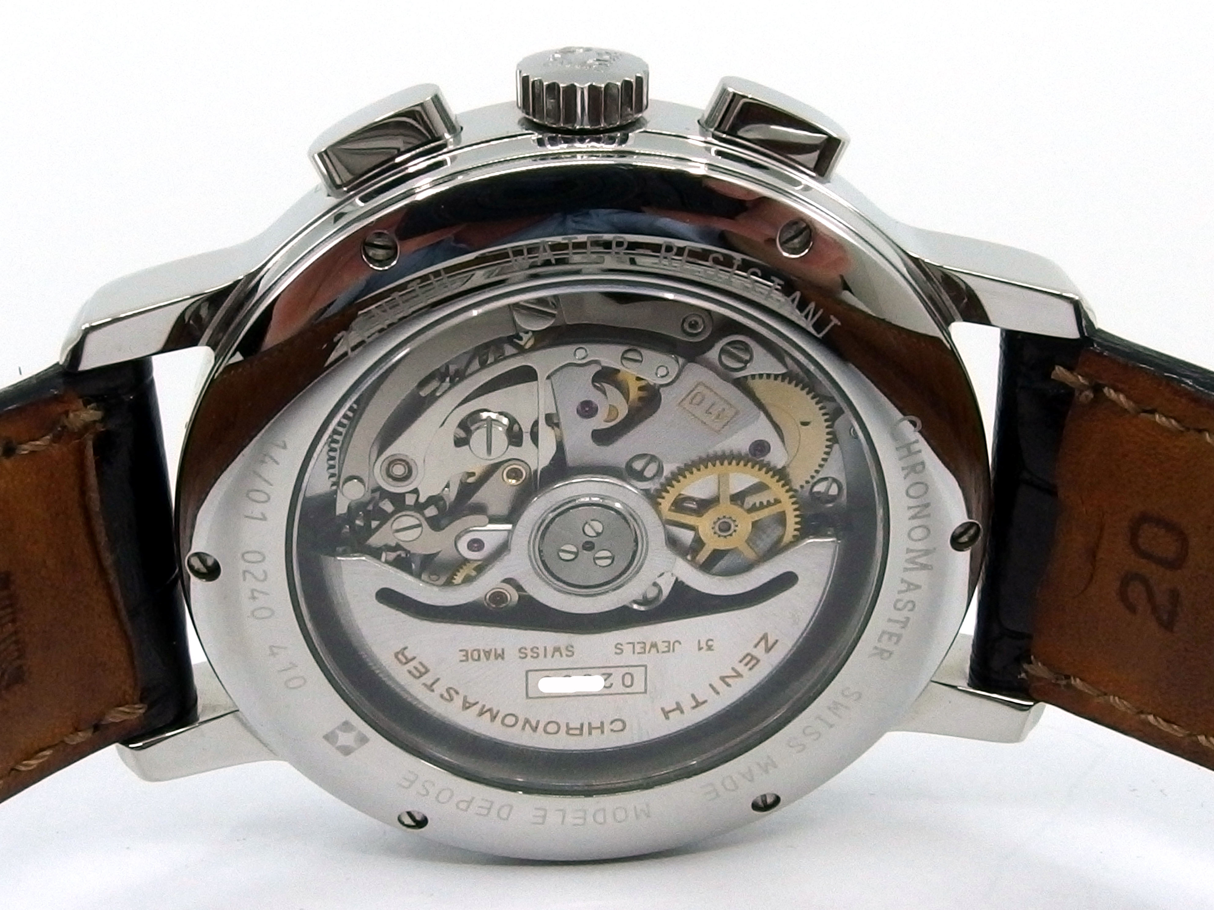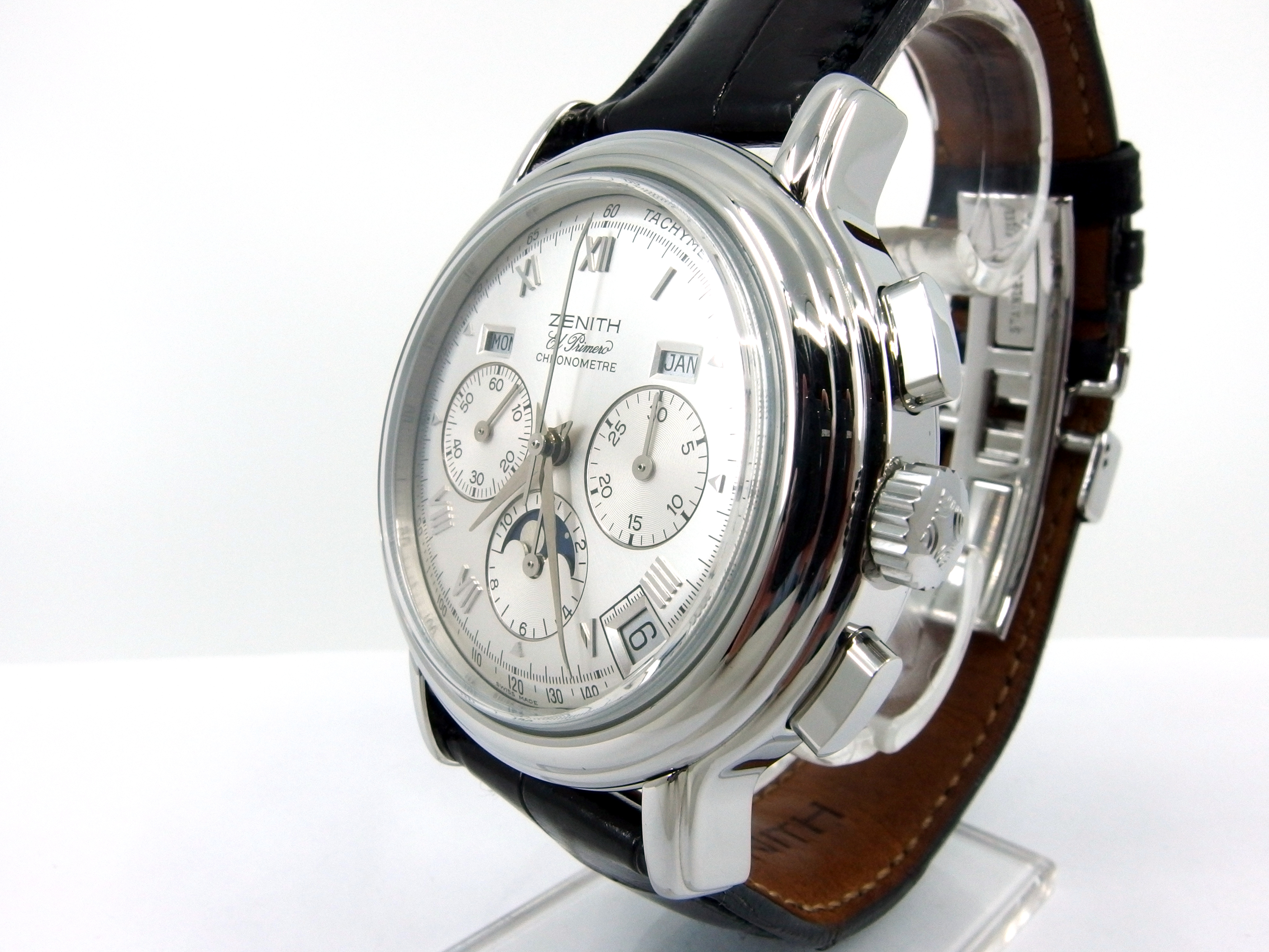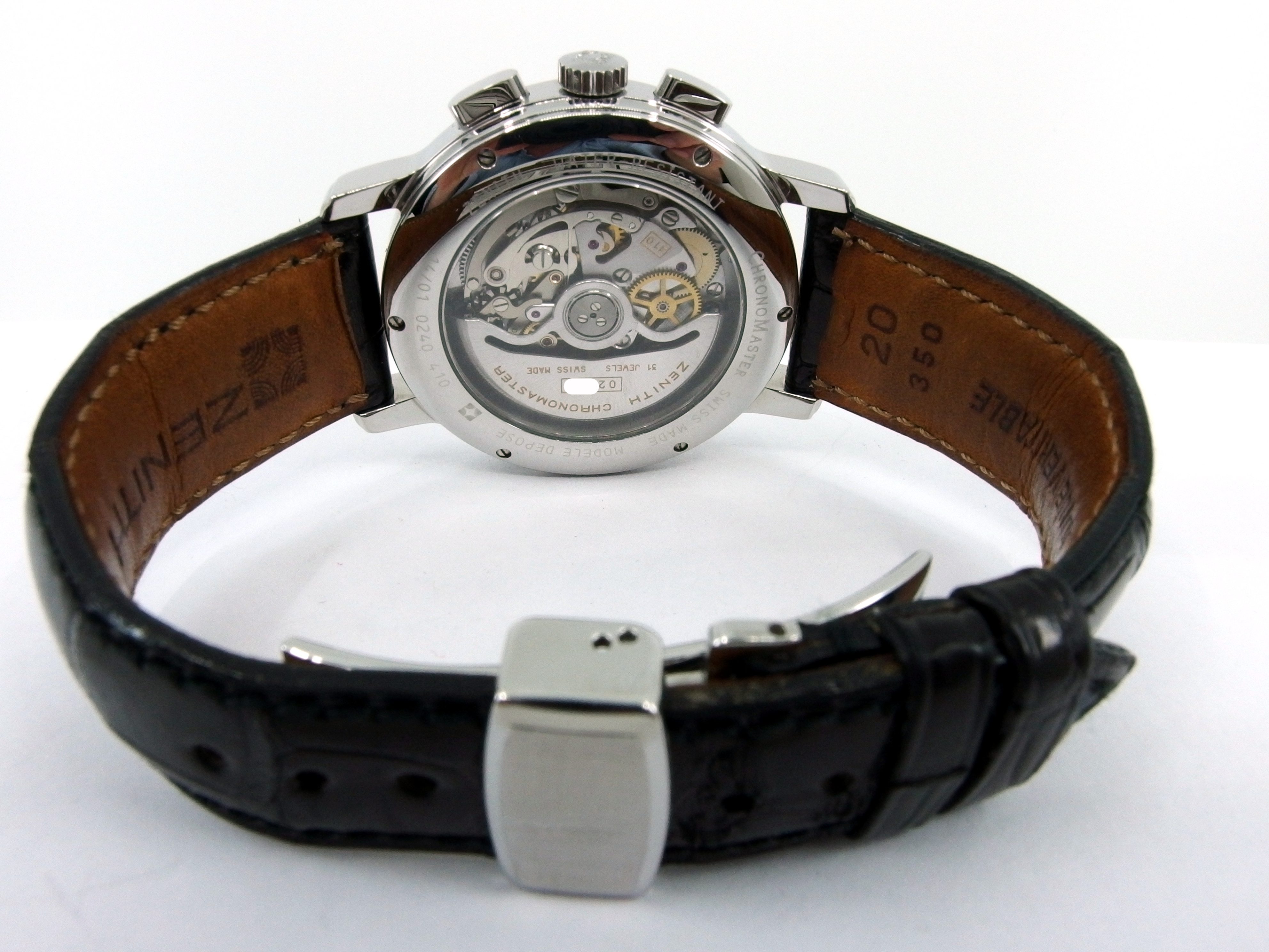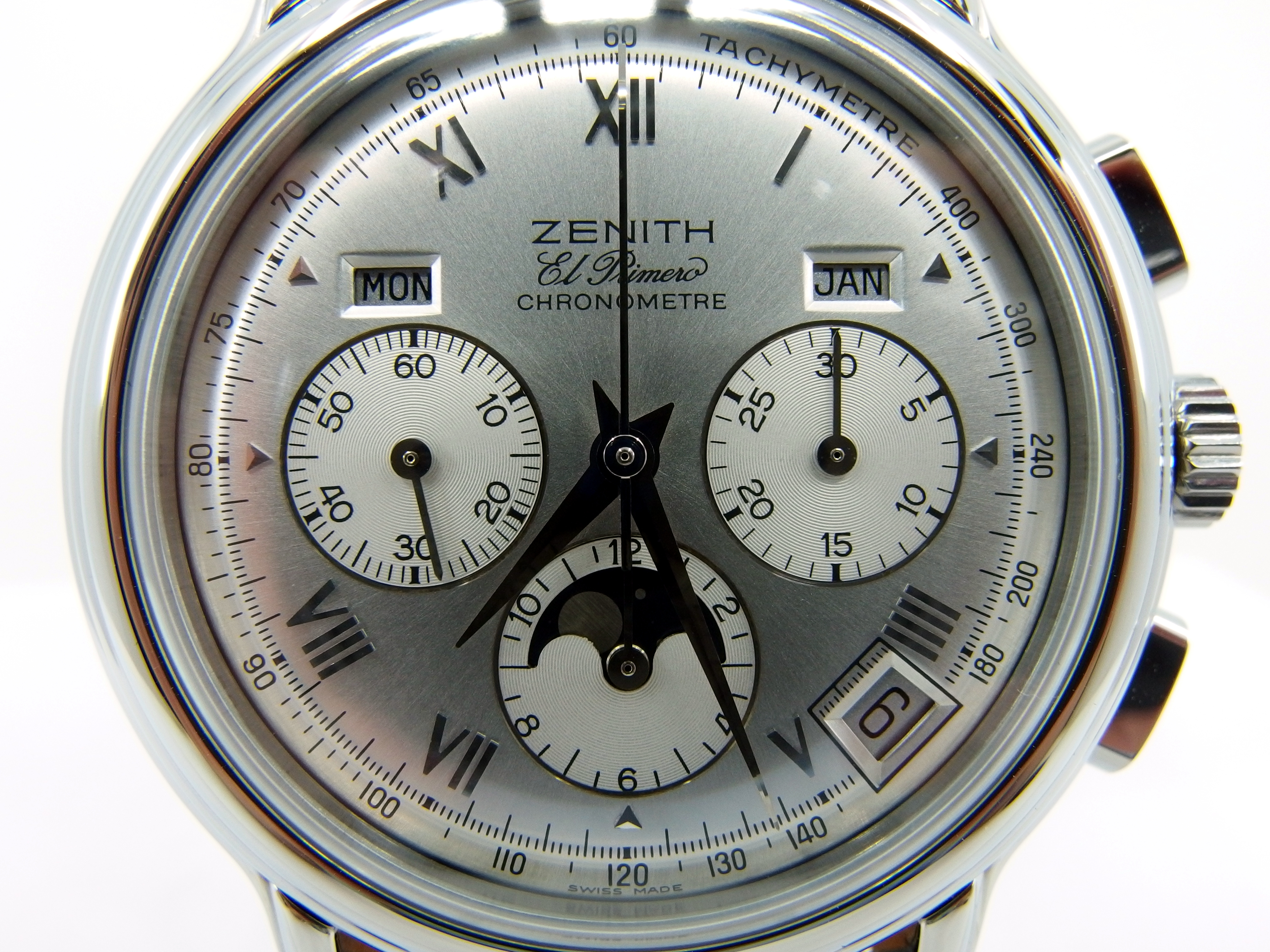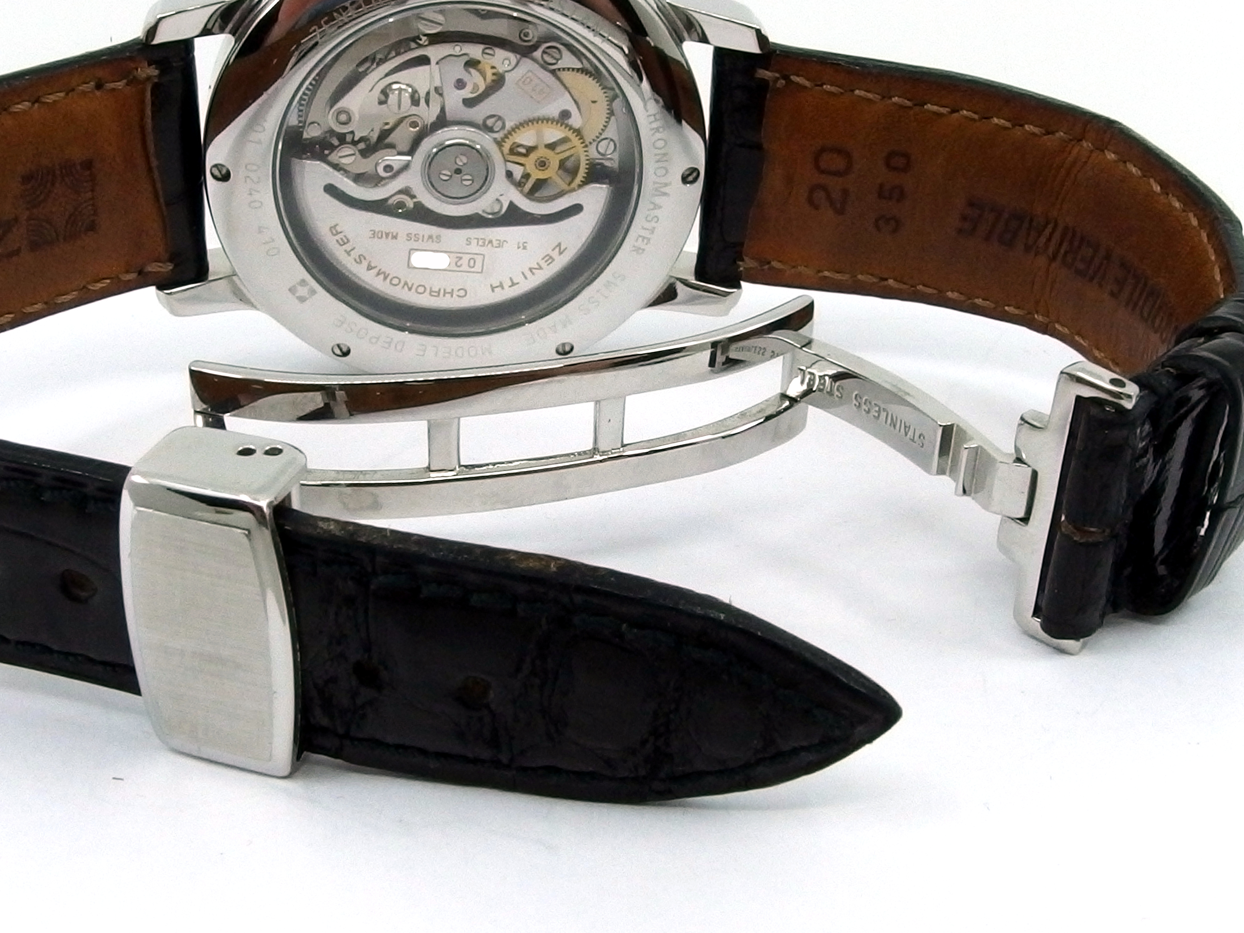 ZENITH El Primero Chronomaster Chronometer Chronograph mit Vollkalender & Mondphase in Edelstahl, Referenz 01.0240.410, El Primero Automatik Kaliber 410, Lederband mit neutraler Doppelfaltschließe in Stahl, sehr guter Zustand, anbei orig. Box - Bedienungsanleitung - Chronometer Zertifikat vom 5. Oktober 1995. Dieser Artikel ist differenzbesteuert nach §25A UStG. Dieser Artikel ist sofort lieferbar.
