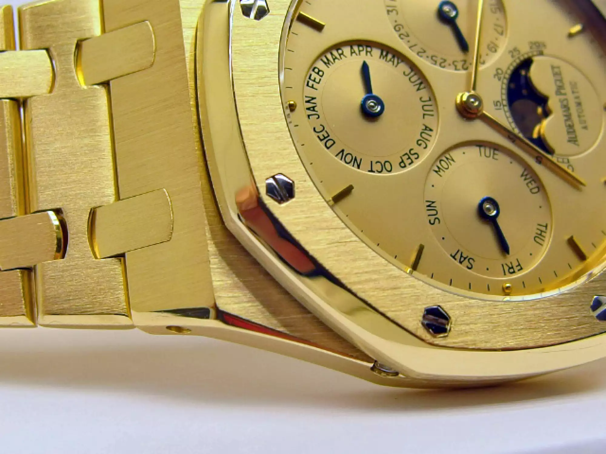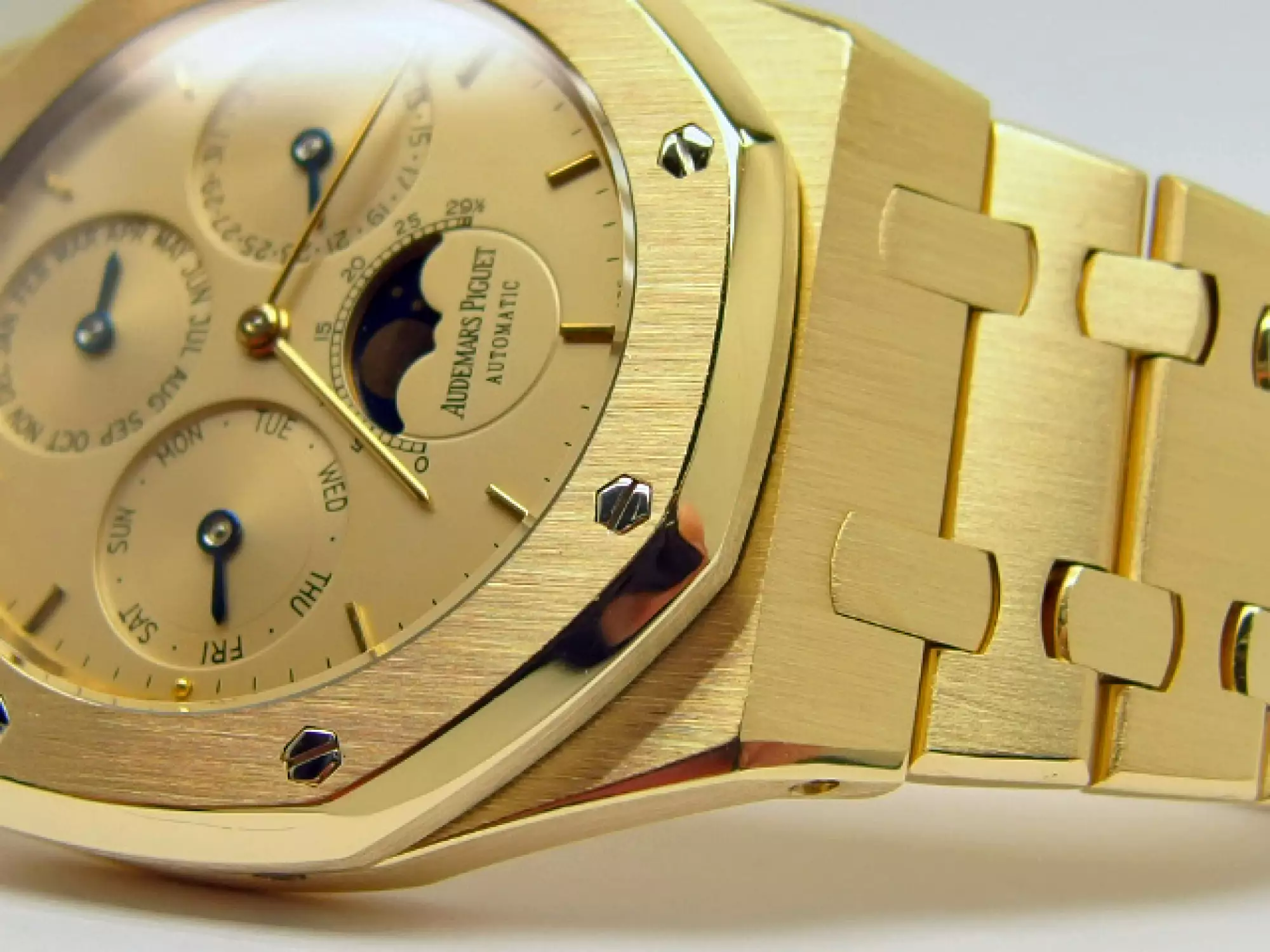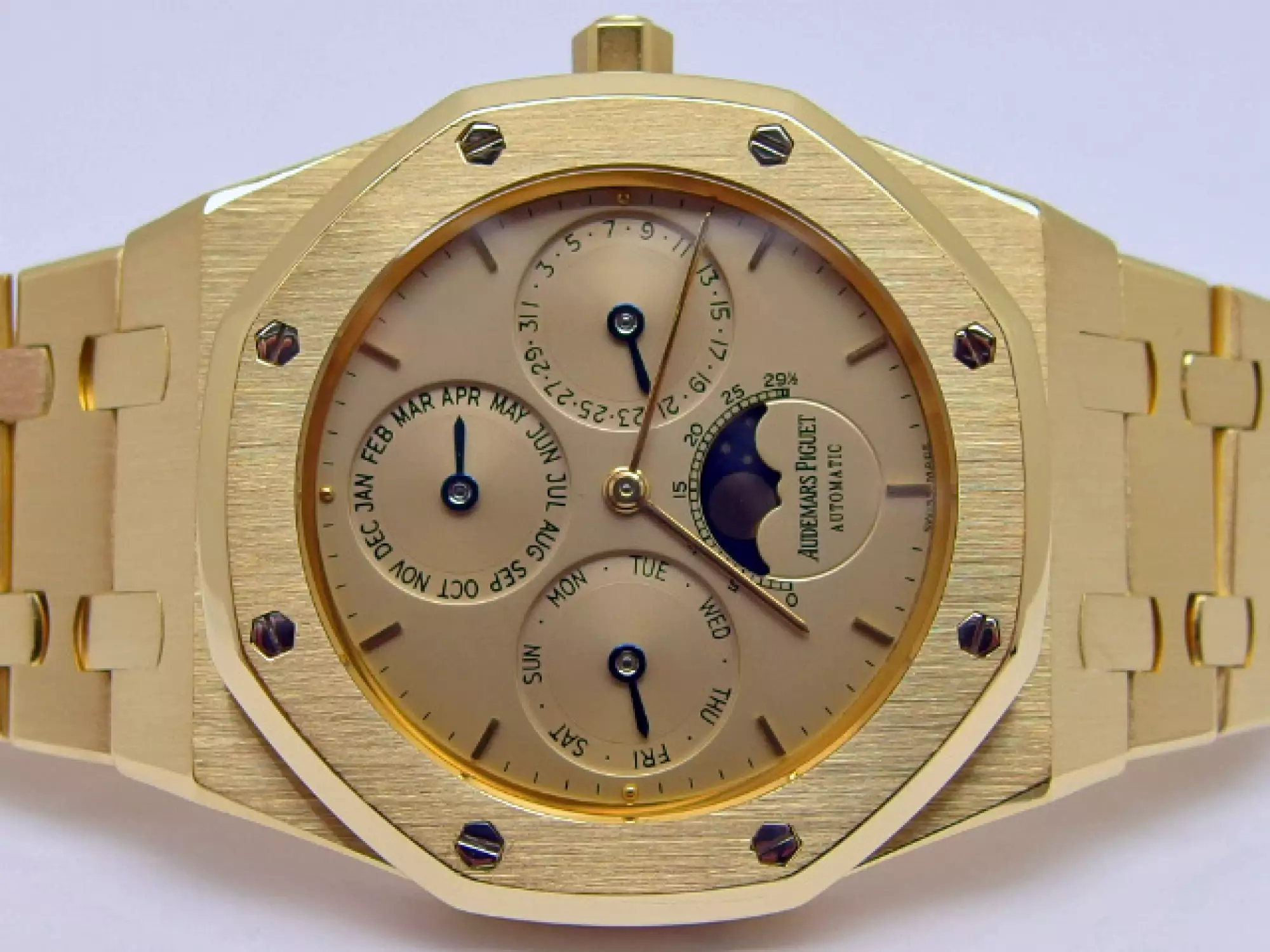 Audemars Piguet Royal Oak Perpetual Calendar Quantieme Perpetuel with the reference 25654BA.0.944BA.01 in 18k yellow gold. Launched in 1987, the 25654 continues the aesthetics of its predecessor, the 5554, but improves water-resistance by revising the case construction, which has been enlarged from 7.5 mm to 8.3 mm. For almost a decade, this model was the centre piece of the 39 mm Royal Oak Perpetual Calendar collection. Of the 12 Royal Oak models equipped with the calibre 2120/2800, model 25654 accounted for almost half of production. It did not leave the Audemars Piguet catalogue until 1996, when its successor, model 25820, introduced the leap-year display on the dial and replaced the calibre 2120/2800 with the calibre 2120/2801. This example has the AP bracelet in yellow gold with the second-generation AP folding clasp. This watch is in very good condition and comes in a set with a letter from AP Germany with serial number of the watch - operating instructions - AP video cassette - AP USB card - AP winder from SWISS Kubik. This item is subject to margin tax §25A UStG. This item is directly available.