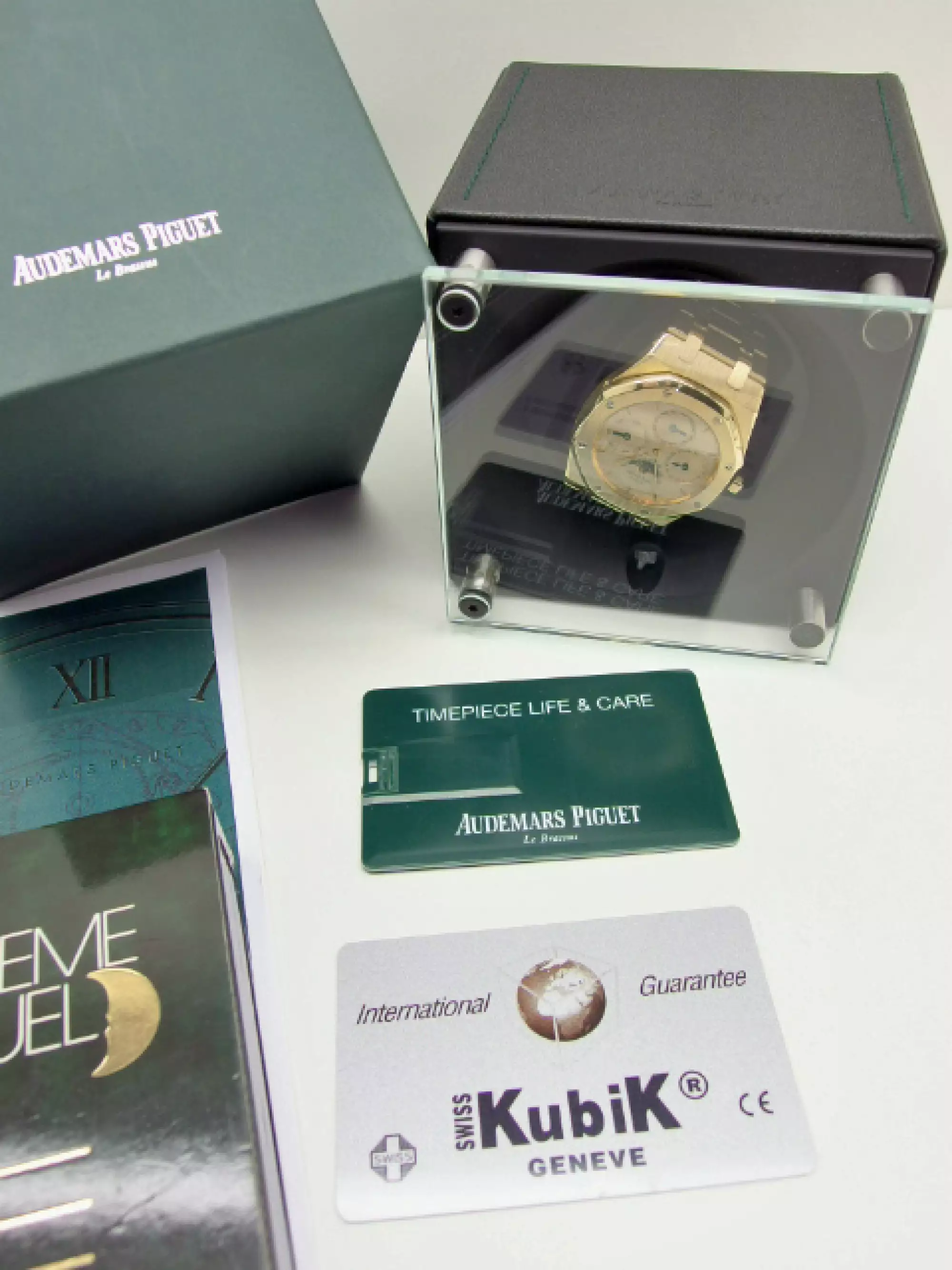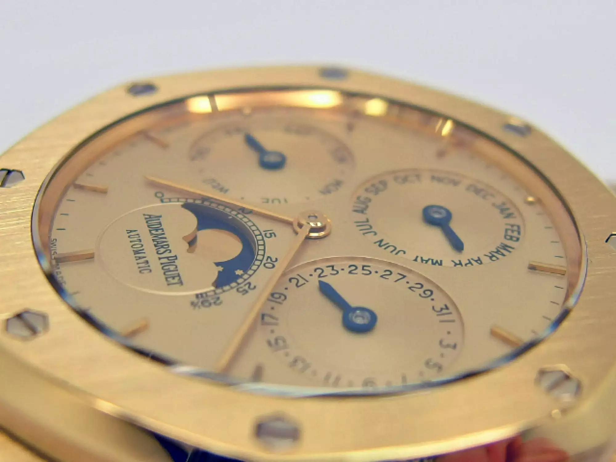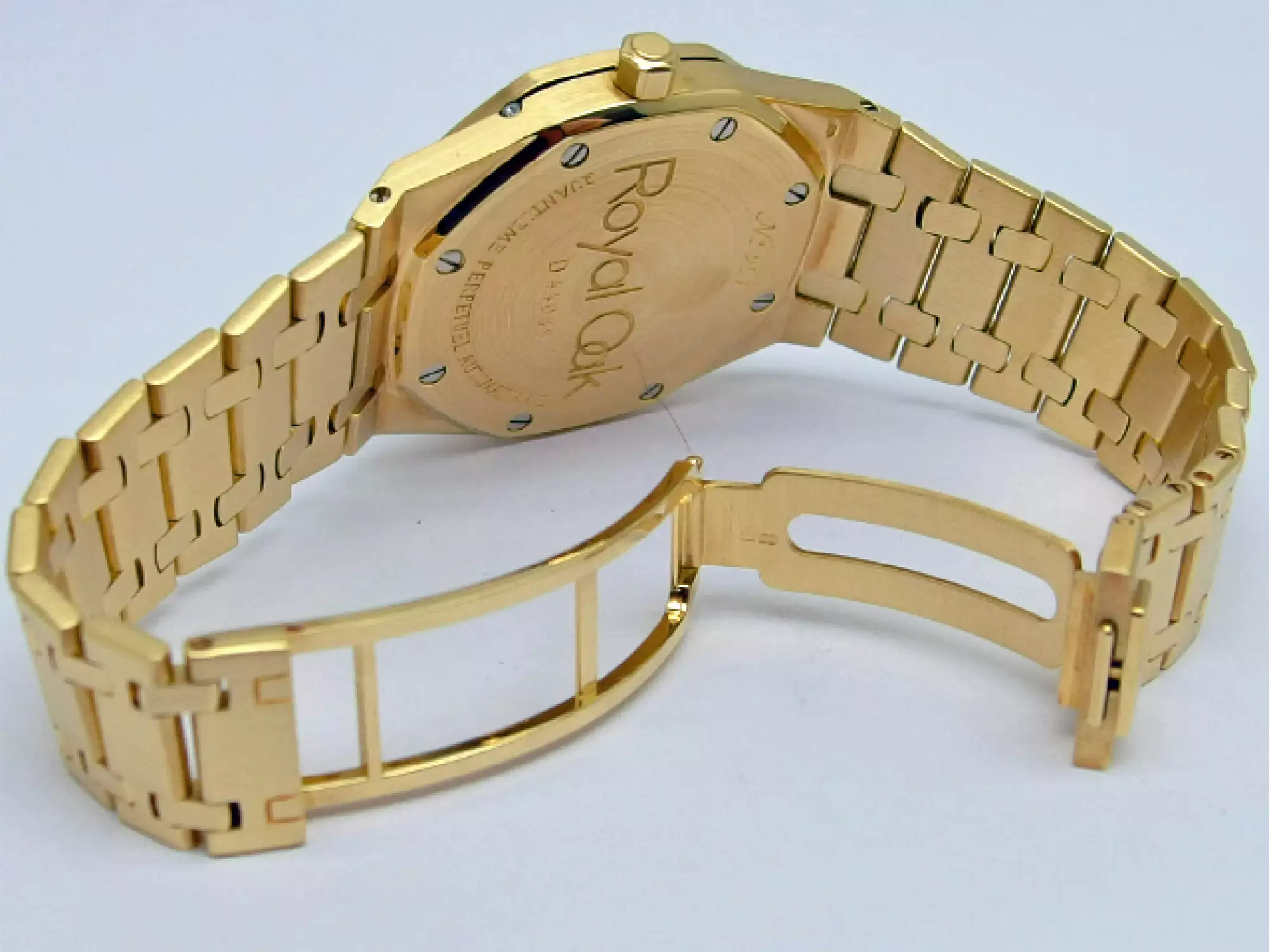 Audemars Piguet Royal Oak Perpetual Calendar Quantieme Perpetuel with the reference 25654BA.0.944BA.01 in 18k yellow gold. Launched in 1987, the 25654 continues the aesthetics of its predecessor, the 5554, but improves water-resistance by revising the case construction, which has been enlarged from 7.5 mm to 8.3 mm. For almost a decade, this model was the centre piece of the 39 mm Royal Oak Perpetual Calendar collection. Of the 12 Royal Oak models equipped with the calibre 2120/2800, model 25654 accounted for almost half of production. It did not leave the Audemars Piguet catalogue until 1996, when its successor, model 25820, introduced the leap-year display on the dial and replaced the calibre 2120/2800 with the calibre 2120/2801. This example has the AP bracelet in yellow gold with the second-generation AP folding clasp. This watch is in very good condition and comes in a set with a letter from AP Germany with serial number of the watch - operating instructions - AP video cassette - AP USB card - AP winder from SWISS Kubik. This item is subject to margin tax §25A UStG. This item is directly available.