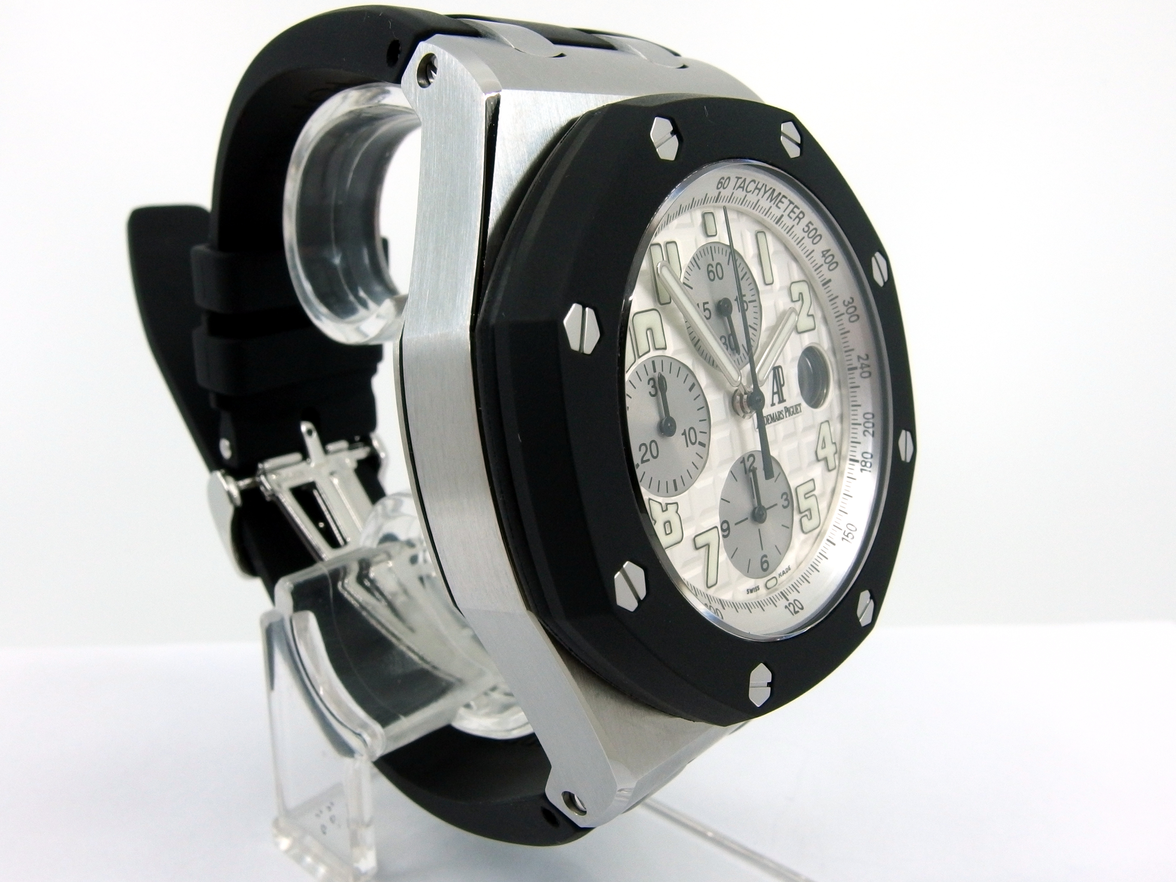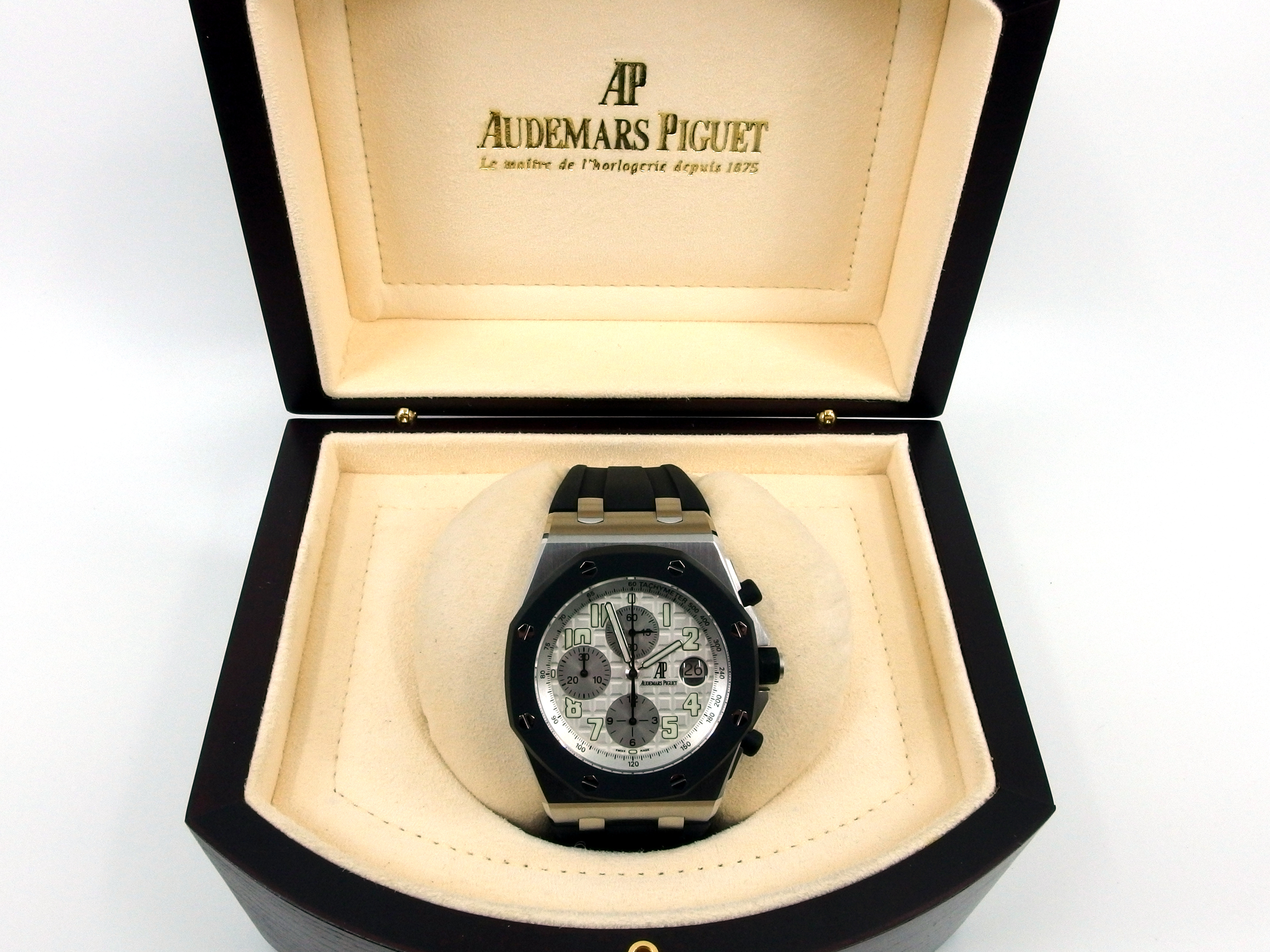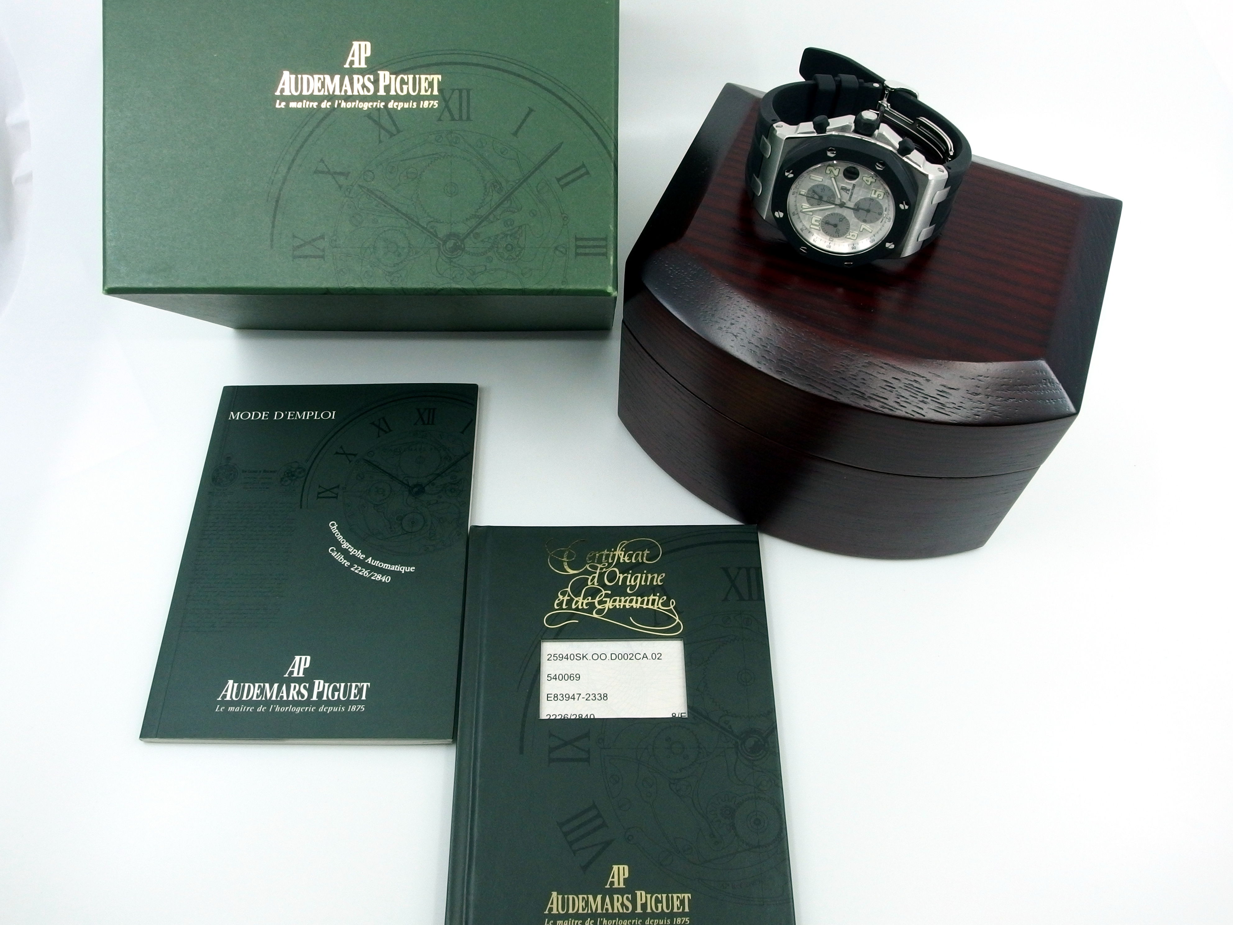 AUDEMARS PIGUET Royal Oak Offshore Rubber Chronograph, Reference 25940SK.OO.D002CA.02, in stainless Steel with Rubber Strap and Bezel, deployment Clasp, the Watch was sold on 16.7.2003 by a European A.P. Concessionaire, in September 2018 a Service at A.P. Service Center was made (replacement / renewal of all Seals / Gaskets - Crown and 2 Pushers - Rubber Strap - Bezel) since unworn and thus perfect Condition, enclosed Box - Certificate - Description - Service Invoice in Copy. The Sale of this Watch is Subject to differential-taxation according to §25A UStG (Value Added Tax Act). This item is directly available.