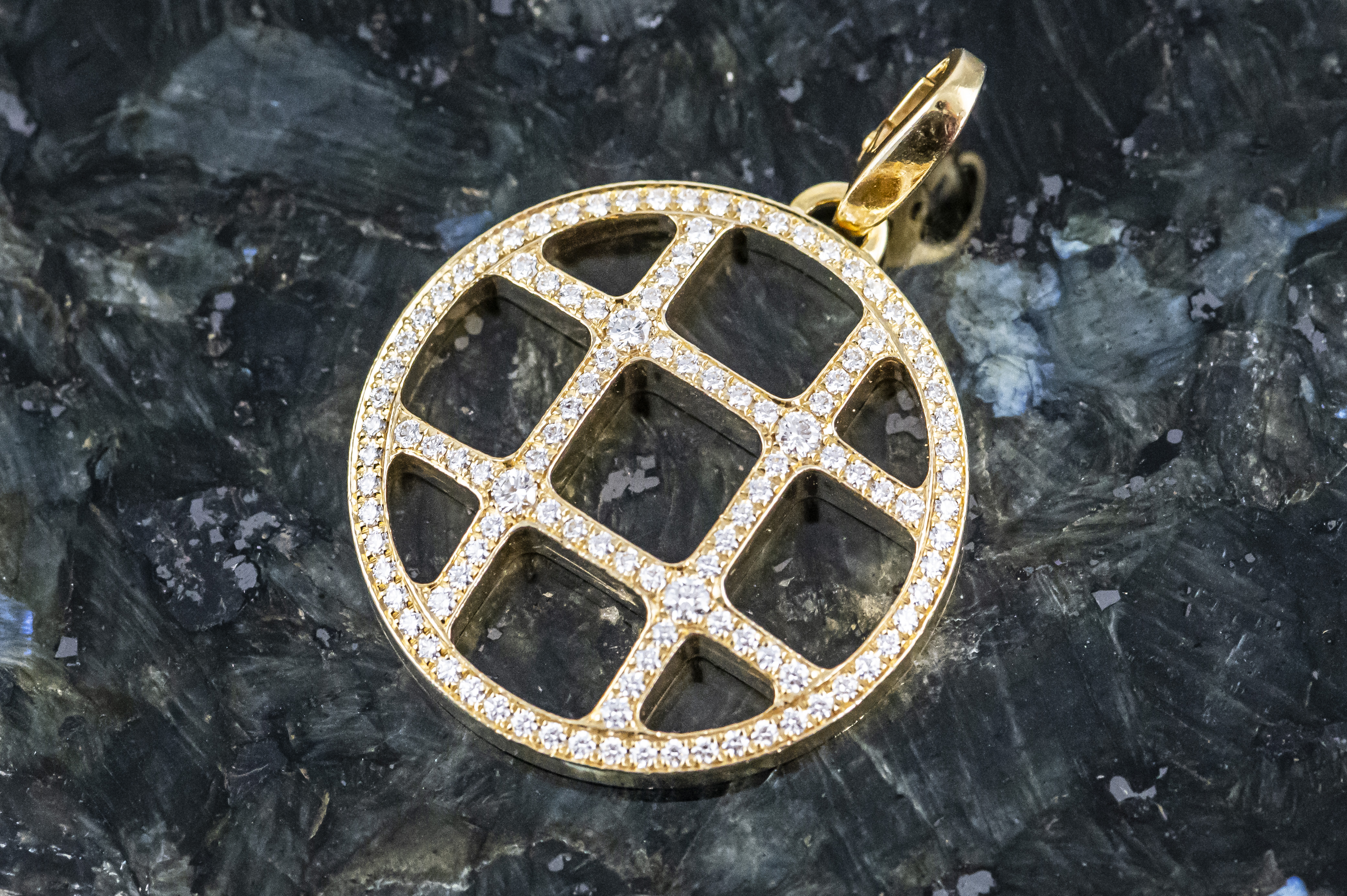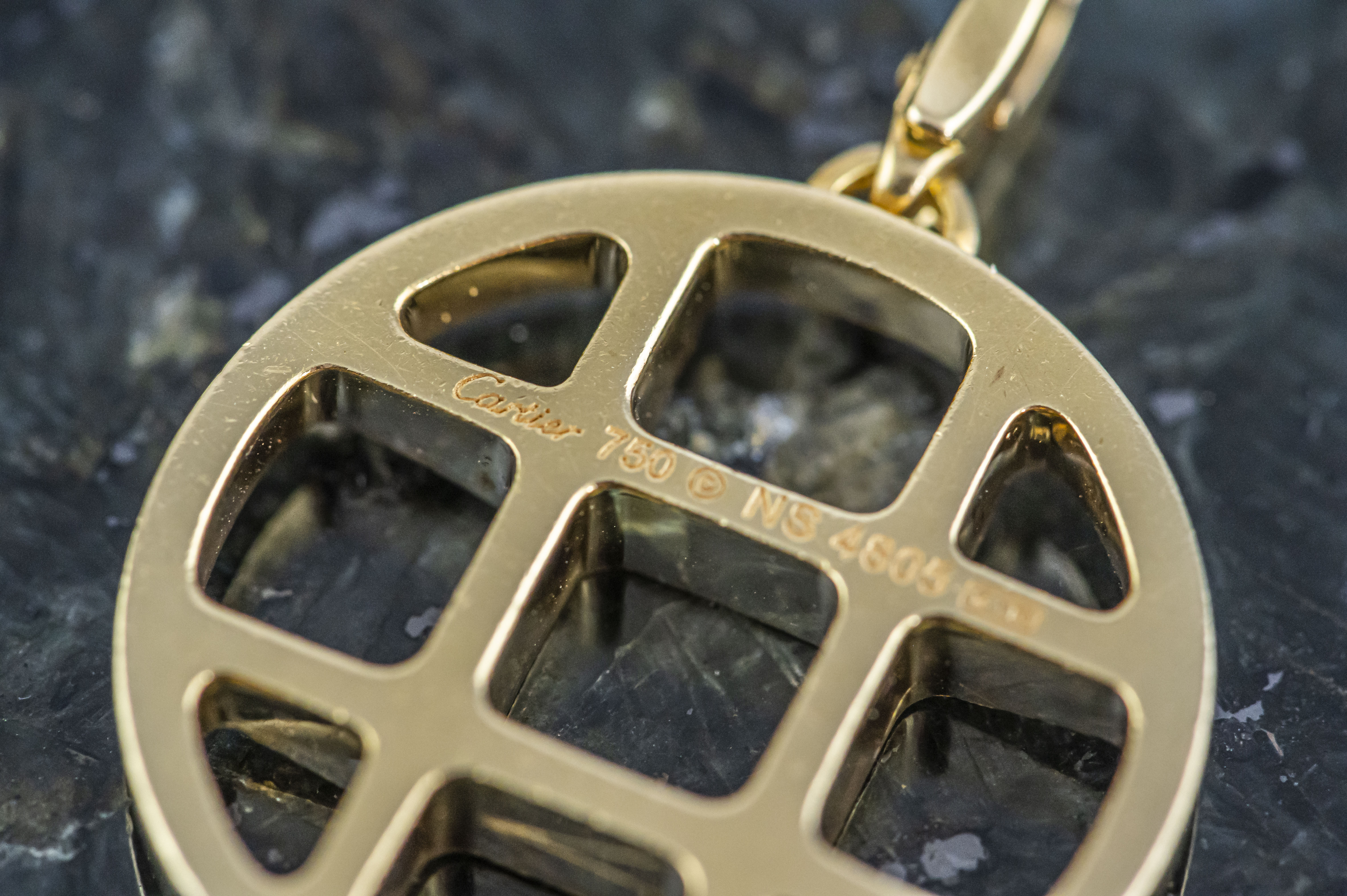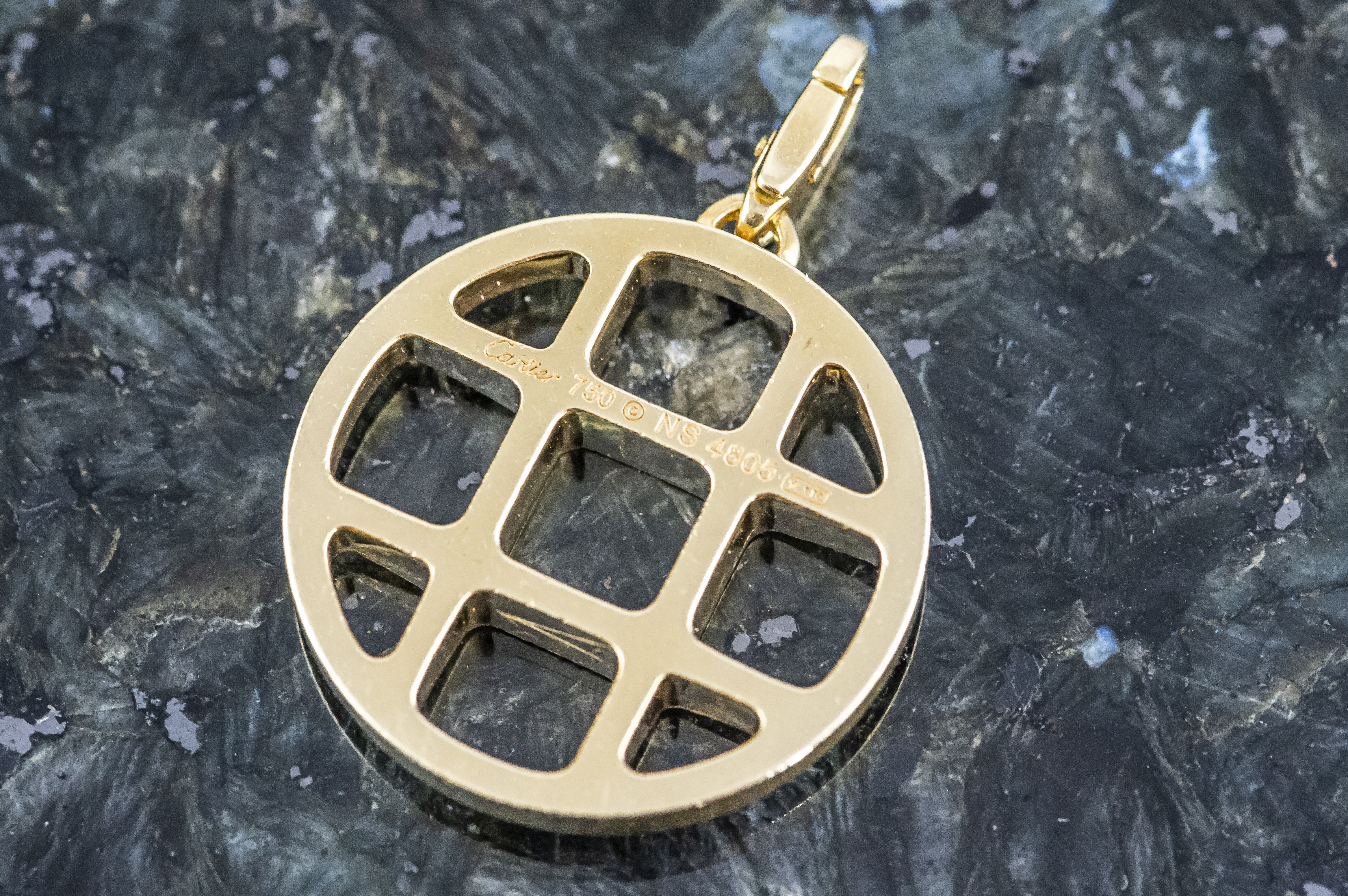 CARTIER Pasha de Cartier Grille - Grid Pendant in 18k Yellowgold | set with Diamonds | Cartier signed and numbered | Diameter 29 mm - total Weight approx. 17.6 grams | very good condition | sold by the Cartier Boutique Düsseldorf / Königsallee. This item is directly available. The Sale of this Watch is subject to differential-taxation according to §25A UStG (Value Added Tax Act).