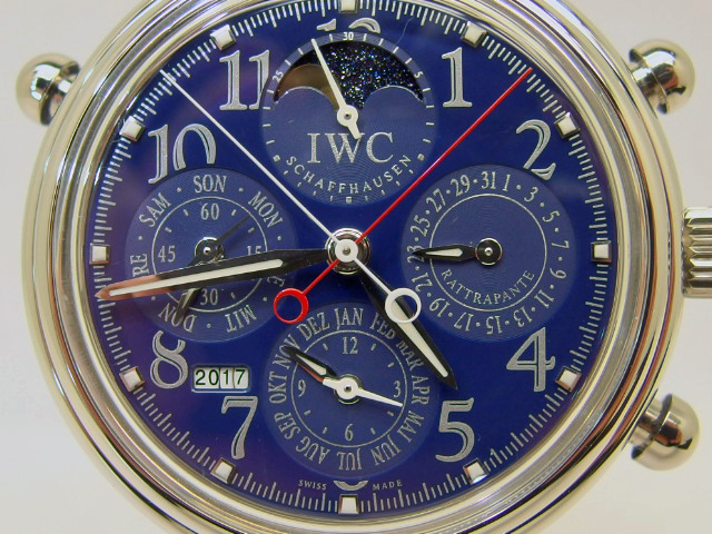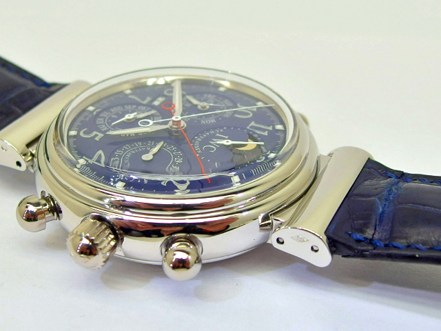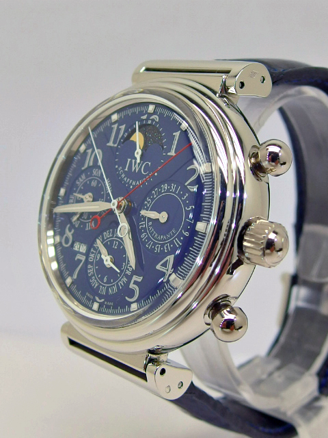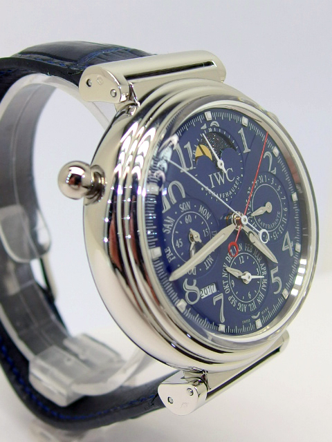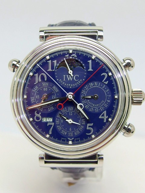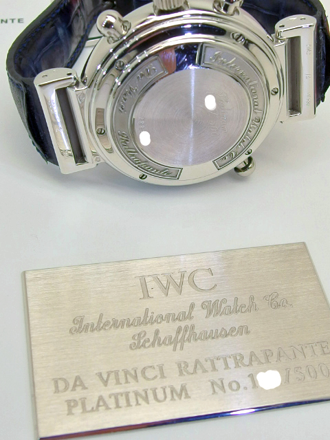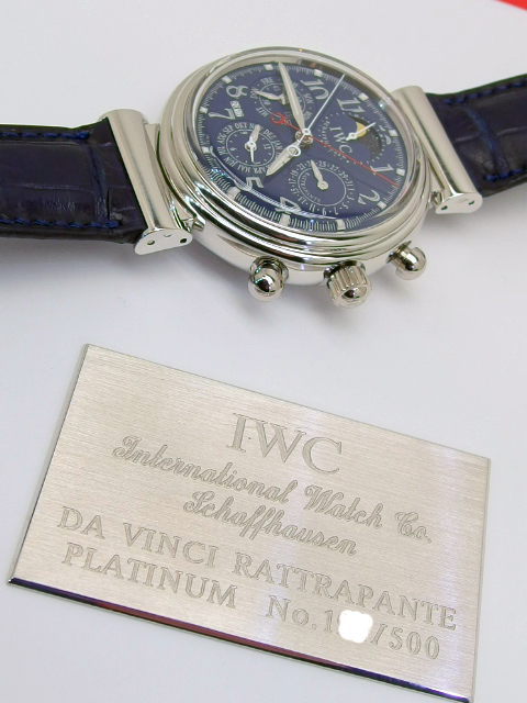 Limited IWC Da Vinci Perpetual Rattrapante in 950 platinum, Reference 3754, IWC automatic caliber 79252, Limited edition of 500 watches - here No. 17x from 500, blue Dial, Perpetual Calendar with year display - Moon Phase - Chronopraph with Rattrapante, diameter 41.5 mm, height 16.0 mm, alligator strap with IWC buckle in platinum, very good condition, comes with: Limited Metal-Plaque - Description / Book - IWC travel case - IWC cloth. This item is subject to margin tax §25A UStG. This item is directly available.