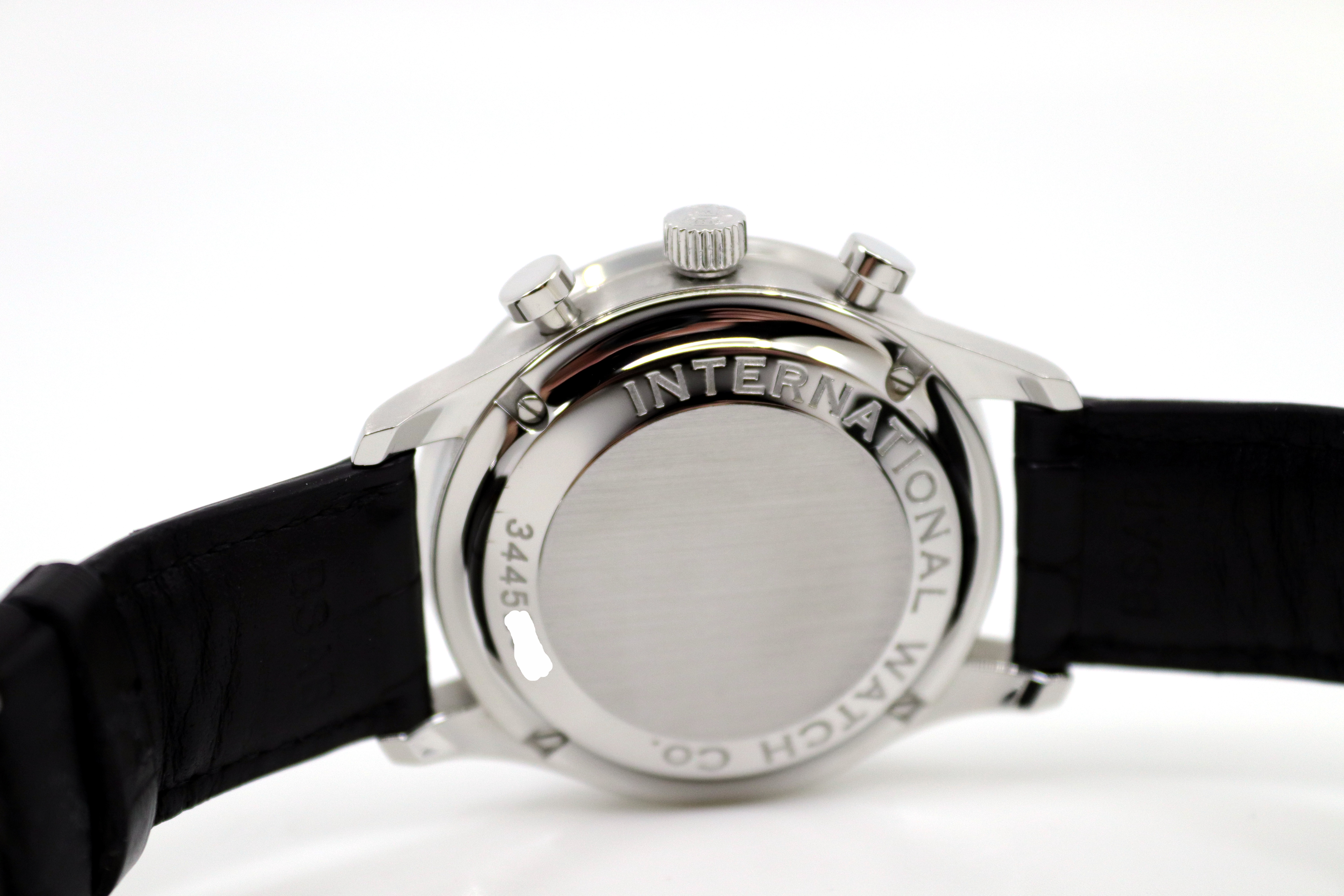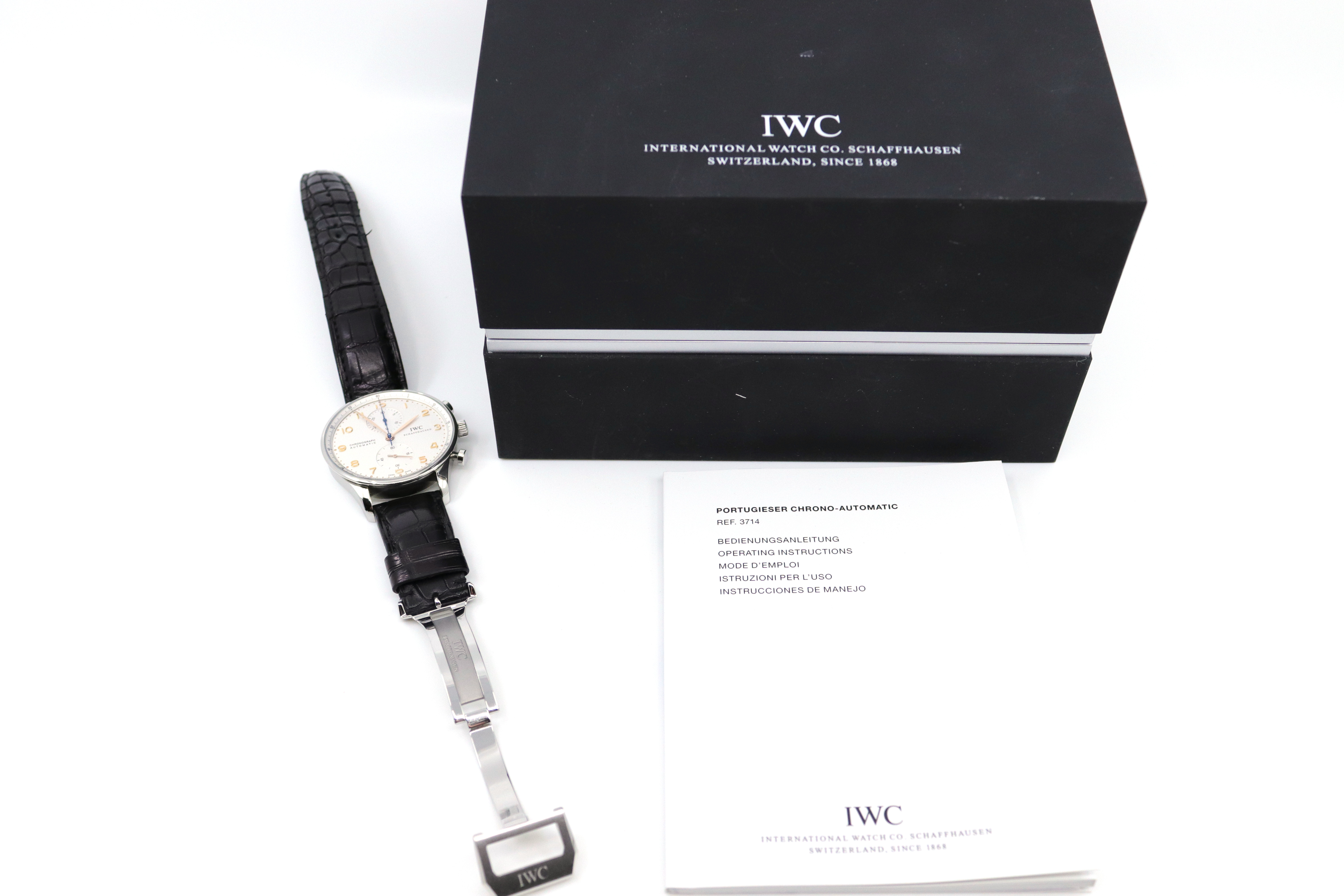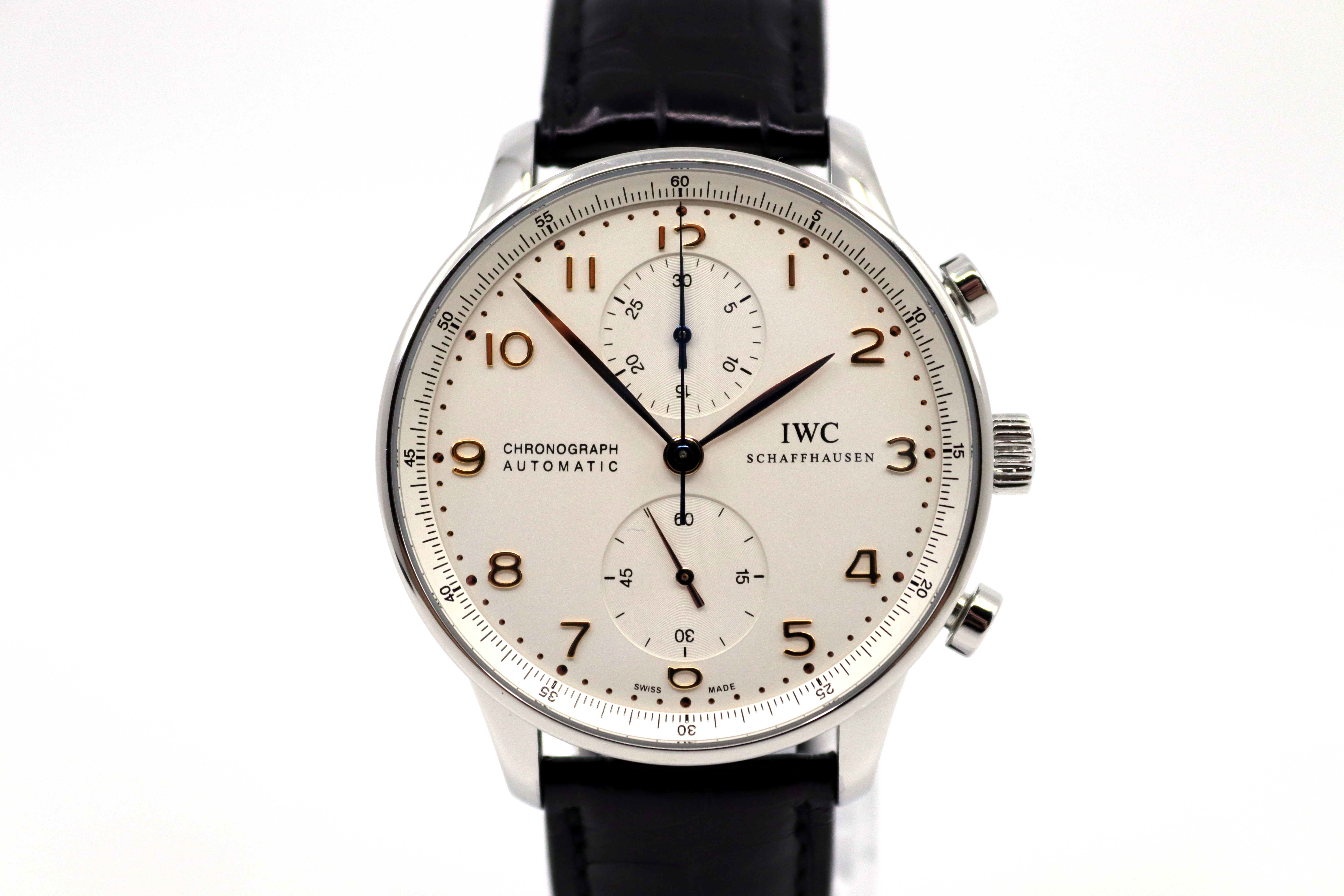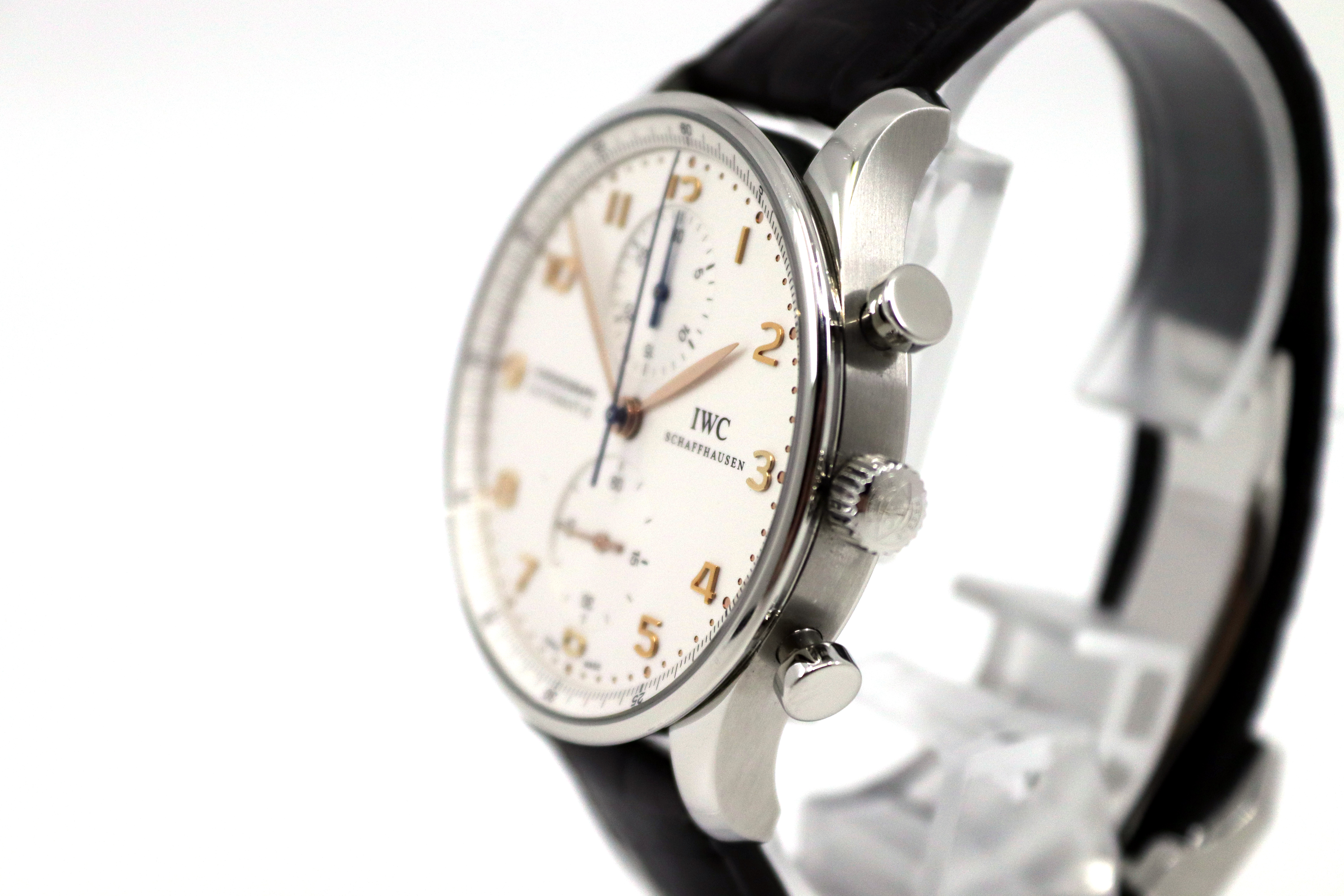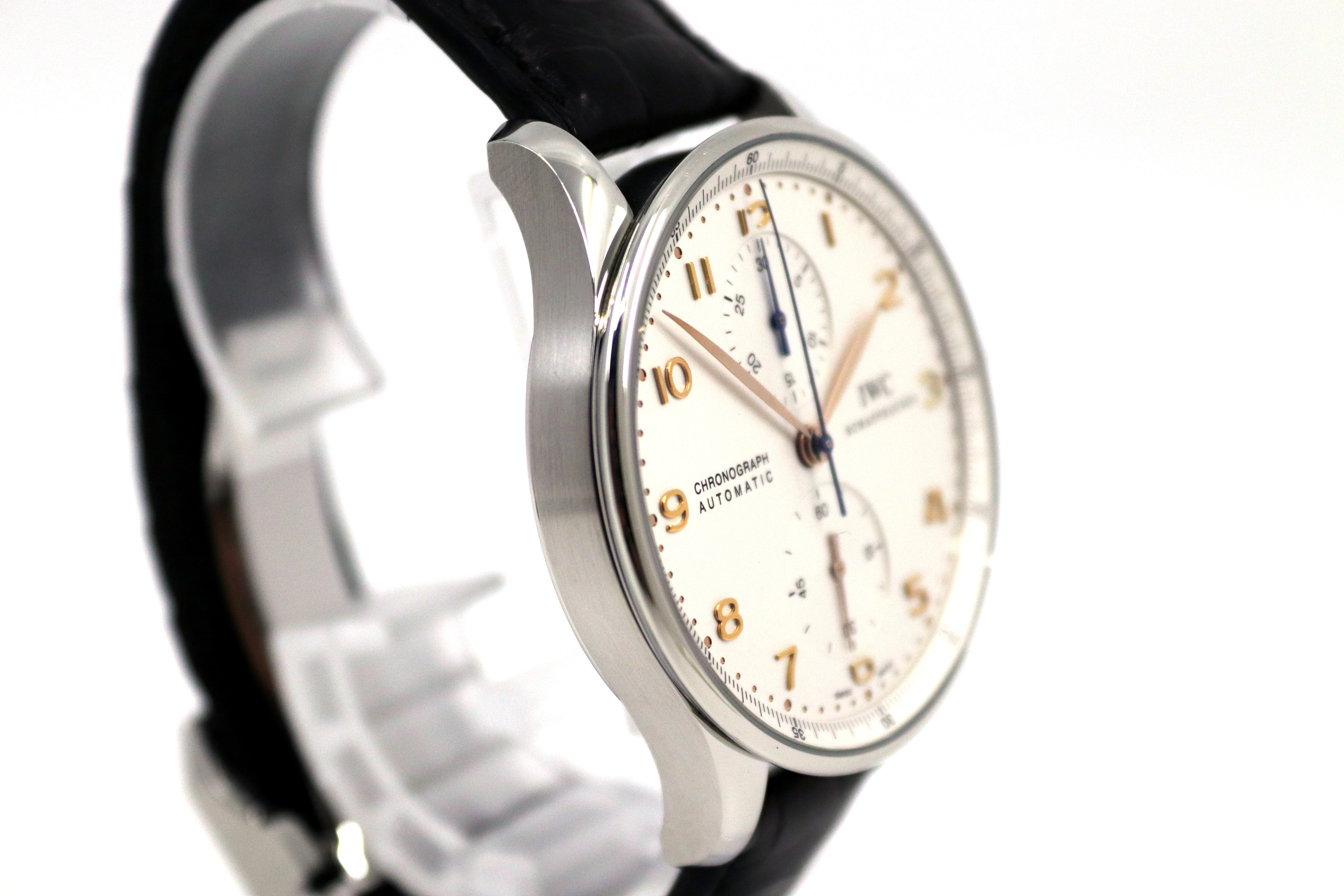 IWC PORTUGIESER Automatic Chronograph | Reference 371445 in Steel | Caliber IWC 79350 Automatic | silver Dial with applied golden arabic Numerals - rose Gold Hands | Functions: Hours - Minutes - small Second - Chronograph | screwed Caseback | very good condition | Diameter 41 mm - Height 12.3 mm | short IWC Crocodile Strap & IWC deployment Clasp in Steel | attached Leather Box - Description. This item is directly available. The sale of this Watch is subject to differential-taxation according to §25A UStG (Value Added Tax Act).