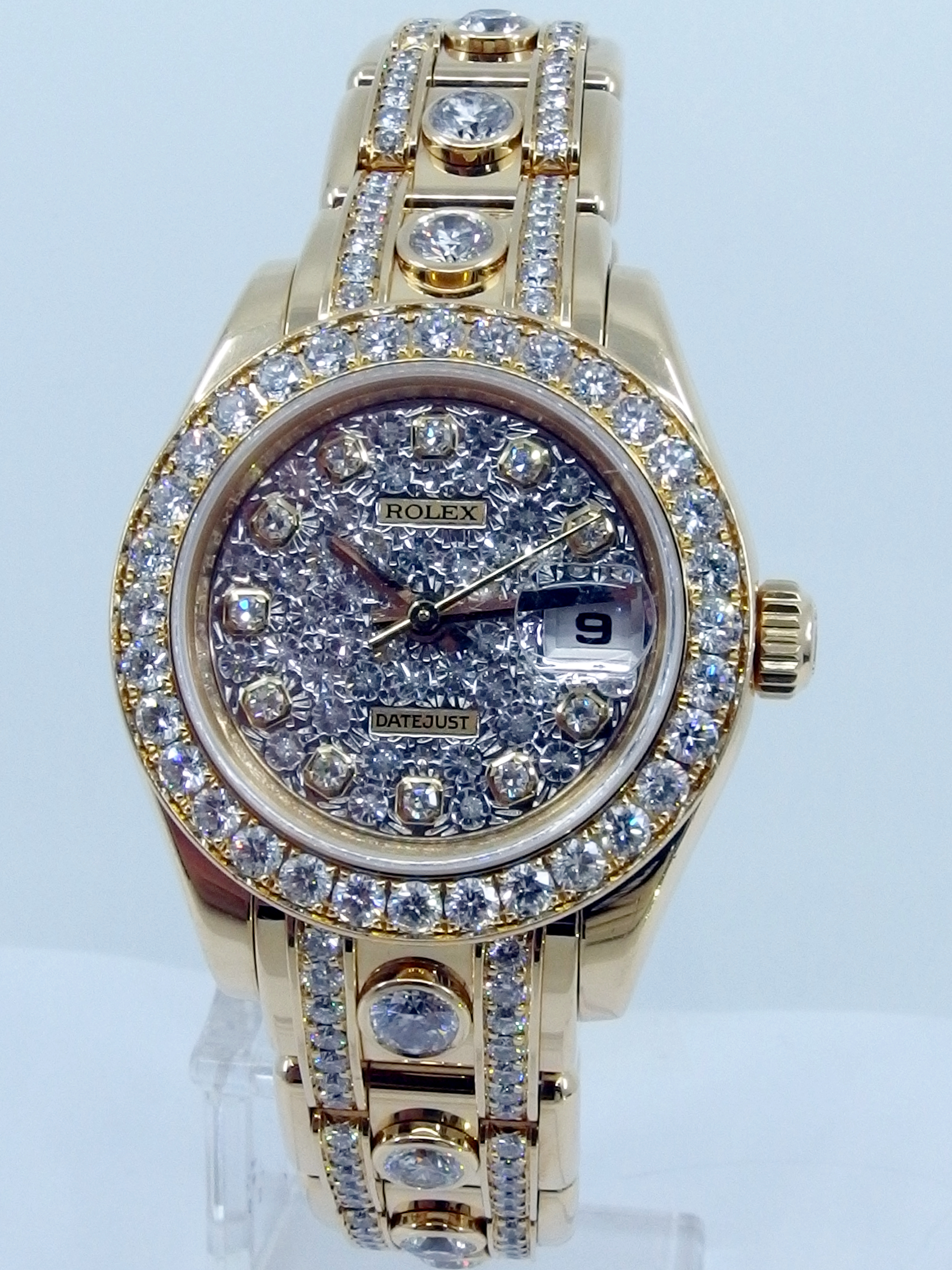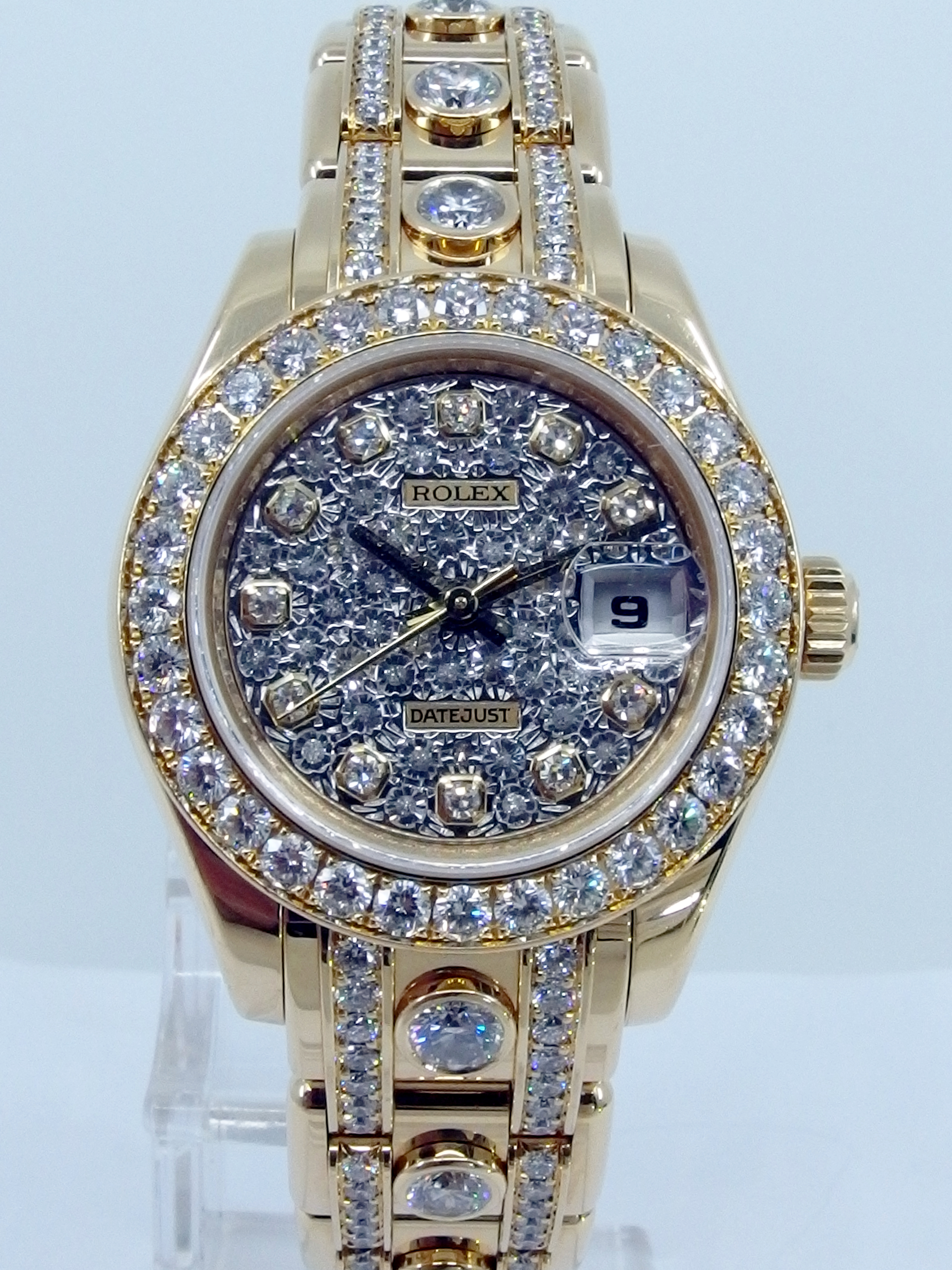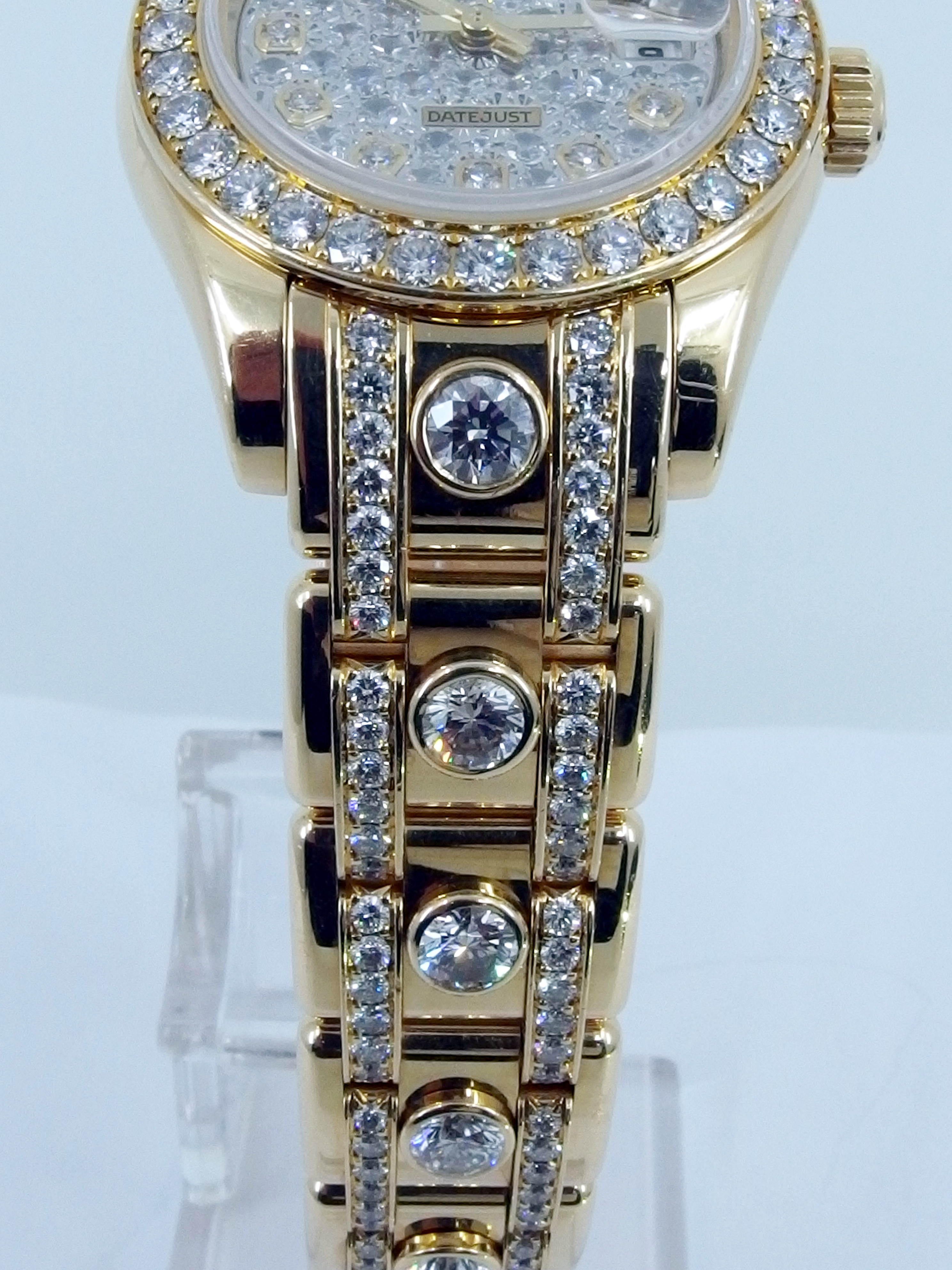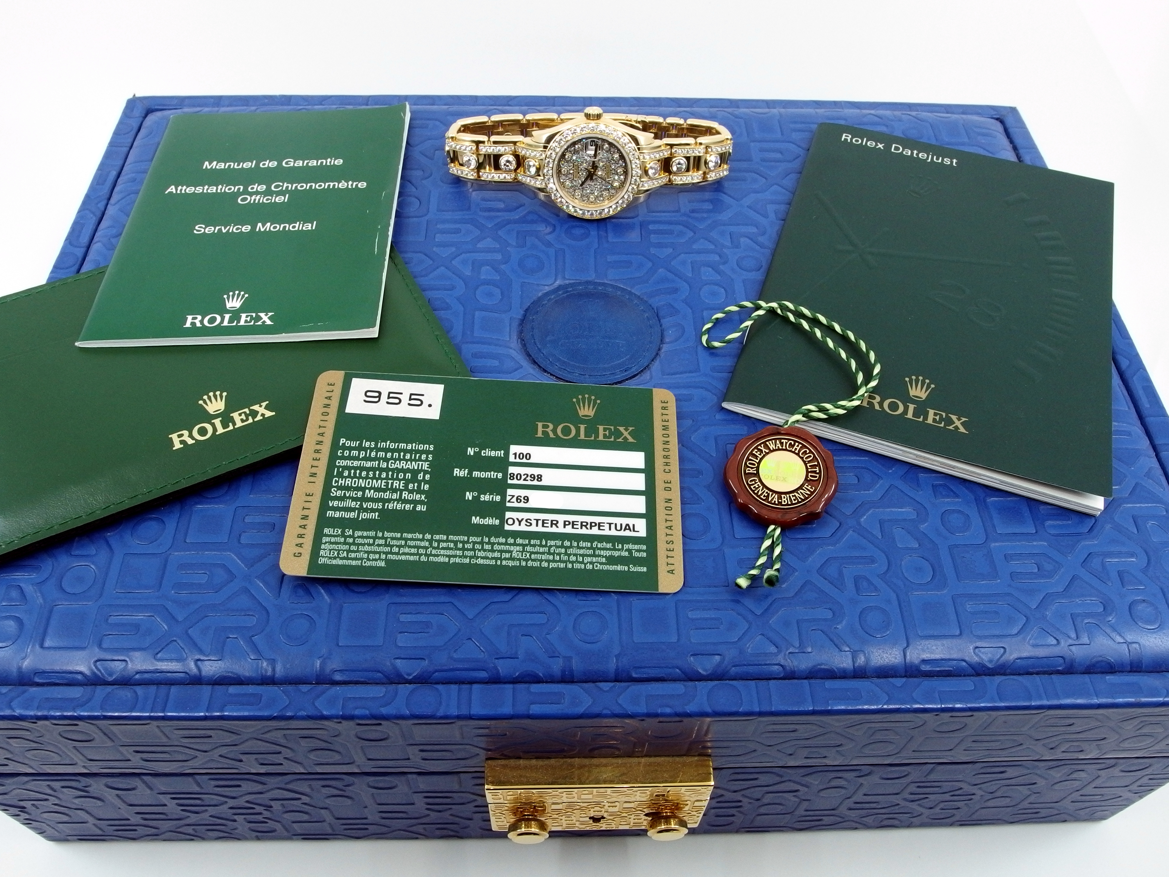ROLEX Lady PEARLMASTER Masterpiece in 18k Yellowgold, Reference 80298 & Bracelet 74908 BRIL, original ROLEX Diamond setting on the bezel 32 Brilliant cut Diamonds approx. 1.45 Carat - Pavé Diamond Dial with 10 hourly Diamonds - Pearlmaster Bracelet Reference 74908 BRIL with 174 small Brilliant cut Diamonds about 2.36 Carats - 14 large Brilliant cut Diamonds about 3.50 Carats, very good condition, according to our Research the last replacement Value in 2016 was about 122.100- €, attached large Masterpiece Box - Warranty Card / Certificate (sold in April 2008 by Bucherer Düsseldorf Königsallee) - Booklets - Hangtag - Map. This item is directly available. The sale of this watch is subject to differential-taxation according to §25A UStG (Value Added Tax Act).