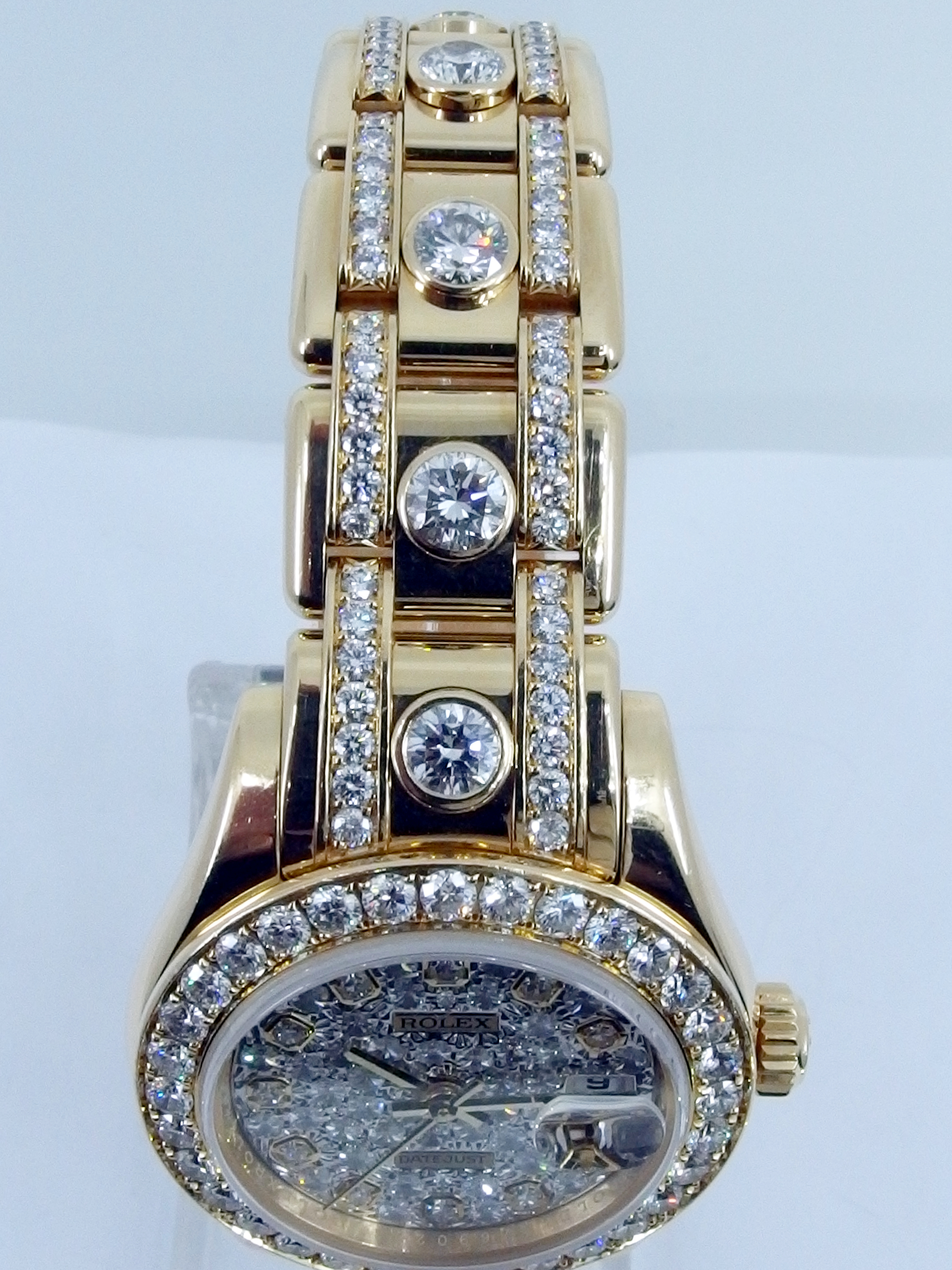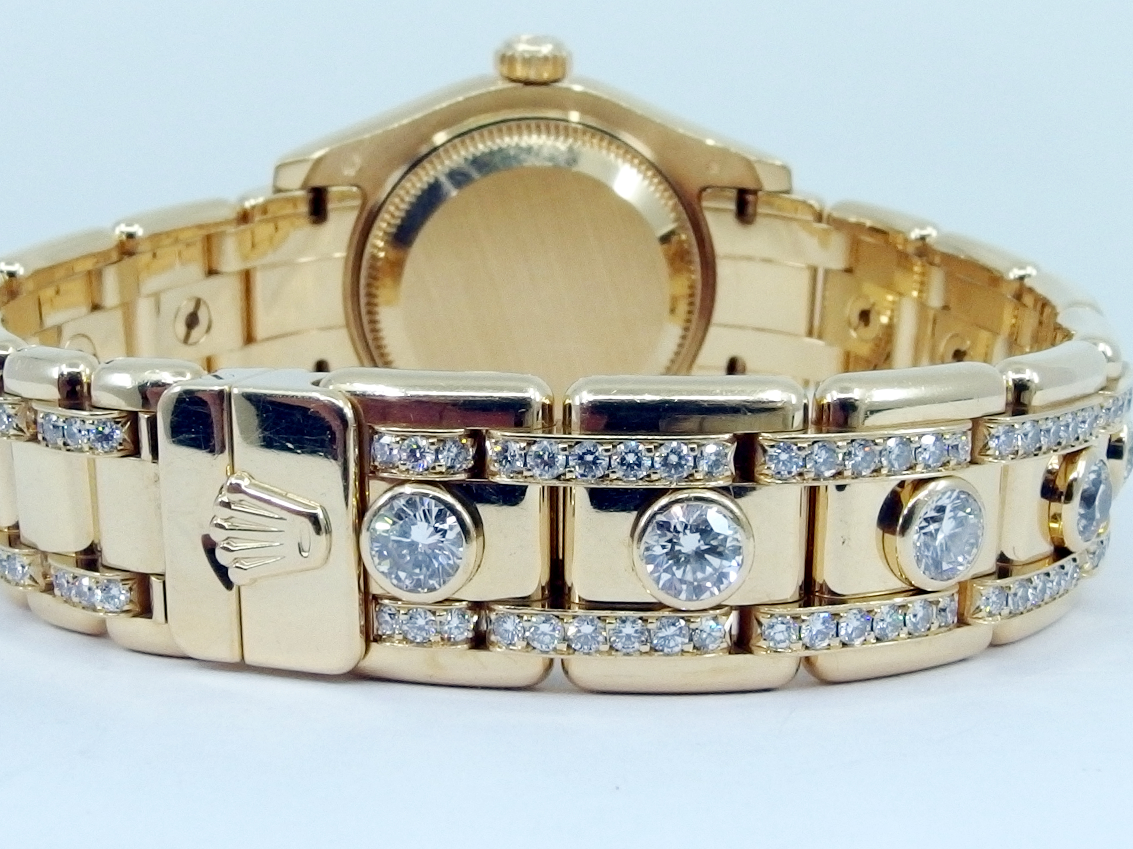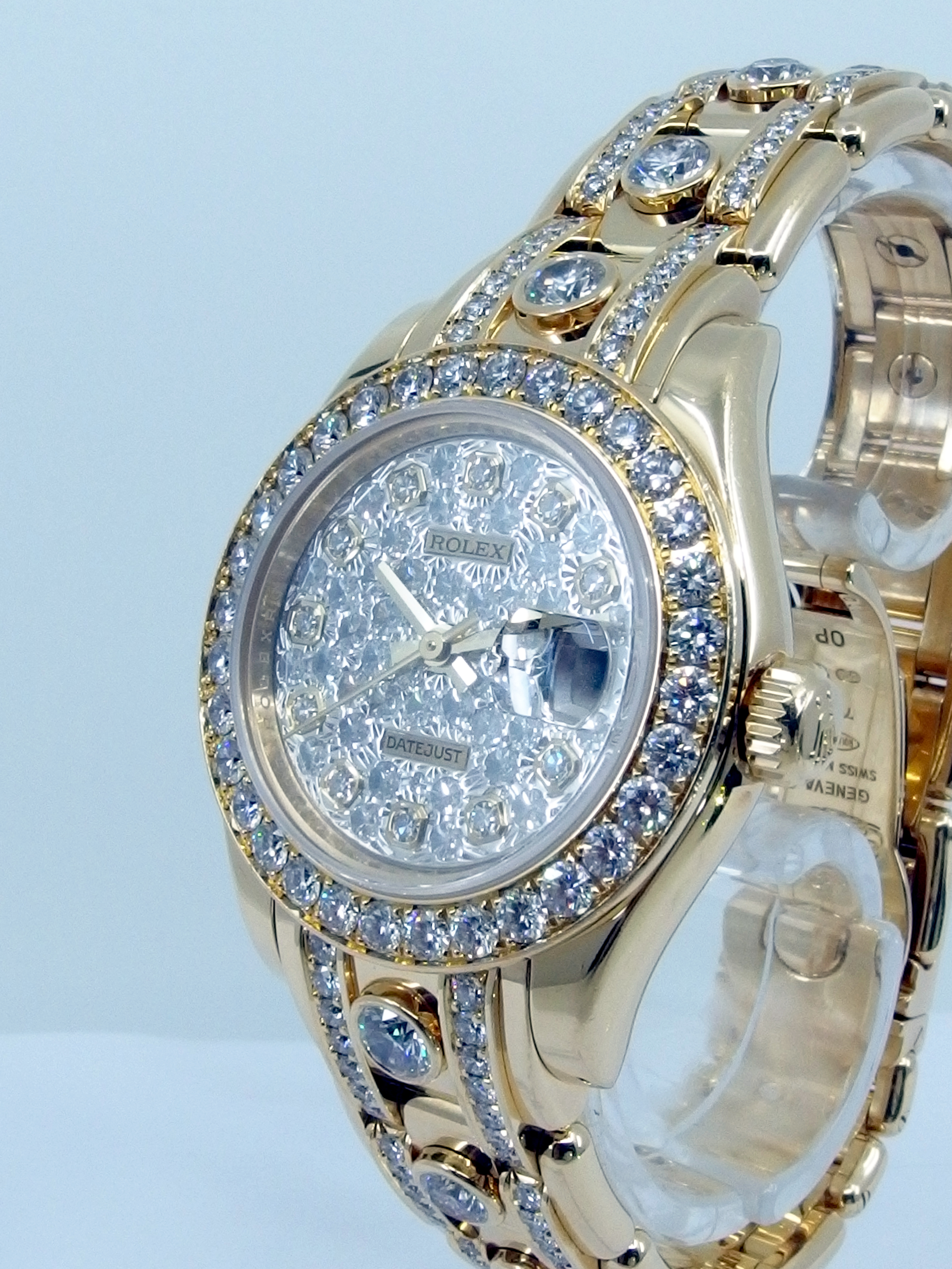 ROLEX Lady PEARLMASTER Masterpiece in 18k Yellowgold, Reference 80298 & Bracelet 74908 BRIL, original ROLEX Diamond setting on the bezel 32 Brilliant cut Diamonds approx. 1.45 Carat - Pavé Diamond Dial with 10 hourly Diamonds - Pearlmaster Bracelet Reference 74908 BRIL with 174 small Brilliant cut Diamonds about 2.36 Carats - 14 large Brilliant cut Diamonds about 3.50 Carats, very good condition, according to our Research the last replacement Value in 2016 was about 122.100- €, attached large Masterpiece Box - Warranty Card / Certificate (sold in April 2008 by Bucherer Düsseldorf Königsallee) - Booklets - Hangtag - Map. This item is directly available. The sale of this watch is subject to differential-taxation according to §25A UStG (Value Added Tax Act).
