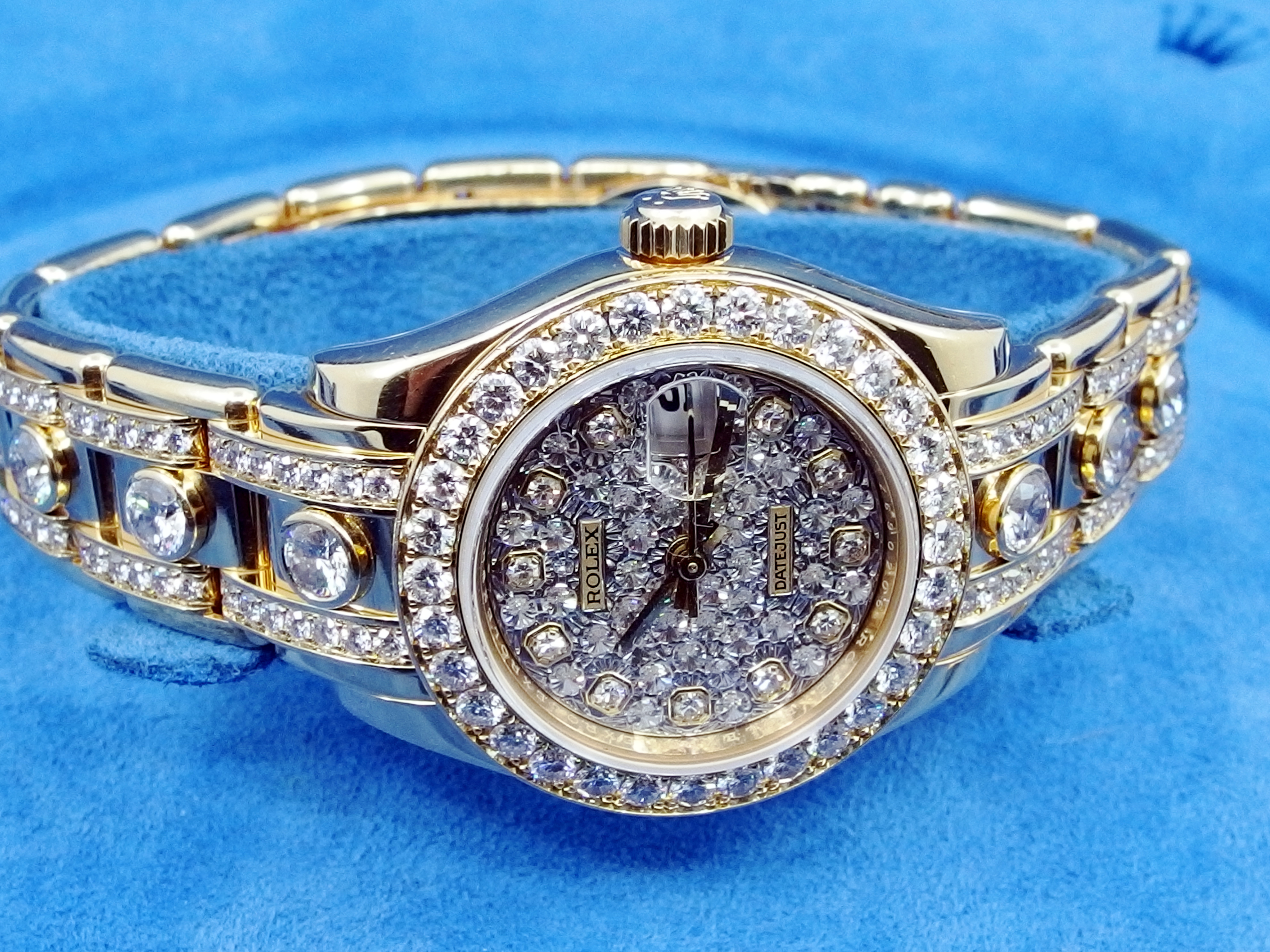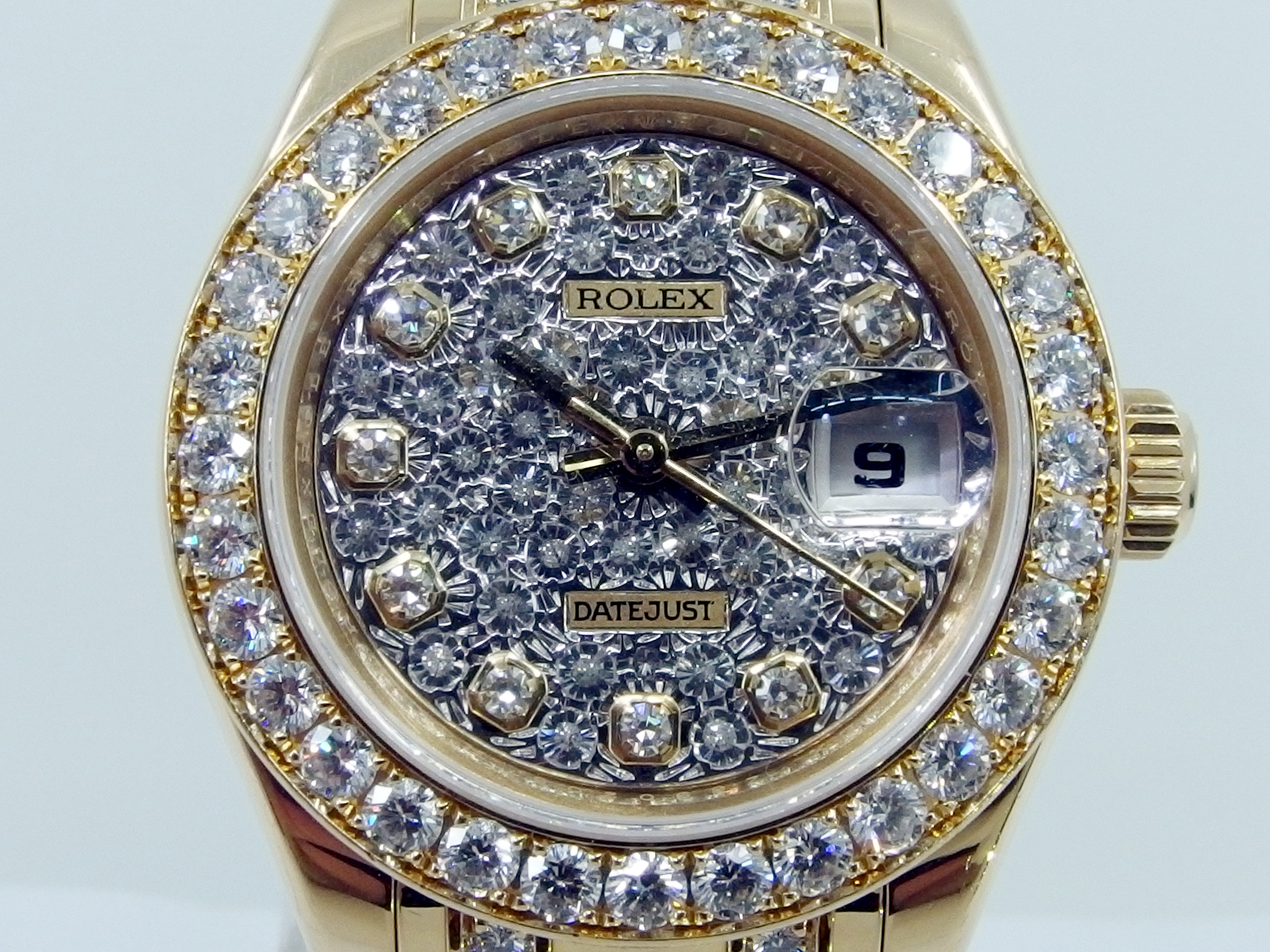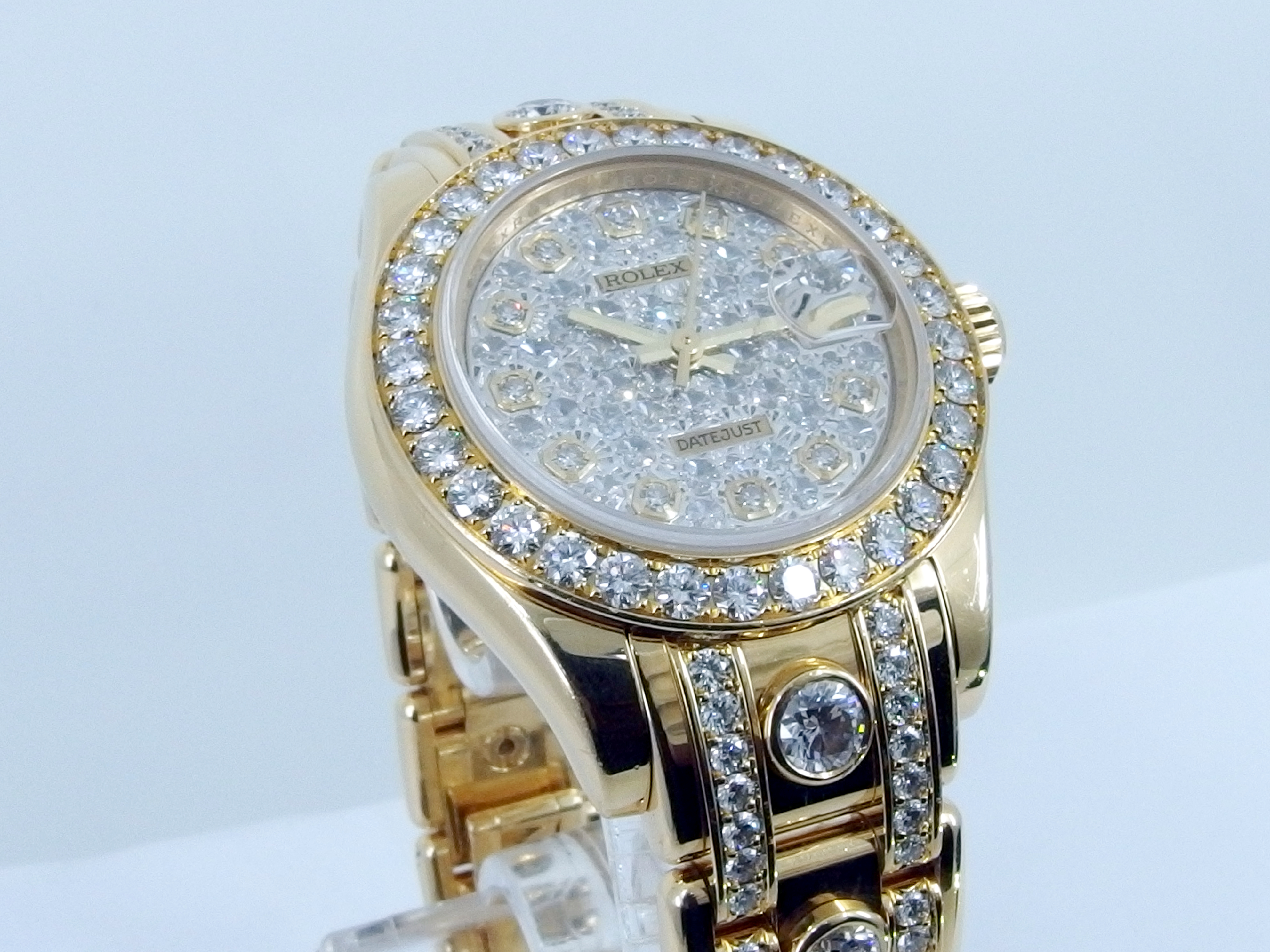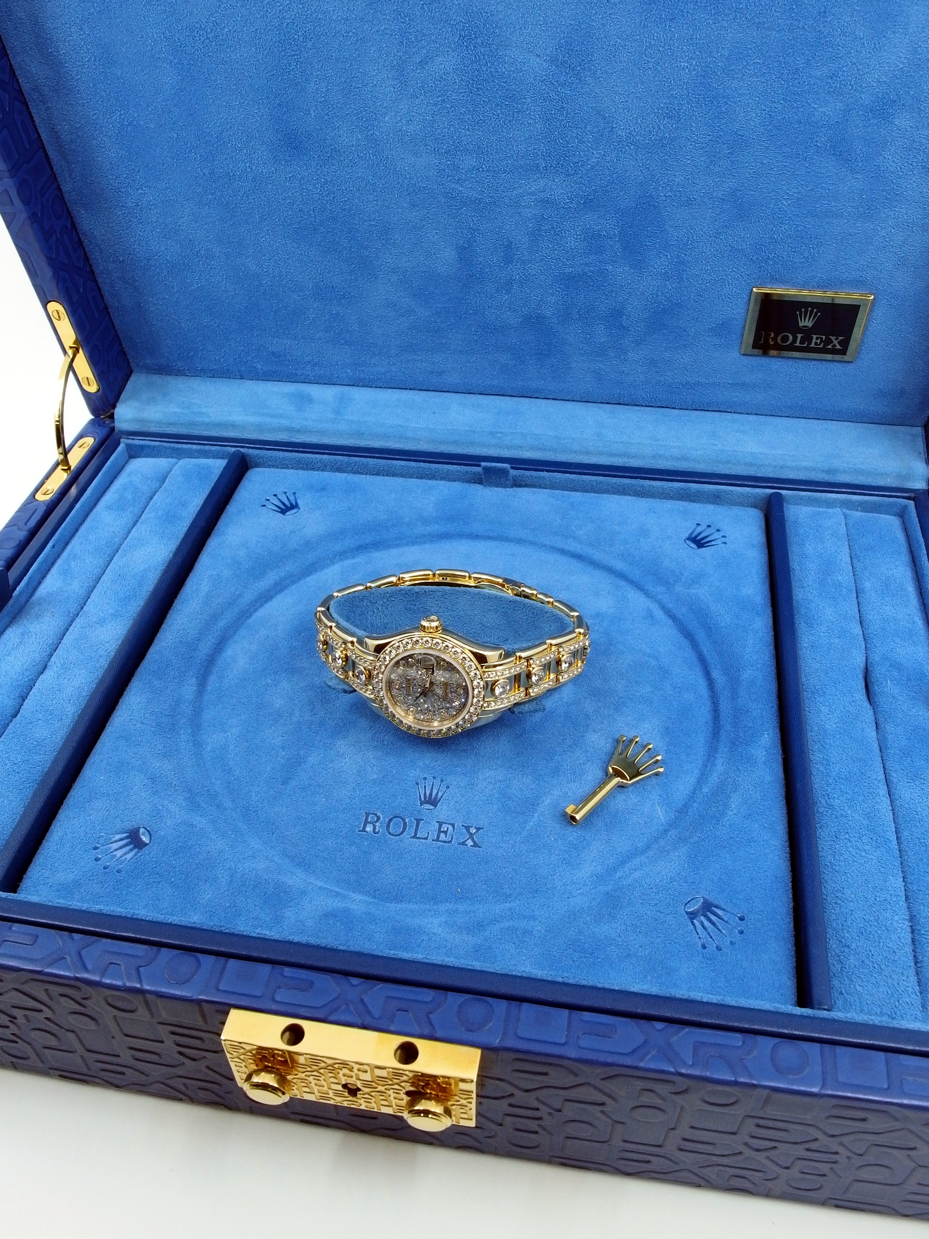 ROLEX Lady PEARLMASTER Masterpiece in 18k Yellowgold, Reference 80298 & Bracelet 74908 BRIL, original ROLEX Diamond setting on the bezel 32 Brilliant cut Diamonds approx. 1.45 Carat - Pavé Diamond Dial with 10 hourly Diamonds - Pearlmaster Bracelet Reference 74908 BRIL with 174 small Brilliant cut Diamonds about 2.36 Carats - 14 large Brilliant cut Diamonds about 3.50 Carats, very good condition, according to our Research the last replacement Value in 2016 was about 122.100- €, attached large Masterpiece Box - Warranty Card / Certificate (sold in April 2008 by Bucherer Düsseldorf Königsallee) - Booklets - Hangtag - Map. This item is directly available. The sale of this watch is subject to differential-taxation according to §25A UStG (Value Added Tax Act).