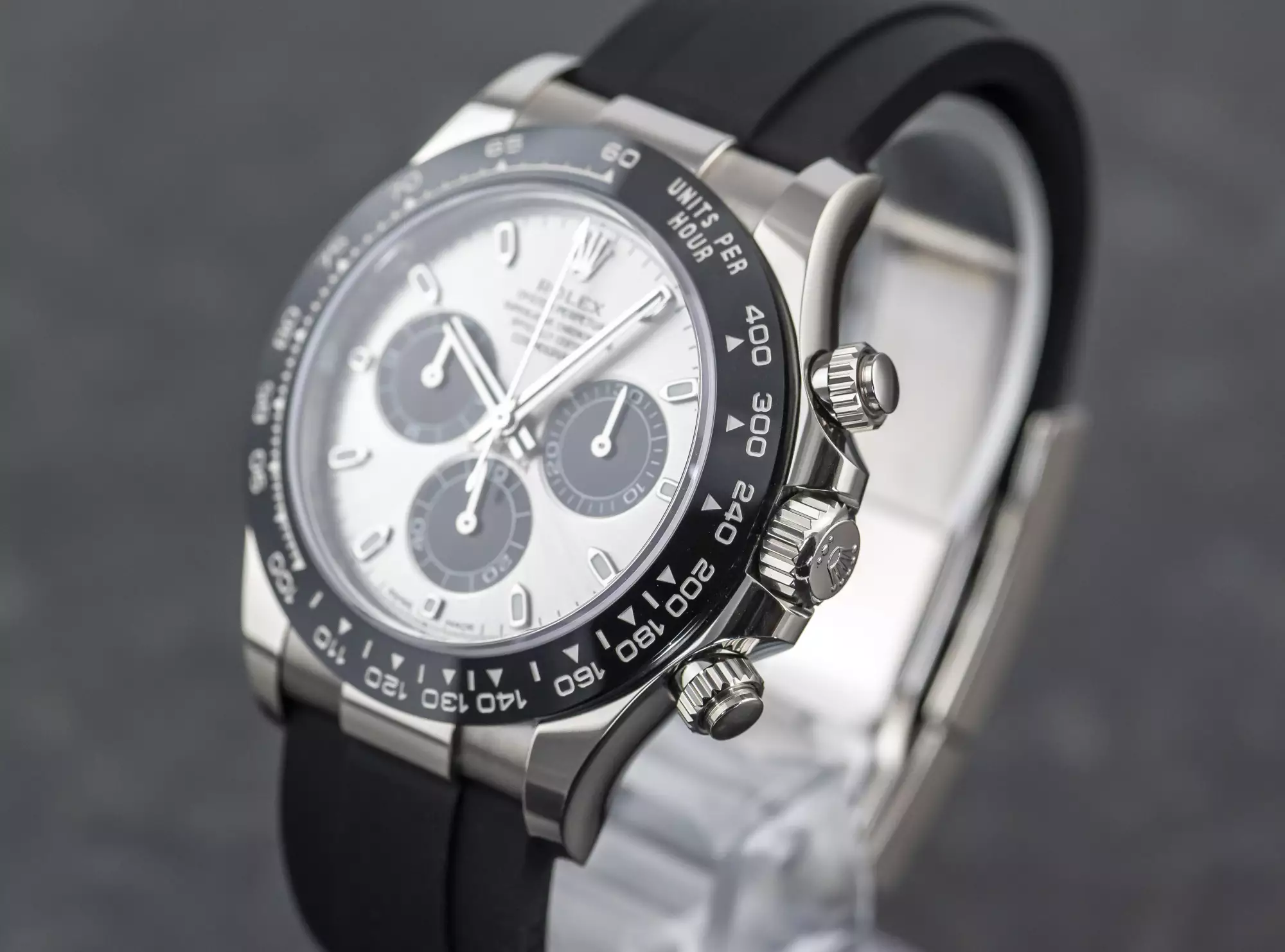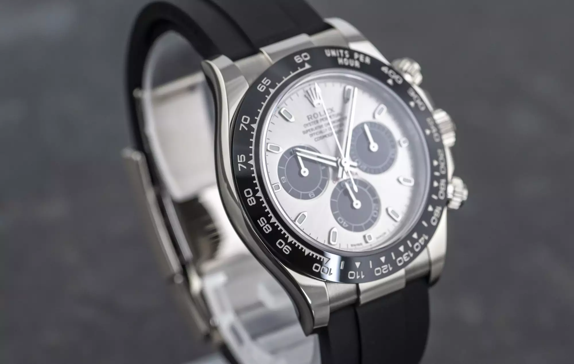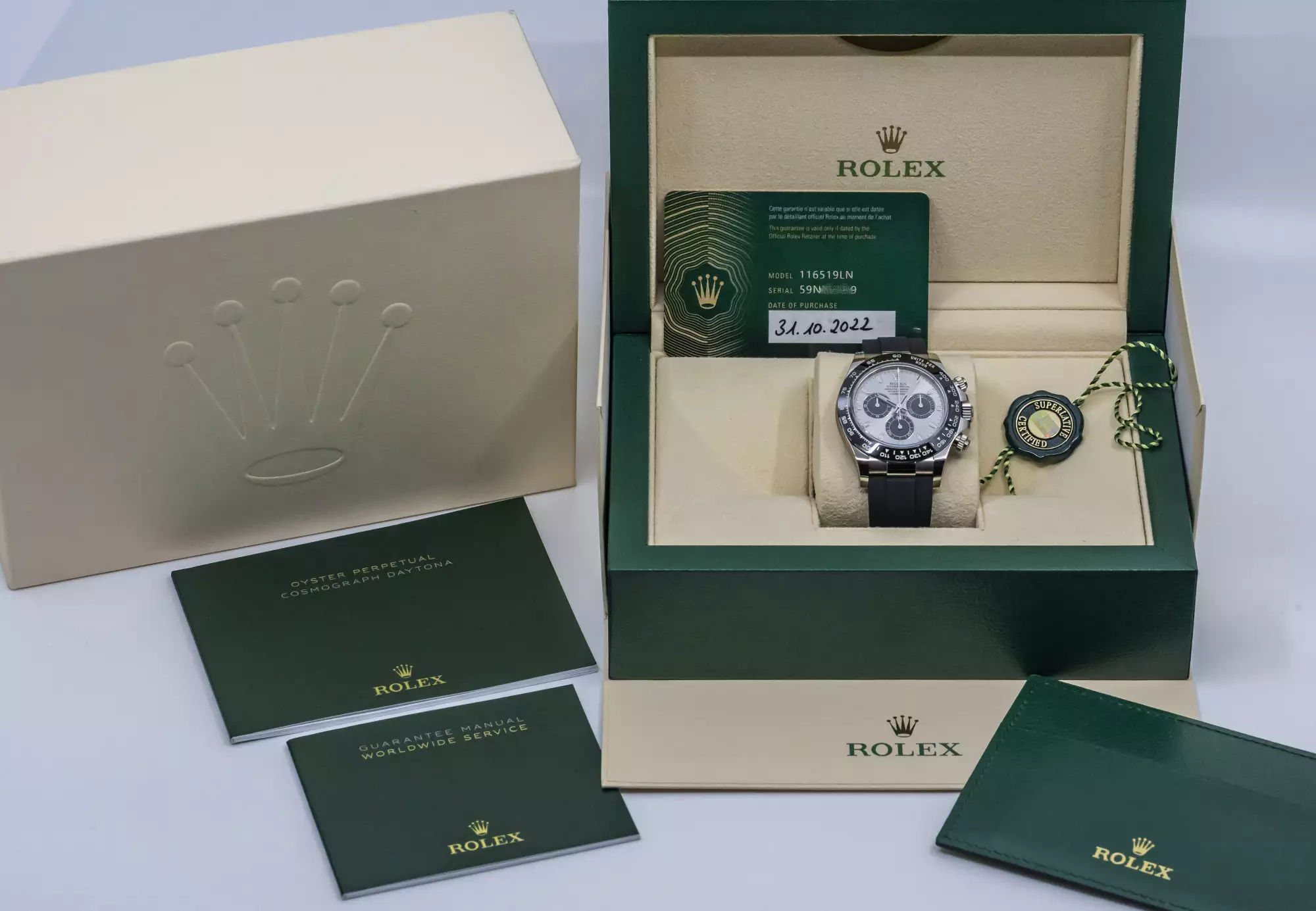 Sporty Rolex Cosmograph Daytona Oysterflex with the reference 116519LN-0024 in 18k white gold. This Daytona is on an Oysterflex bracelet and has the Rolex Cerachrom bezel with engraved numerals and tachymeter scales. Inside this 116519LN ticks the Rolex automatic caliber 4130 and has the serial number 59N7xxxx. The watch is in very good condition and comes in a full set with box and outer box - warranty card (sold on October 31, 2022 - Bucherer Germany) - booklets - chronometer seal. This item is directly available. The sale of this Watch is subject to differential-taxation according to §25A UStG (Value Added Tax Act).