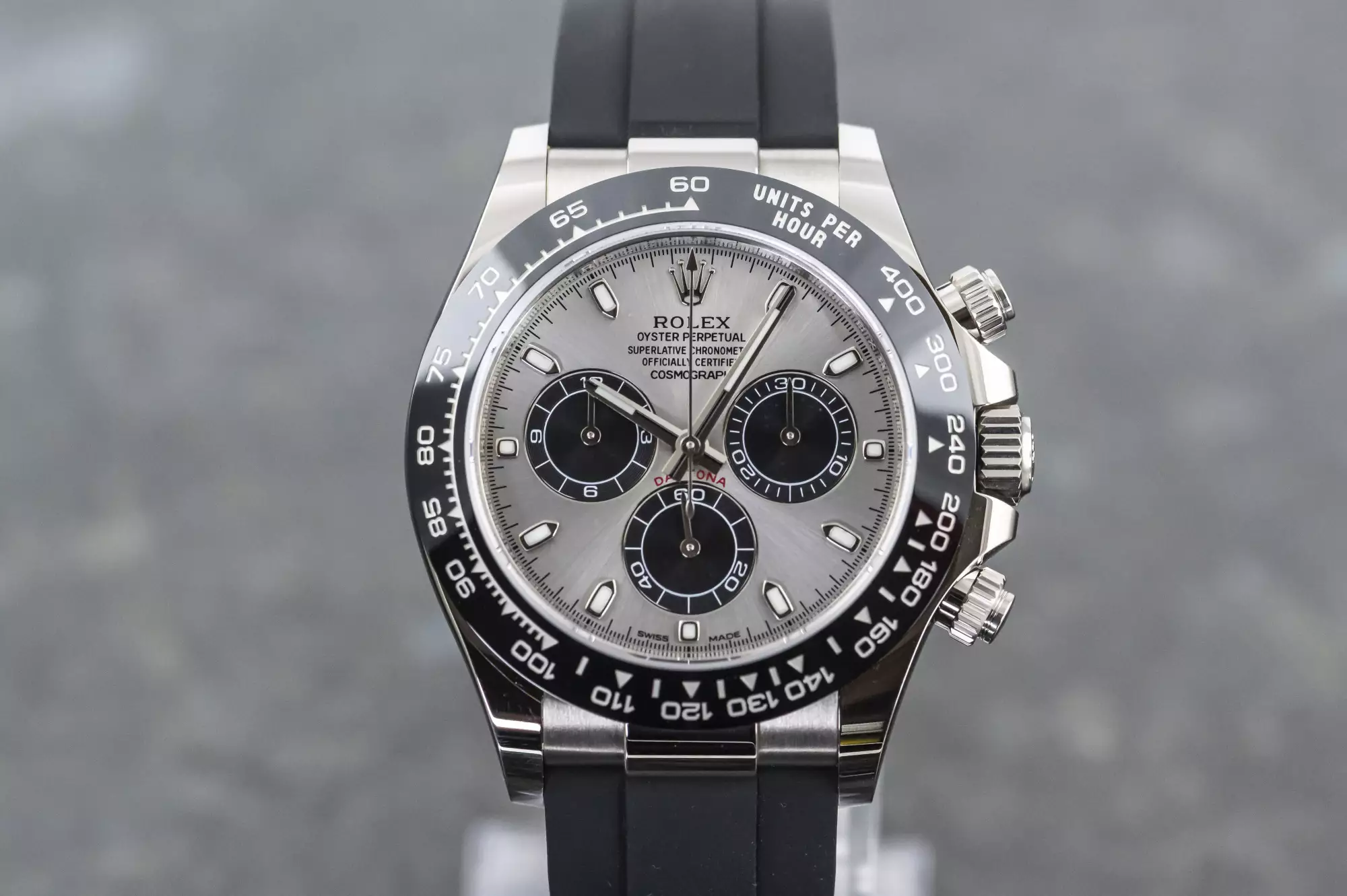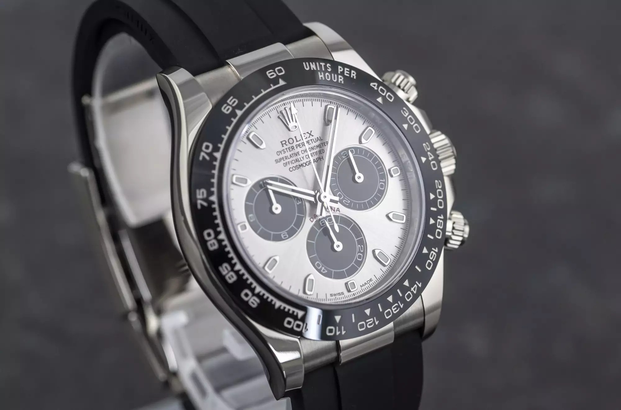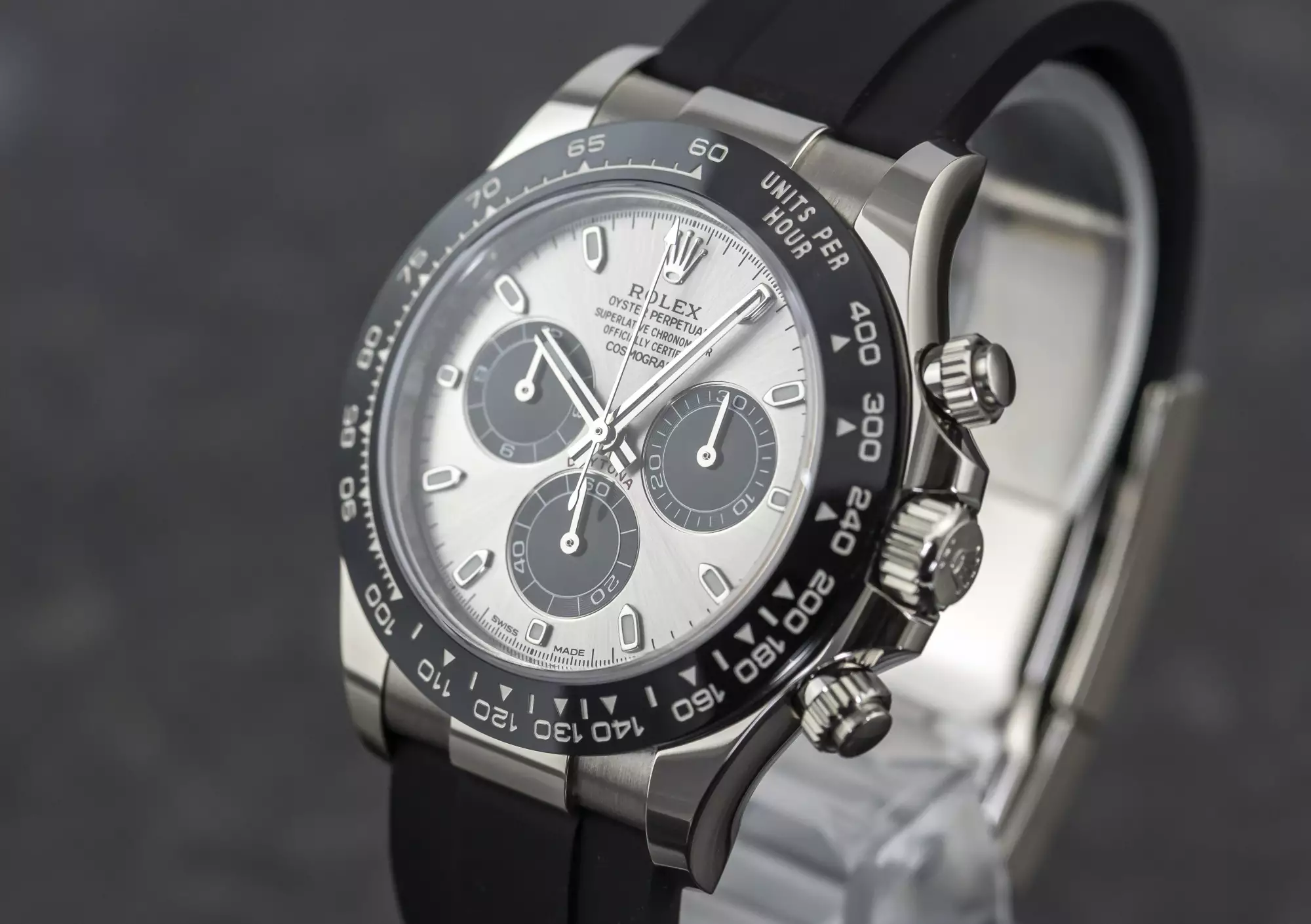 Sporty Rolex Cosmograph Daytona Oysterflex with the reference 116519LN-0024 in 18k white gold. This Daytona is on an Oysterflex bracelet and has the Rolex Cerachrom bezel with engraved numerals and tachymeter scales. Inside this 116519LN ticks the Rolex automatic caliber 4130 and has the serial number 59N7xxxx. The watch is in very good condition and comes in a full set with box and outer box - warranty card (sold on October 31, 2022 - Bucherer Germany) - booklets - chronometer seal. This item is directly available. The sale of this Watch is subject to differential-taxation according to §25A UStG (Value Added Tax Act).